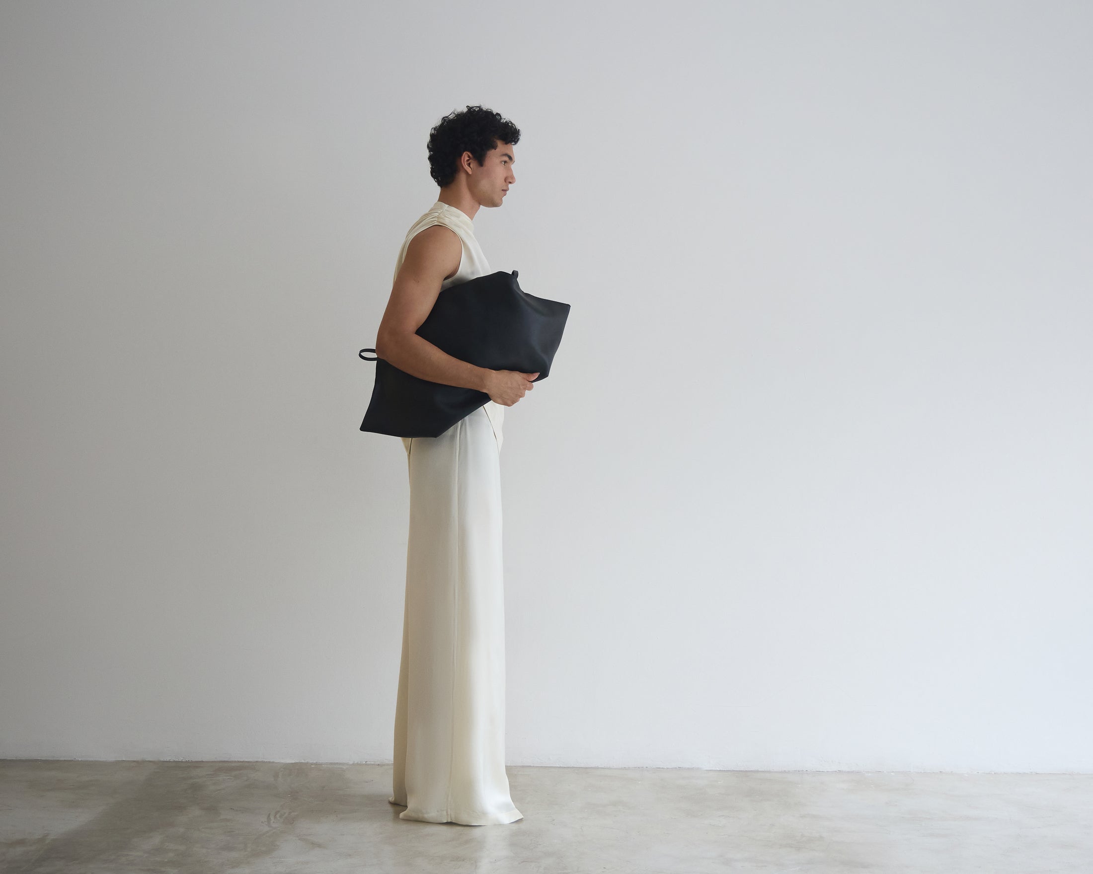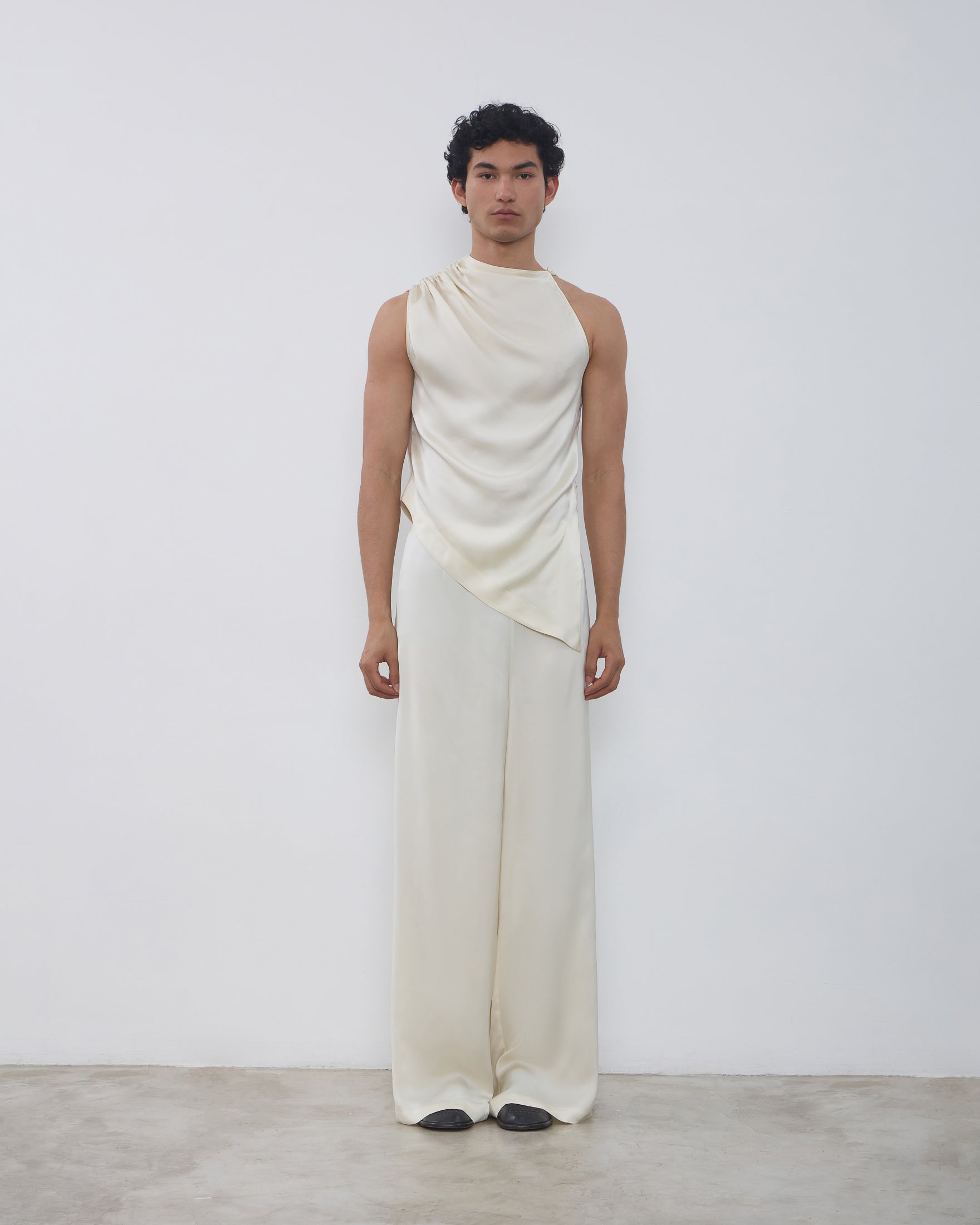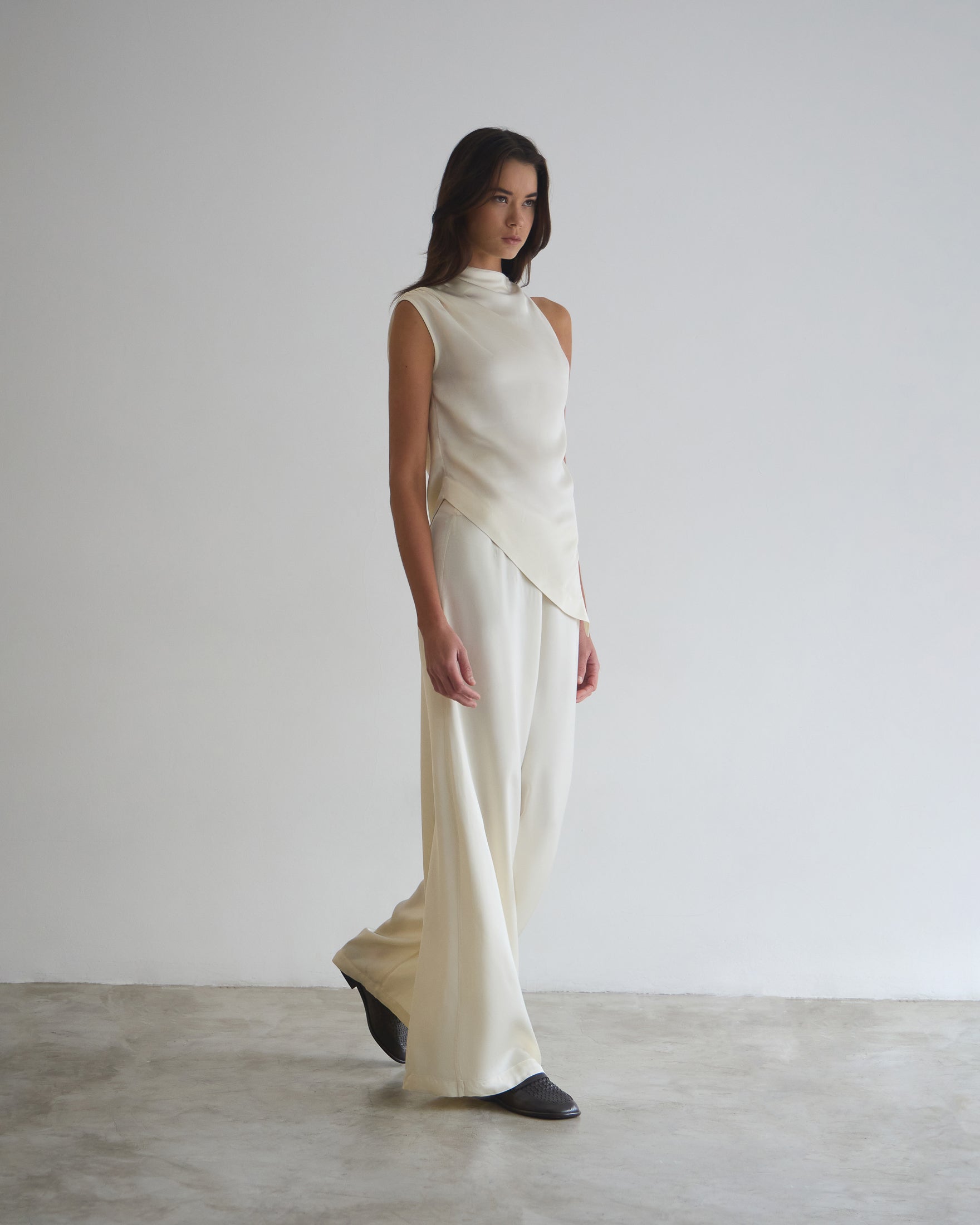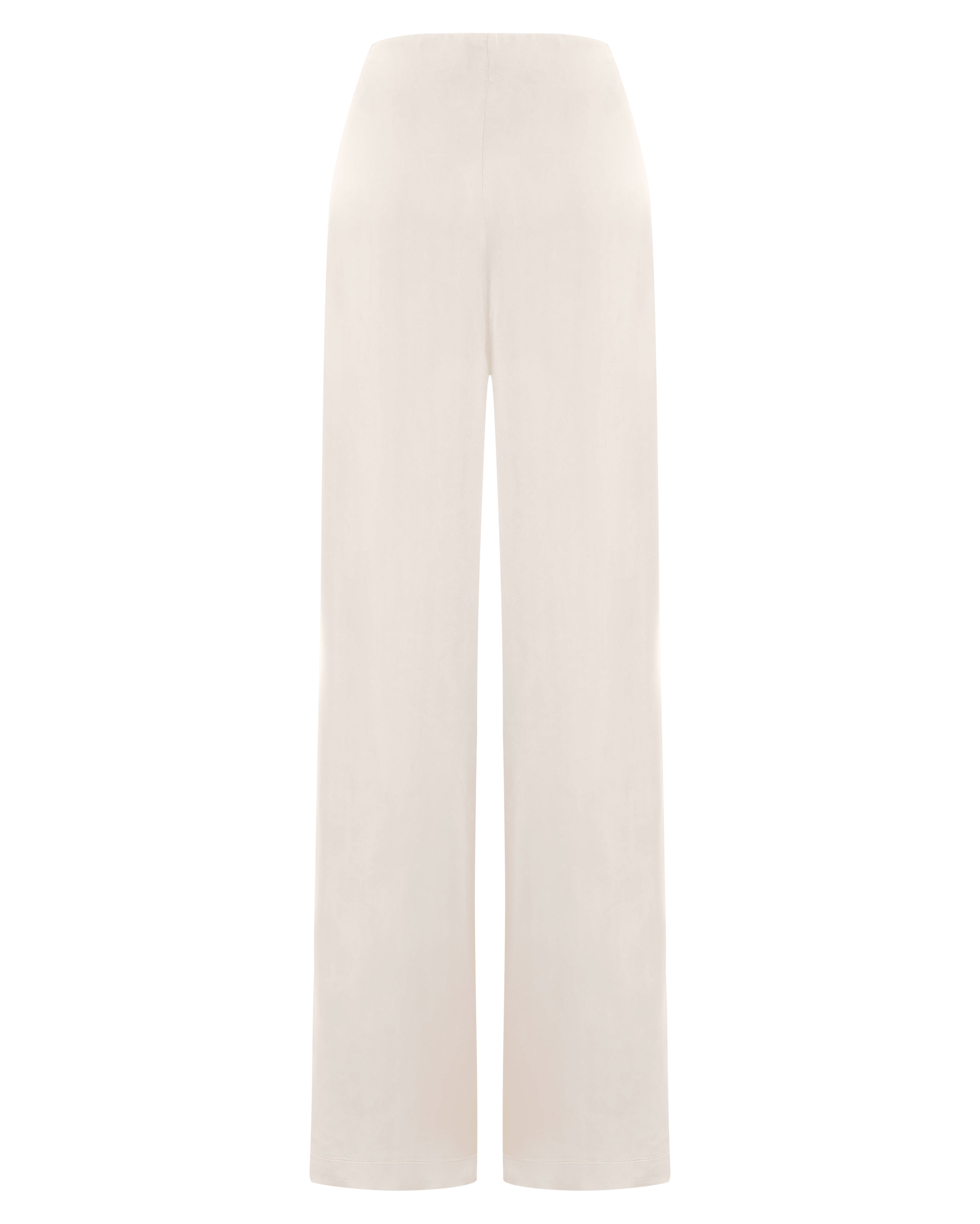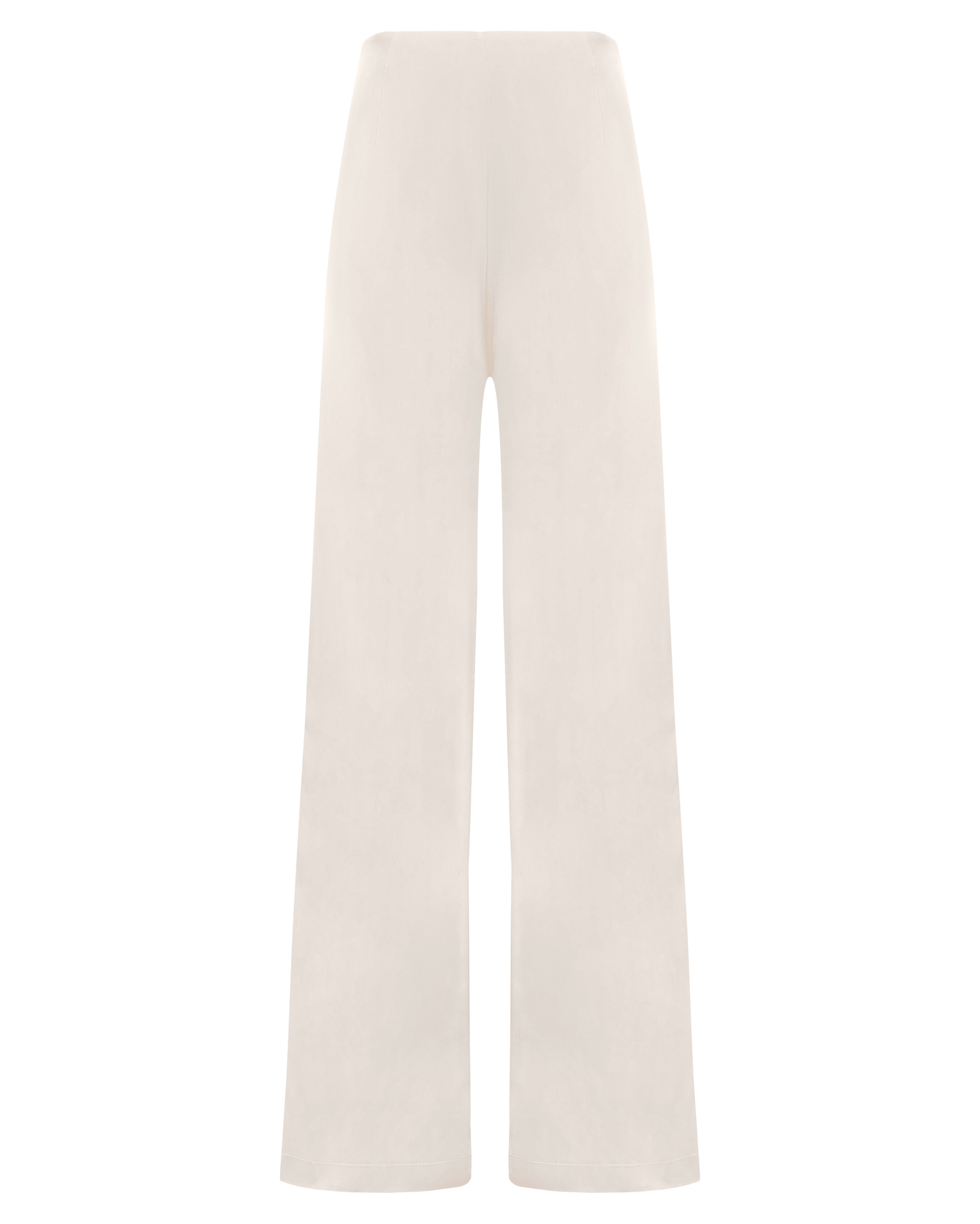A Calça Vera é confeccionada em tecido plano fluído, possui caimento acinturado com barras amplas, fechamento por zíper na lateral e acabamento pespontado.