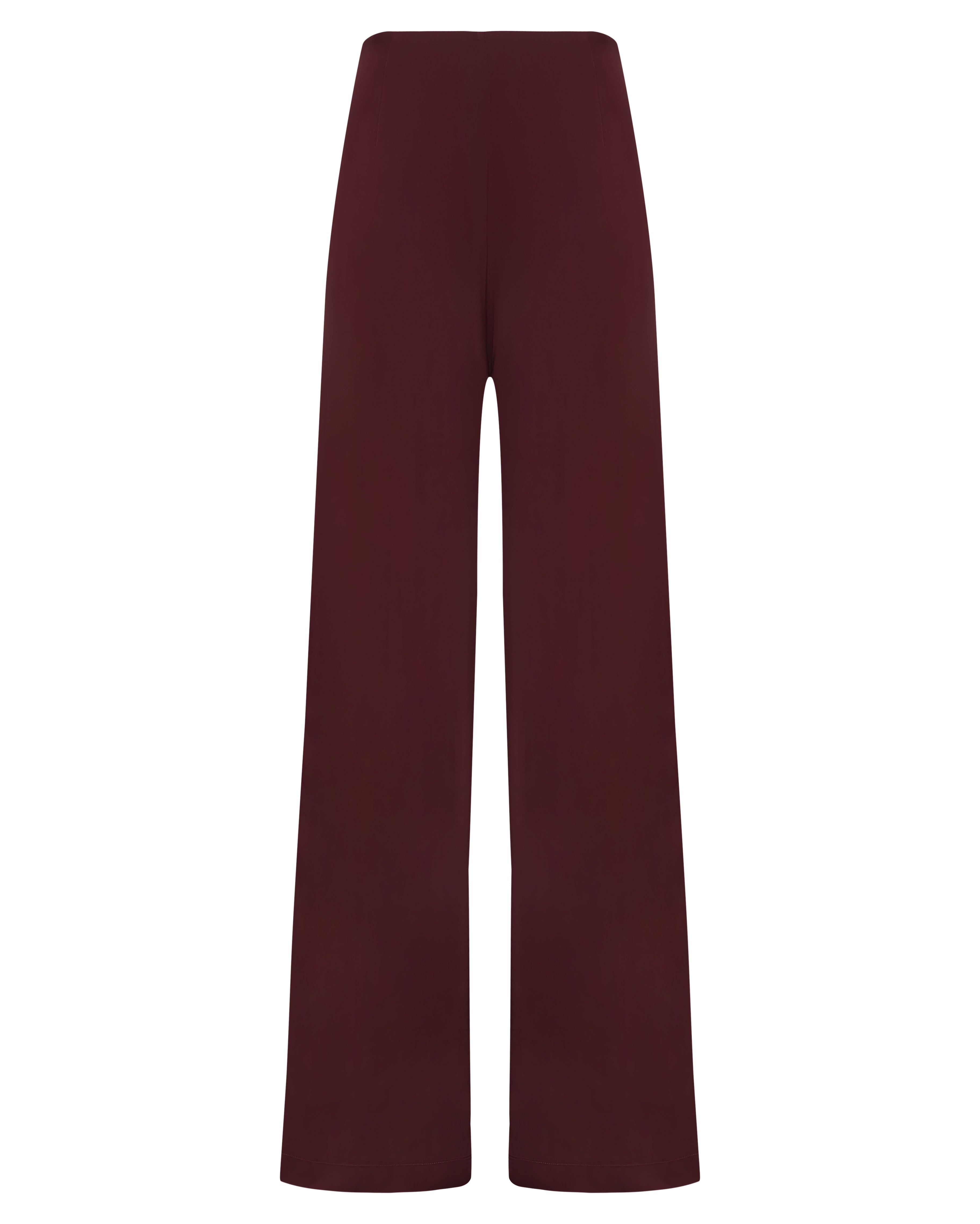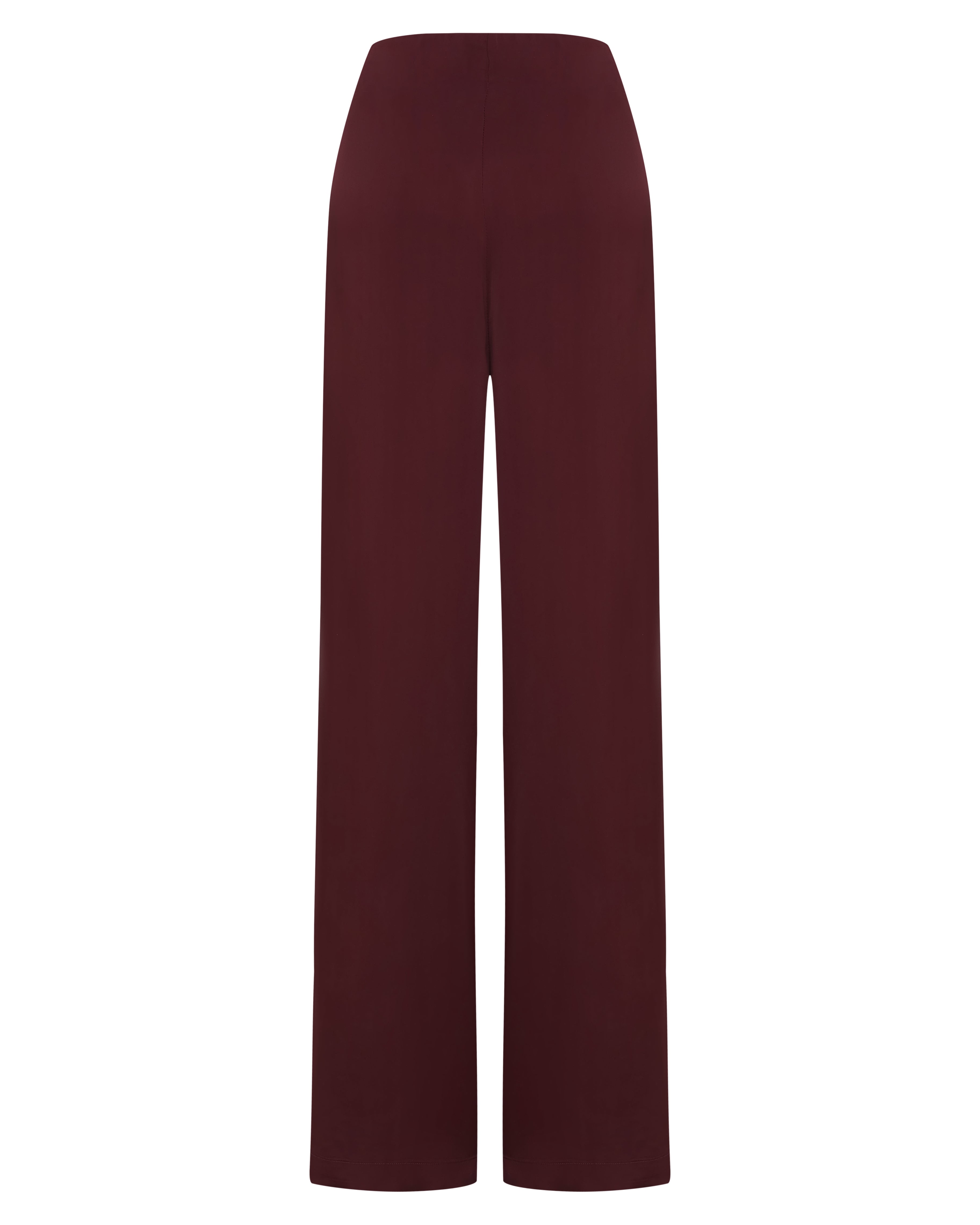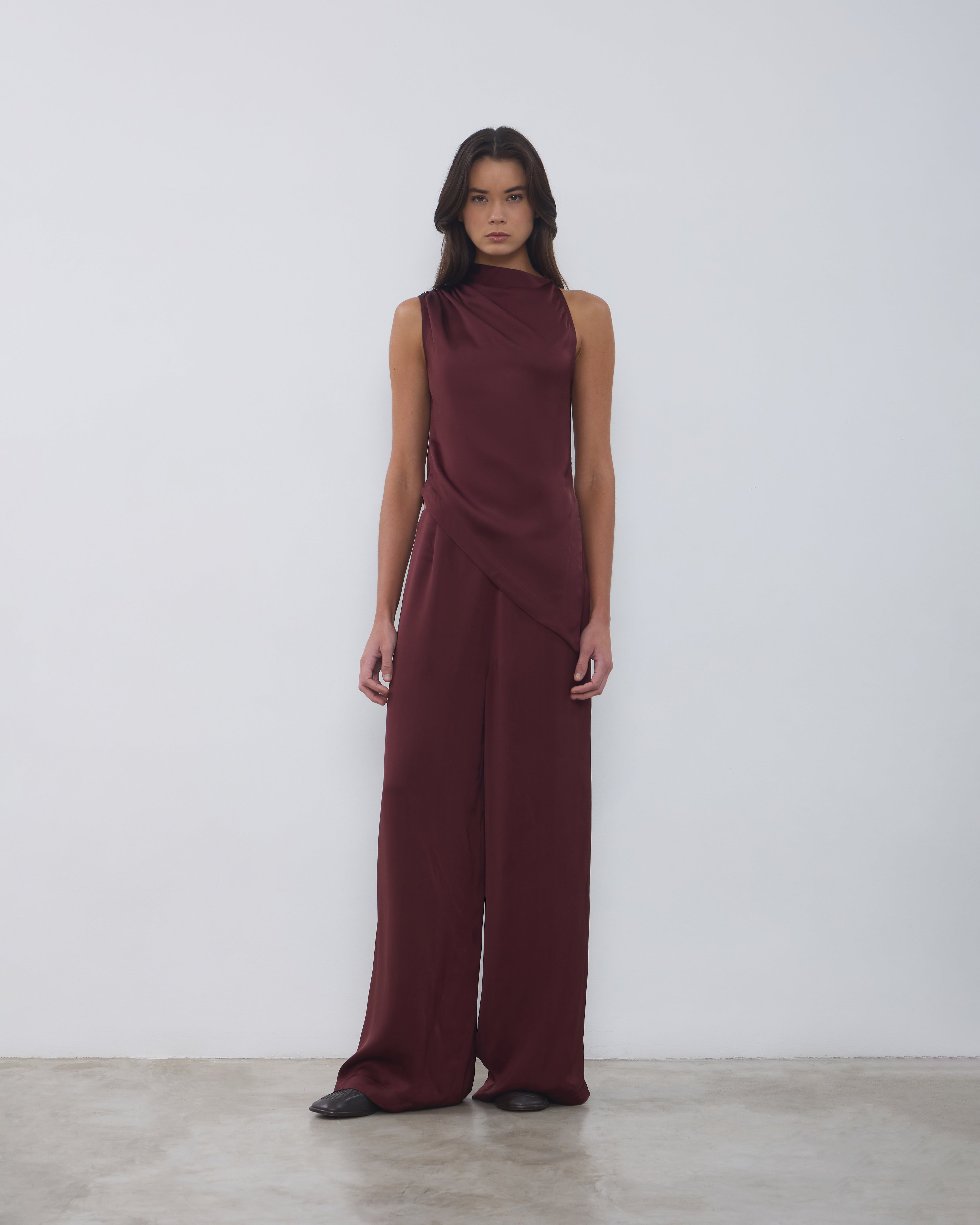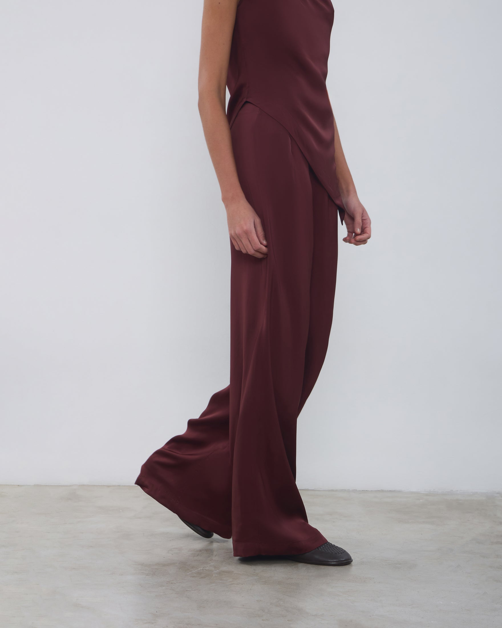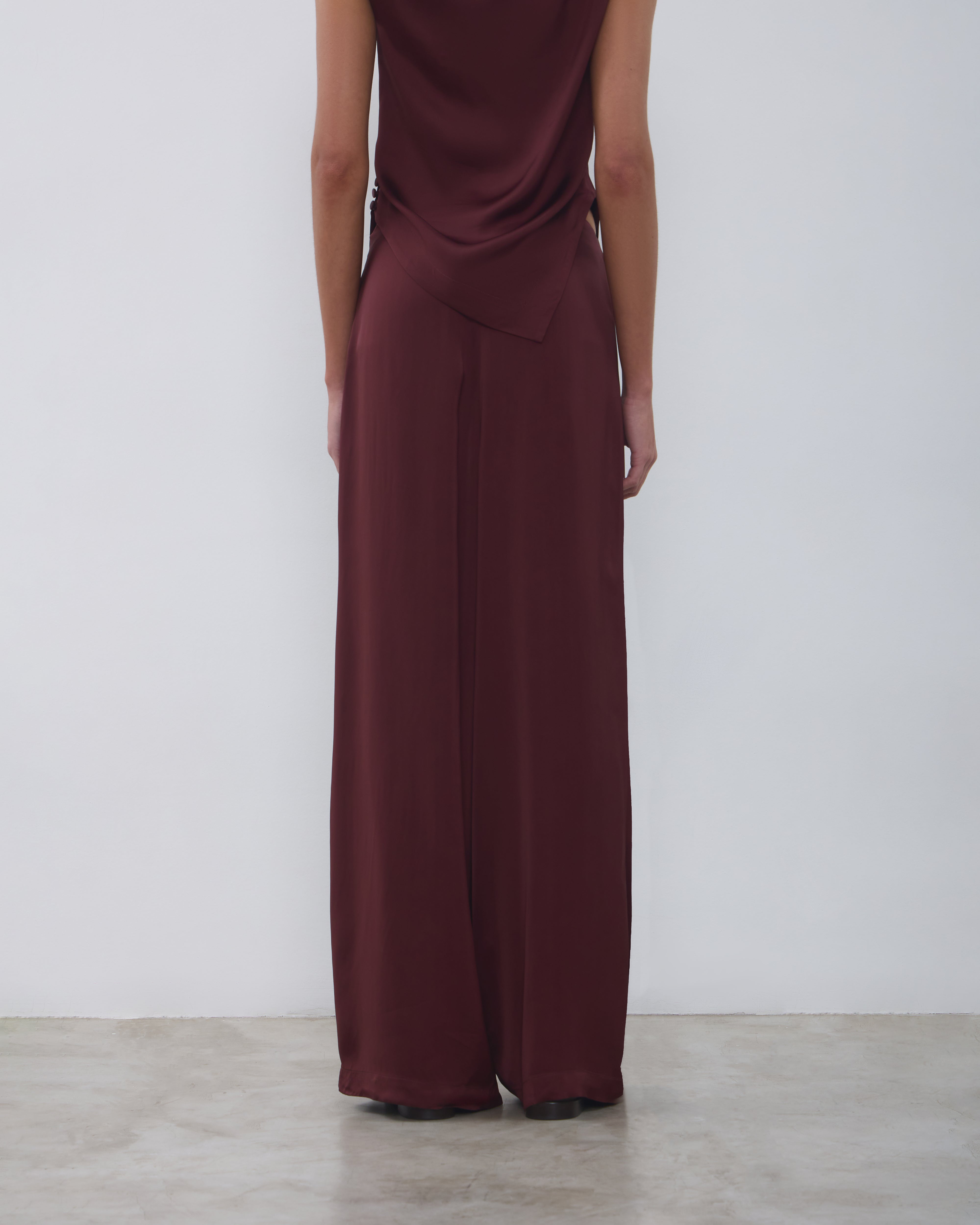 A Calça Vera é confeccionada em tecido plano fluído, possui caimento acinturado com barras amplas, fechamento por zíper na lateral e acabamento pespontado.