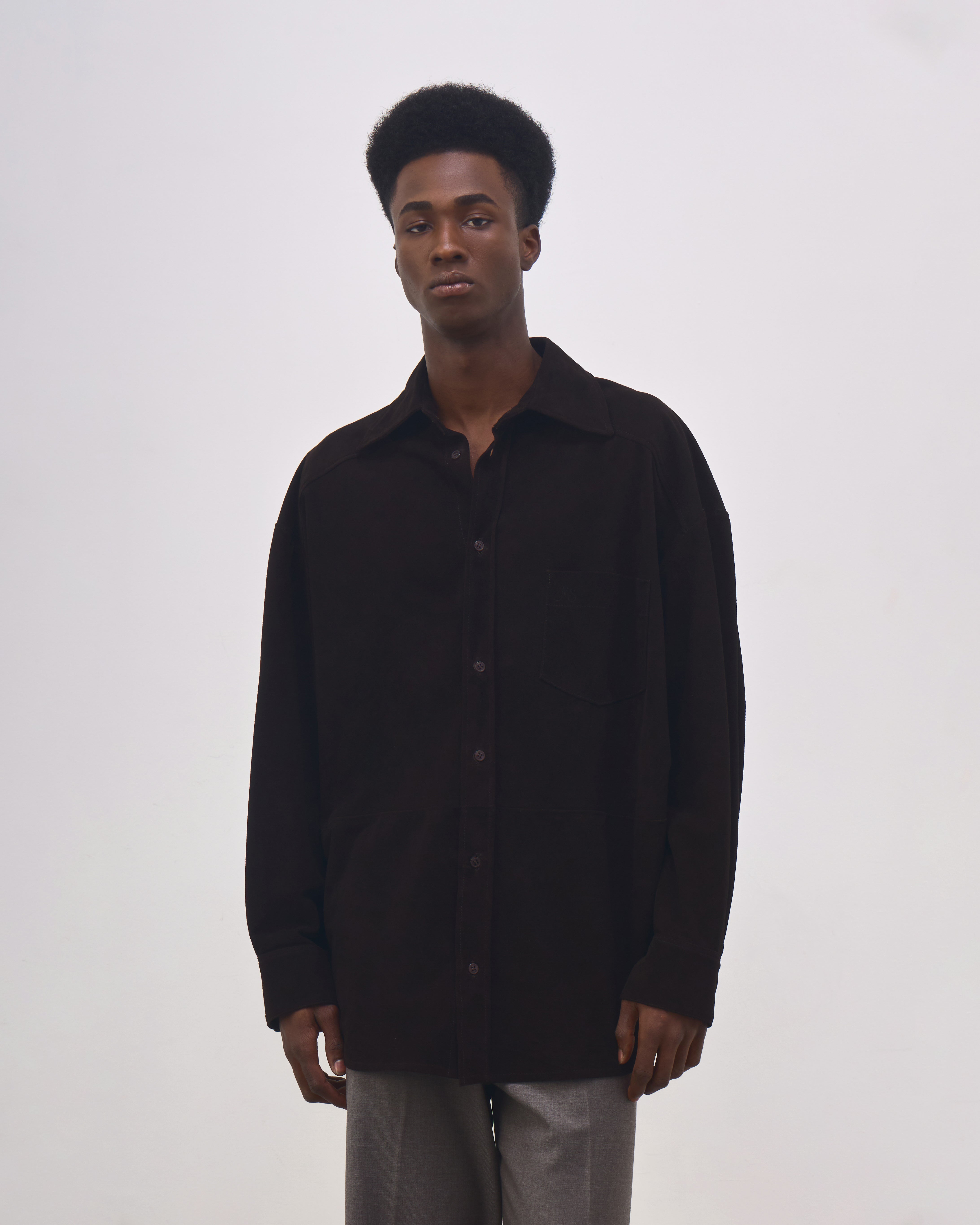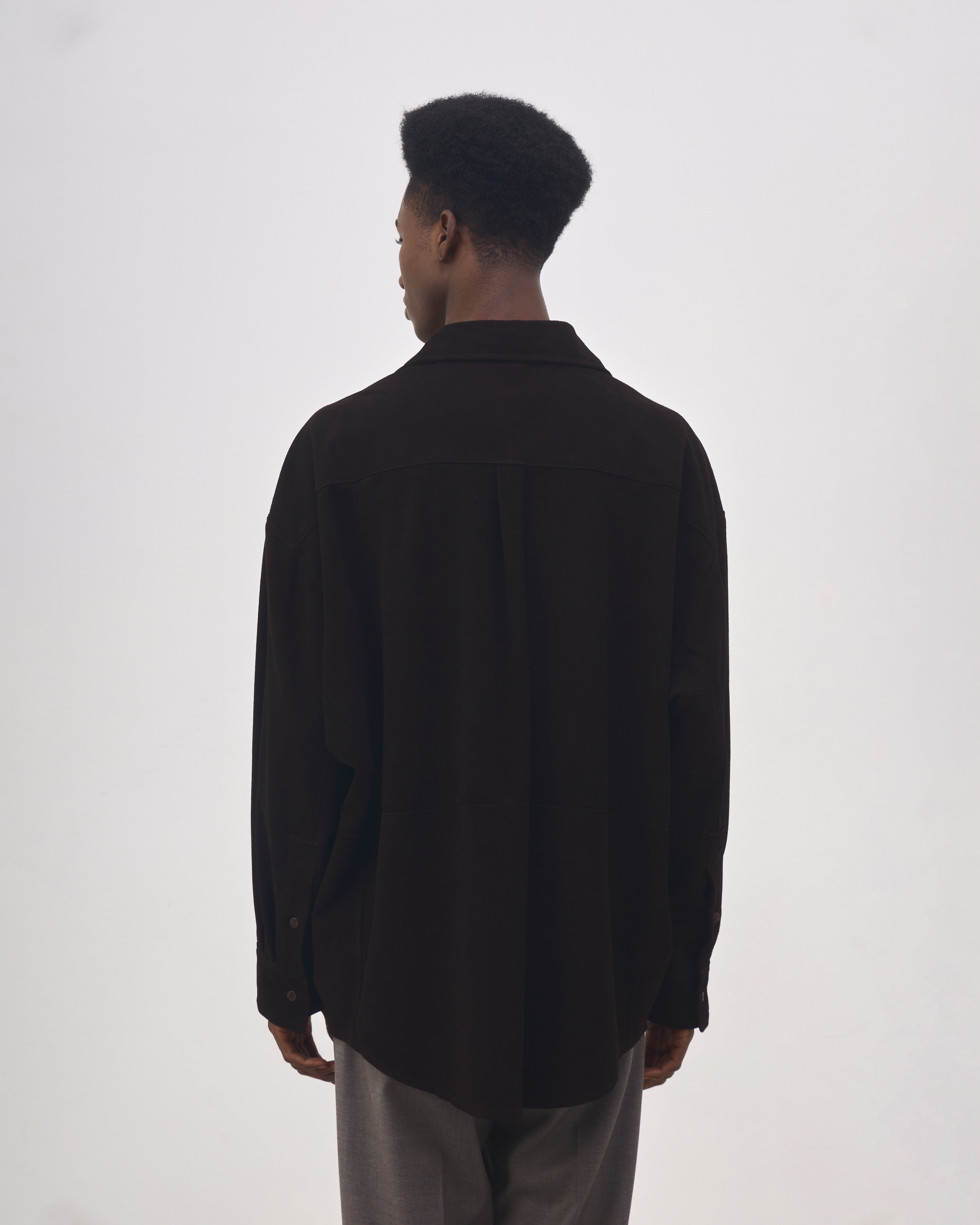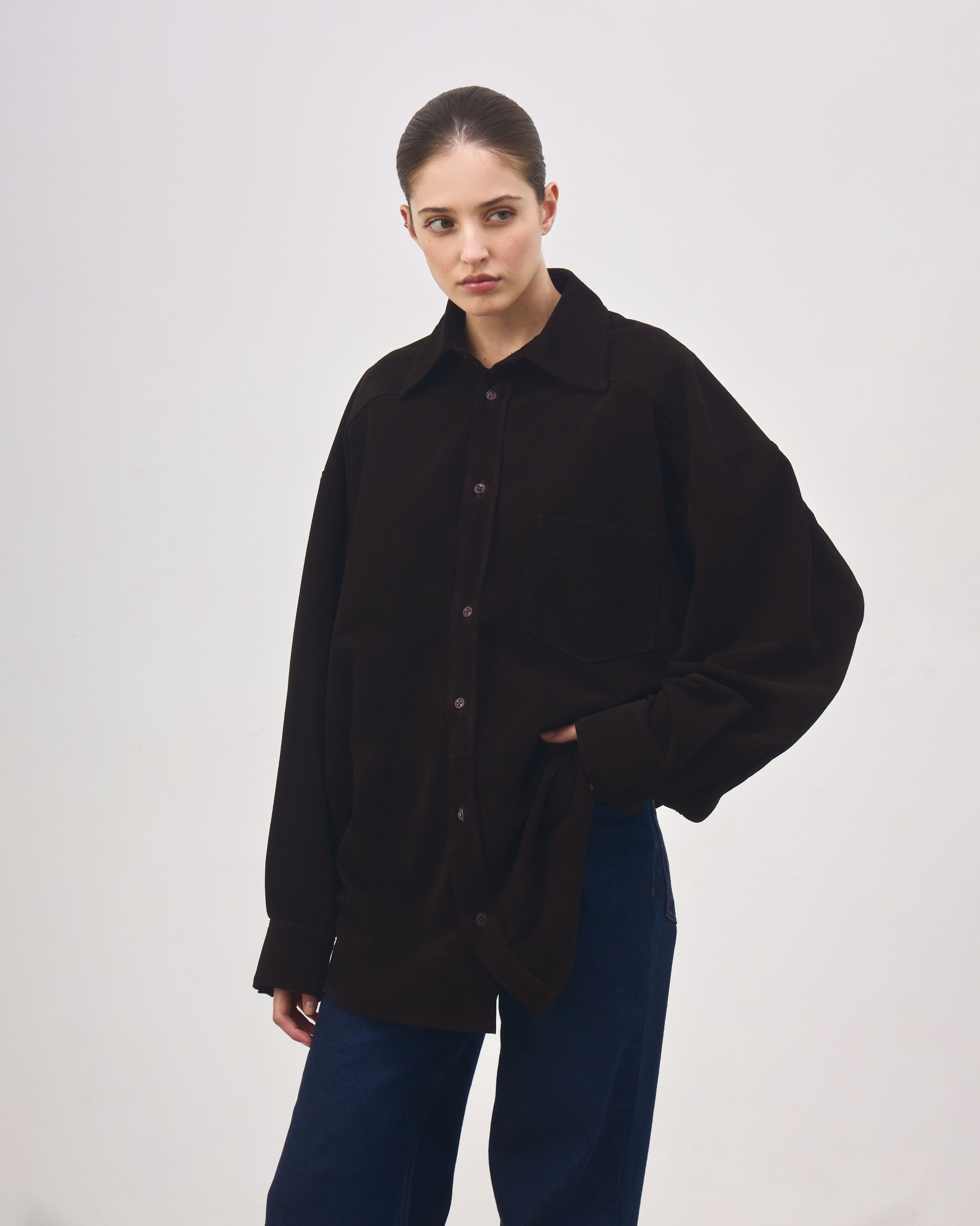 A Camisa Agnes é confeccionada em camurça natural, possui modelo oversized, colarinho, fechamento frontal por botões, bolso frontal, mangas longas com abotoamento duplo nos punhos e acabamento pespontado.