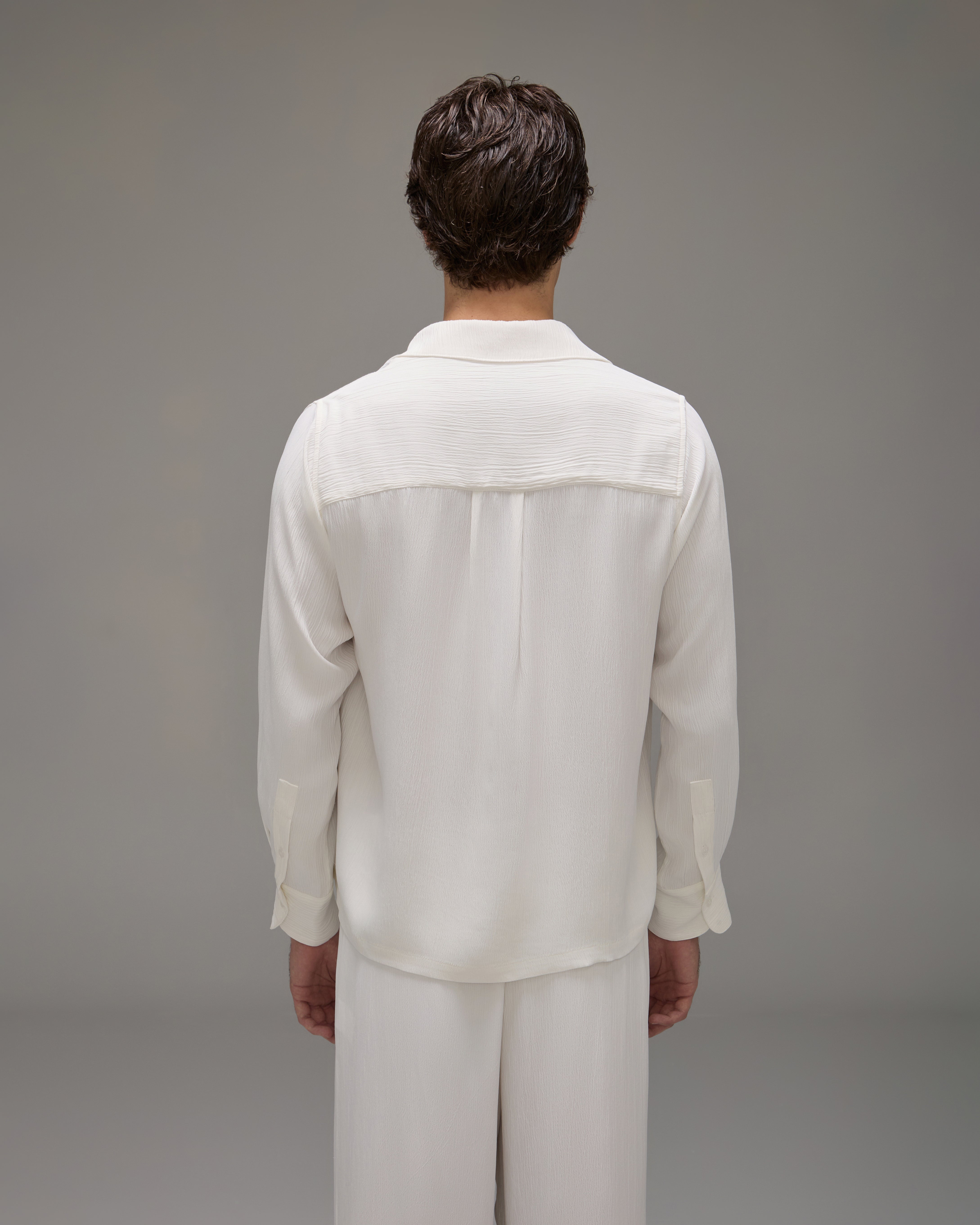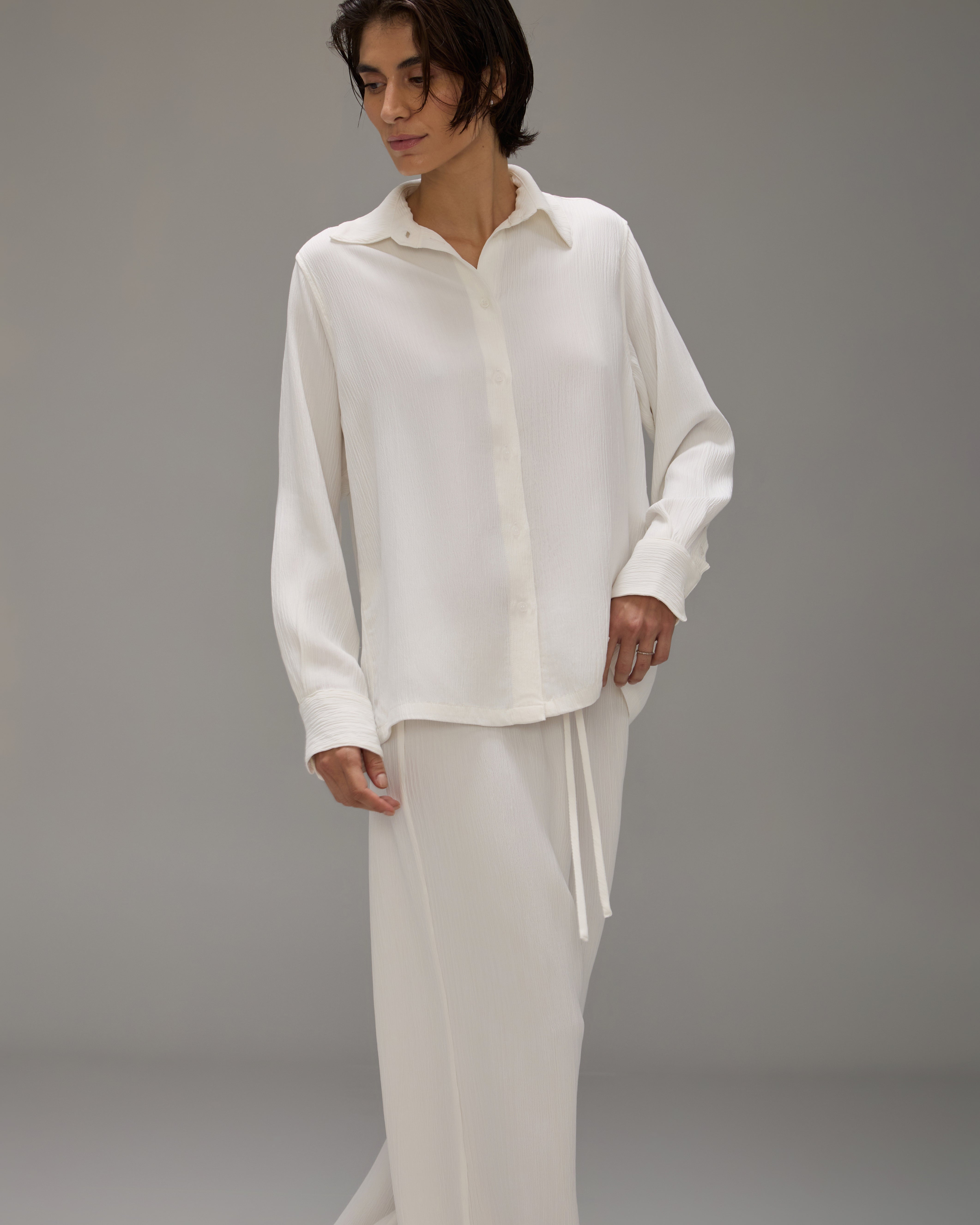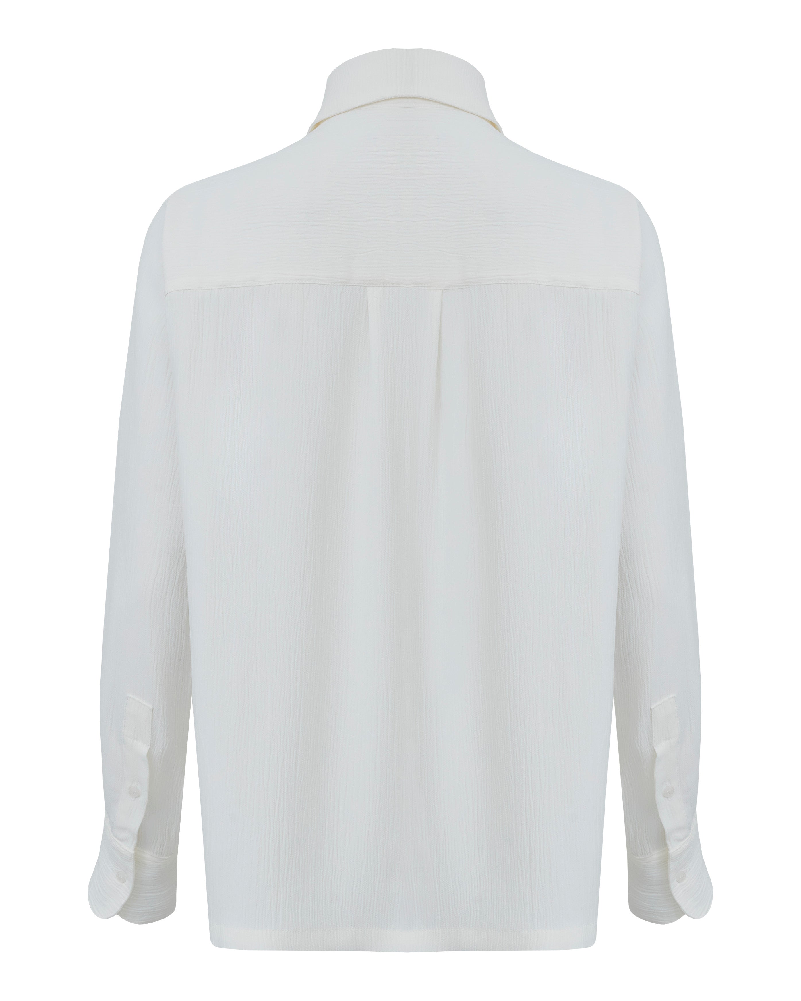 A Camisa Brisa é confeccionada em crepe texturizado, possui caimento fluído, colarinho, fechamento por botões personalizados Mondepars, mangas longas e barra posterior levemente alongada.