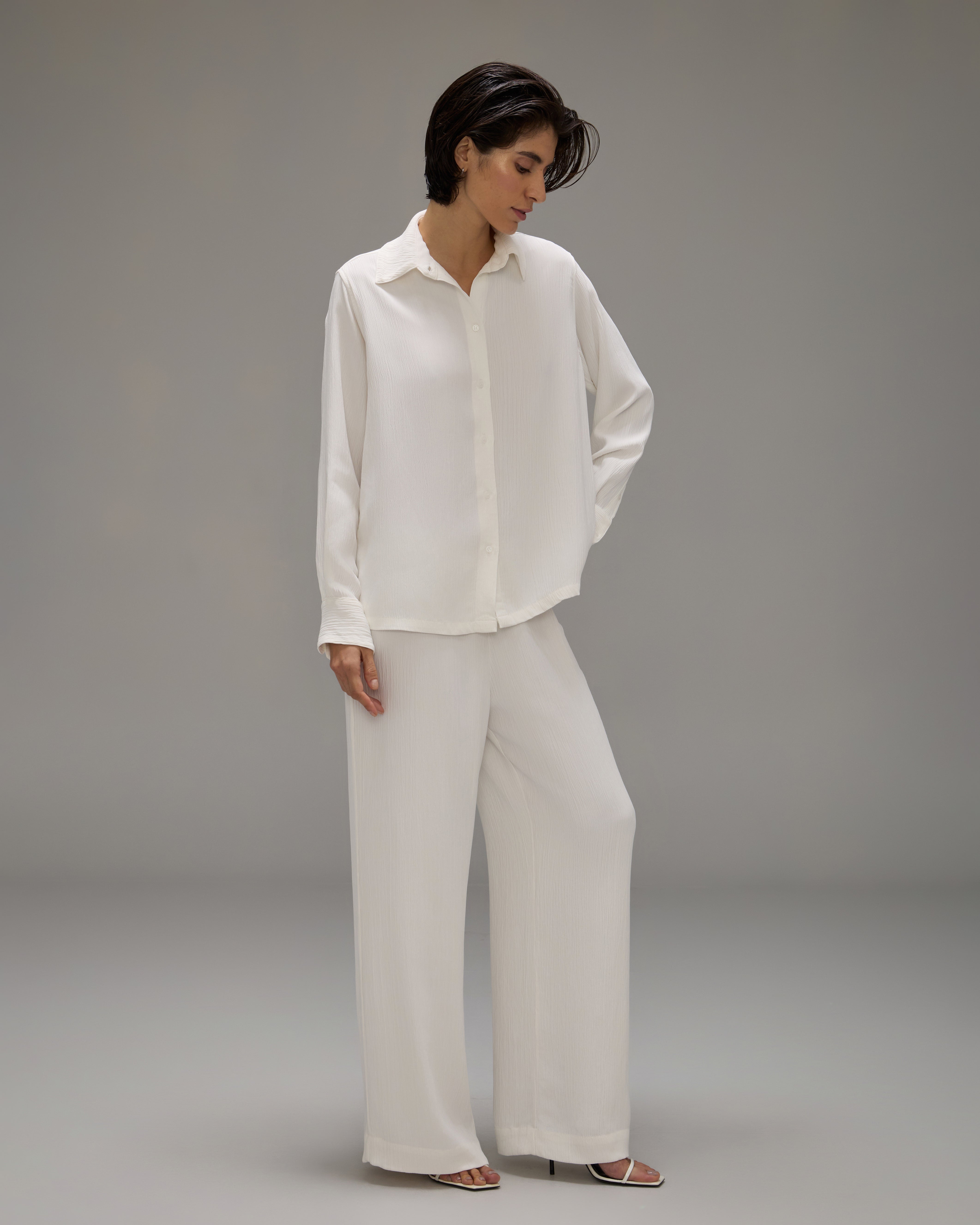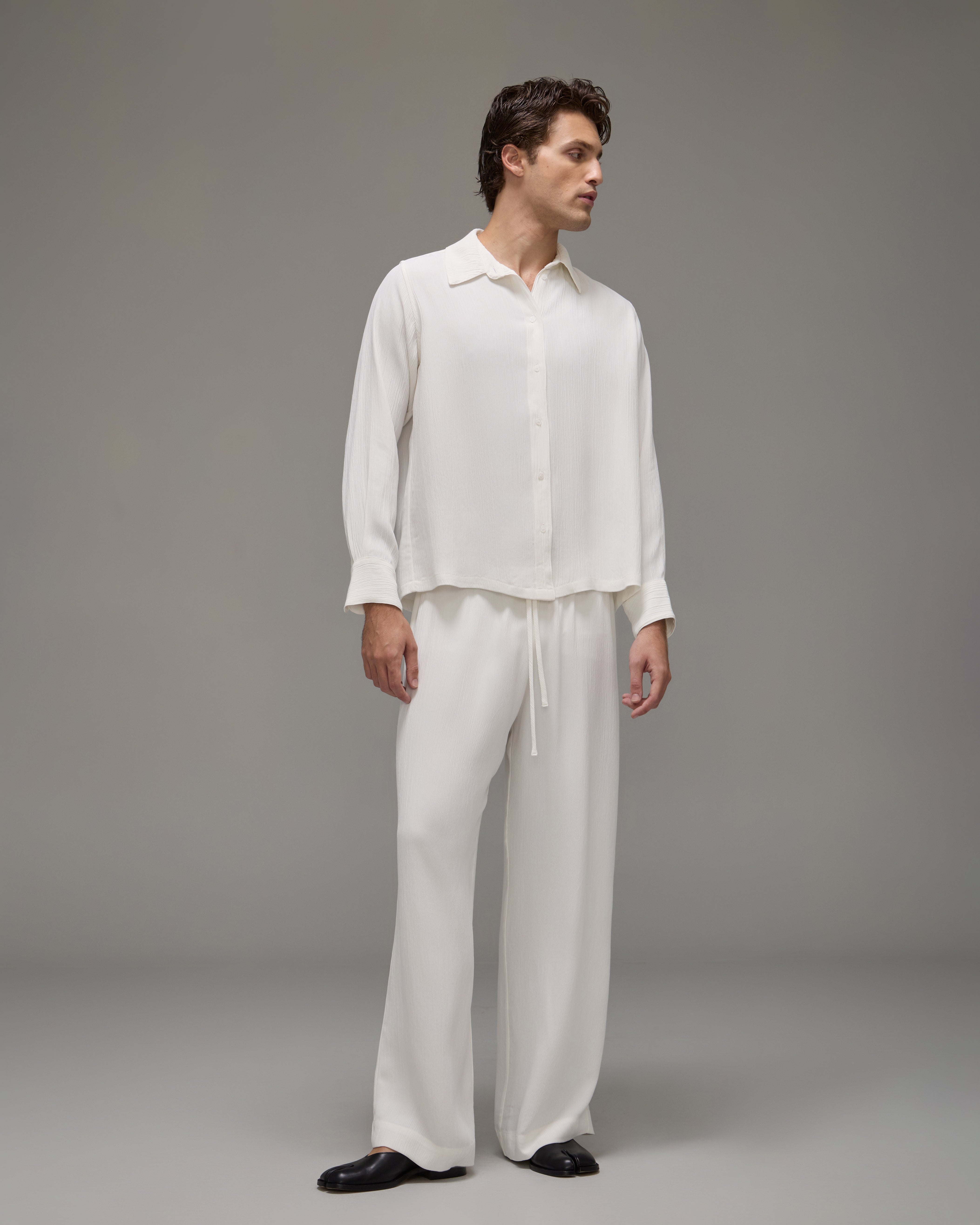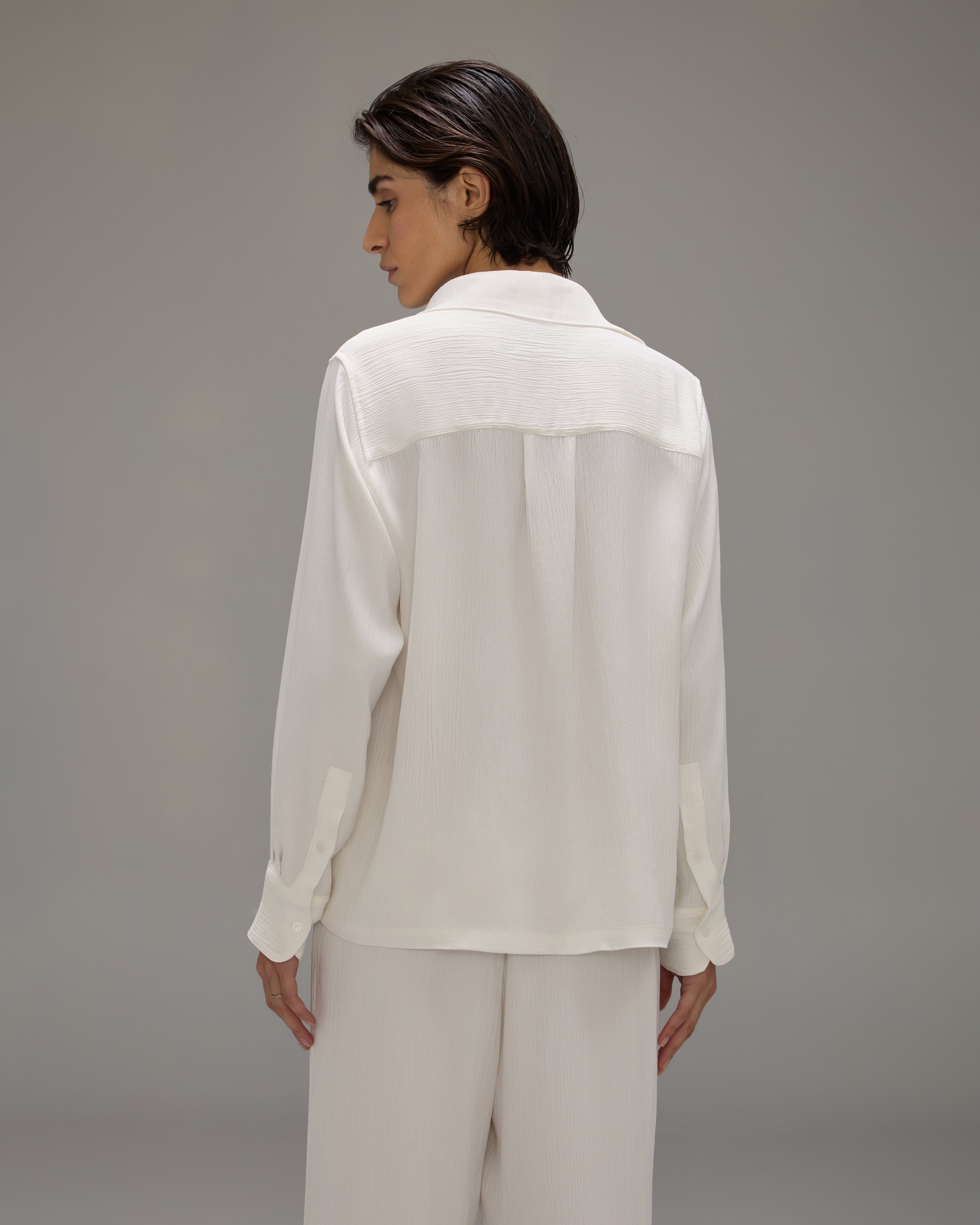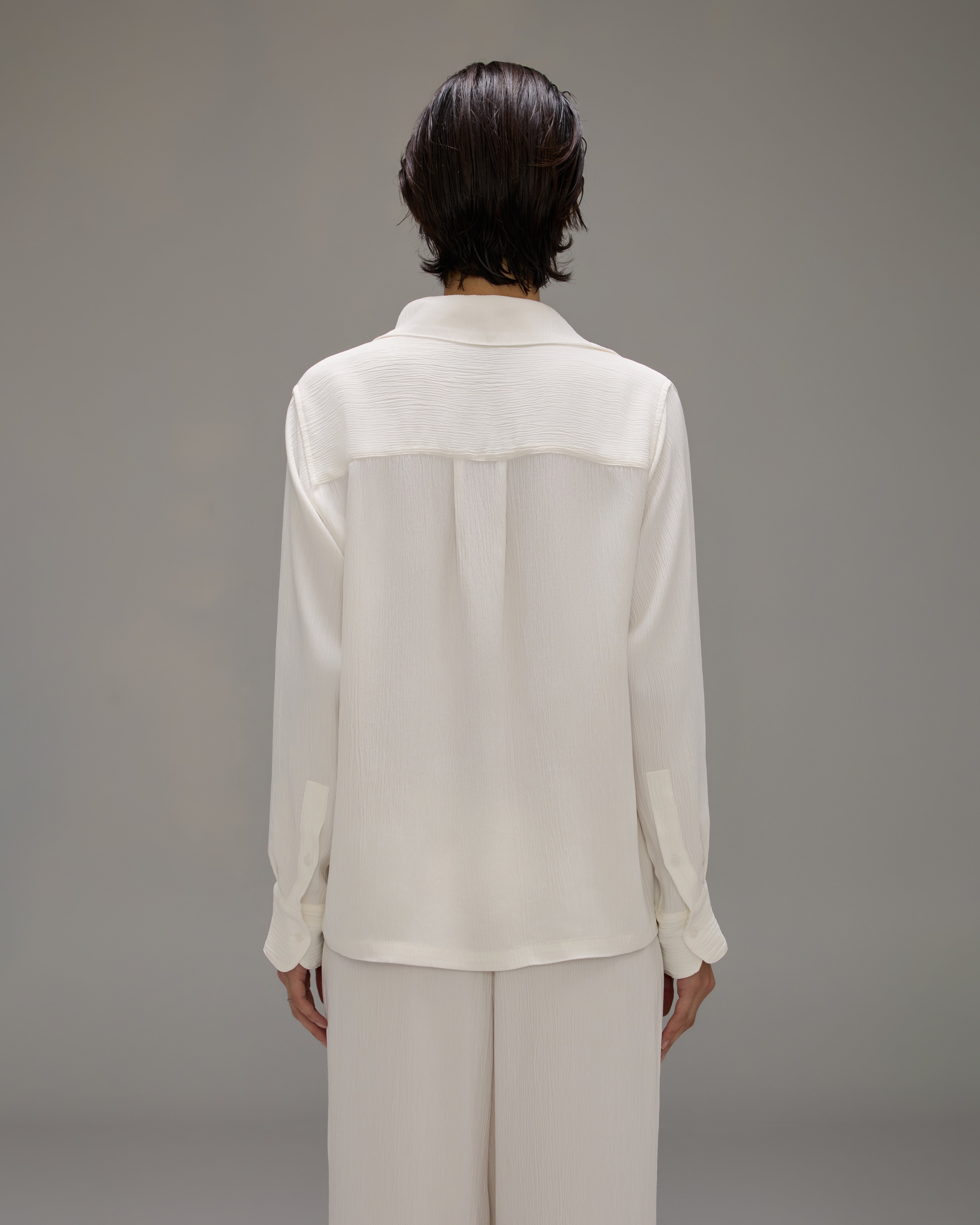 A Camisa Brisa é confeccionada em crepe texturizado, possui caimento fluído, colarinho, fechamento por botões personalizados Mondepars, mangas longas e barra posterior levemente alongada.