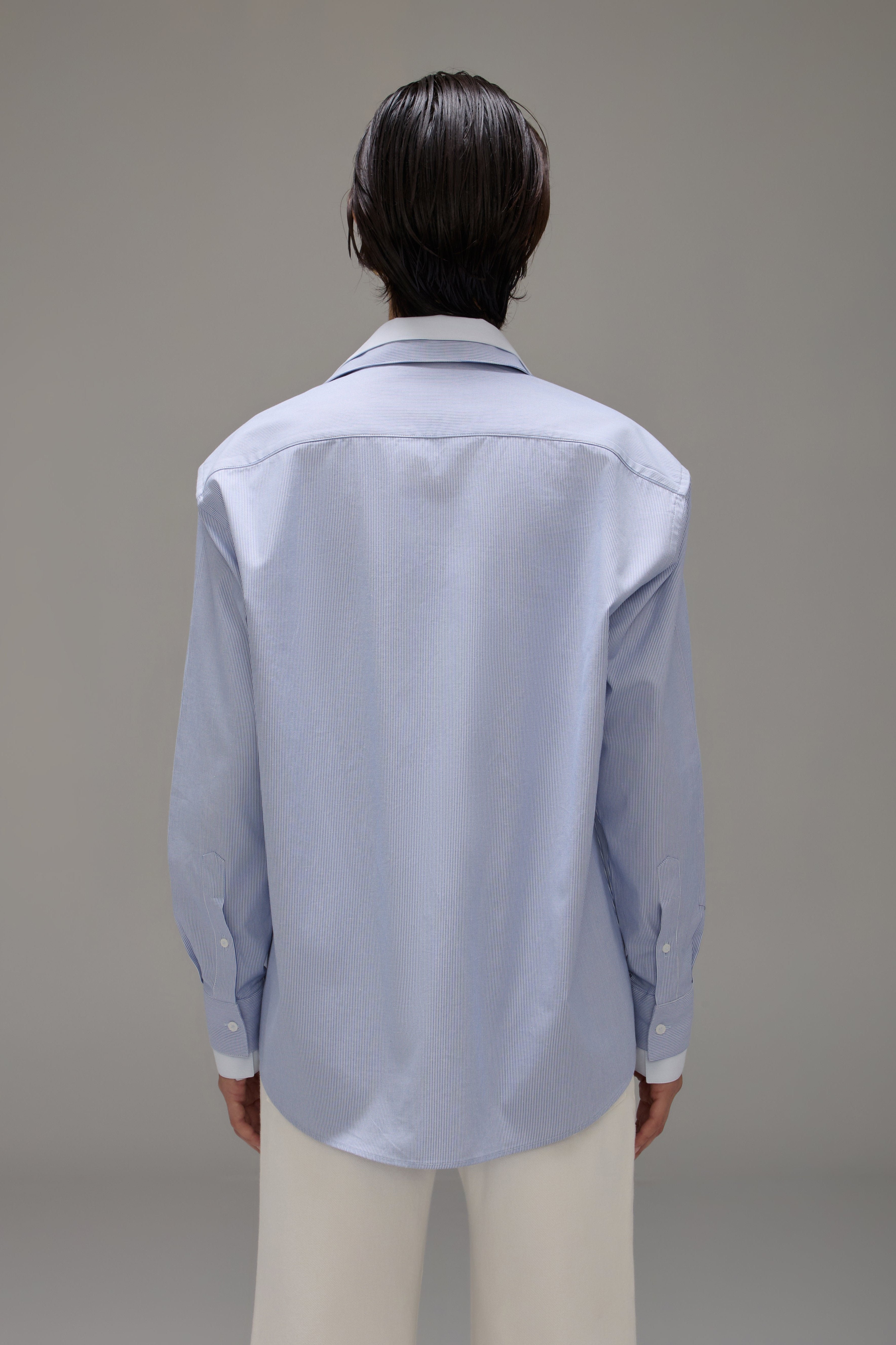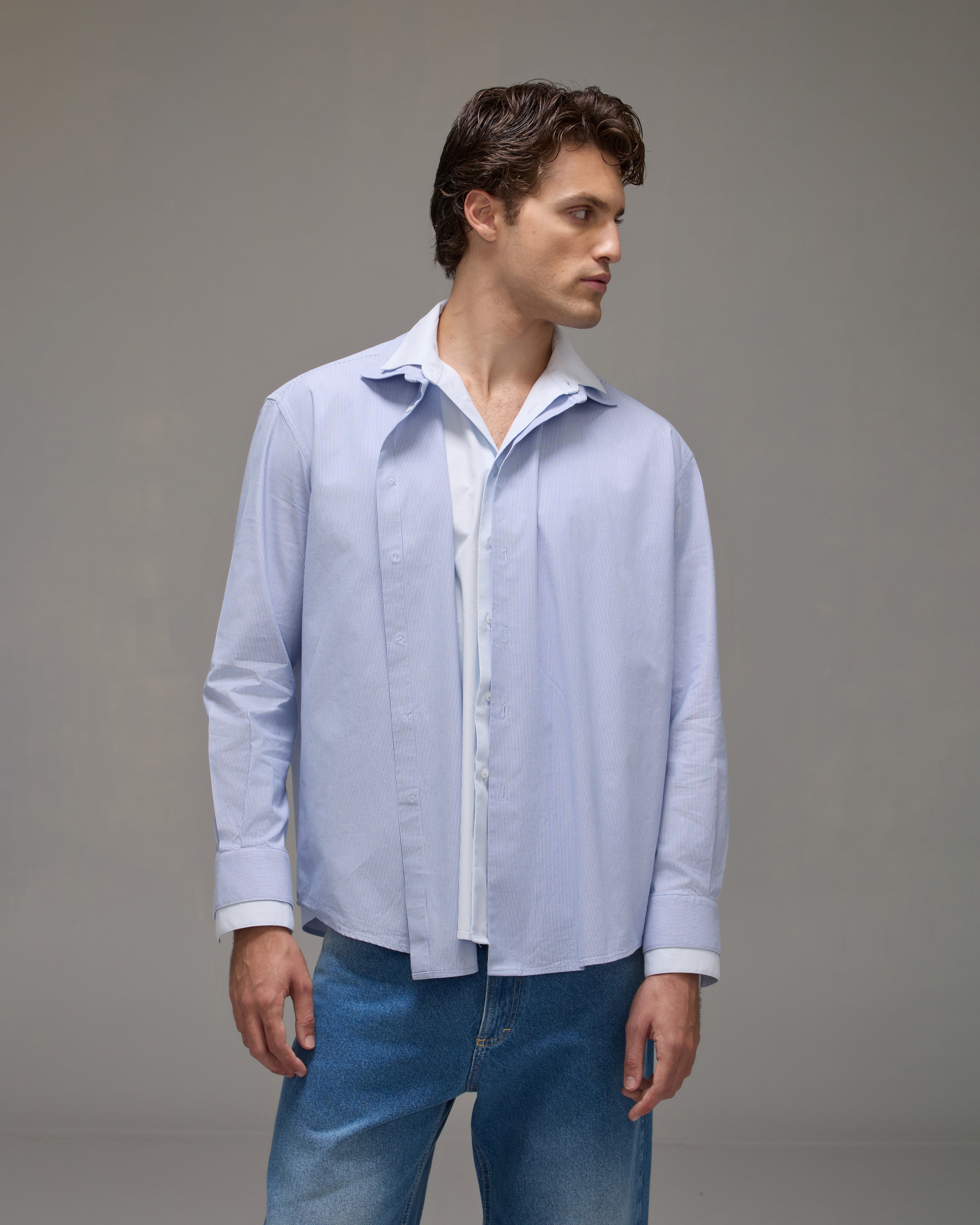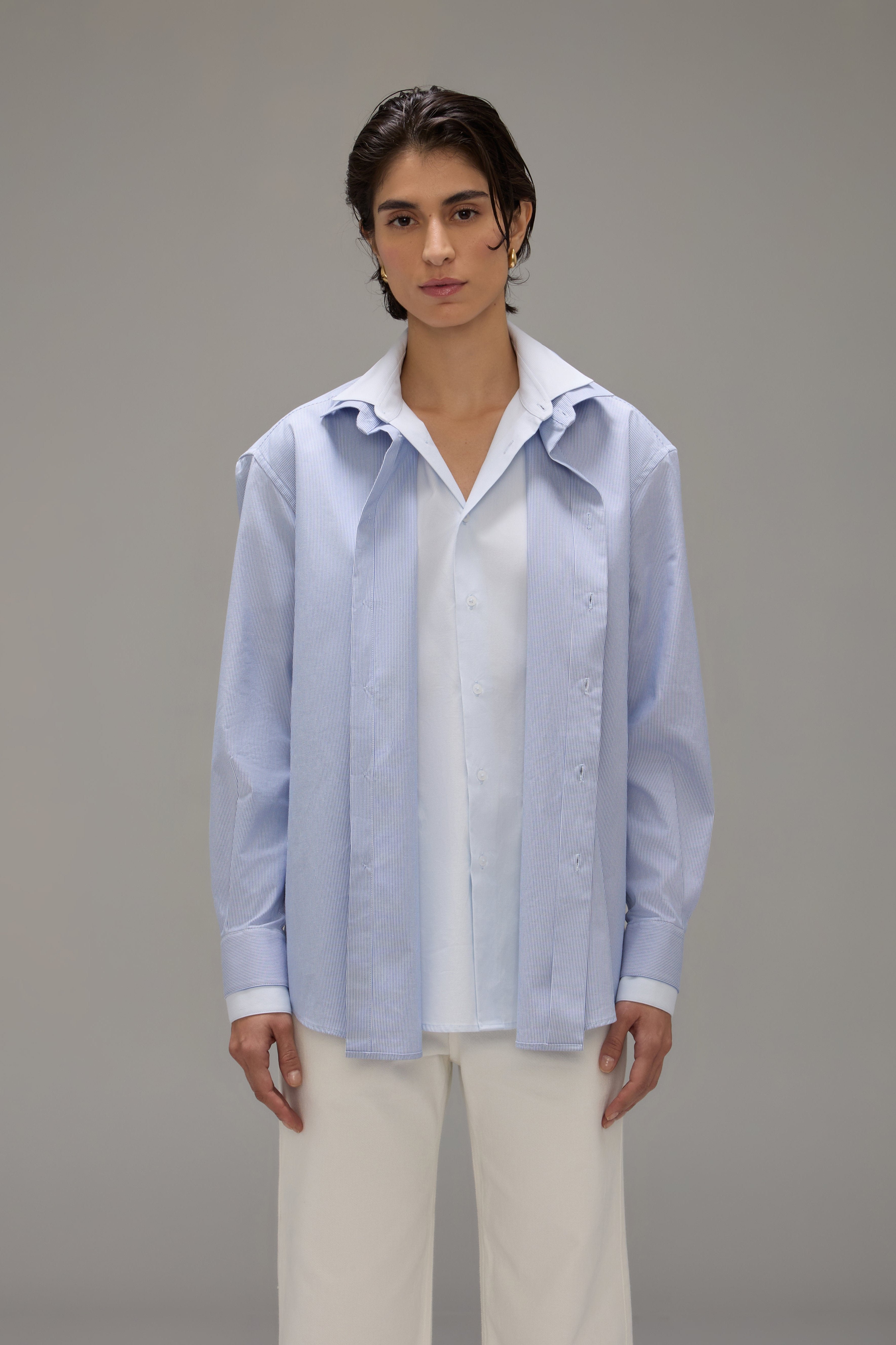 A Camisa Dua é confeccionada em tricoline, possui padronagem listrada externa, caimento true to size, colarinho duplo, fechamento frontal por botões personalizados, mangas longas, punho duplo com abotoamento, costuras francesas e acabamento tradicional.