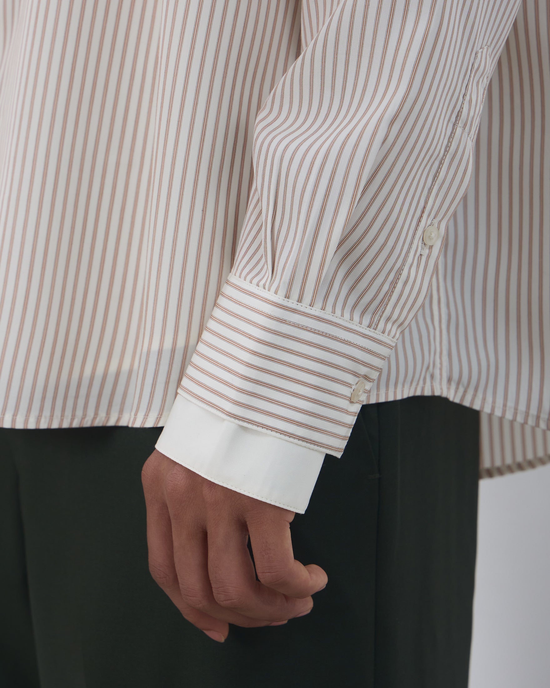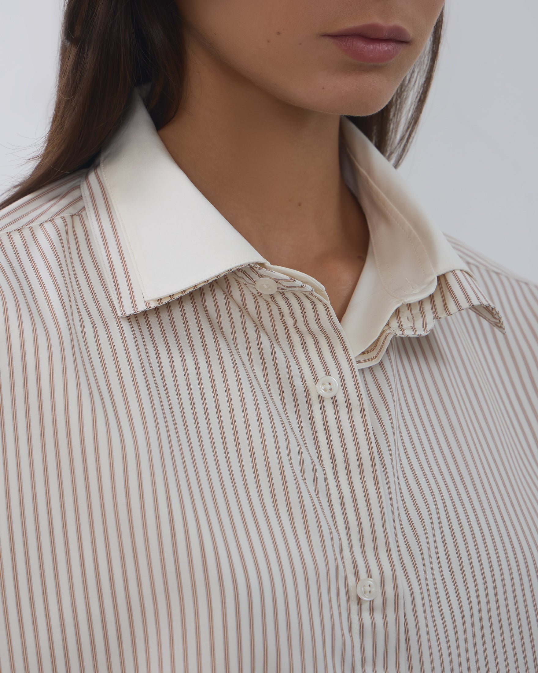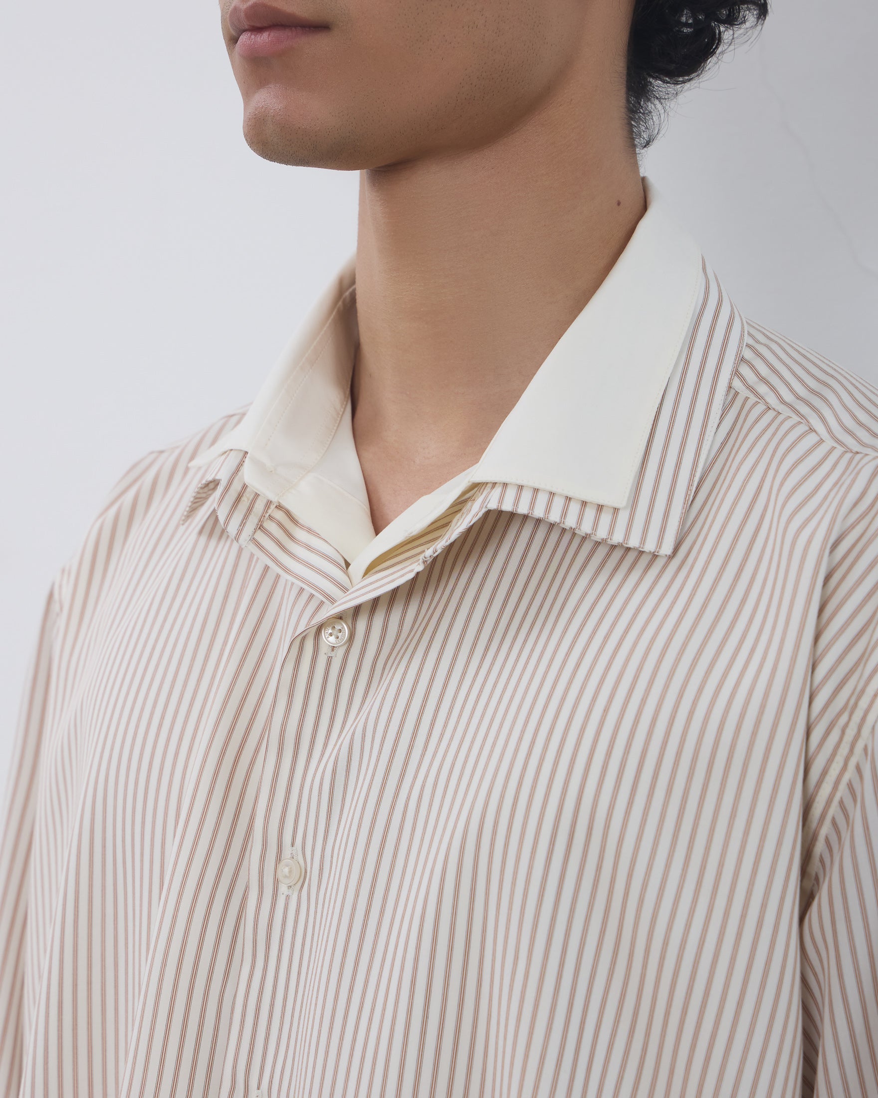 A Camisa Dua é confeccionada em tricoline importado de Portugal, possui padronagem listrada externa, caimento true to size, colarinho duplo, fechamento frontal por botões personalizados, mangas longas, punho duplo com abotoamento, costuras francesas e acabamento tradicional.
