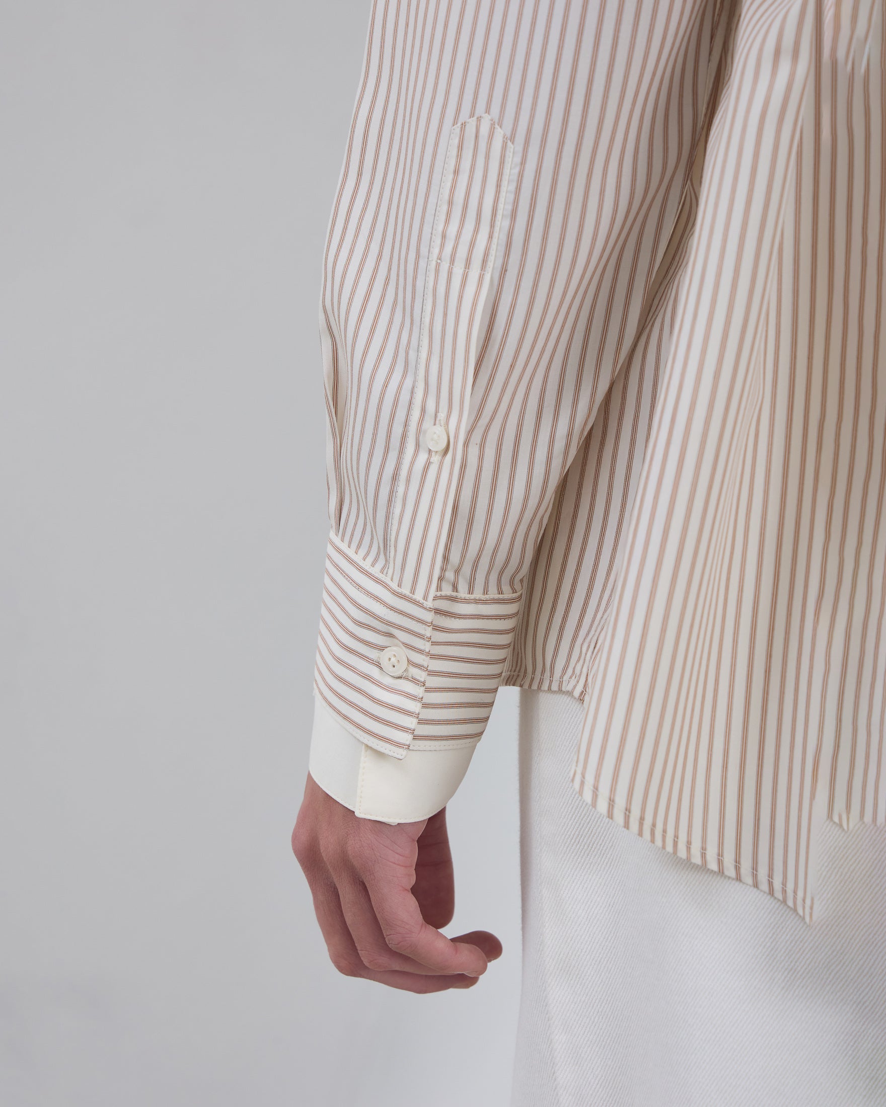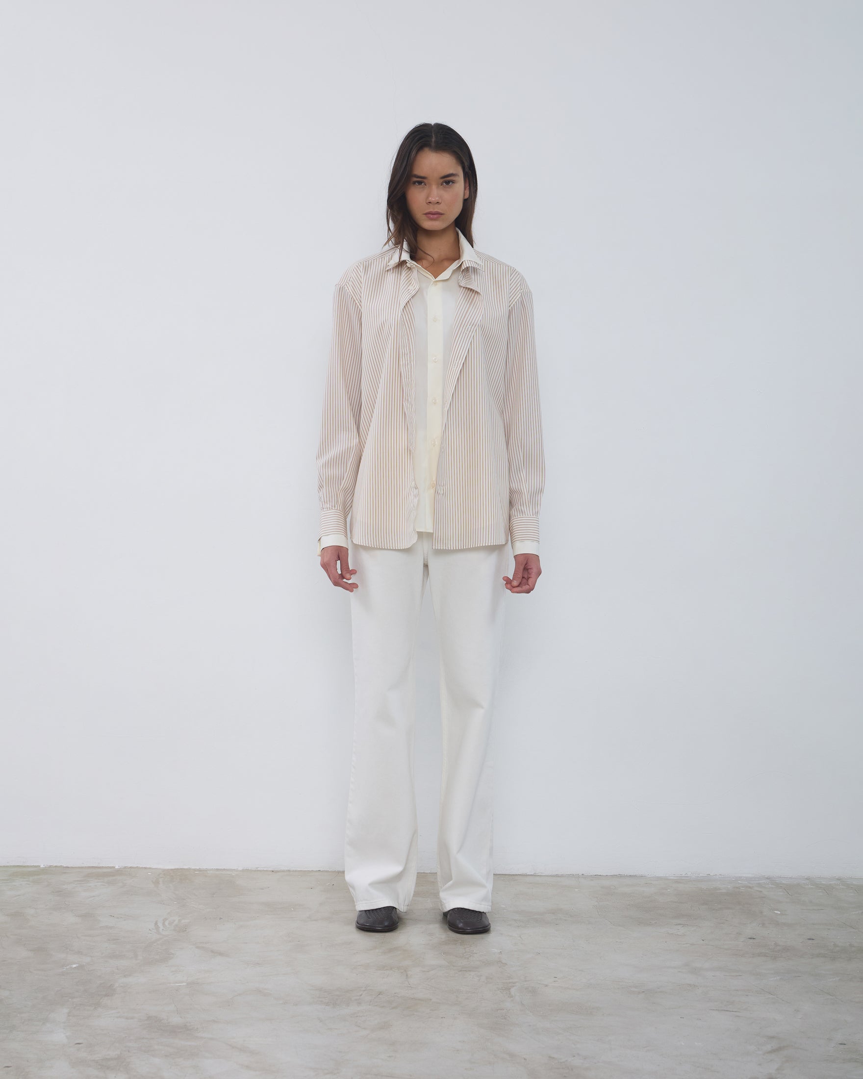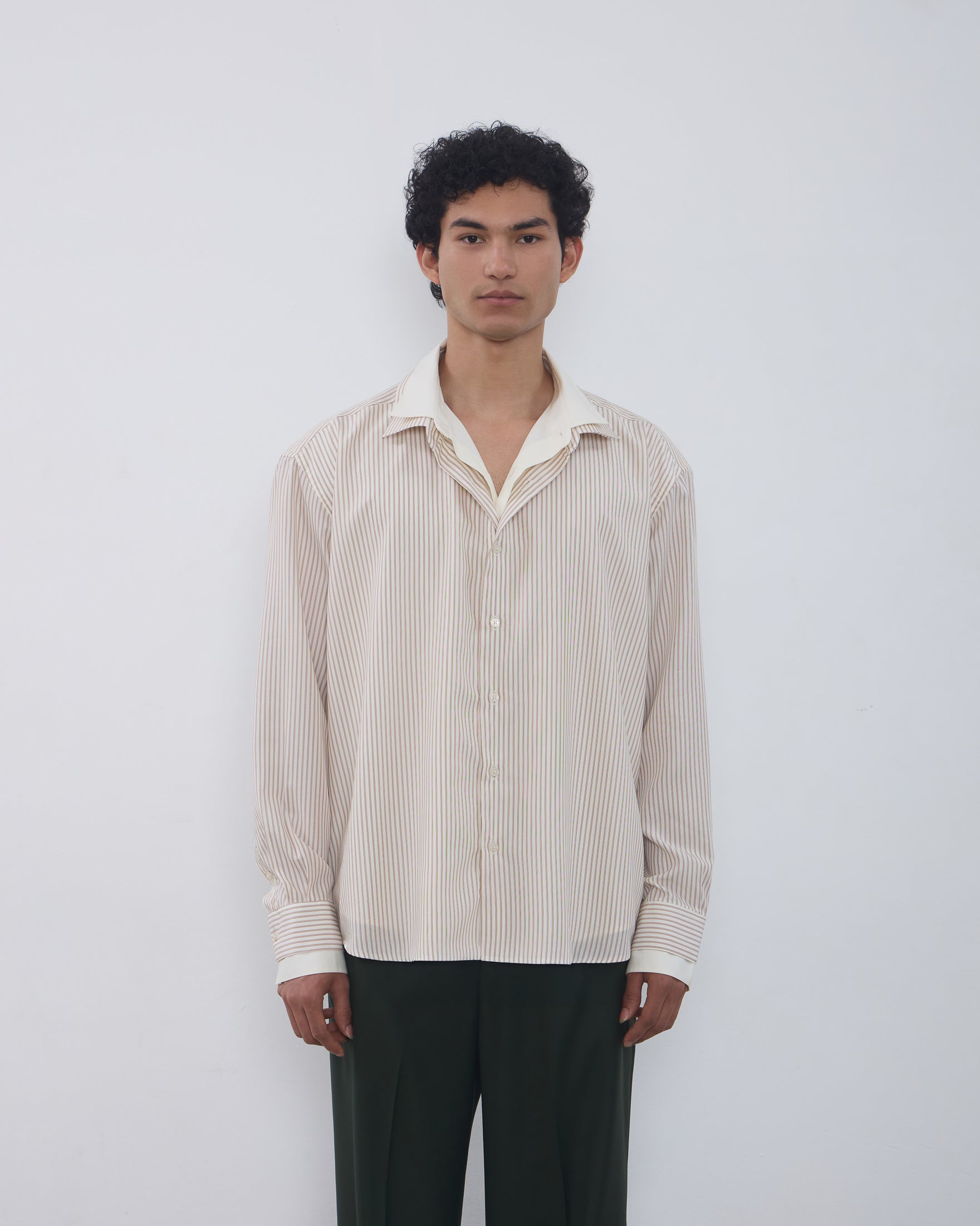 A Camisa Dua é confeccionada em tricoline importado de Portugal, possui padronagem listrada externa, caimento true to size, colarinho duplo, fechamento frontal por botões personalizados, mangas longas, punho duplo com abotoamento, costuras francesas e acabamento tradicional.