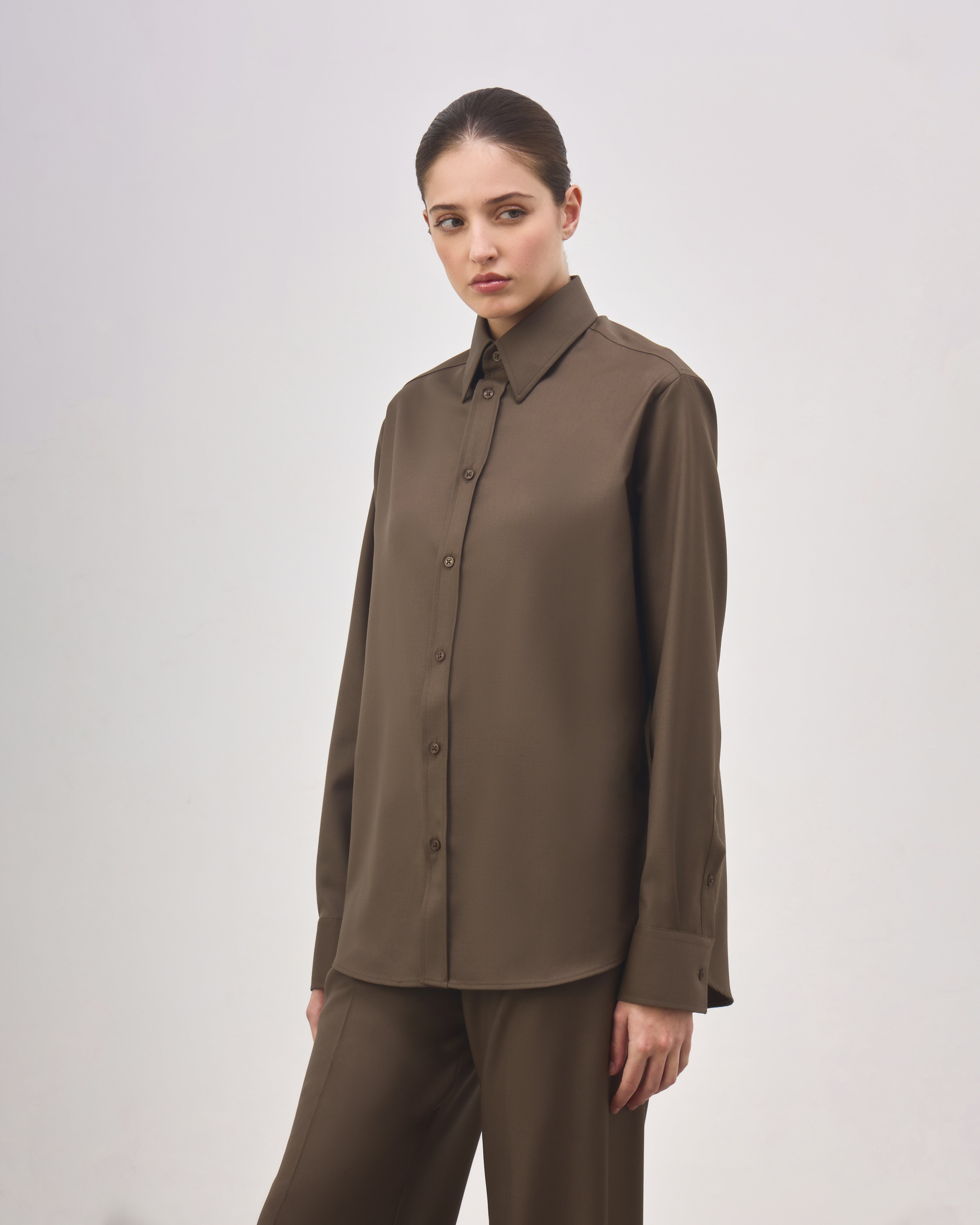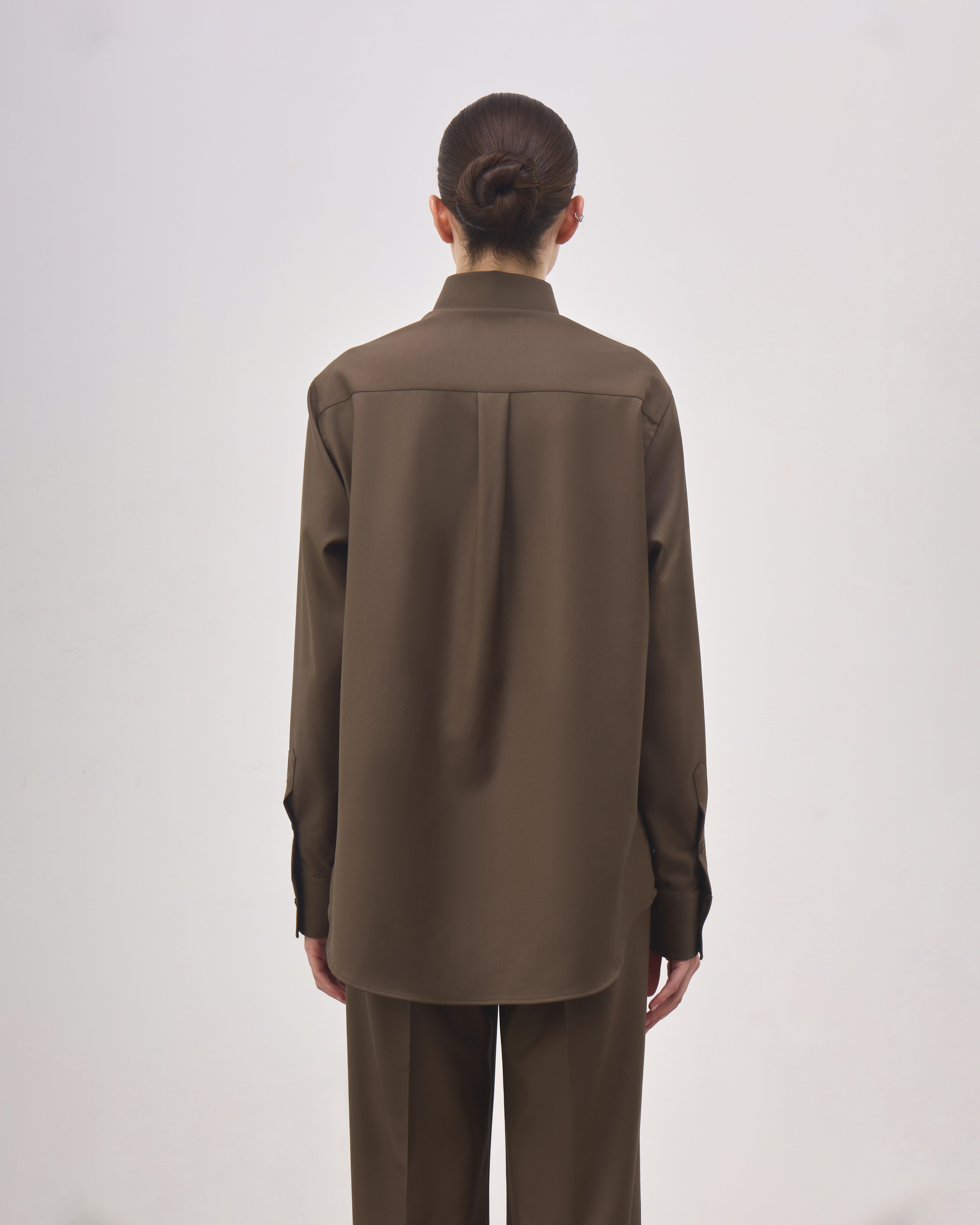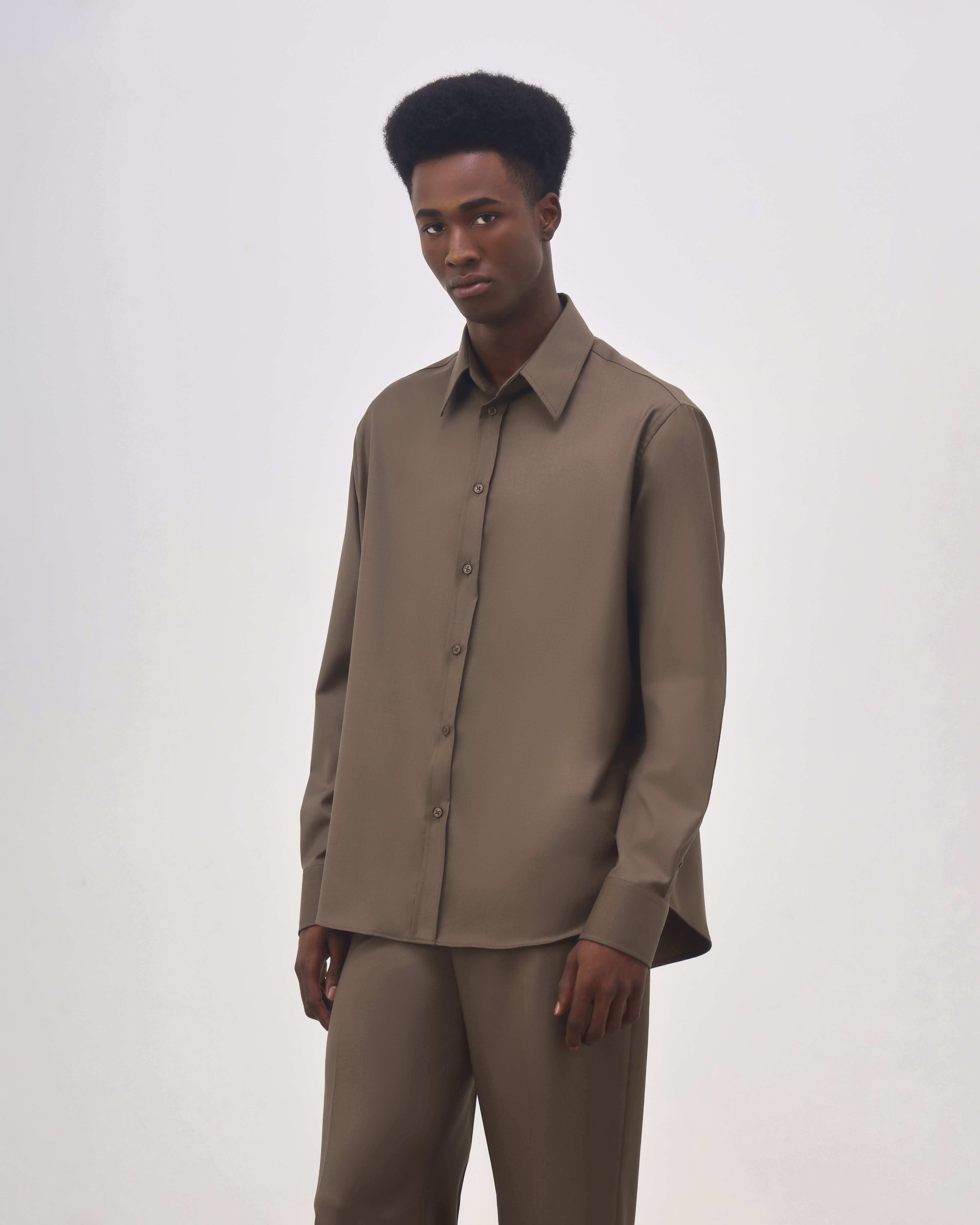 A Camisa Henri é confeccionada em lã, possui caimento reto, colarinho com entretela estruturada, fechamento frontal por botões personalizados exclusivos Mondepars, mangas longas, punhos com entretela estruturada e abotoamento duplo, prega centralizada nas costas e acabamento pespontado.