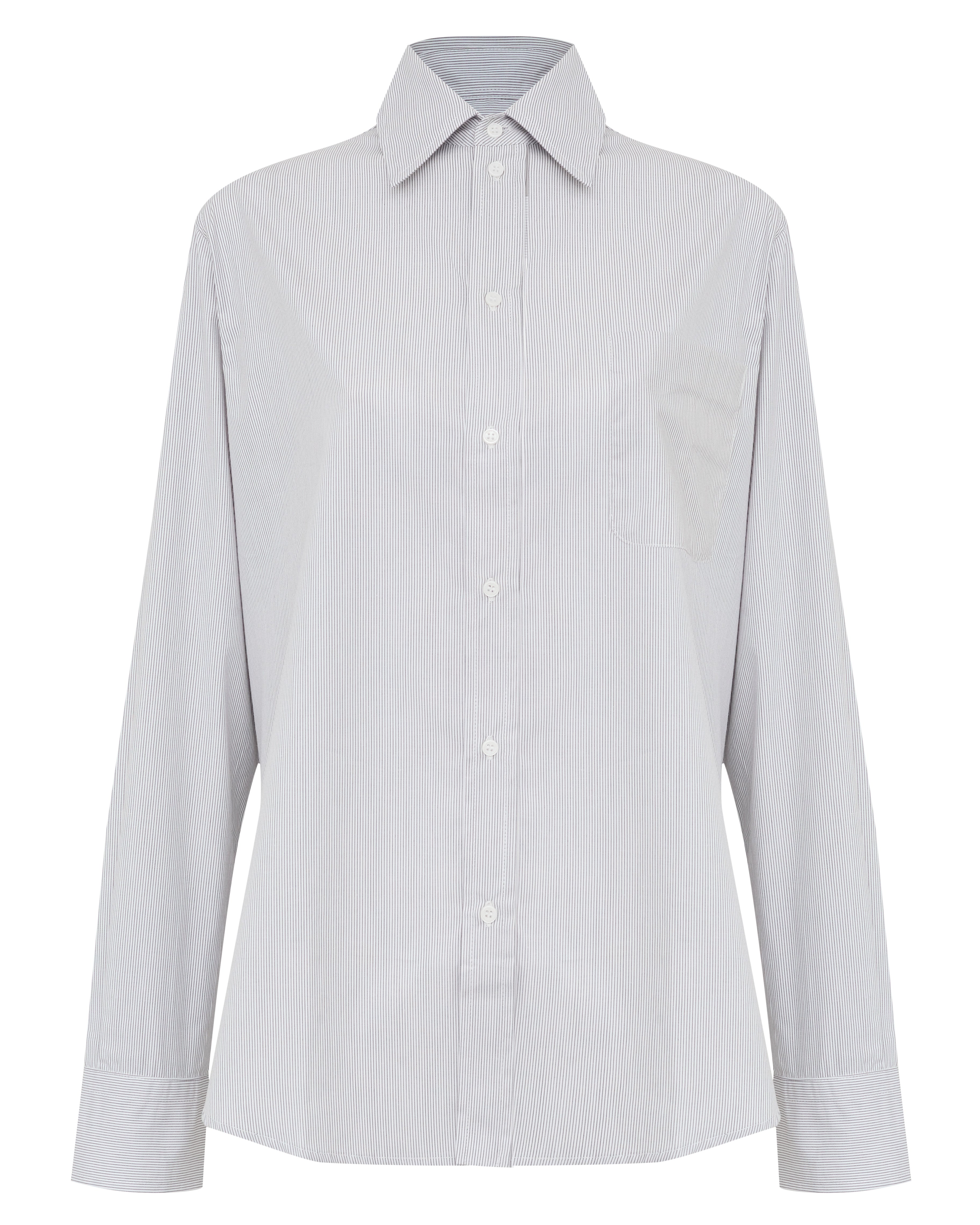 A Camisa Laguna é confeccionada em tricoline, possui padronagem listrada, colarinho com entretela, fechamento frontal por botões personalizados Mondepars, bordado na carcela, punhos com entretela e abotoamento duplo, barra das laterais com leve curvatura e acabamento feito por costuras francesas.