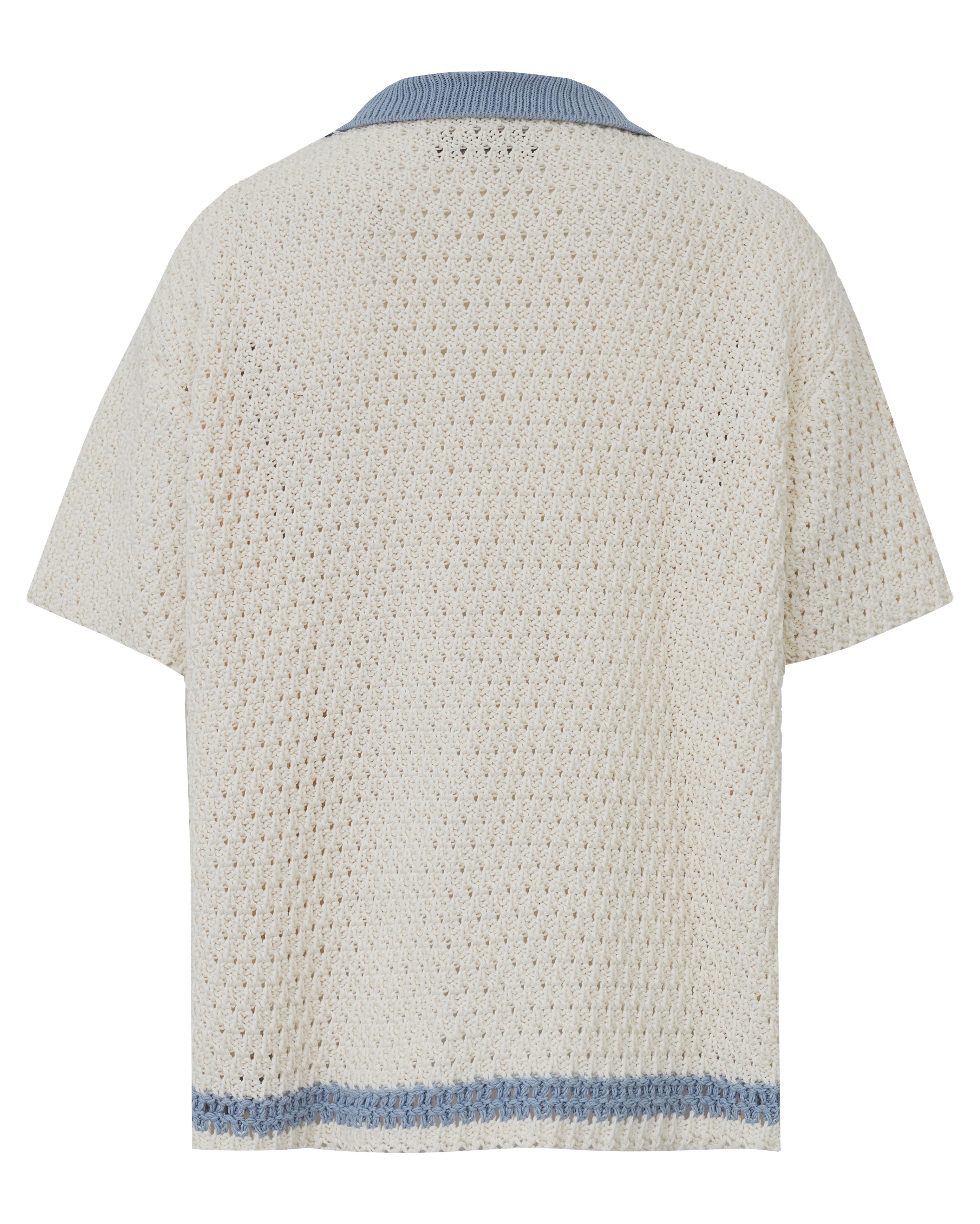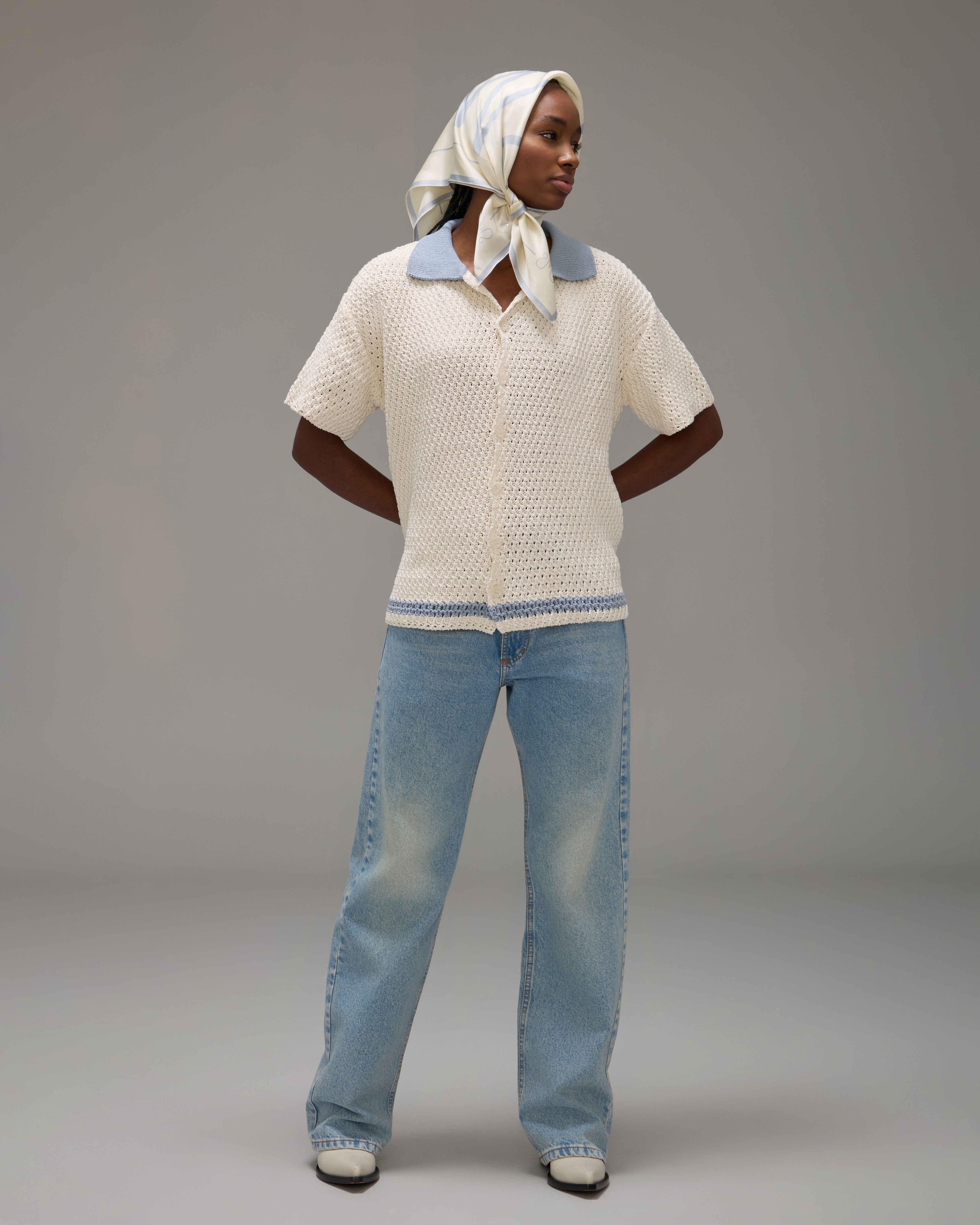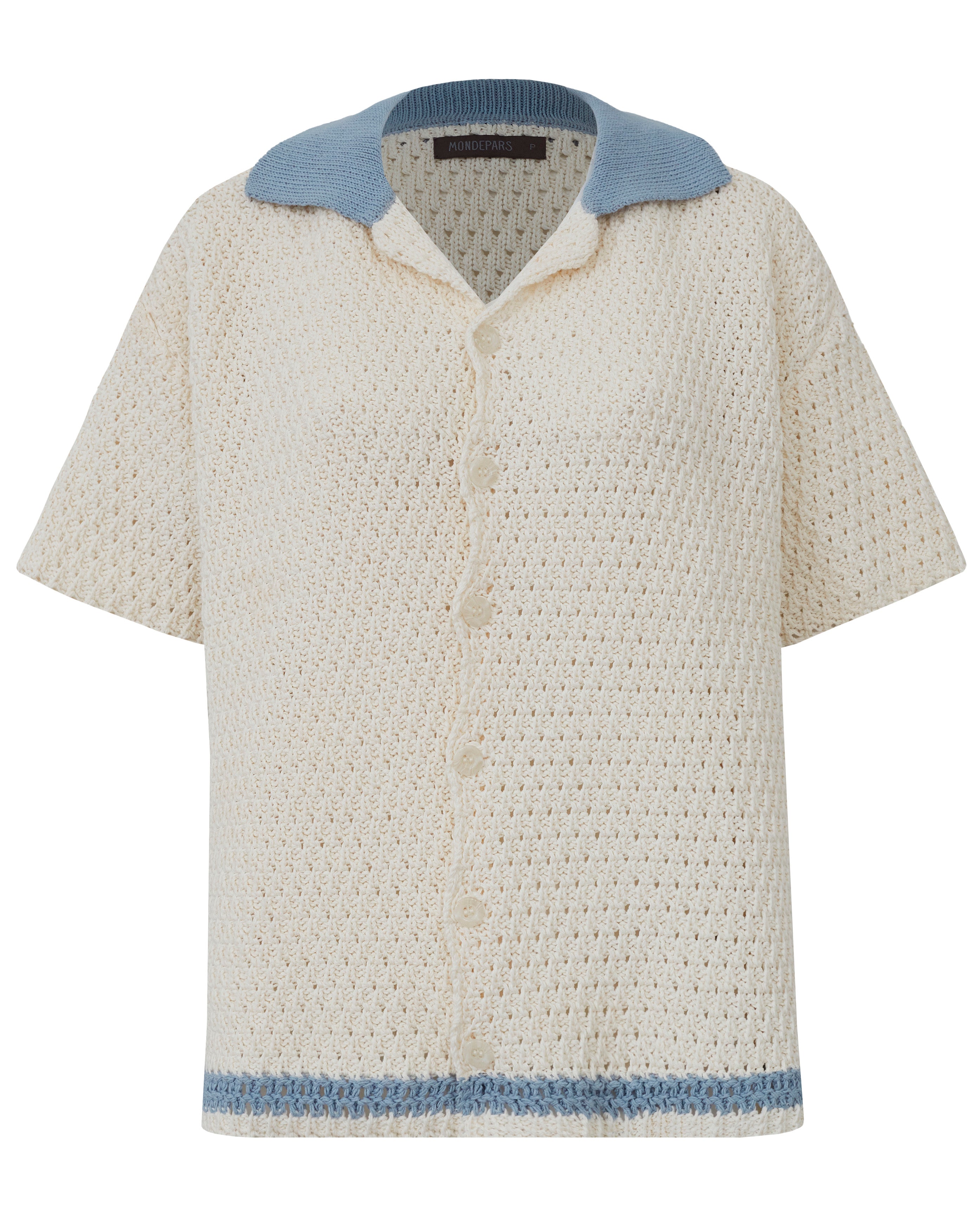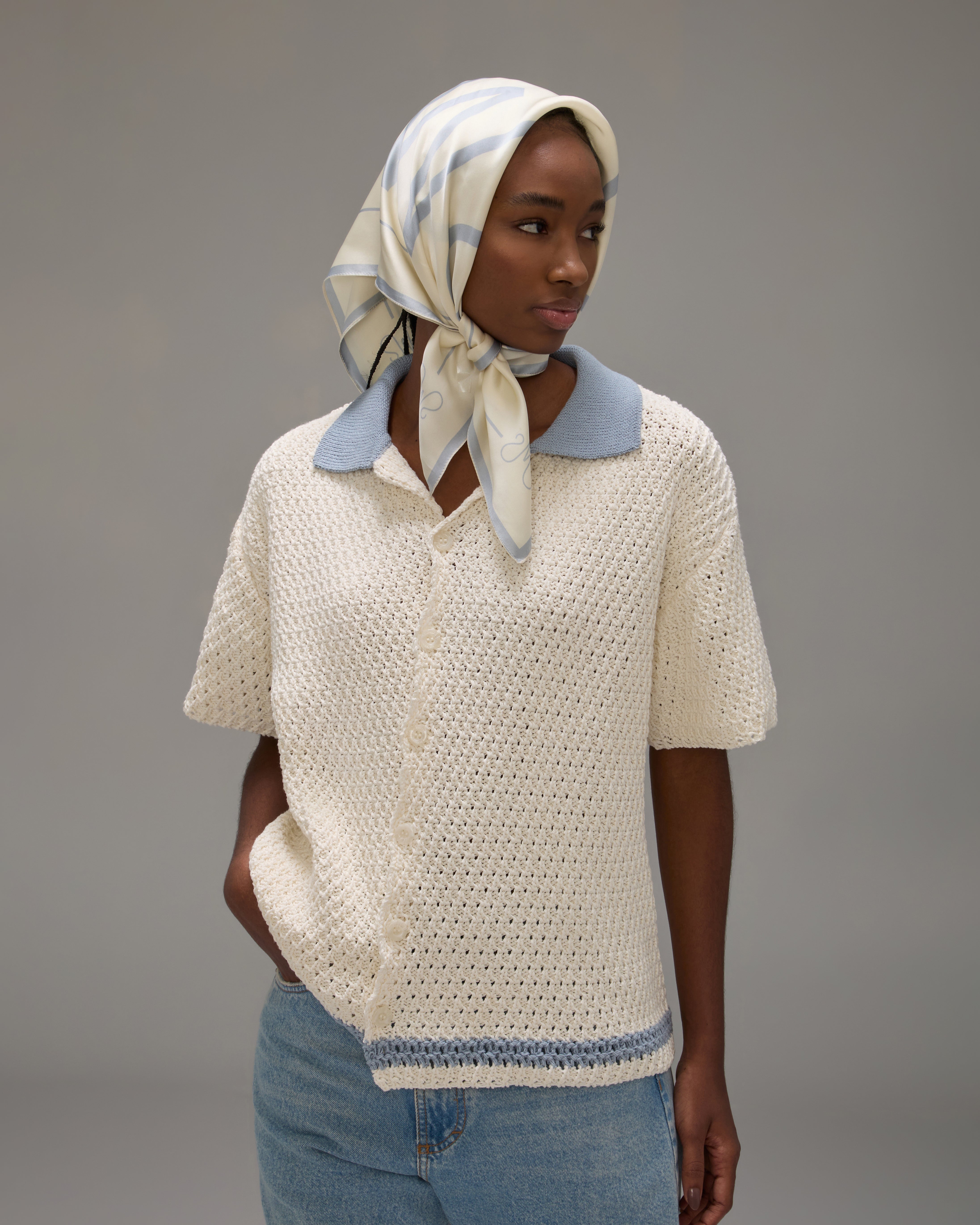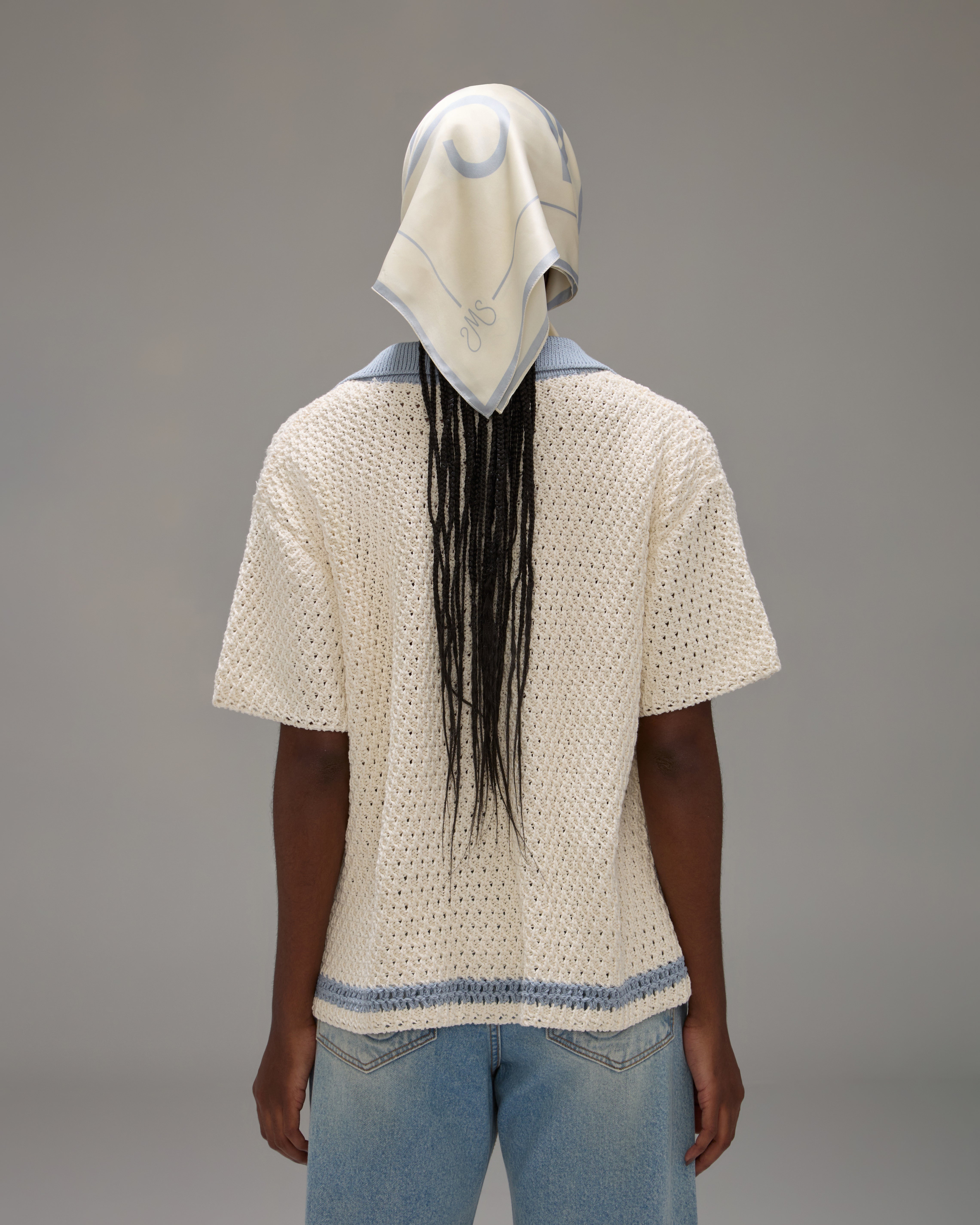 A Camisa Nino é confeccionada em tricot com trama encorpada, possui padronagem desenvolvida especialmente para a peça, caimento reto, colarinho, fechamento frontal por botões personalizados, mangas curtas, barra reta e acabamento canelado.