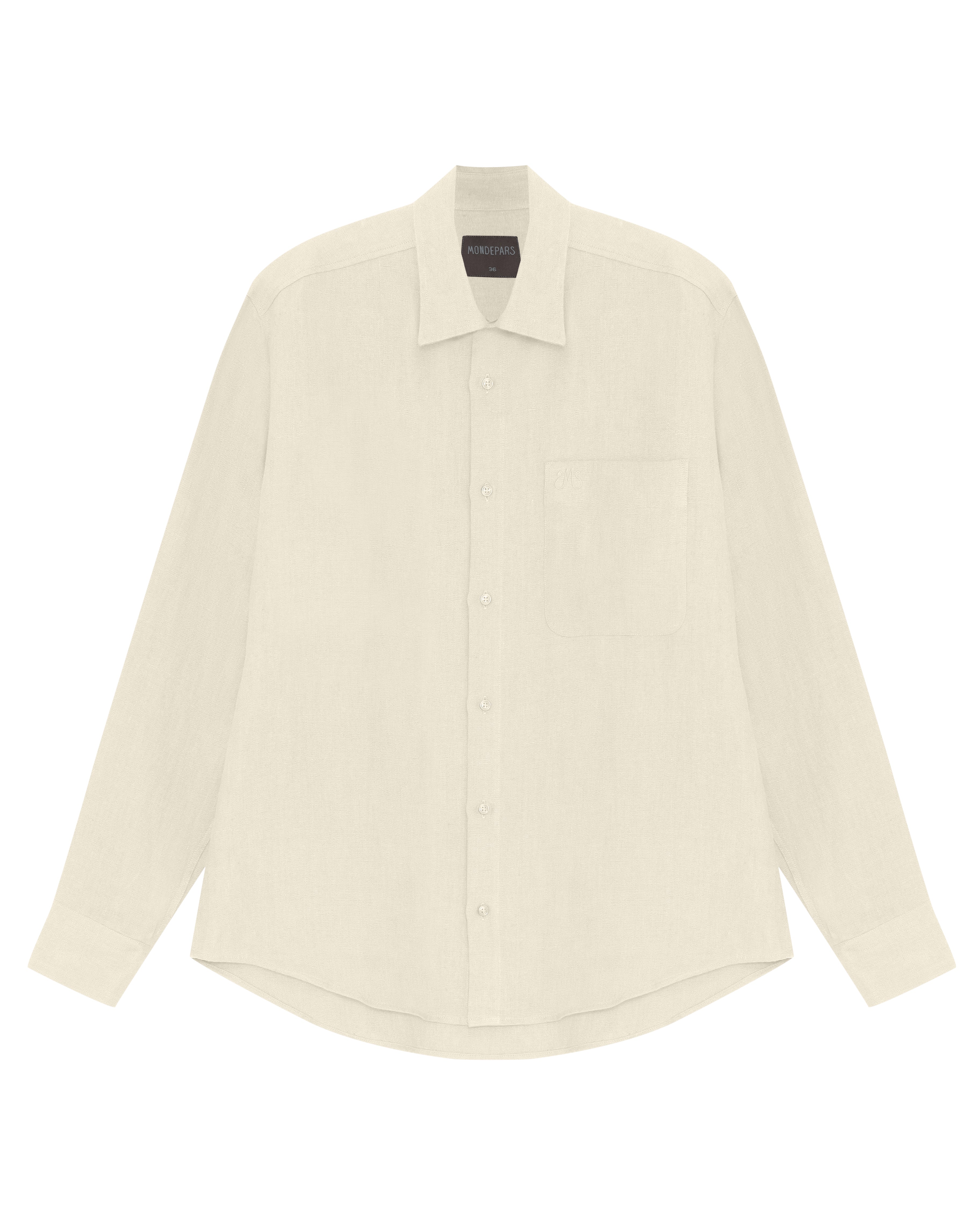 A Camisa Sal é confeccionada em linho, possui caimento true to size, colarinho, fechamento frontal por botões personalizados, bolso frontal com logo bordado, mangas longas, punho com abotoamento duplo, costuras francesas e acabamento tradicional.