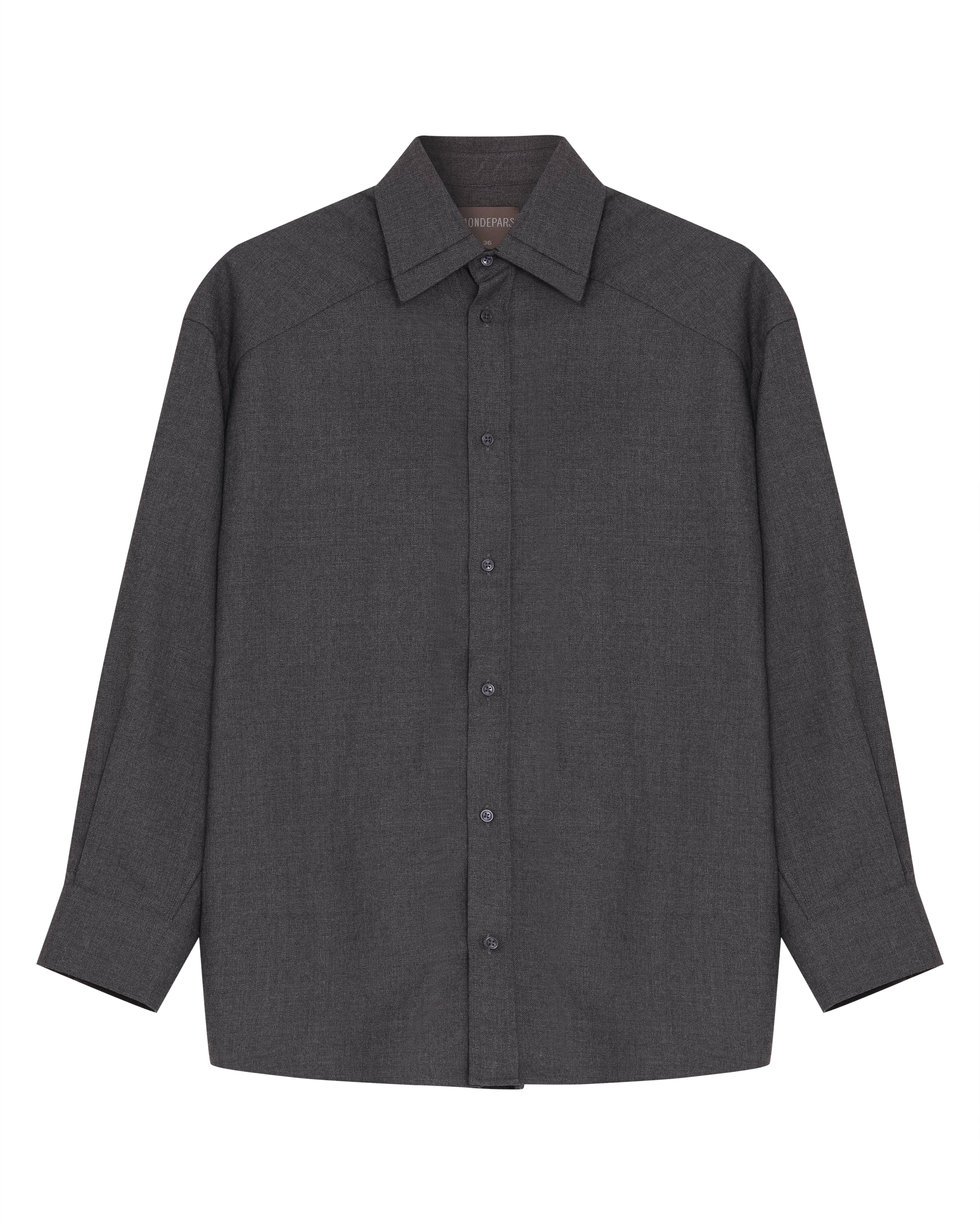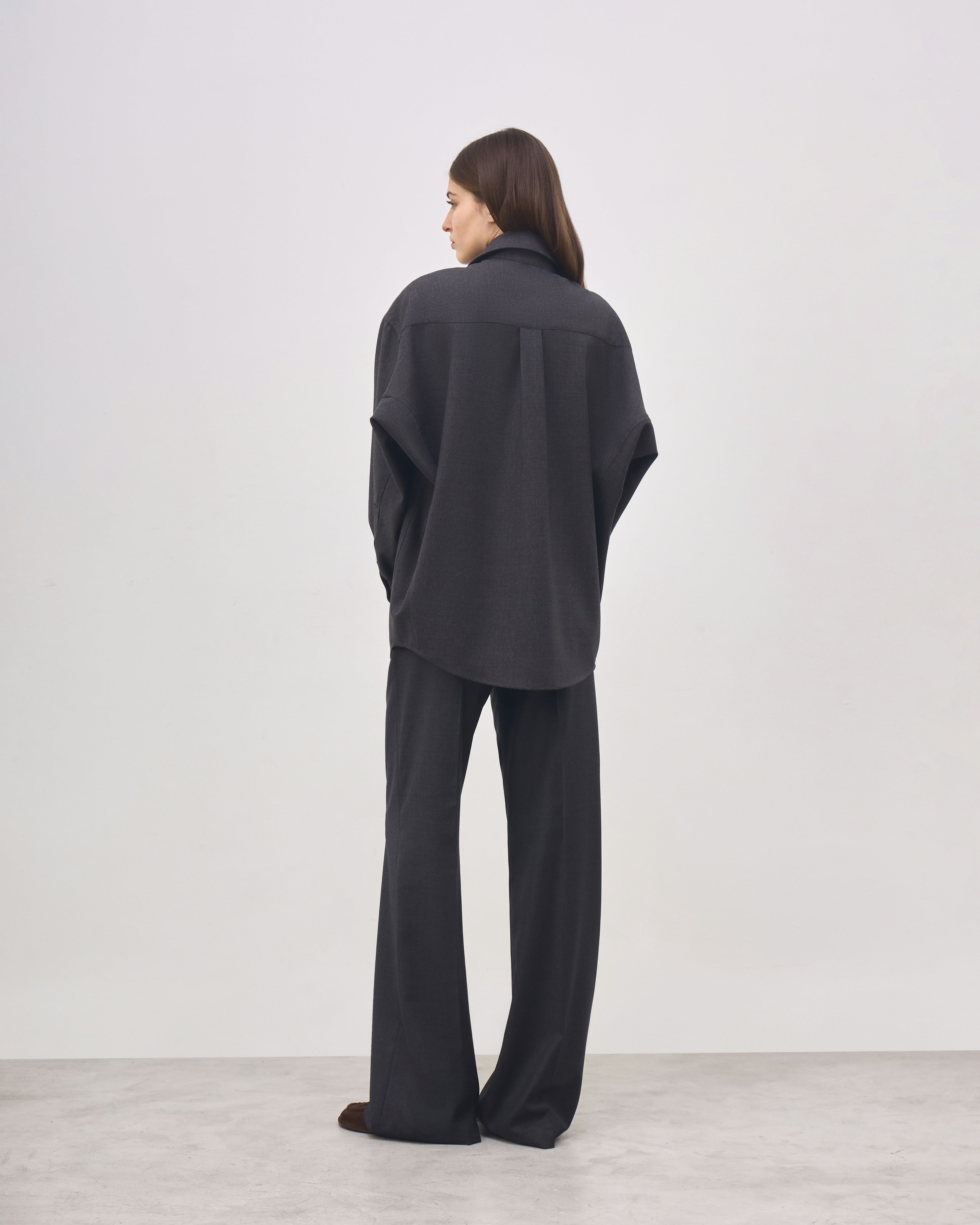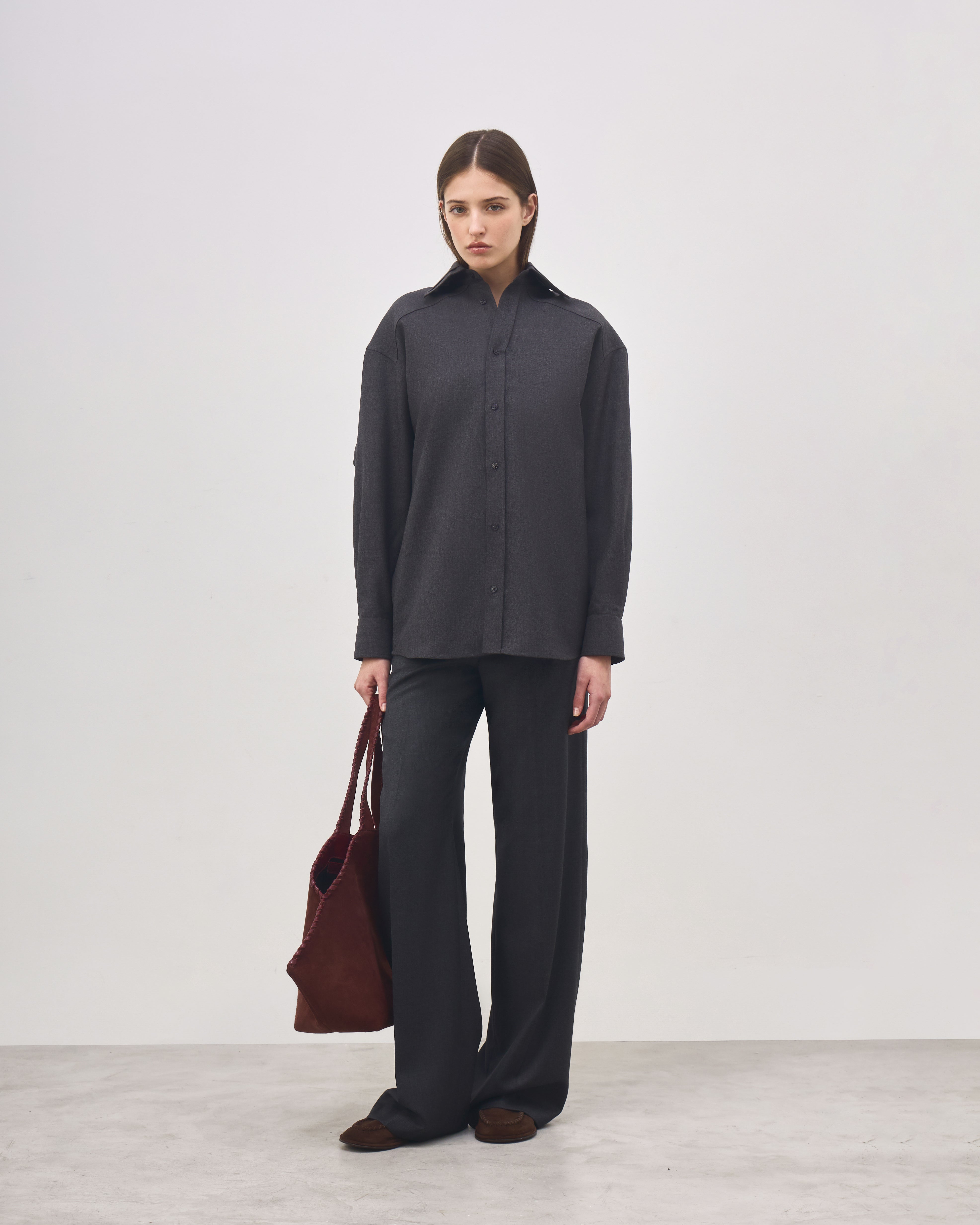 A Camisa Ulysses é confeccionada em lã, possui modelagem ampla, caimento oversized, modelo estruturado, colarinho com efeito duplo, fechamento frontal por botões, mangas longas com abotoamento duplo nos punhos, bolso frontal, prega posterior e acabamento pespontado.