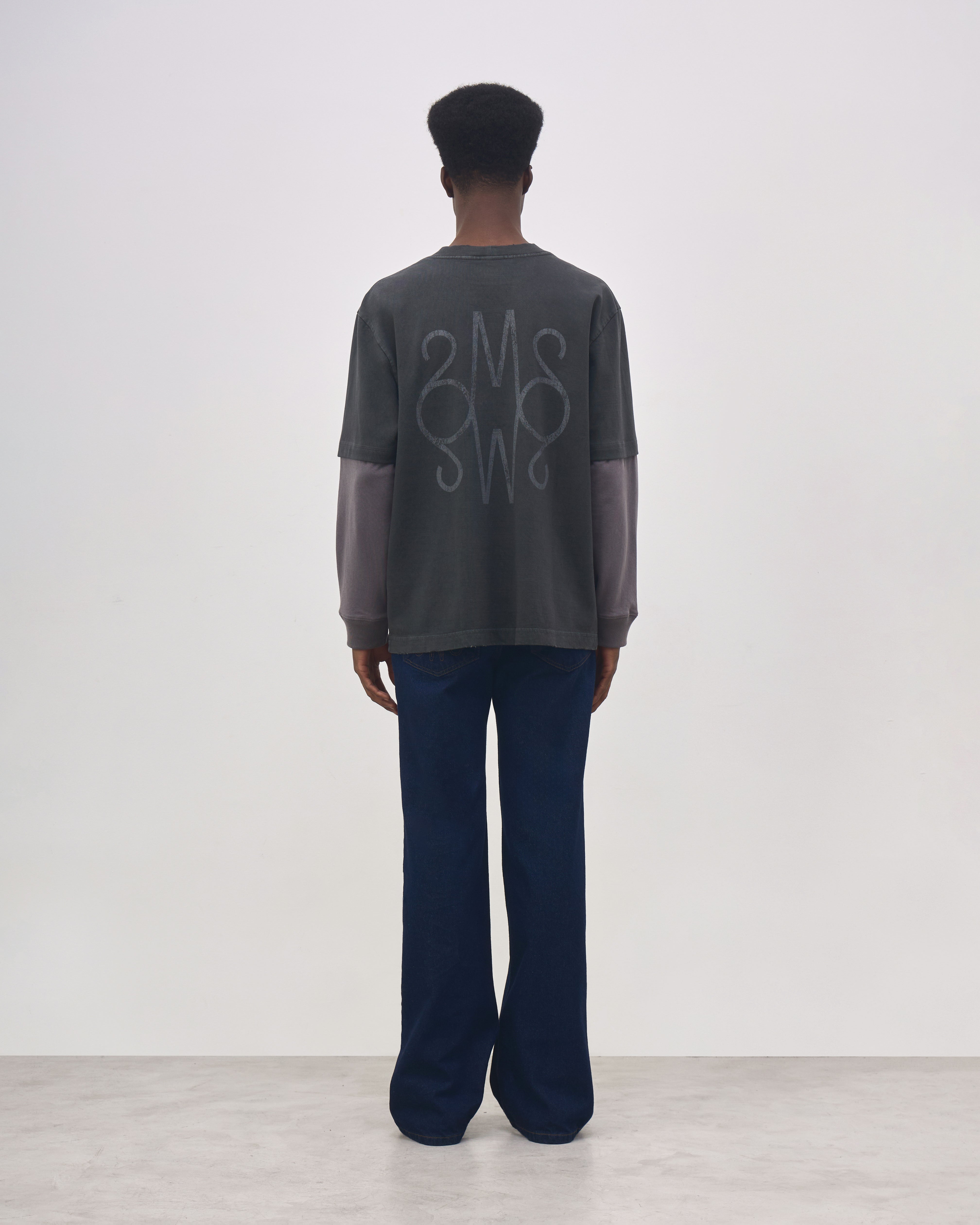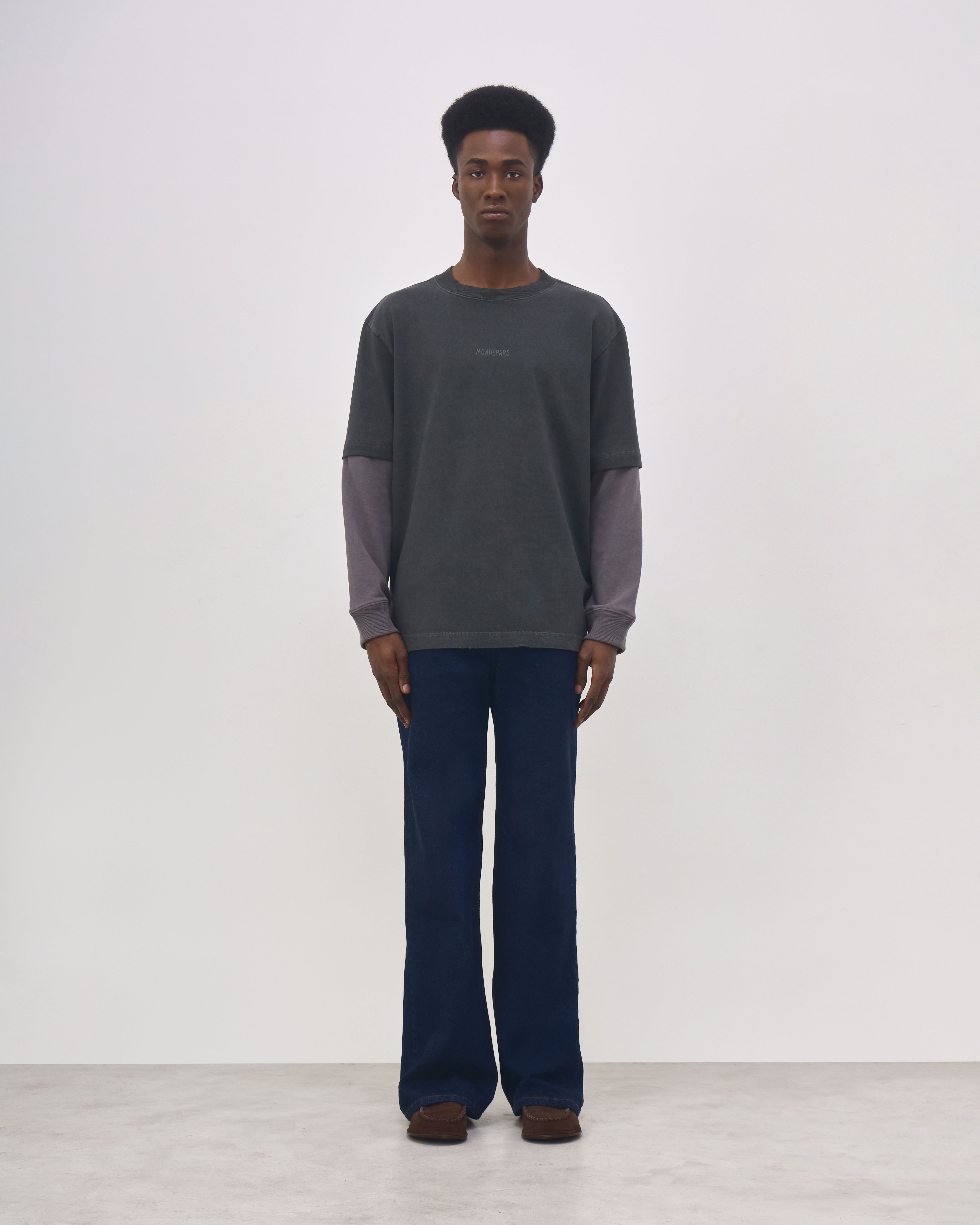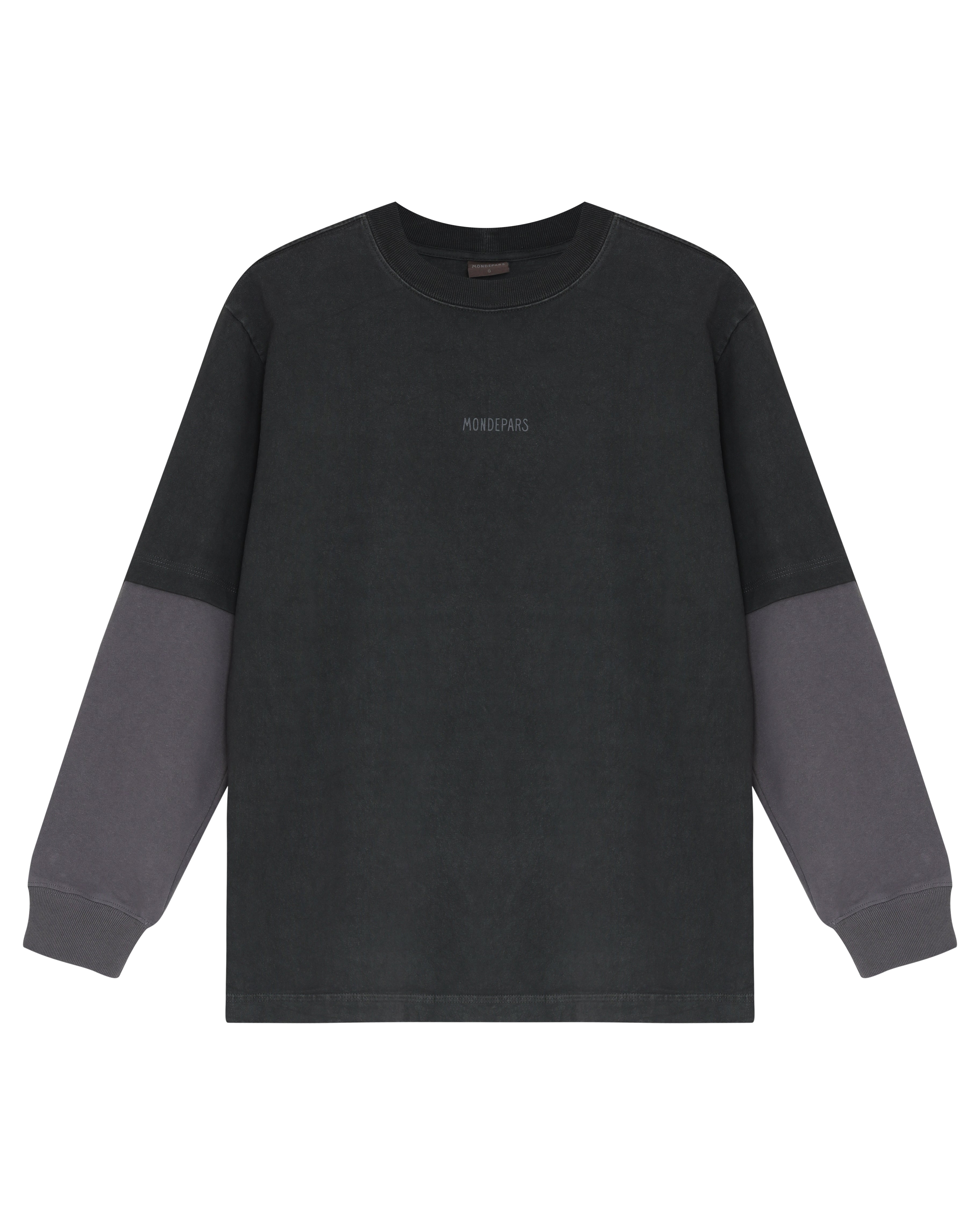 A Camiseta Ari é confeccionada em malha com lavanderia vintage, possui gola redonda em ribana, estampa de silk desgastado com assinatura Mondepars em baixo contraste na frente e logo entrelaçado nas costas, mangas longas com recorte bicolor, detalhes de puídos, barra reta e acabamento pespontado.