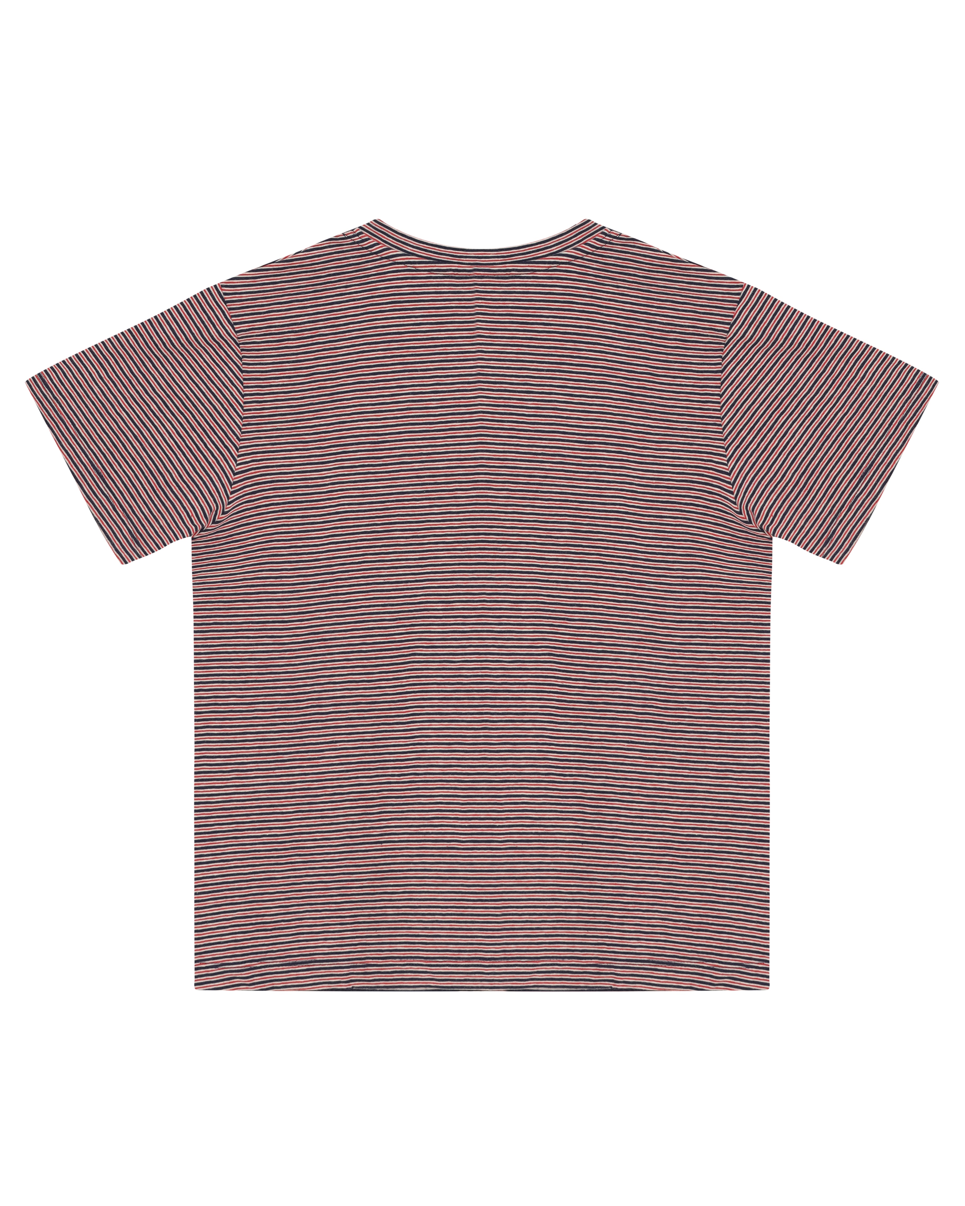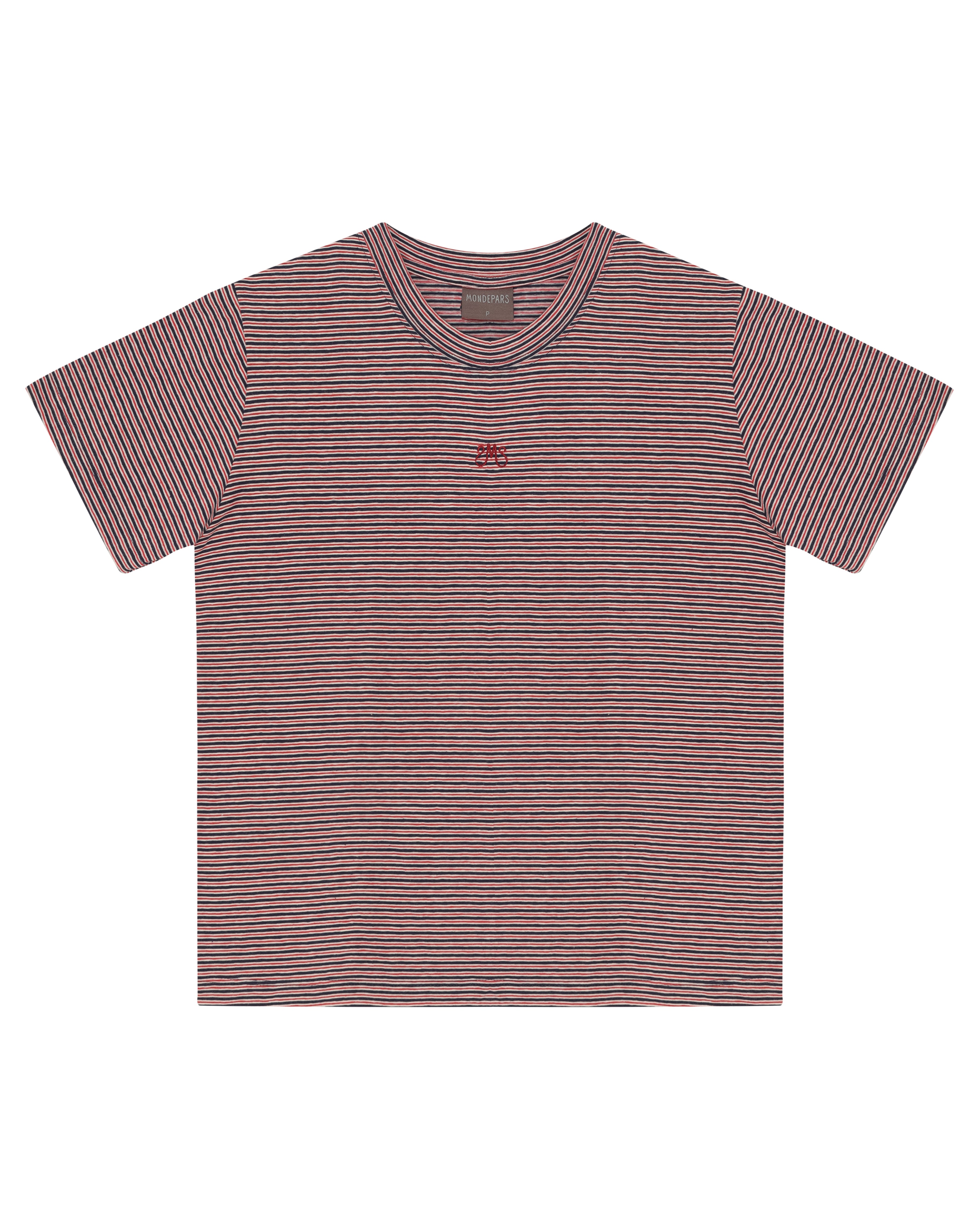 A Camiseta Nina é confeccionada em malha importada do Japão, possui padronagem listrada, gola redonda, bordado do logo frontal, mangas curtas e acabamento pespontado.