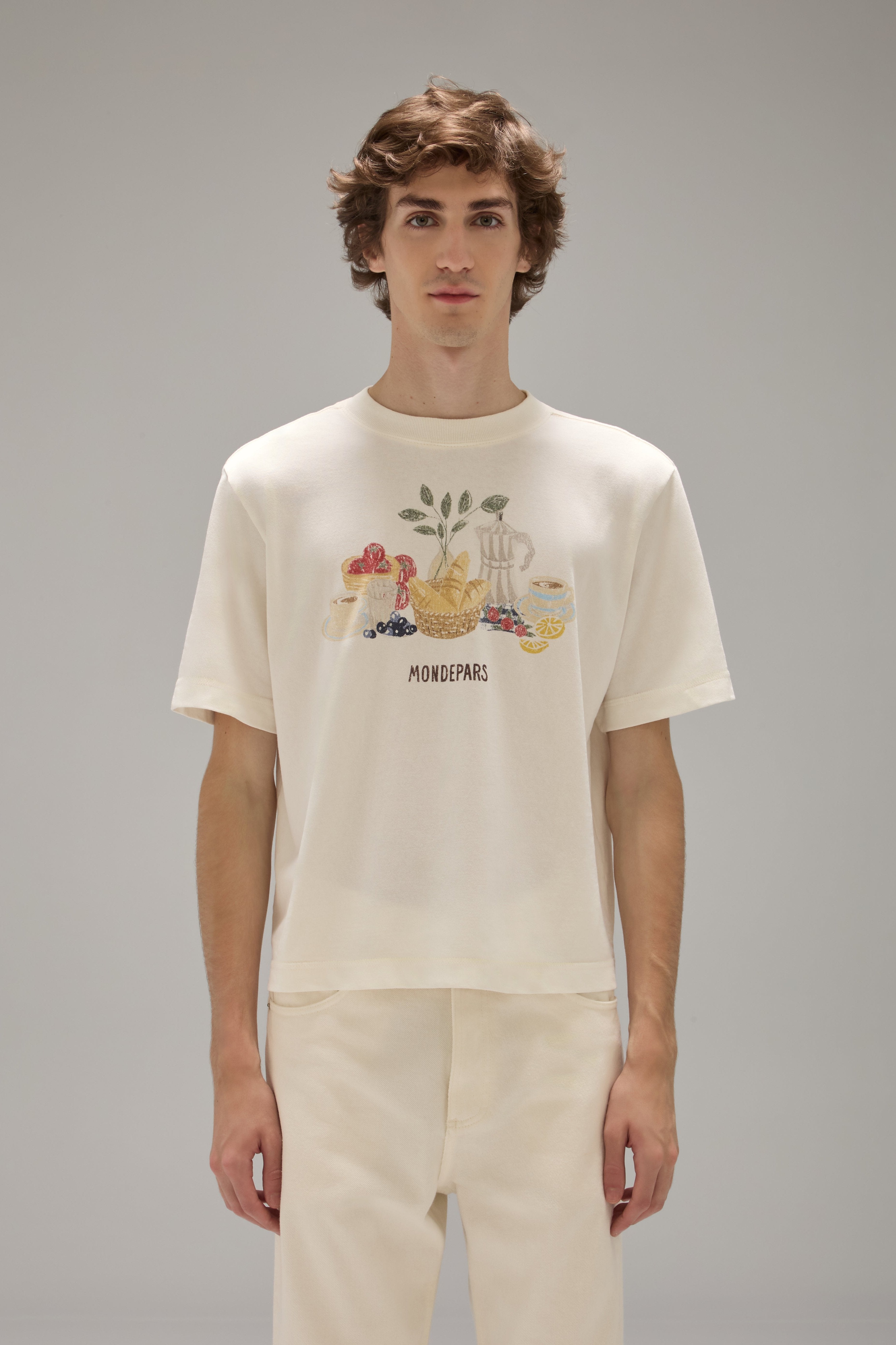 A Camiseta Picnic é confeccionada em malha pesada, possui gola redonda em ribana, estampa frontal localizada desenvolvida exclusivamente para a Mondepars em serigrafia com toque suave, mangas curtas, comprimento levemente curto e acabamento pespontado.