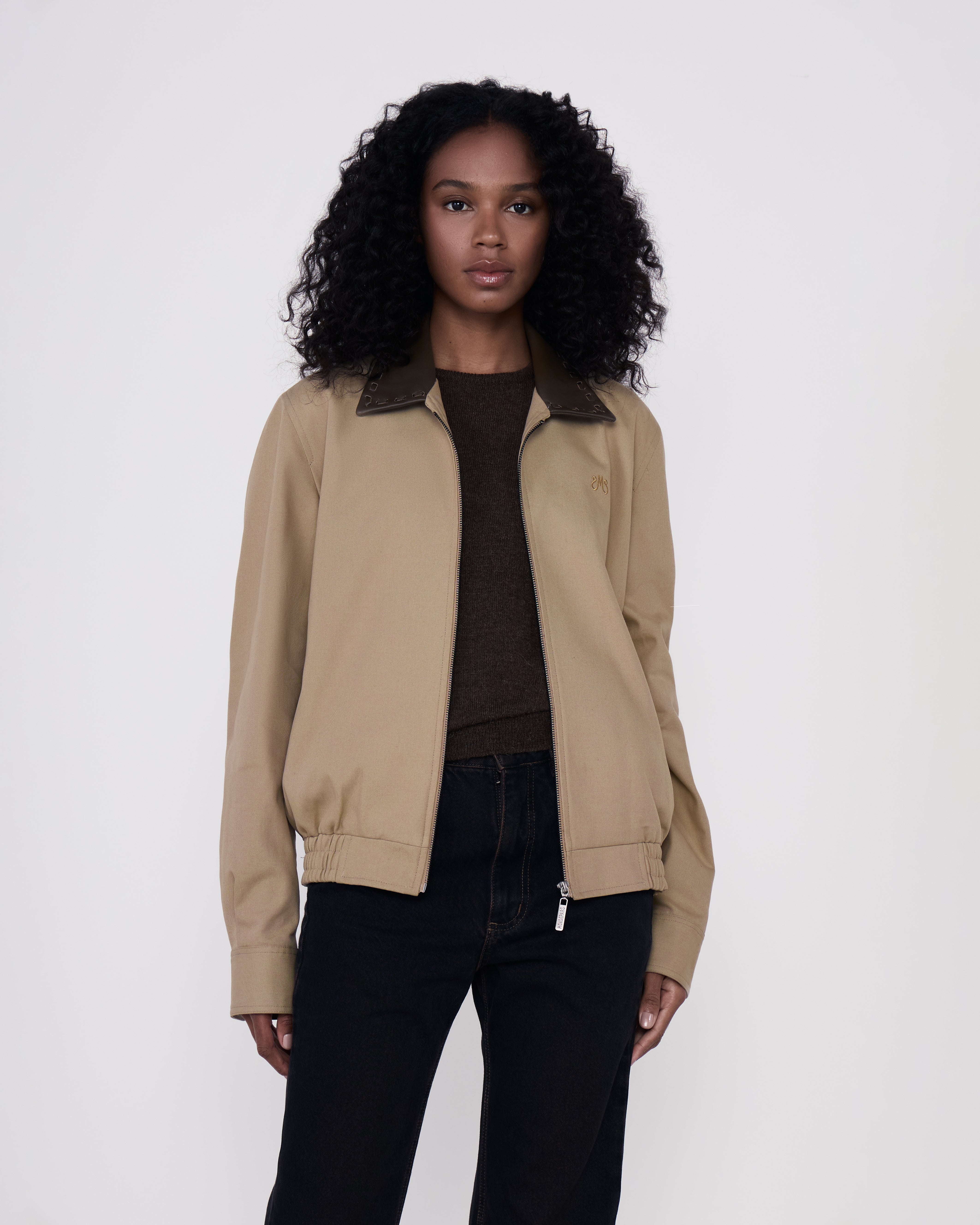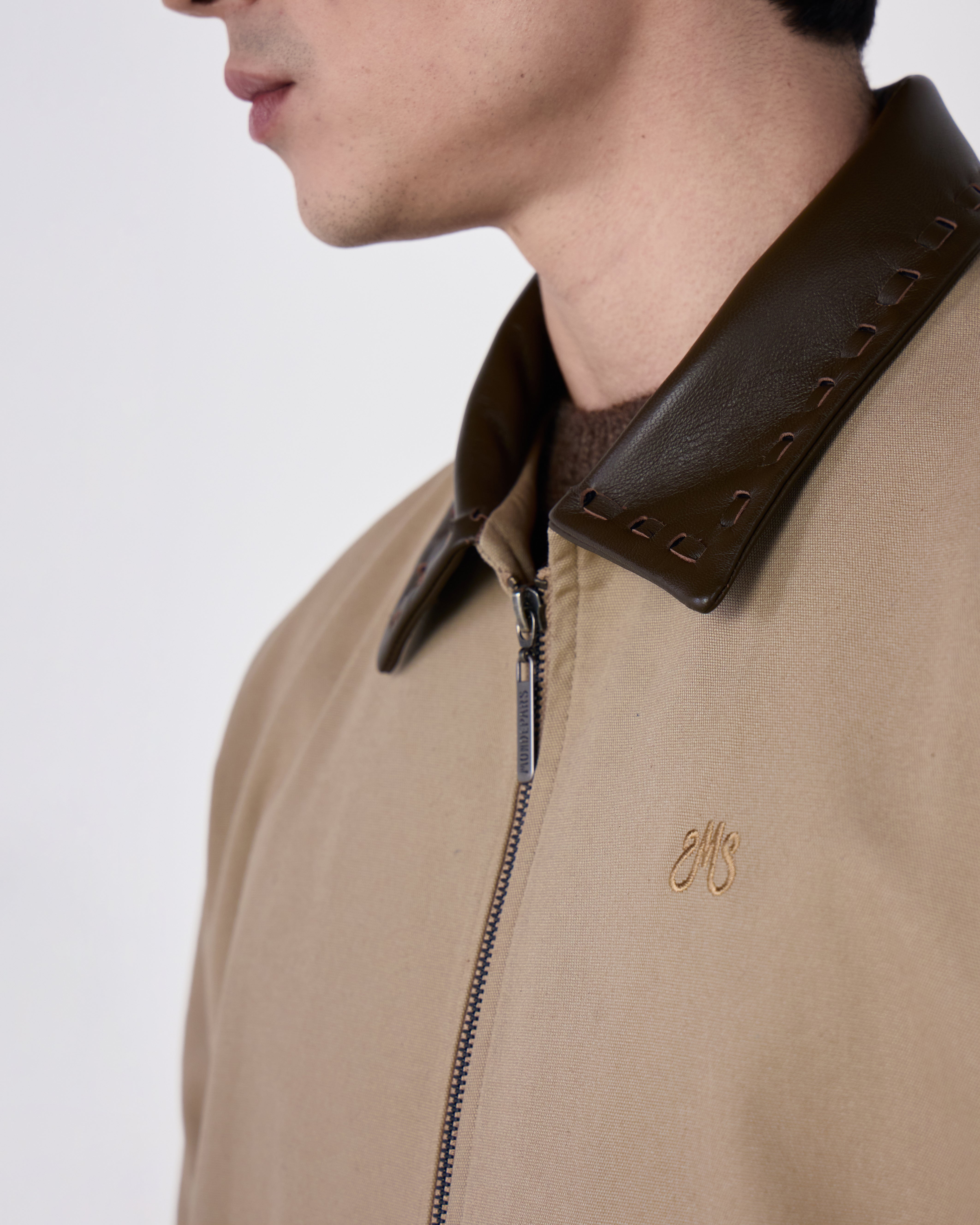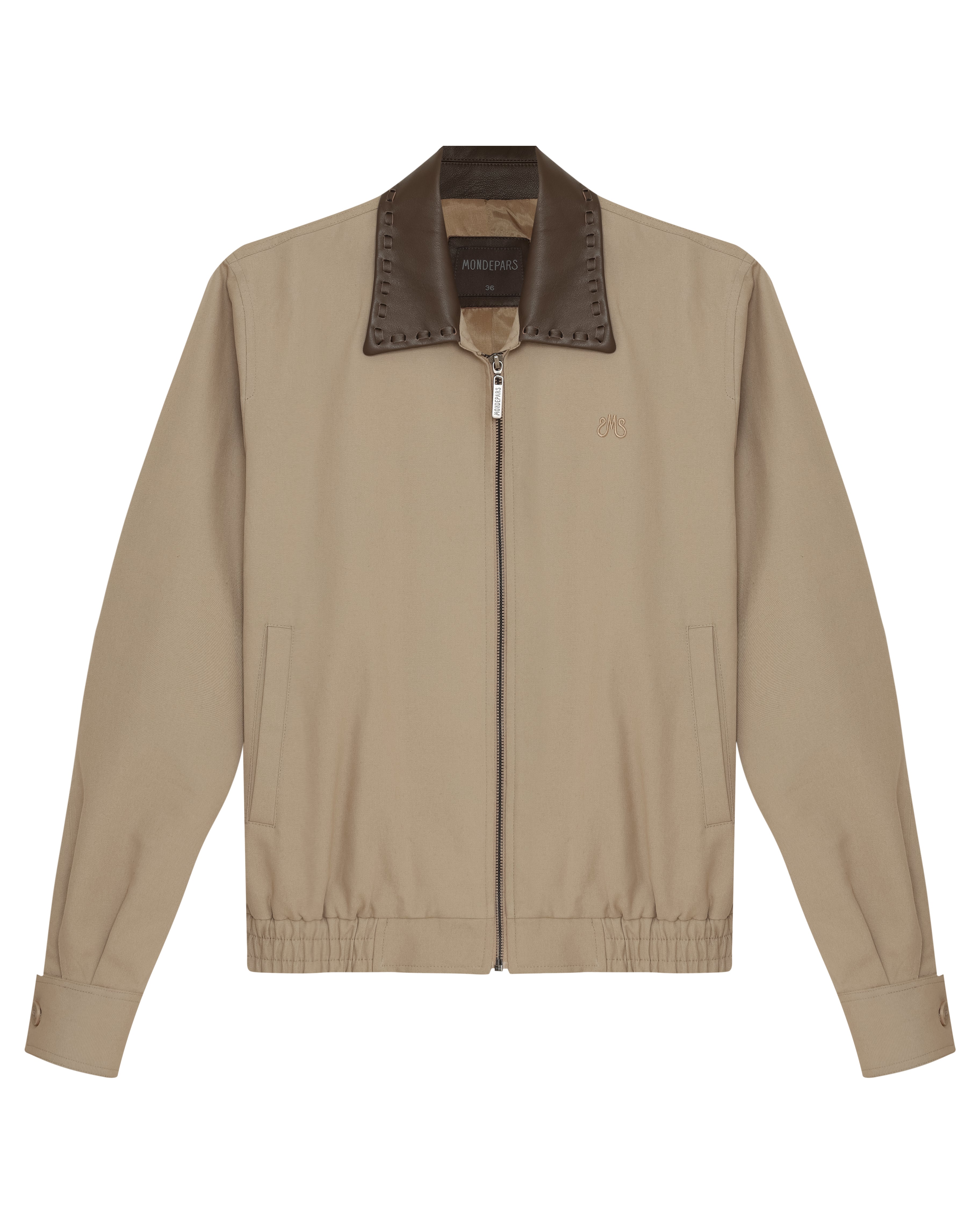 A Jaqueta Daniel é confeccionada em algodão, possui colarinho em couro, mangas longas com abotoamento nos punhos, fechamento frontal por zíper, dois bolsos, barra com elástico e acabamento pespontado.