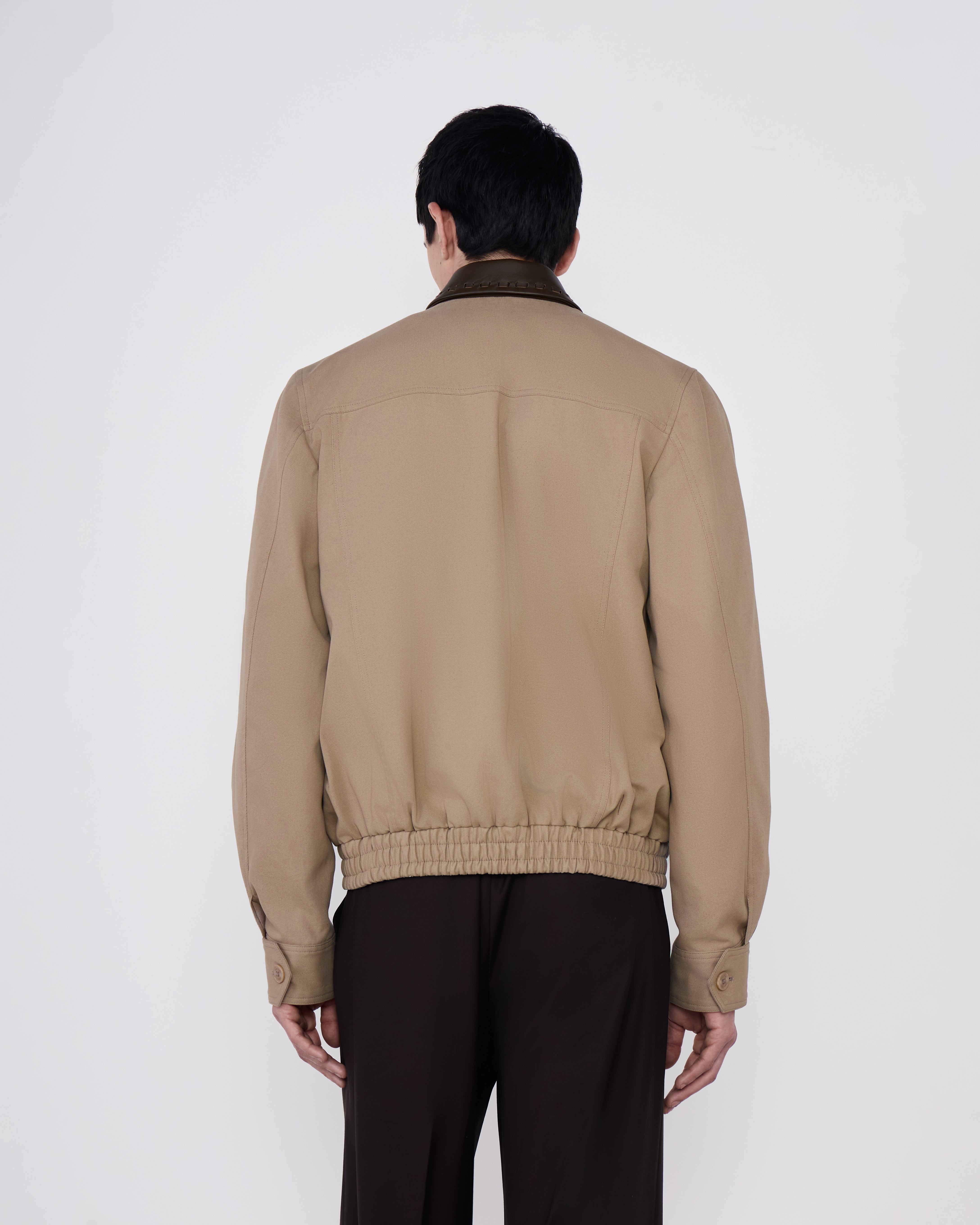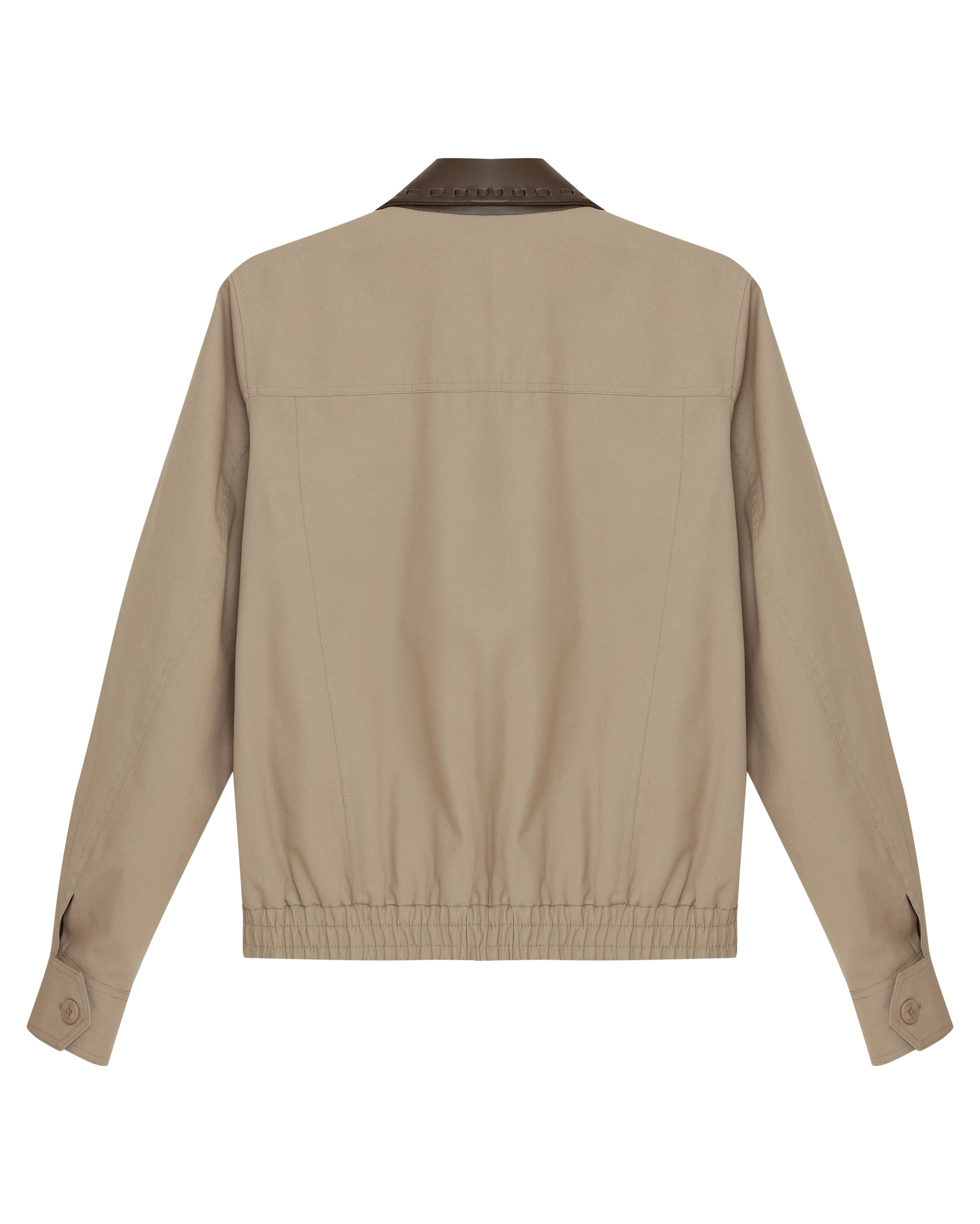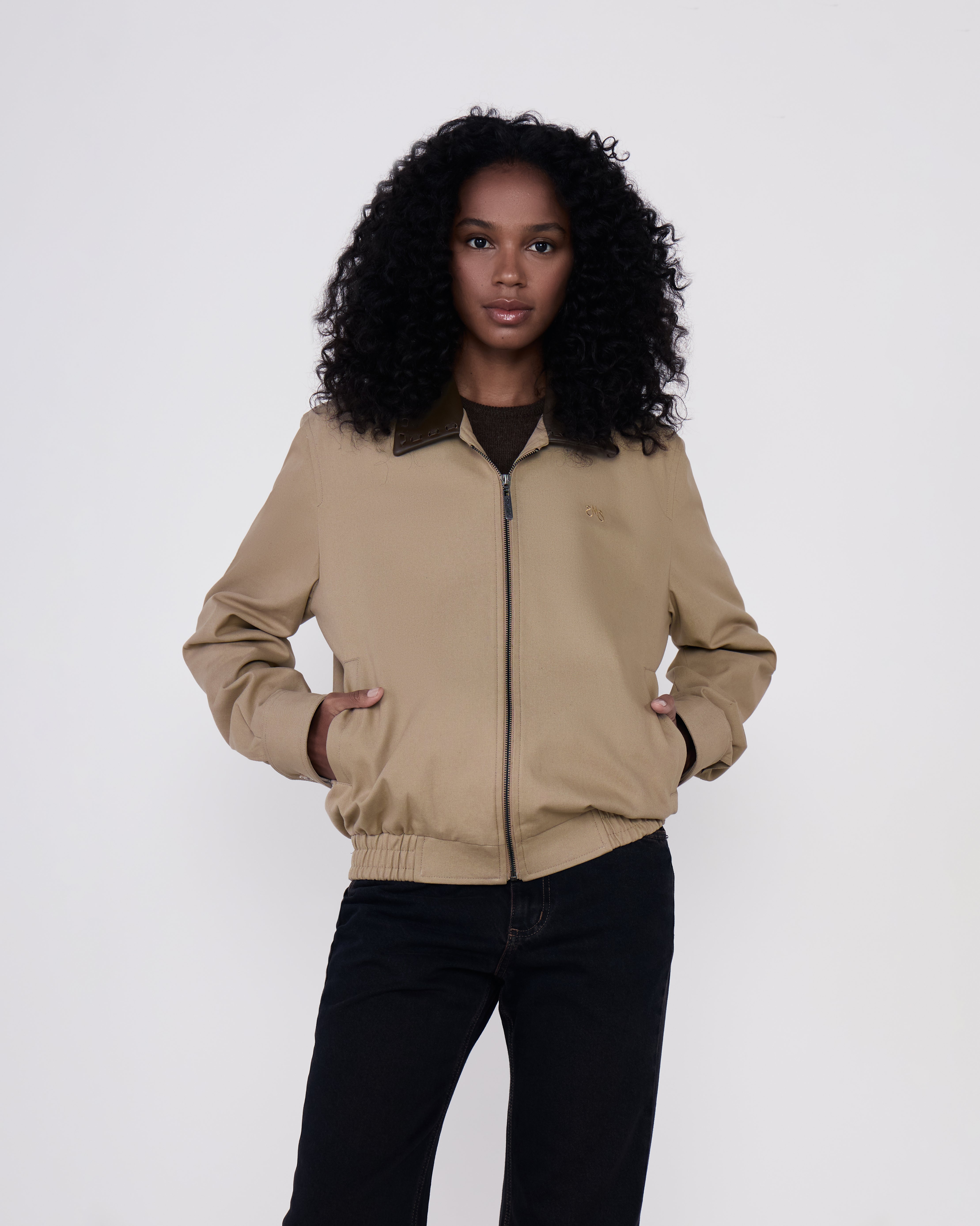 A Jaqueta Daniel é confeccionada em algodão, possui colarinho em couro, mangas longas com abotoamento nos punhos, fechamento frontal por zíper, dois bolsos, barra com elástico e acabamento pespontado.