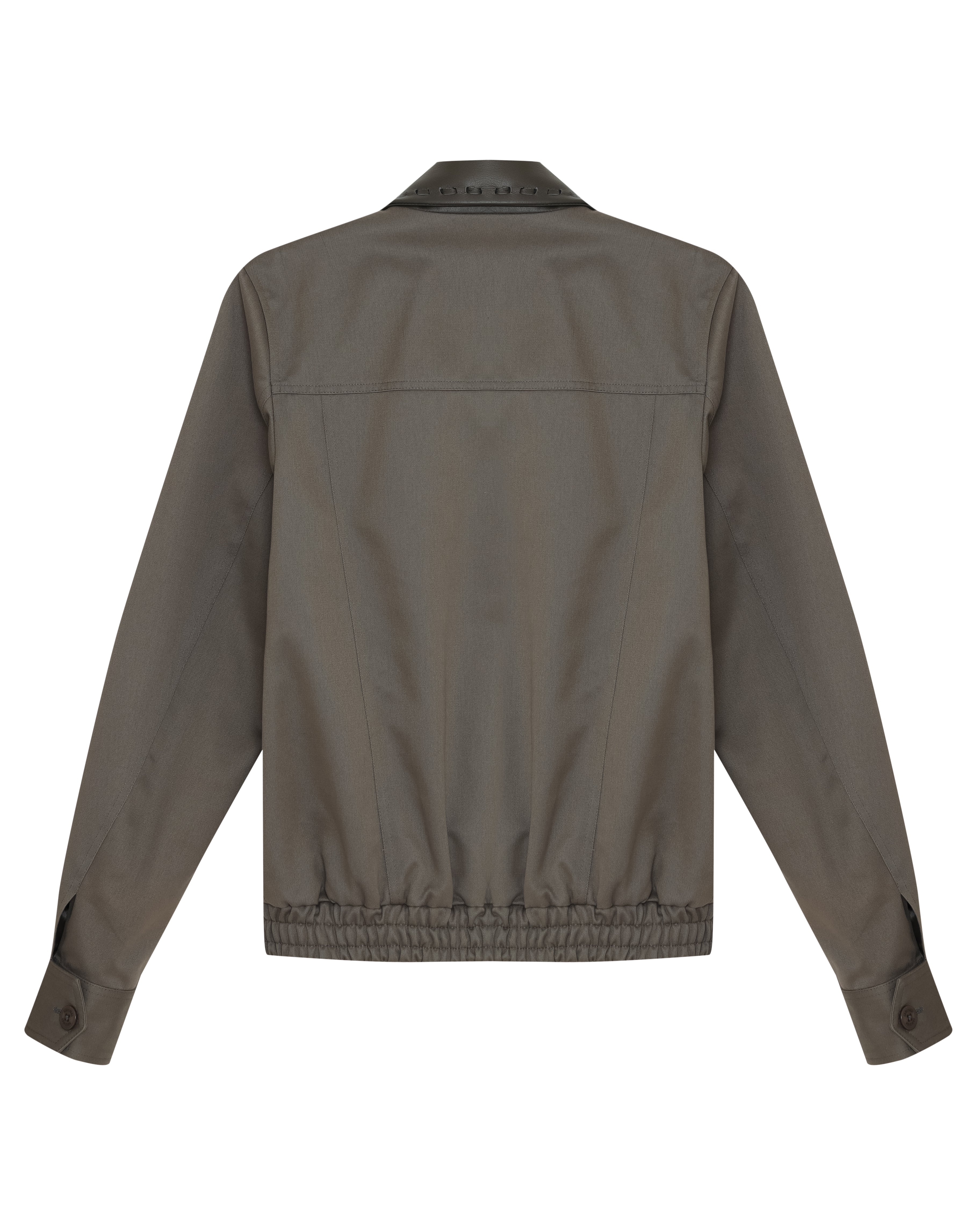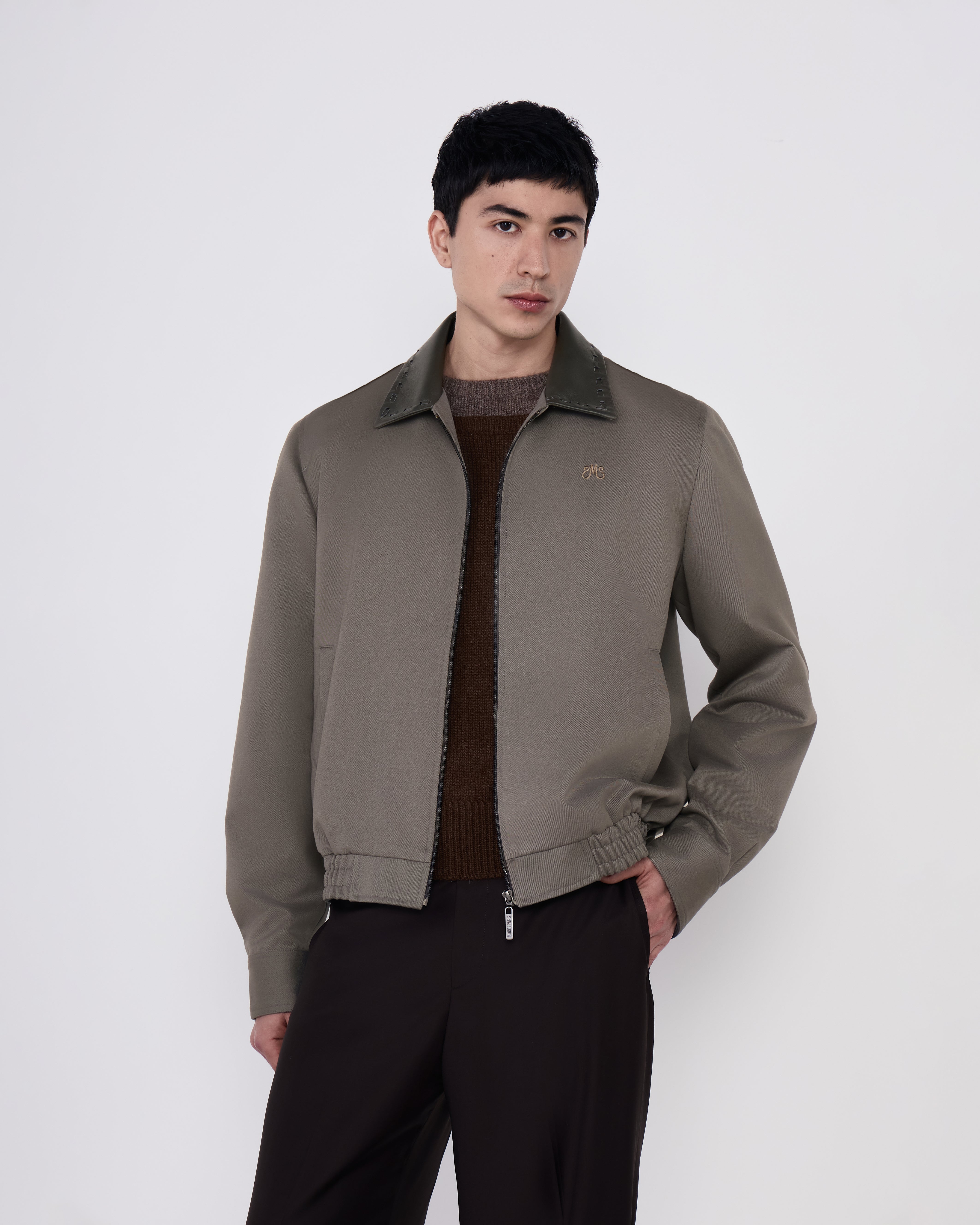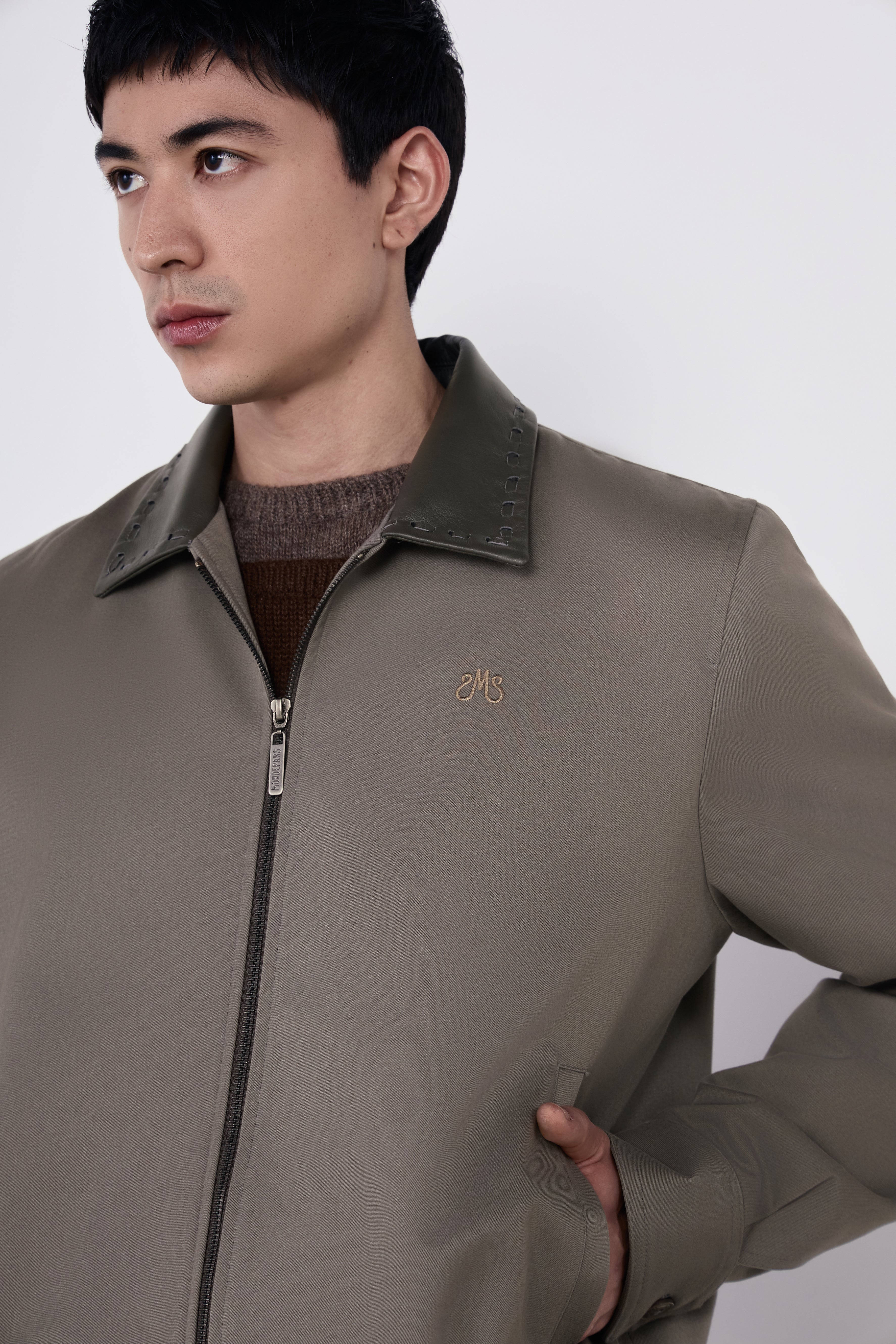 A Jaqueta Daniel é confeccionada em algodão, possui colarinho em couro, mangas longas com abotoamento nos punhos, fechamento frontal por zíper, dois bolsos, barra com elástico e acabamento pespontado.
