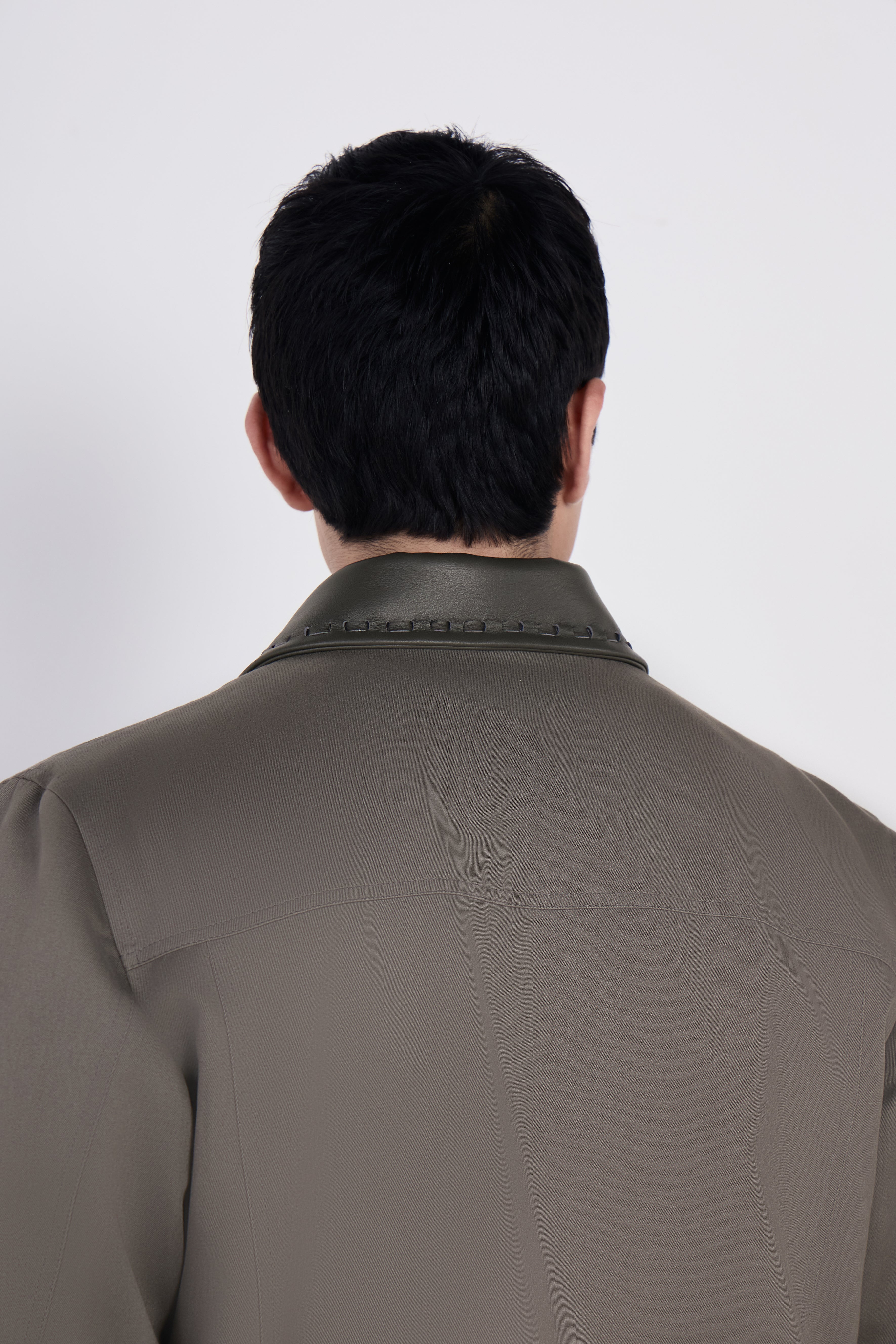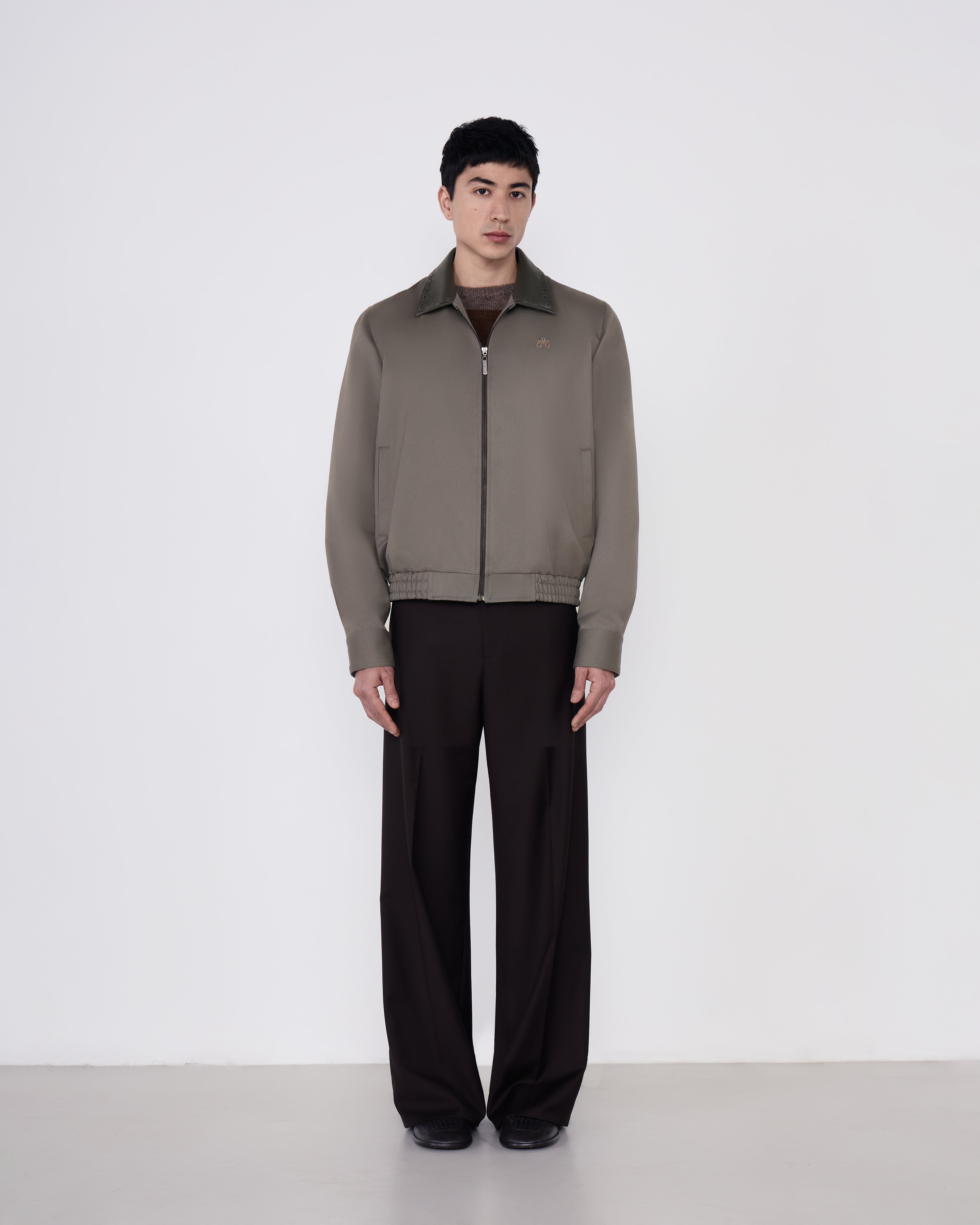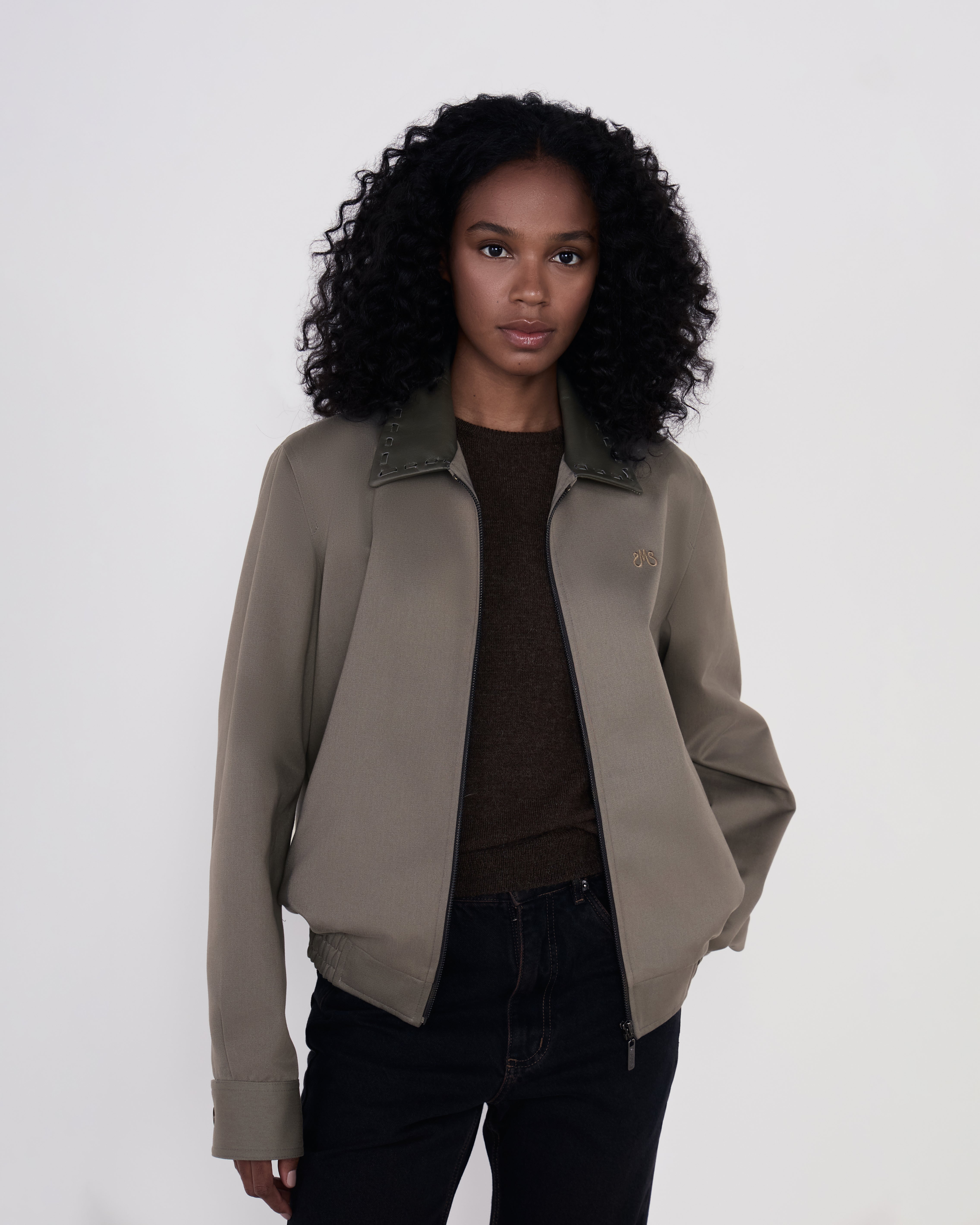 A Jaqueta Daniel é confeccionada em algodão, possui colarinho em couro, mangas longas com abotoamento nos punhos, fechamento frontal por zíper, dois bolsos, barra com elástico e acabamento pespontado.