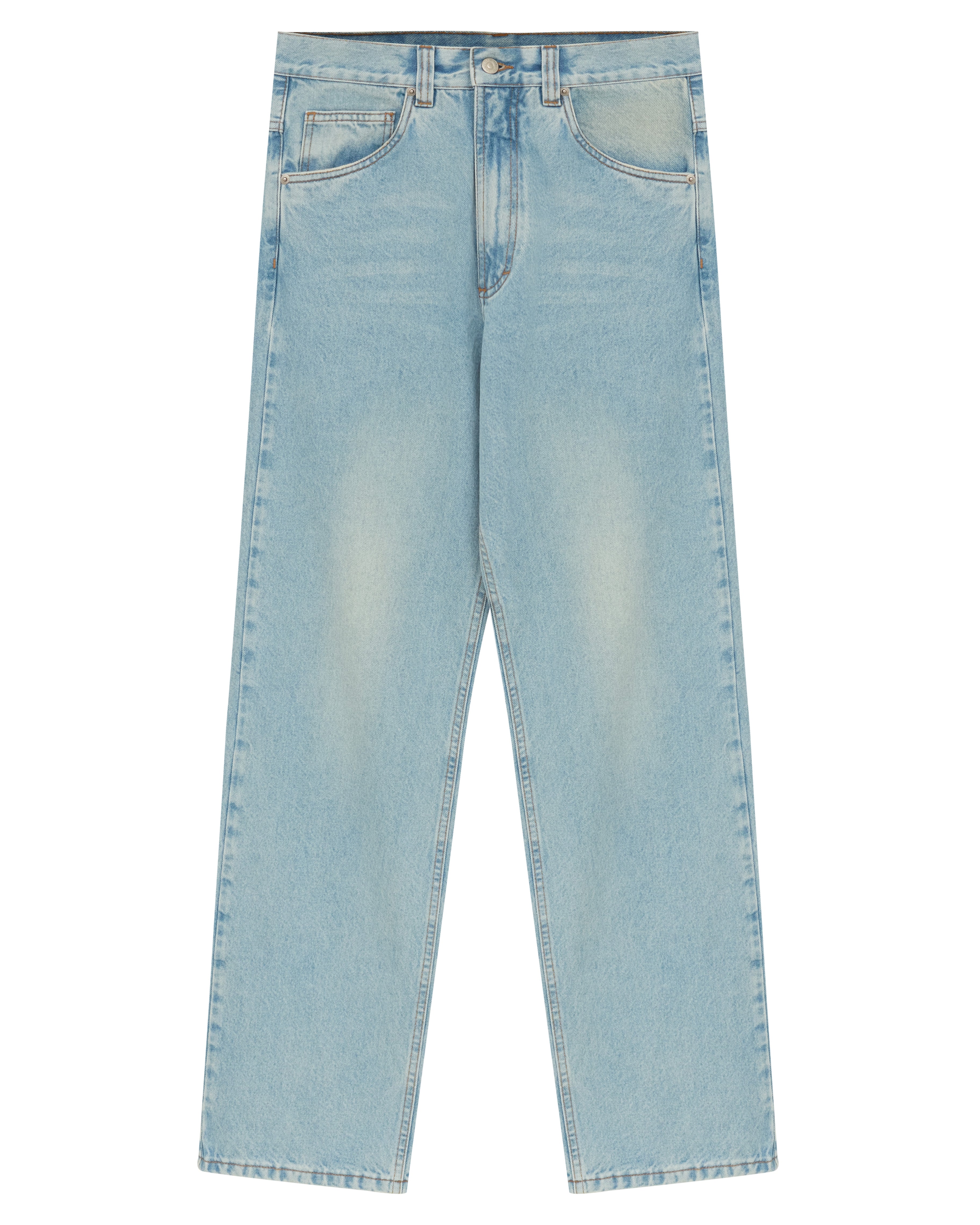 A Calça Jeans Reto é confeccionada em algodão com lavanderia clara e levemente marcada, possui modelagem reta, caimento boyfriend, cós com passantes, fechamento frontal por botão e zíper, cinco bolsos, detalhe logo em relevo nos bolsos traseiros, etiqueta de couro natural produzida com matéria-prima de descarte e acabamento pespontado.