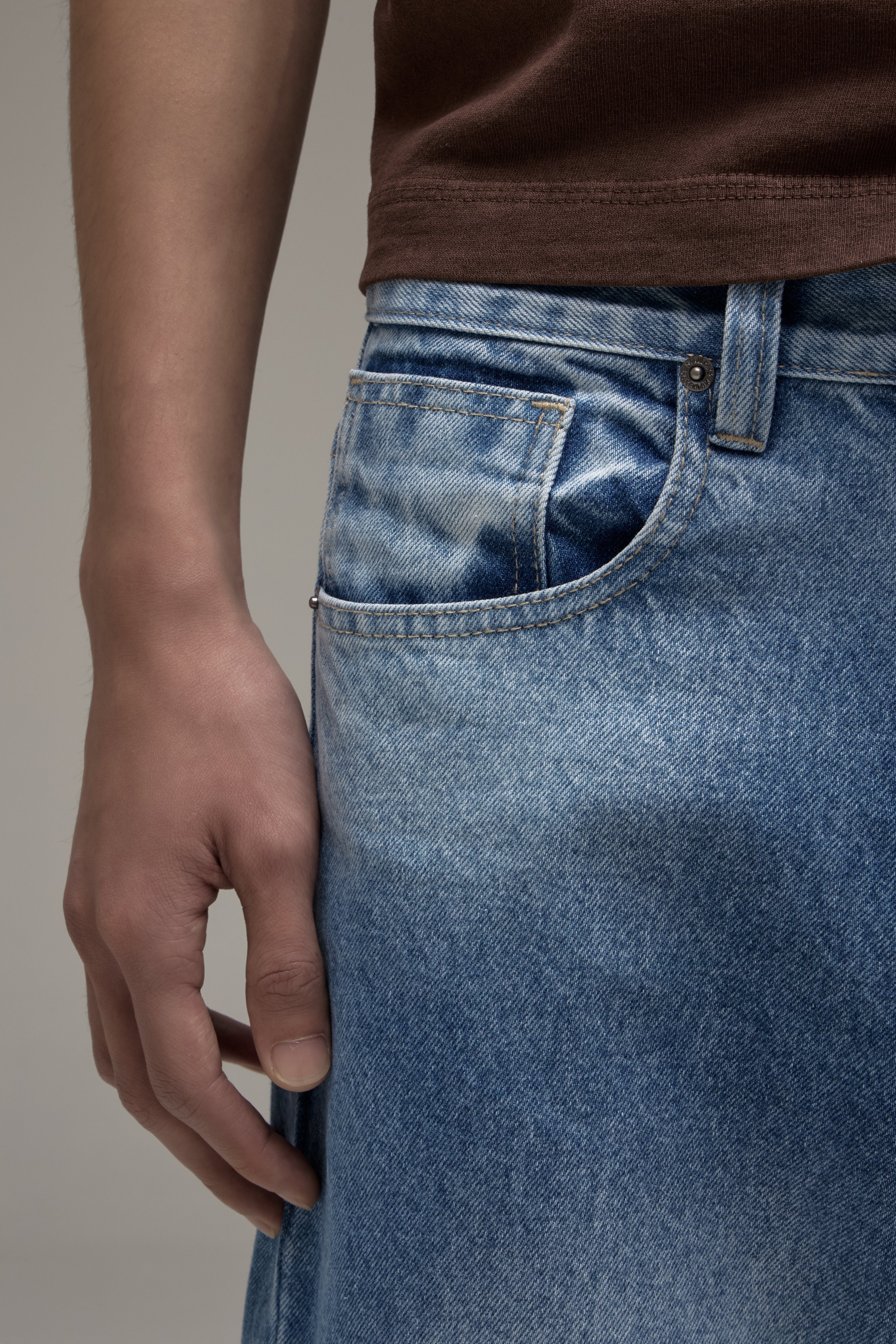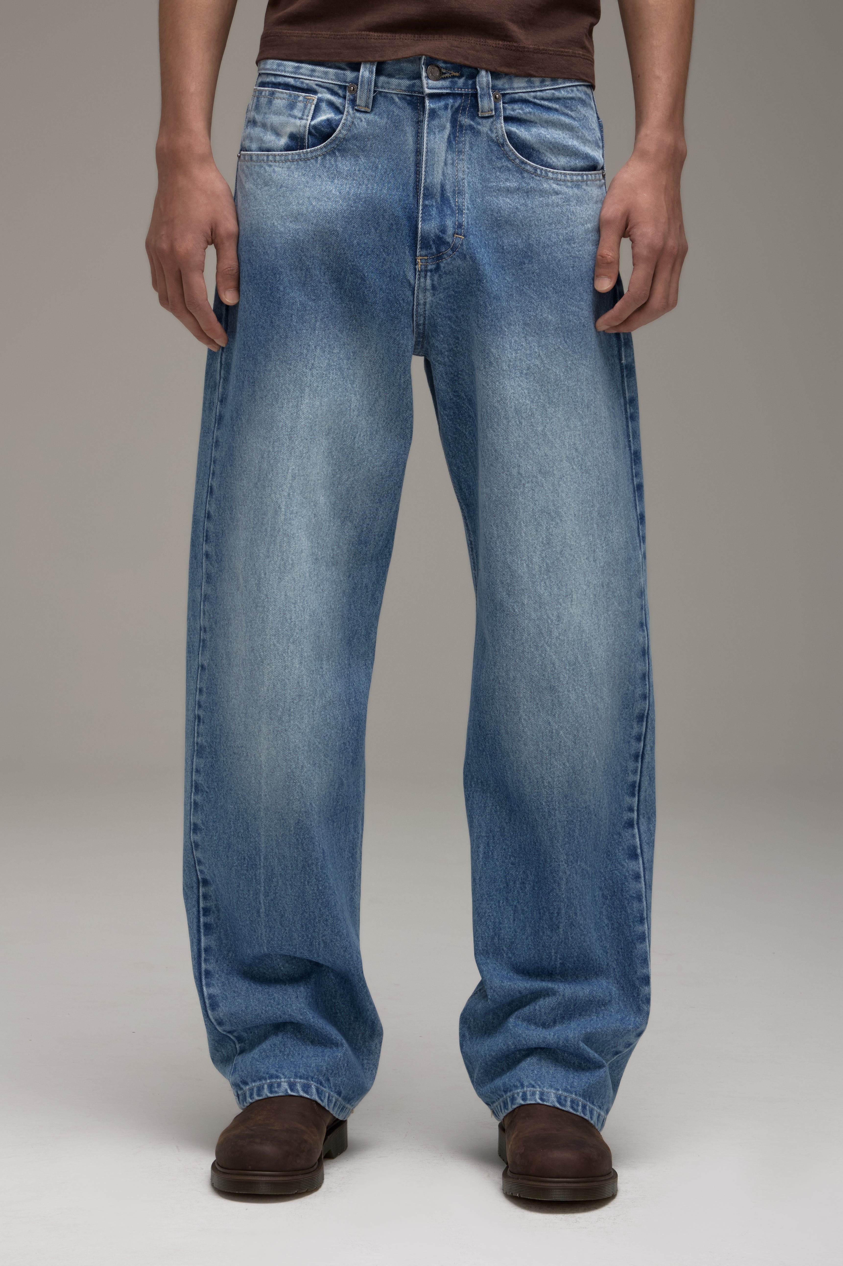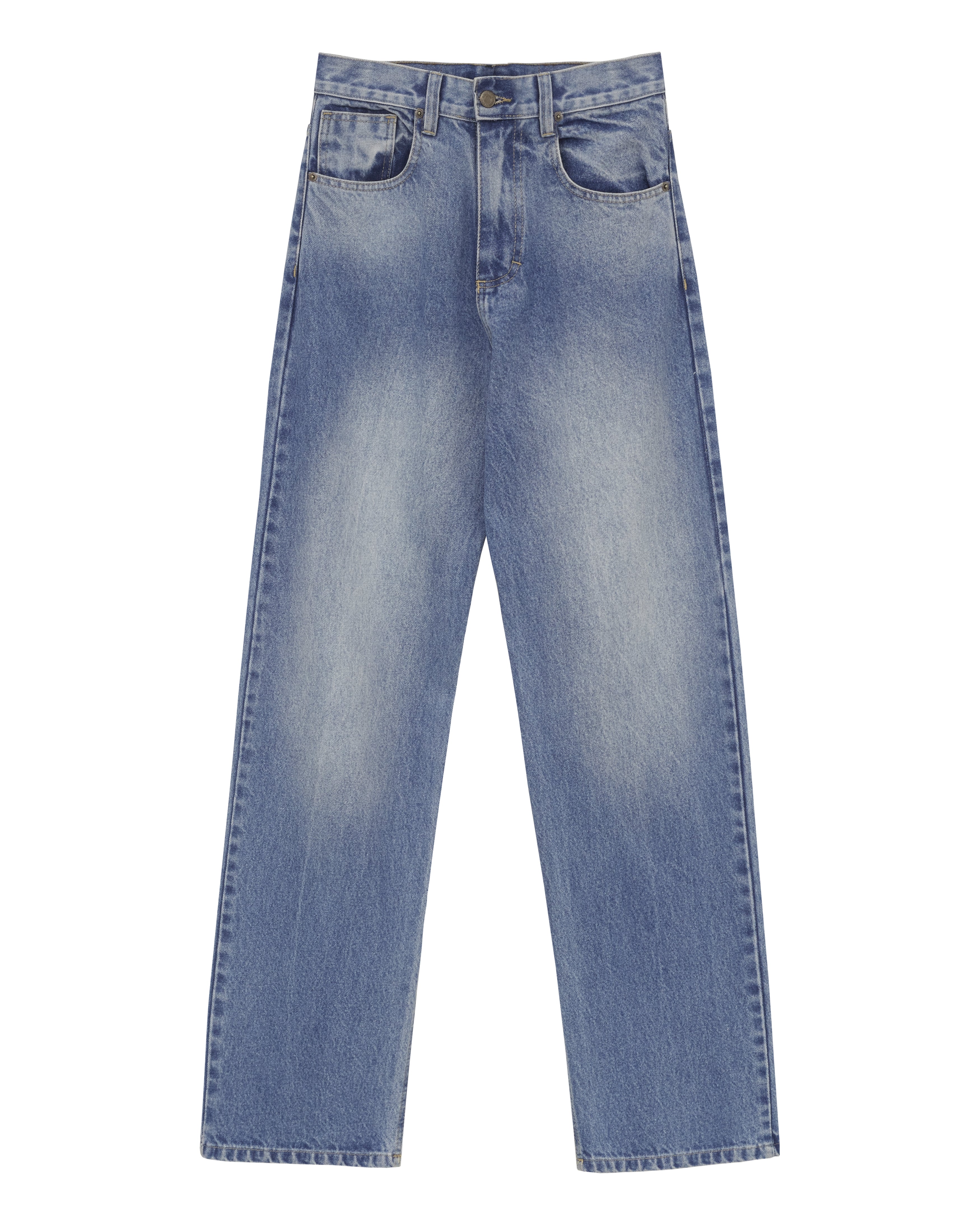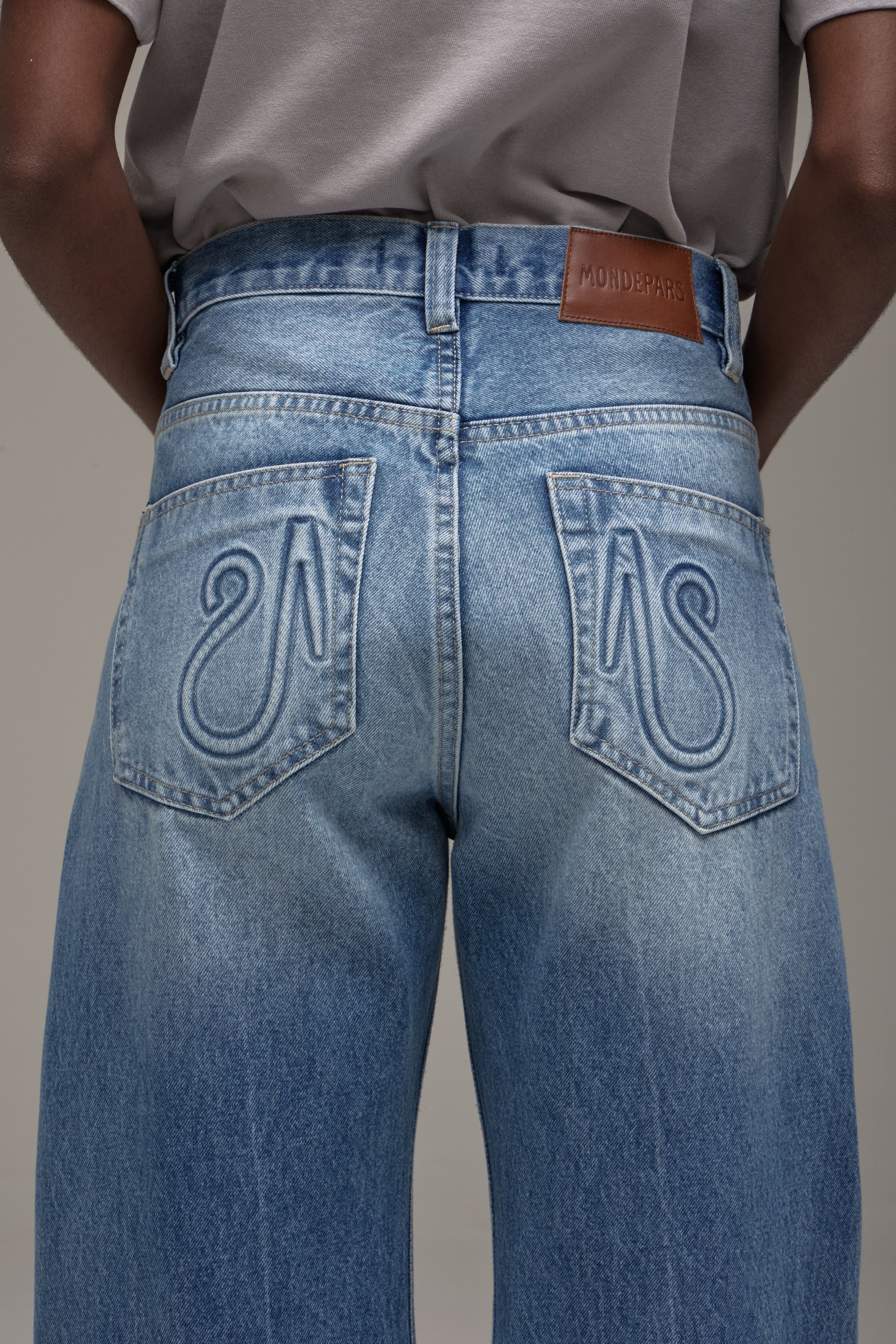 A Calça Jeans Reto é confeccionada em algodão com lavanderia levemente marcada, possui modelagem reta, caimento boyfriend, cós com passantes, fechamento frontal por botão e zíper, cinco bolsos, detalhe logo em relevo nos bolsos traseiros, etiqueta de couro natural produzida com matéria-prima de descarte e acabamento pespontado.