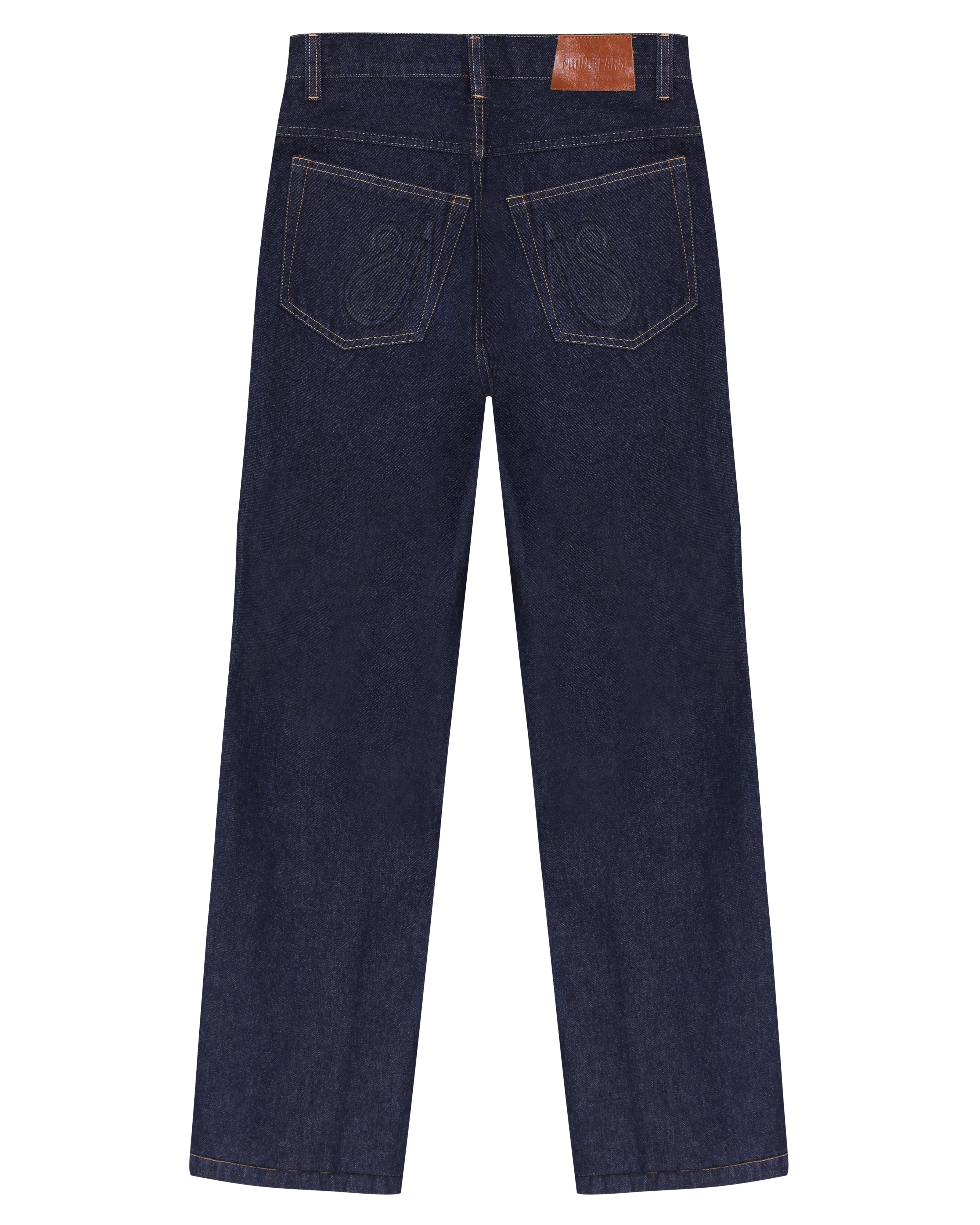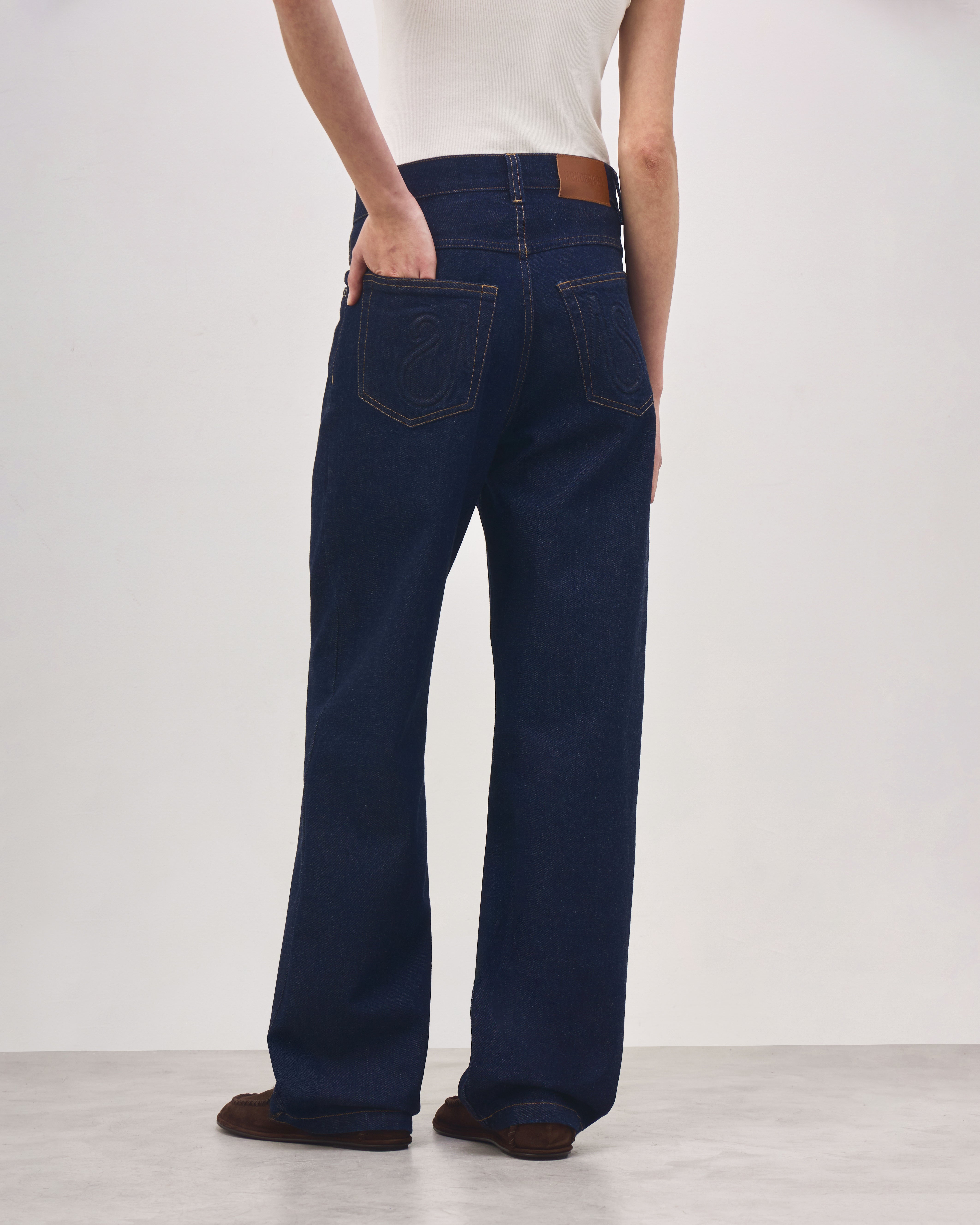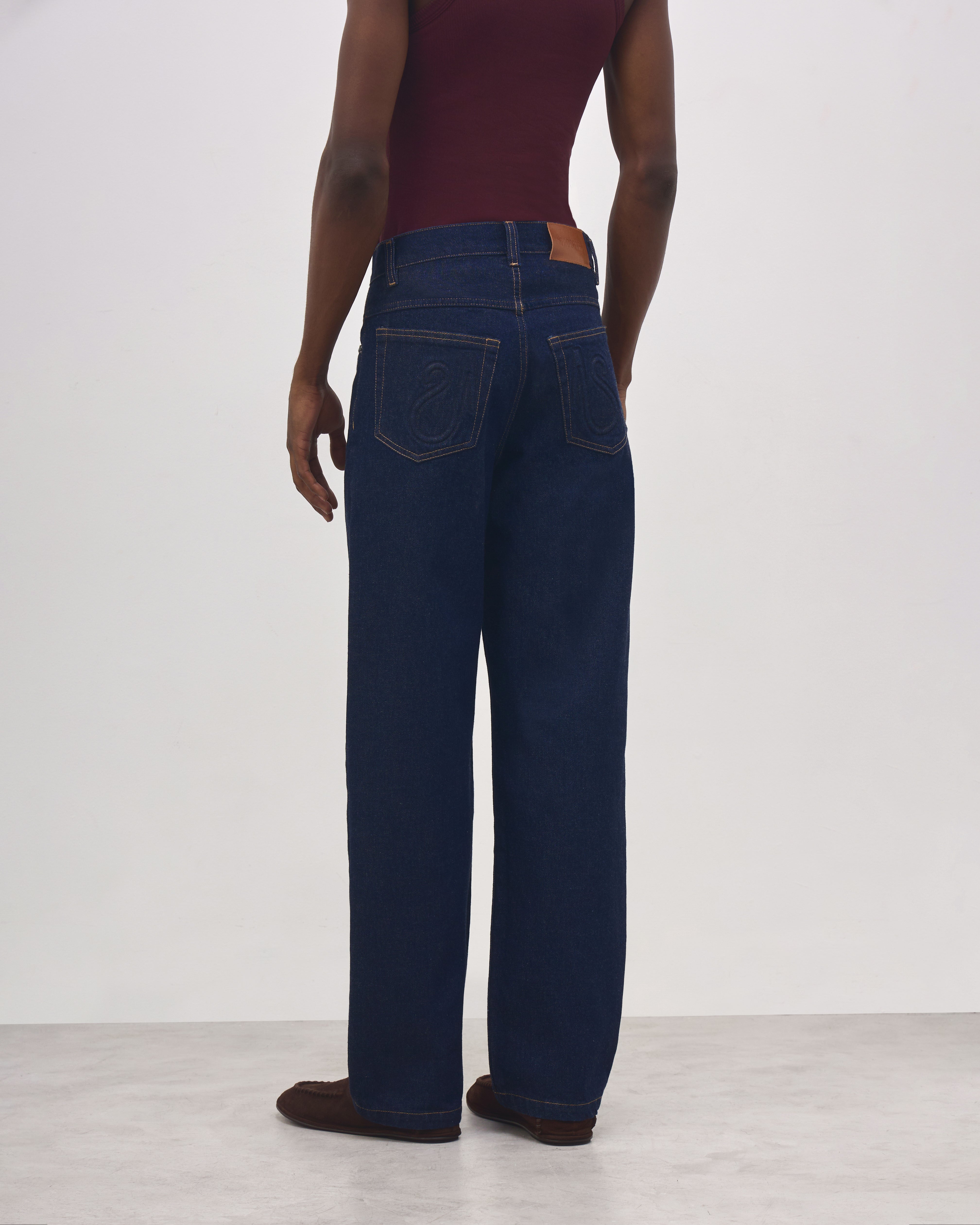 A Calça Jeans Reto é confeccionada em algodão com lavanderia índigo, possui modelagem reta, caimento boyfriend, cós com passantes, fechamento frontal por botão e zíper, cinco bolsos, detalhe logo em relevo nos bolsos traseiros, etiqueta de couro natural produzida com matéria-prima de descarte e acabamento pespontado.