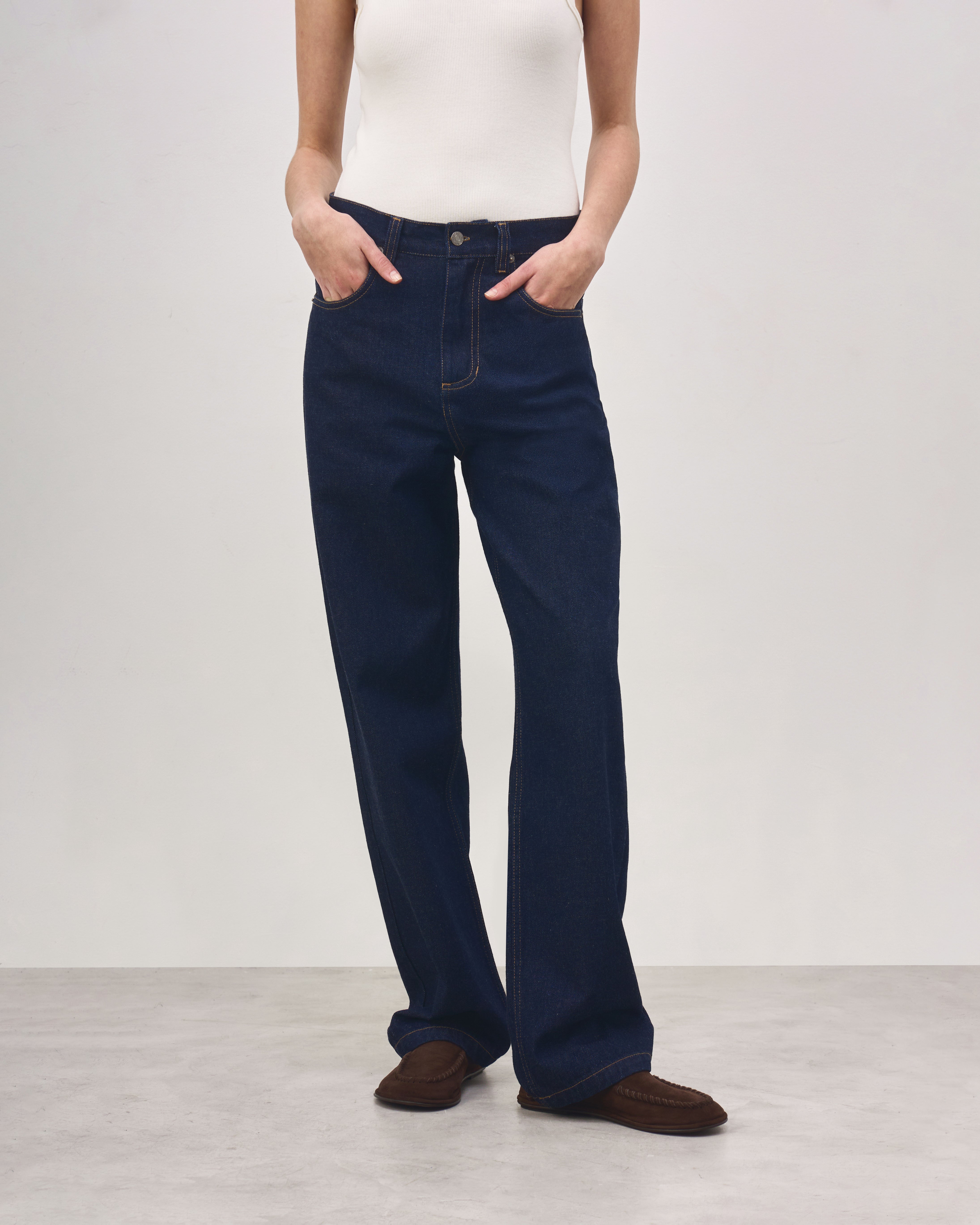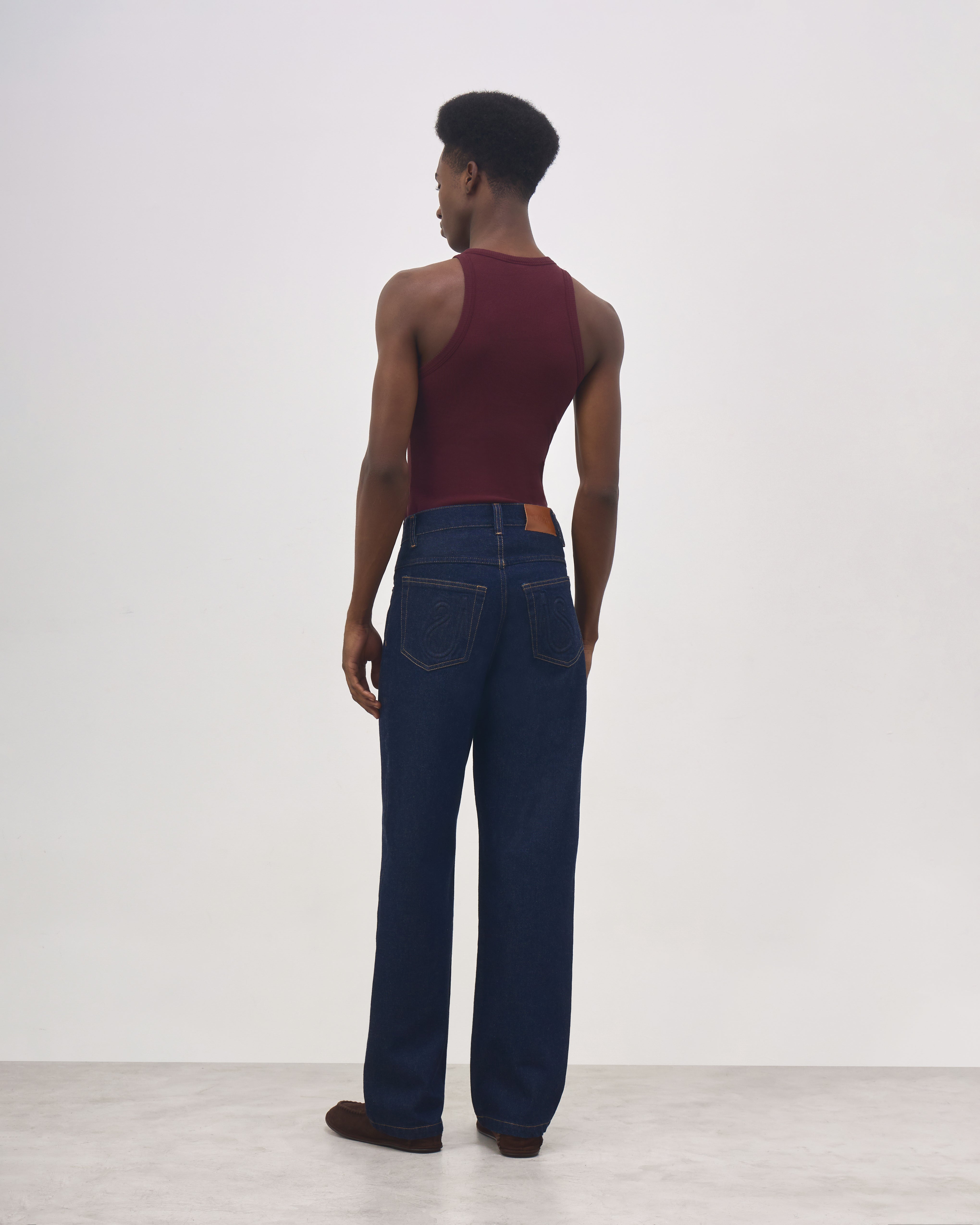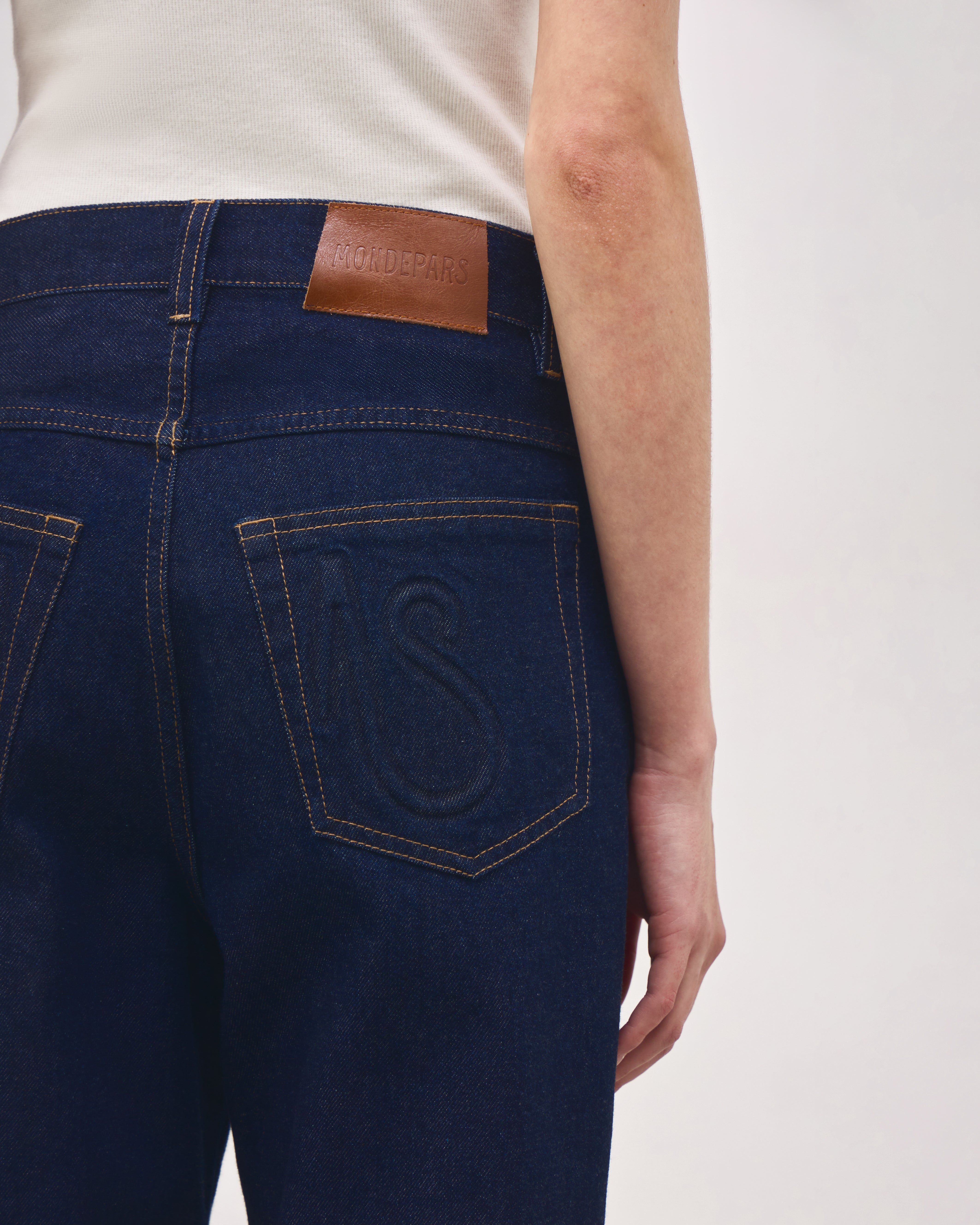 A Calça Jeans Reto é confeccionada em algodão com lavanderia índigo, possui modelagem reta, caimento boyfriend, cós com passantes, fechamento frontal por botão e zíper, cinco bolsos, detalhe logo em relevo nos bolsos traseiros, etiqueta de couro natural produzida com matéria-prima de descarte e acabamento pespontado.