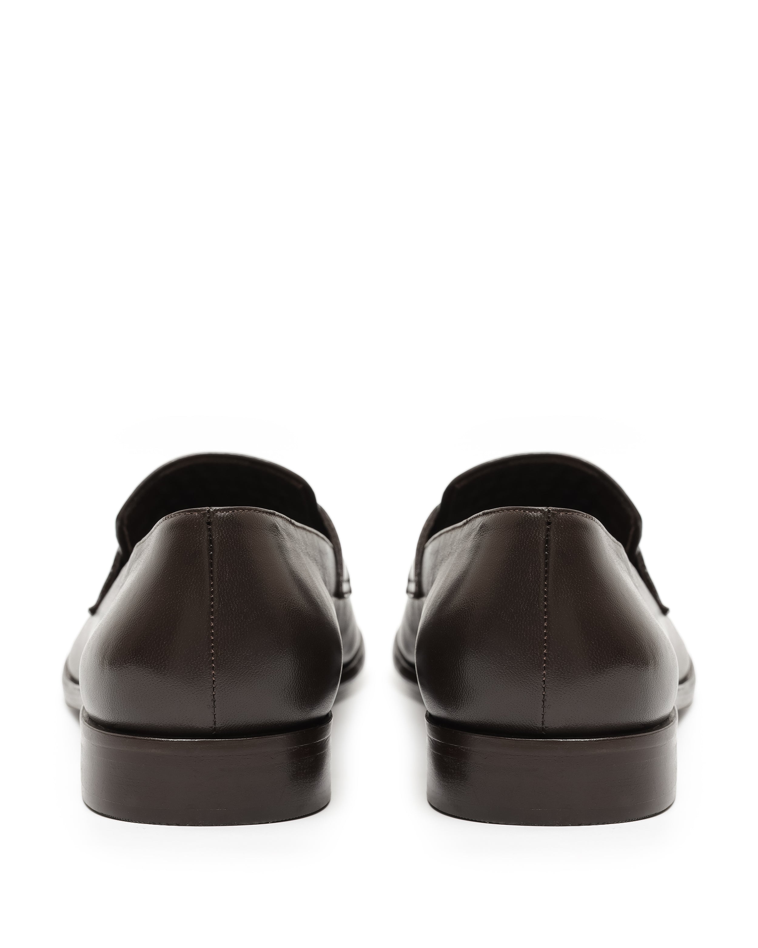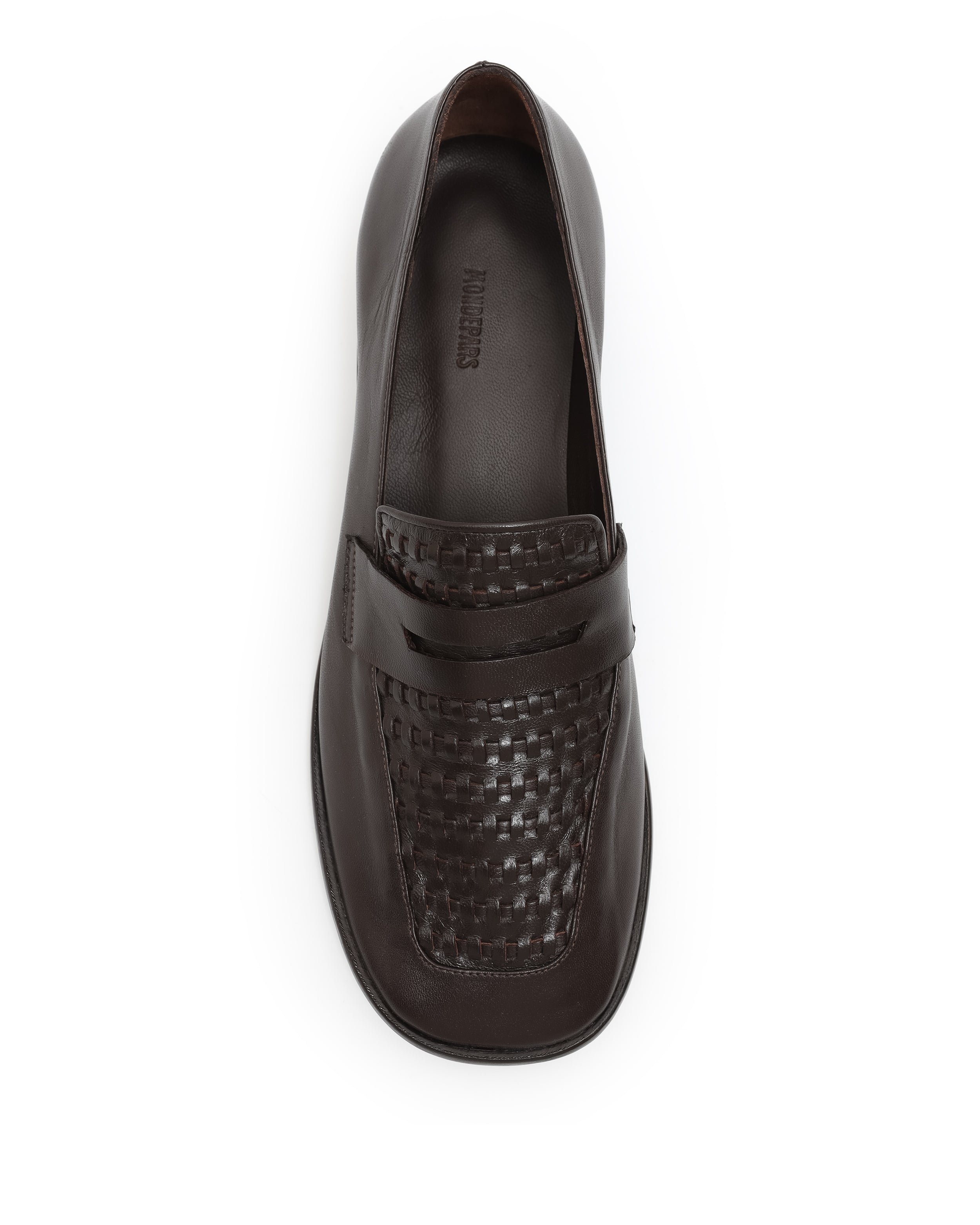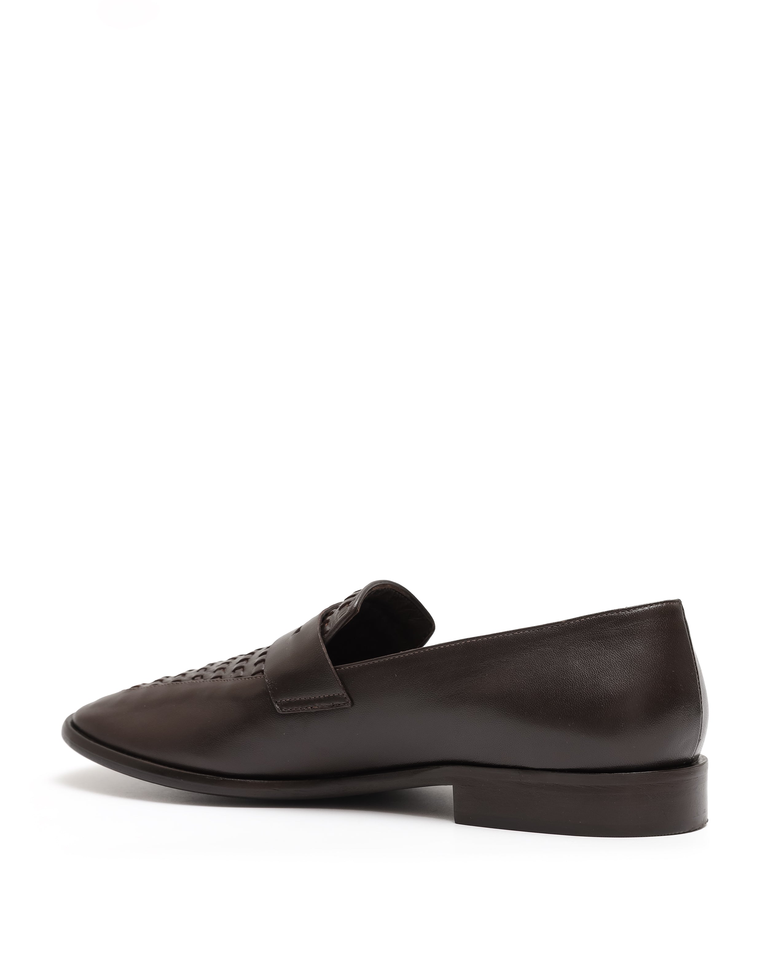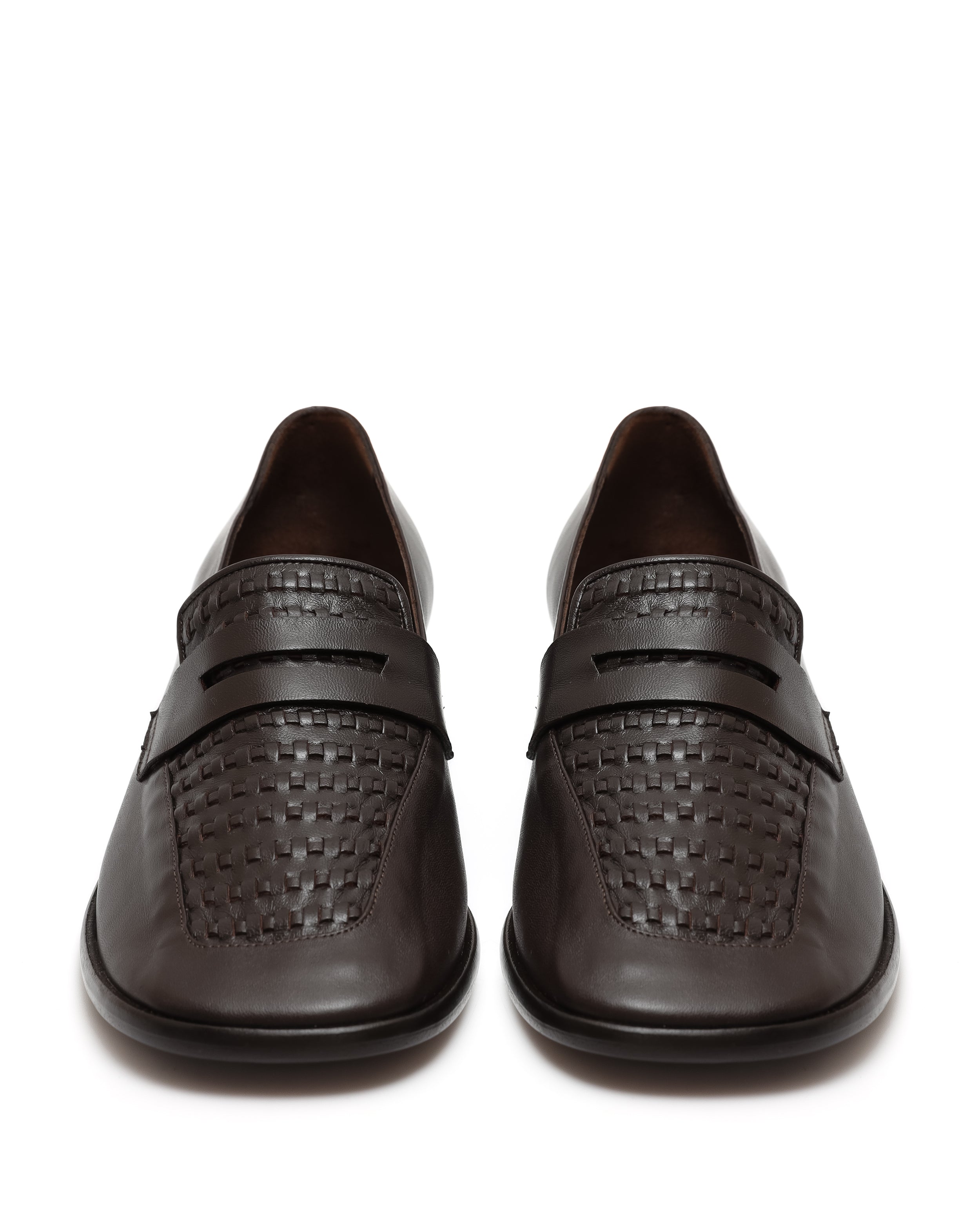 O Loafer Clau é confeccionado em couro, possui bico semi quadrado, cabedal com trançado, solado externo de madeira, salto baixo e acabamento pespontado.