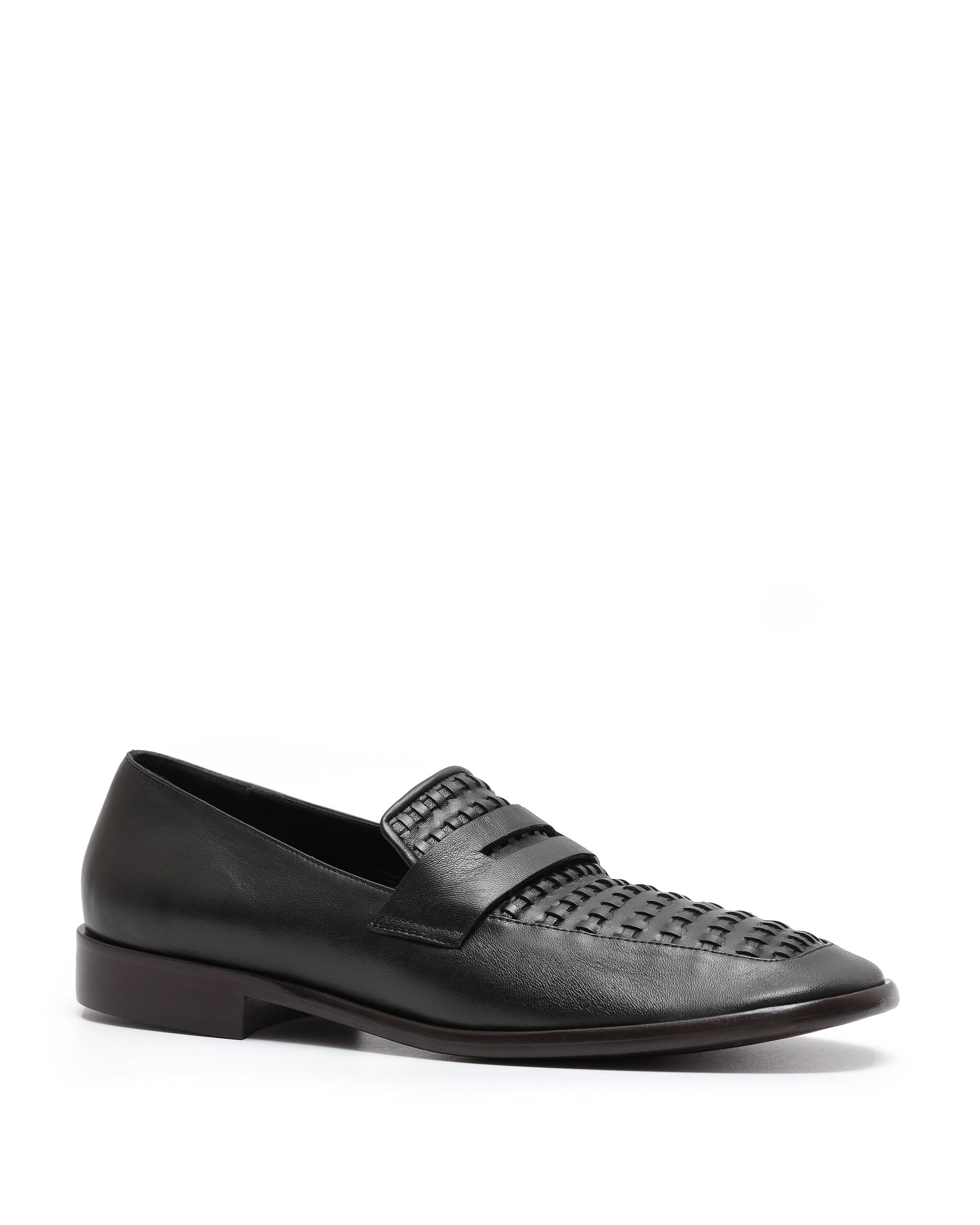O Loafer Clau é confeccionado em couro, possui bico semi quadrado, cabedal com trançado, solado externo de madeira, salto baixo e acabamento pespontado.