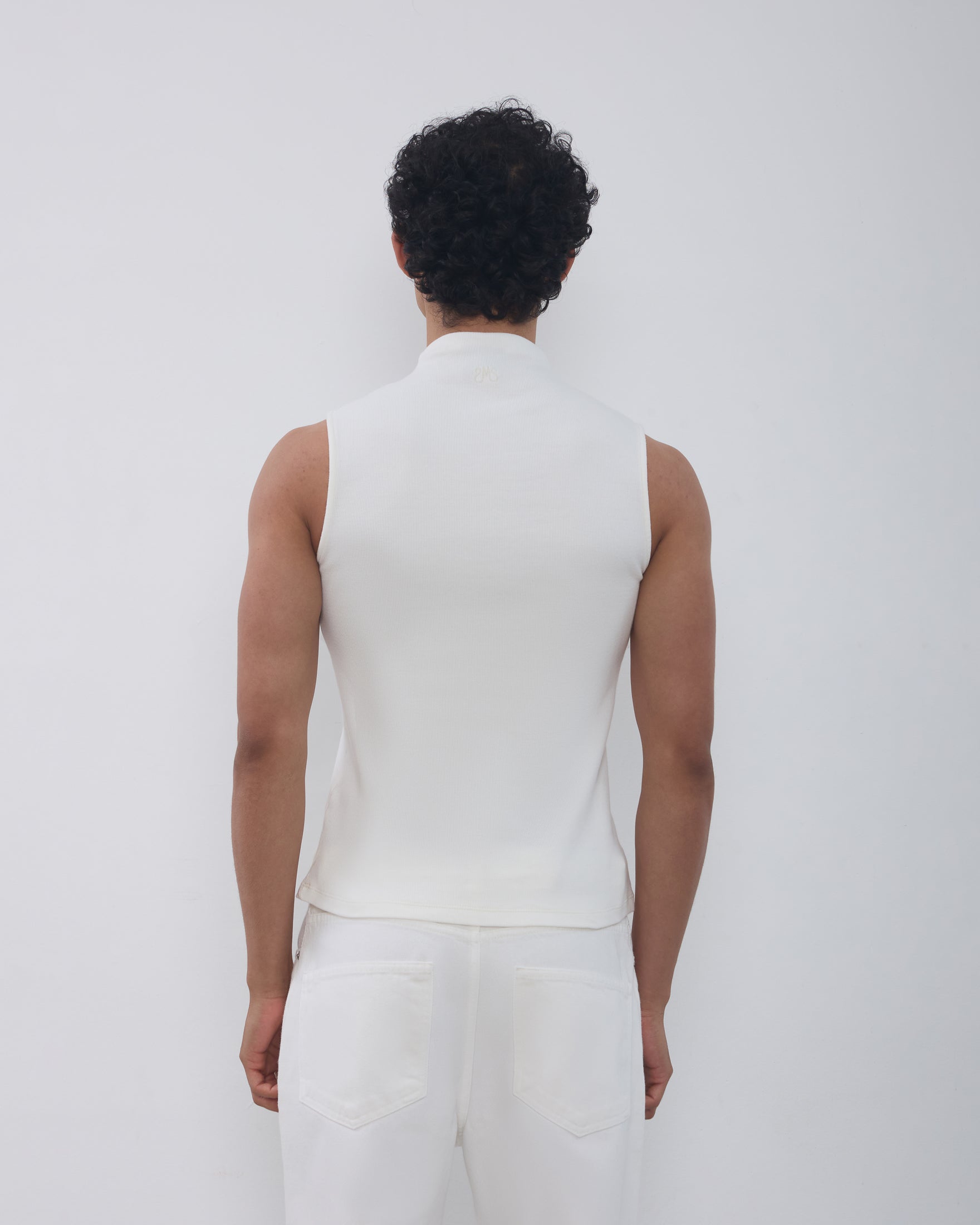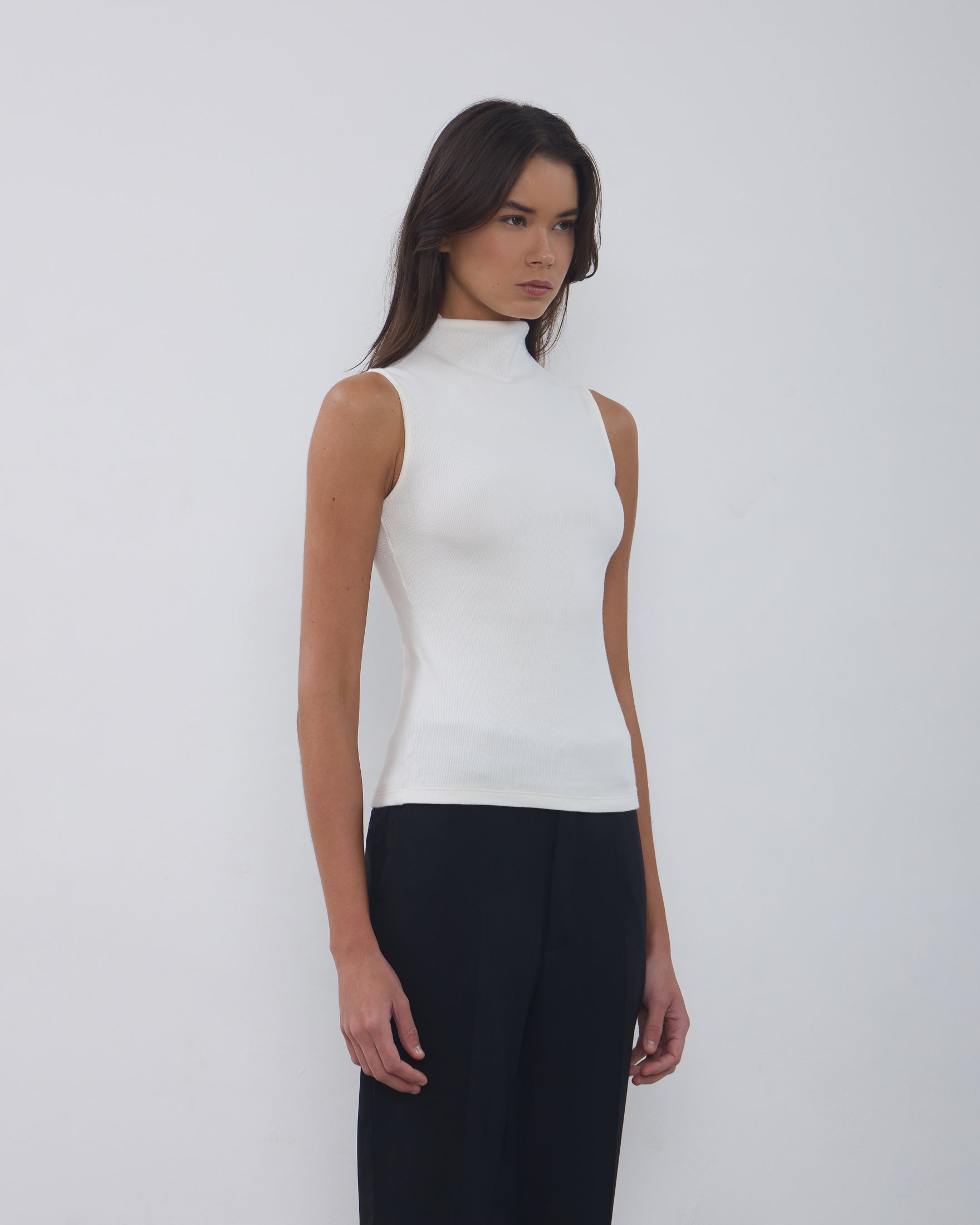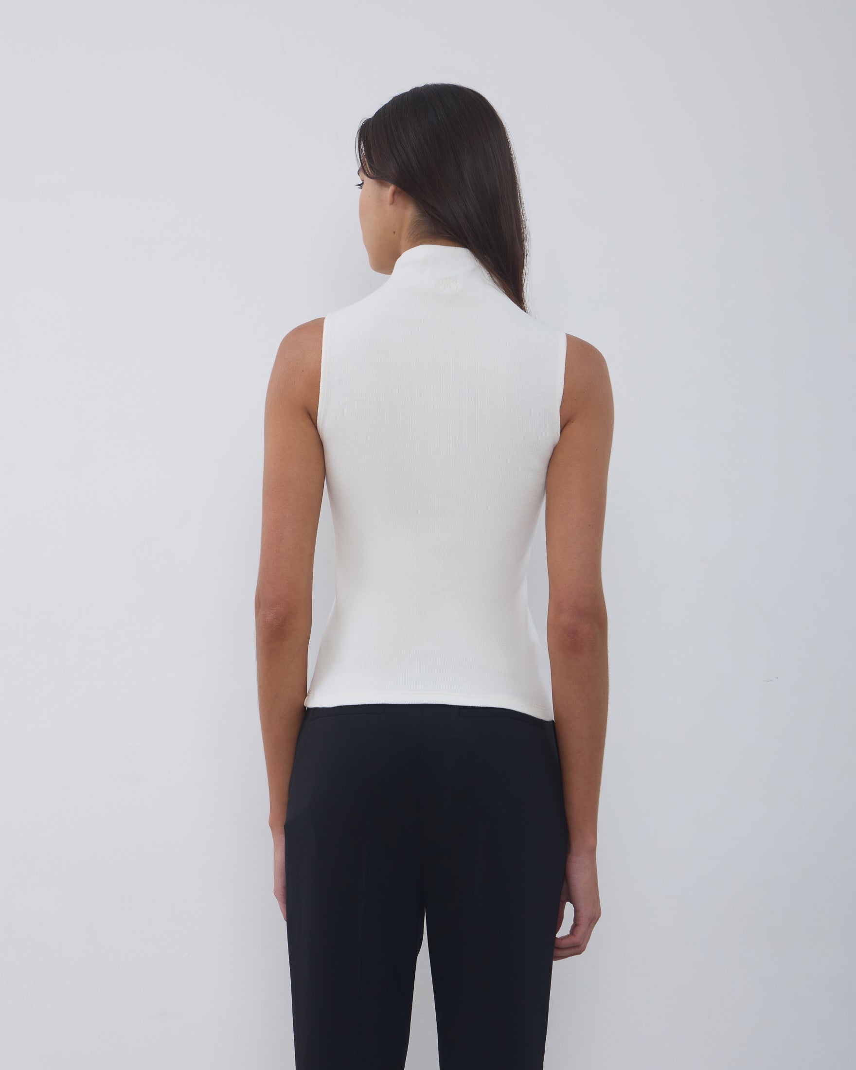 A Regata Ângela é confeccionada em malha canelada, possui caimento ajustado ao corpo, gola alta com logo bordado posterior, alças largas e acabamento pespontado.