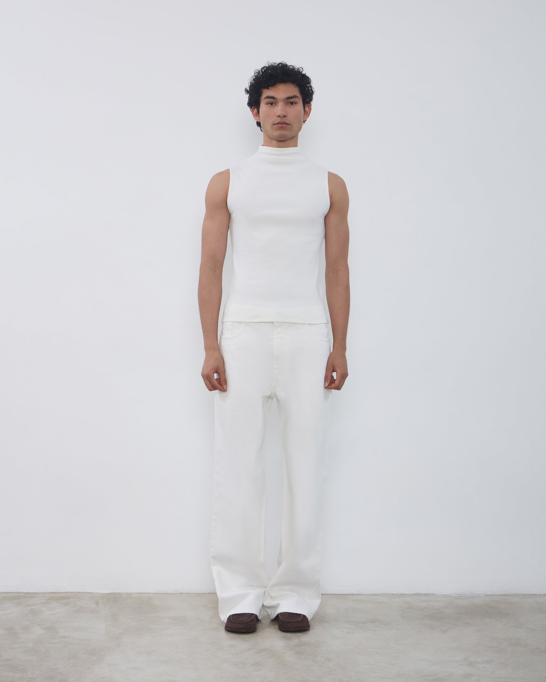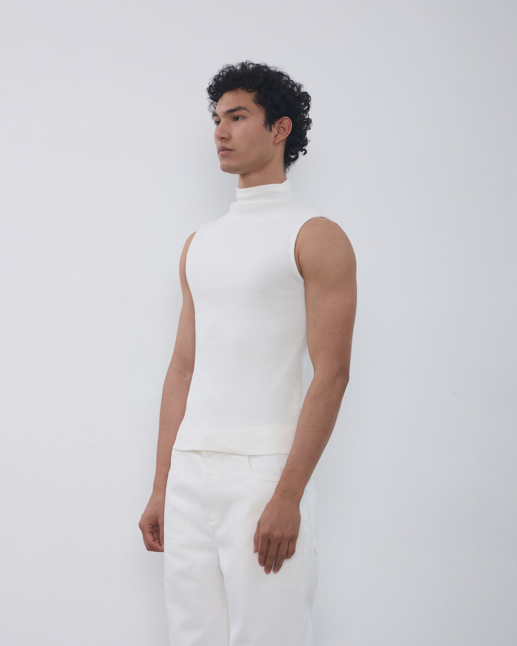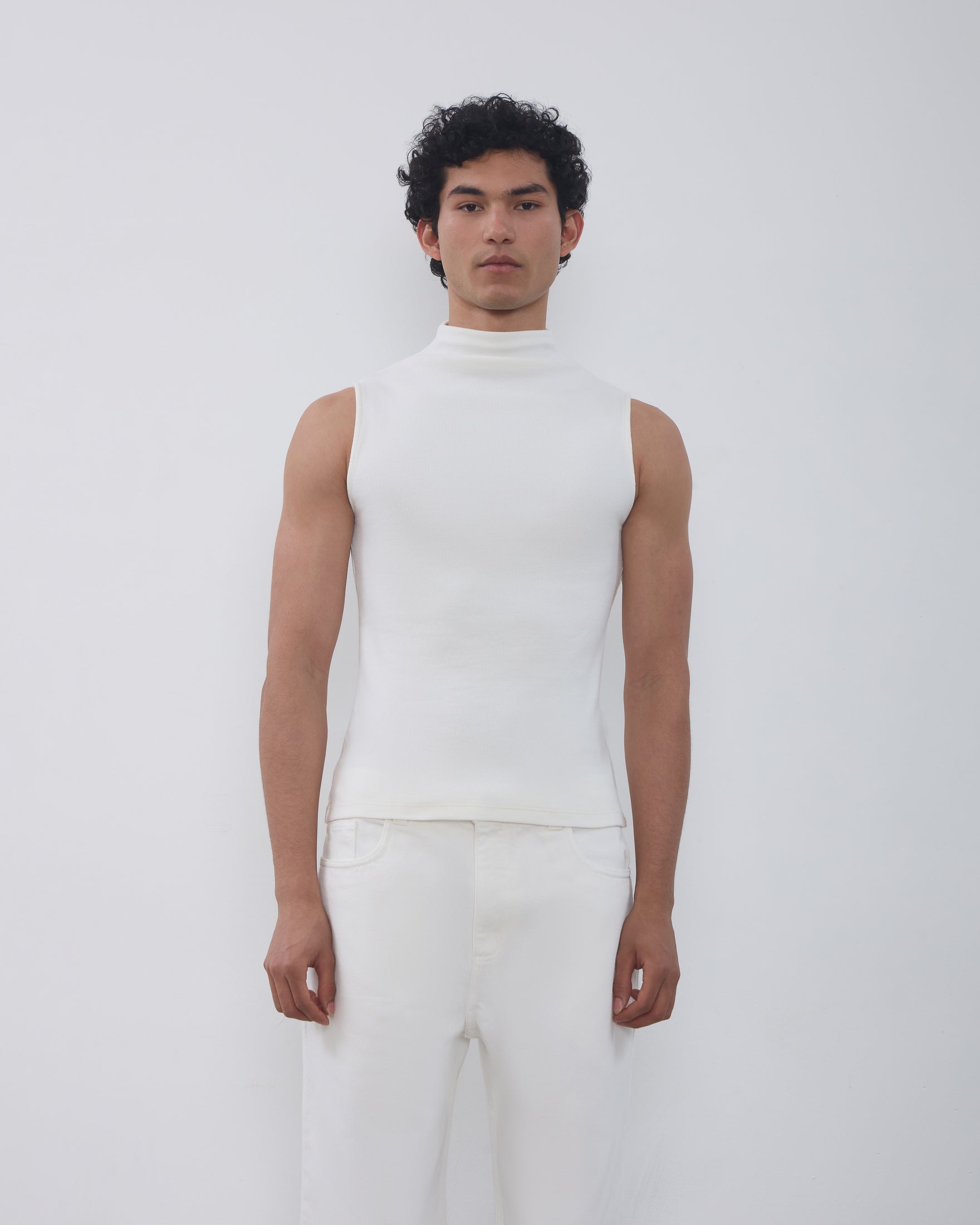 A Regata Ângela é confeccionada em malha canelada, possui caimento ajustado ao corpo, gola alta com logo bordado posterior, alças largas e acabamento pespontado.