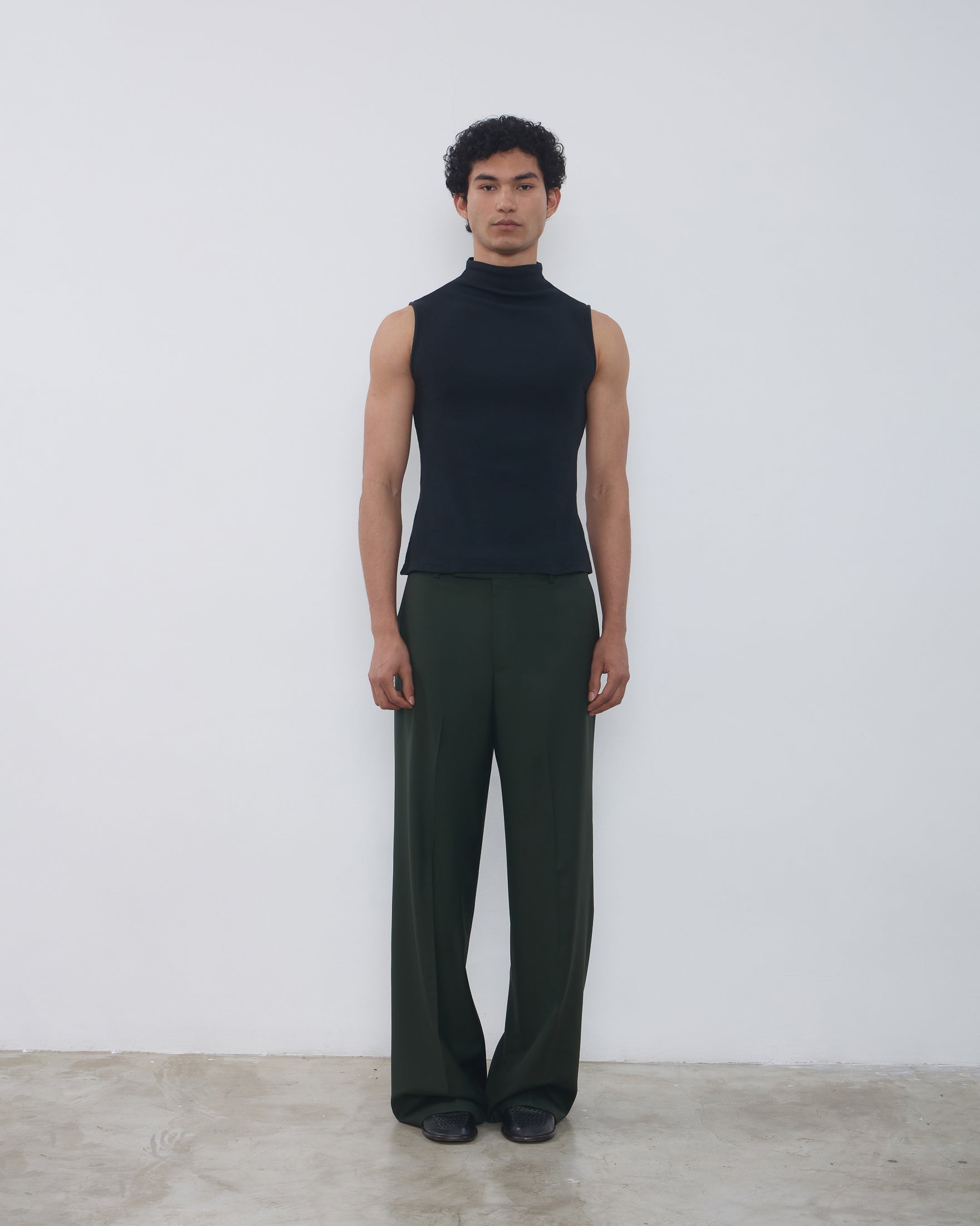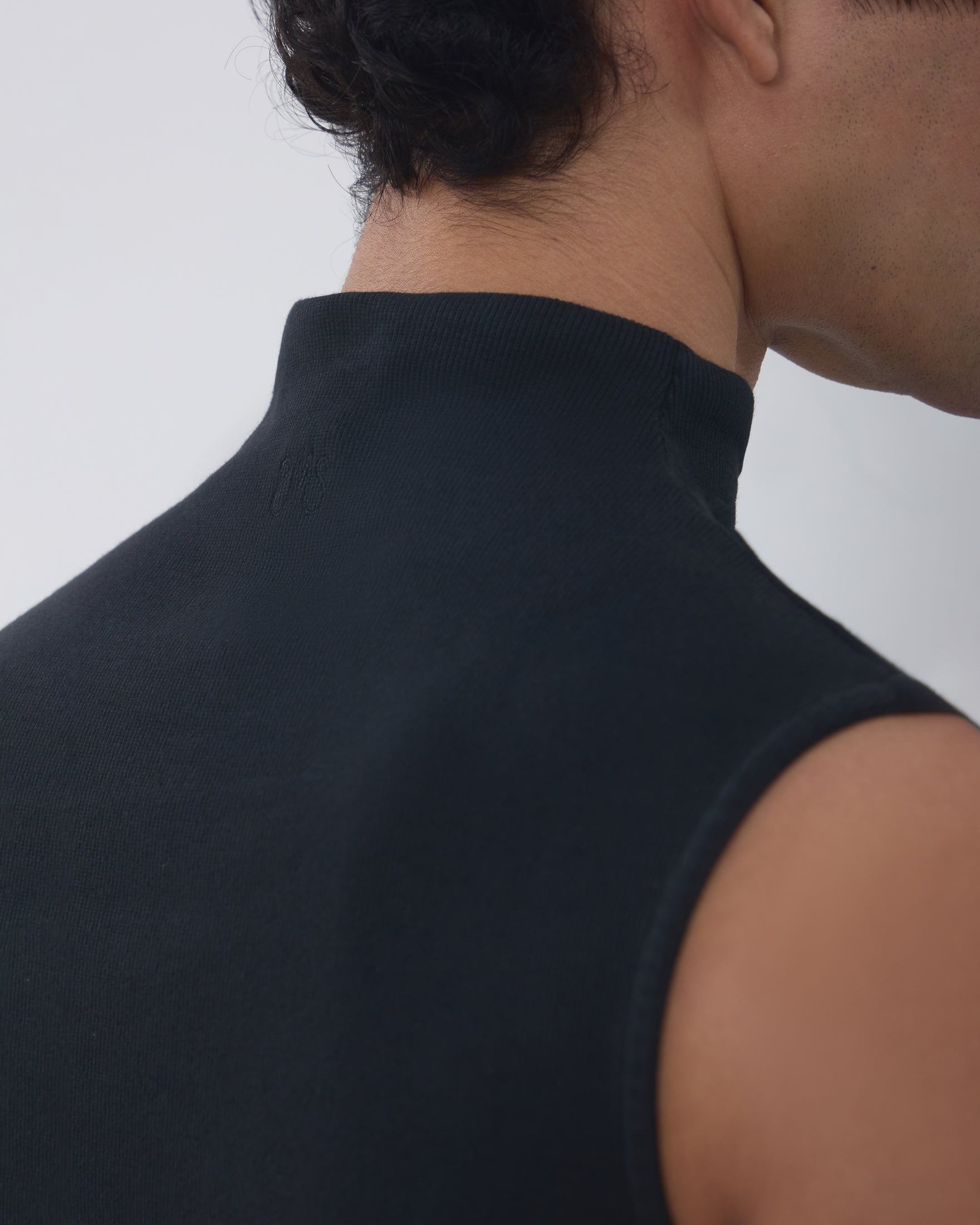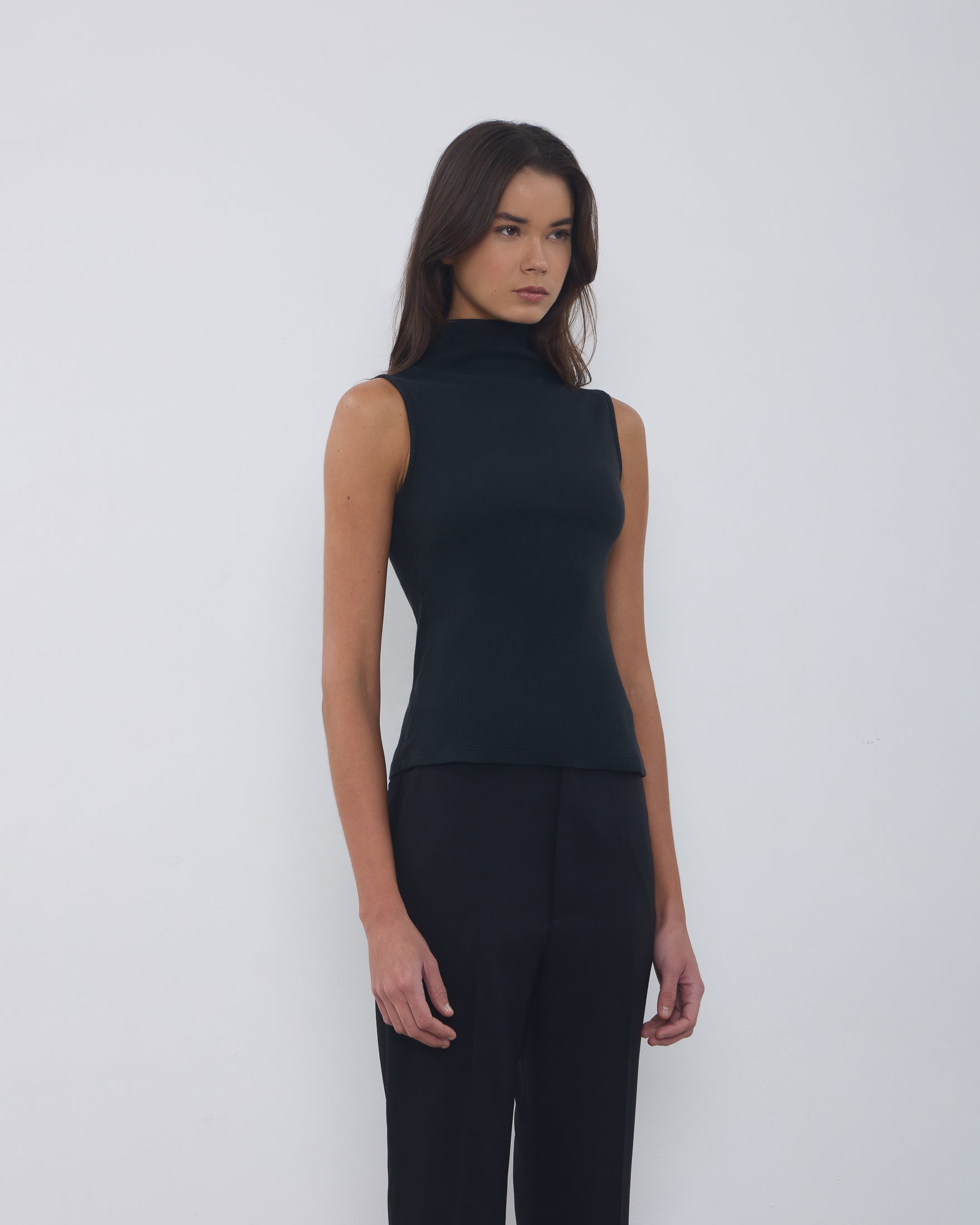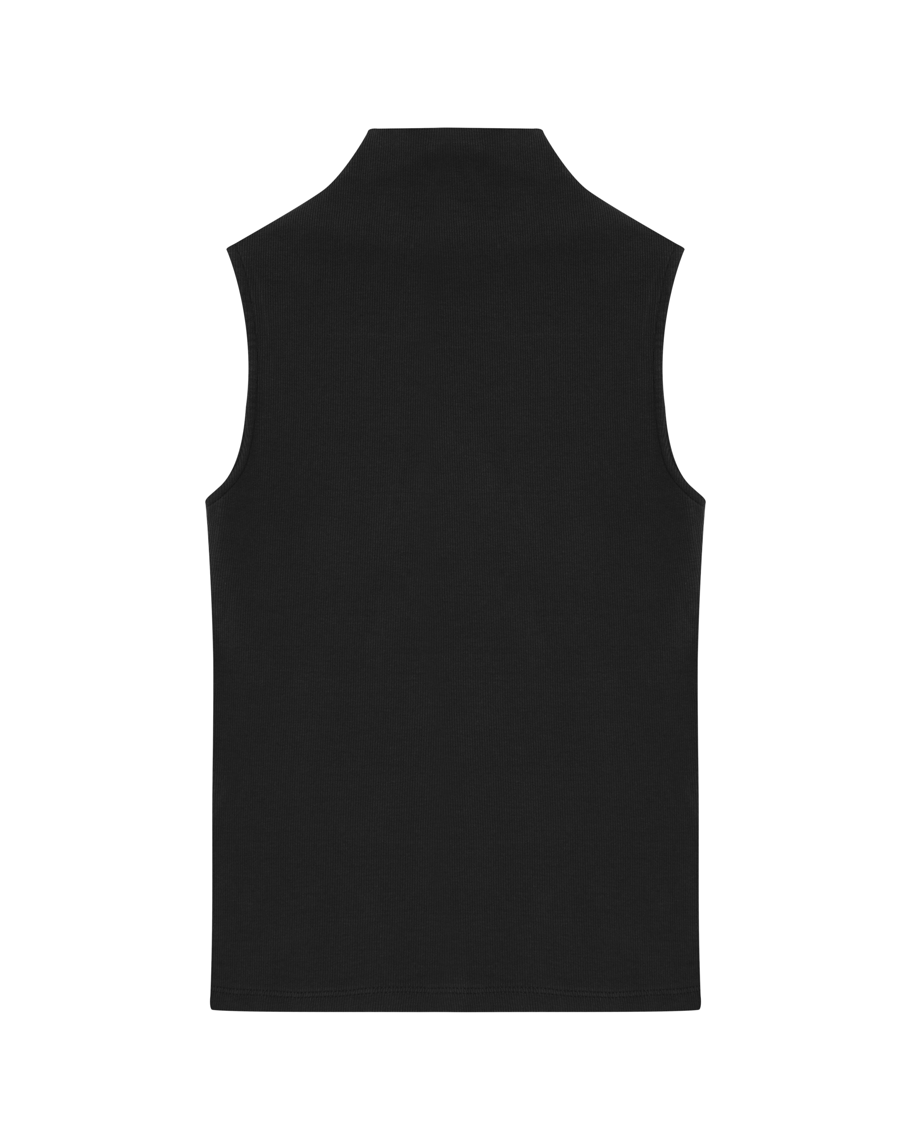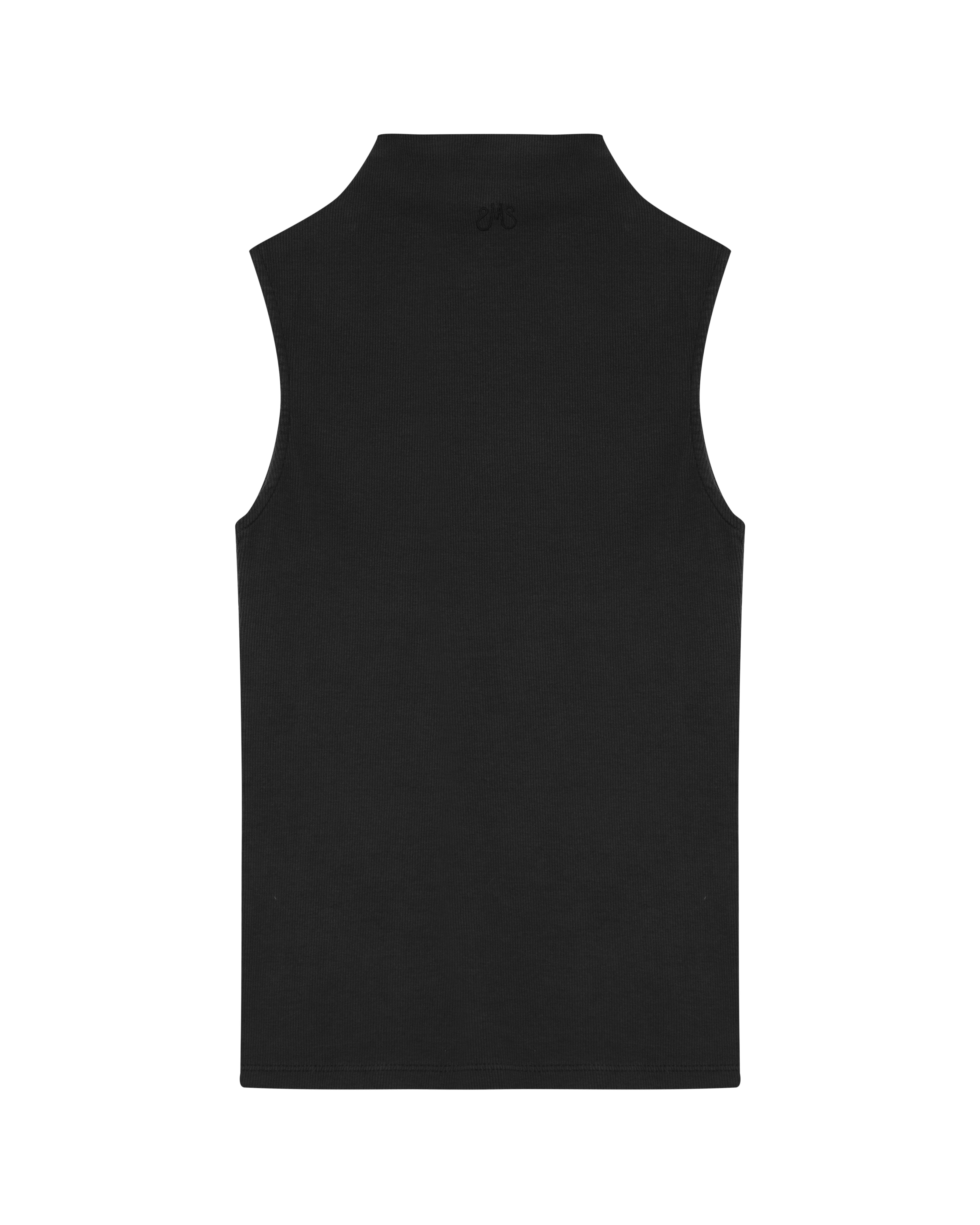 A Regata Ângela é confeccionada em malha canelada, possui caimento ajustado ao corpo, gola alta com logo bordado posterior, alças largas e acabamento pespontado.
