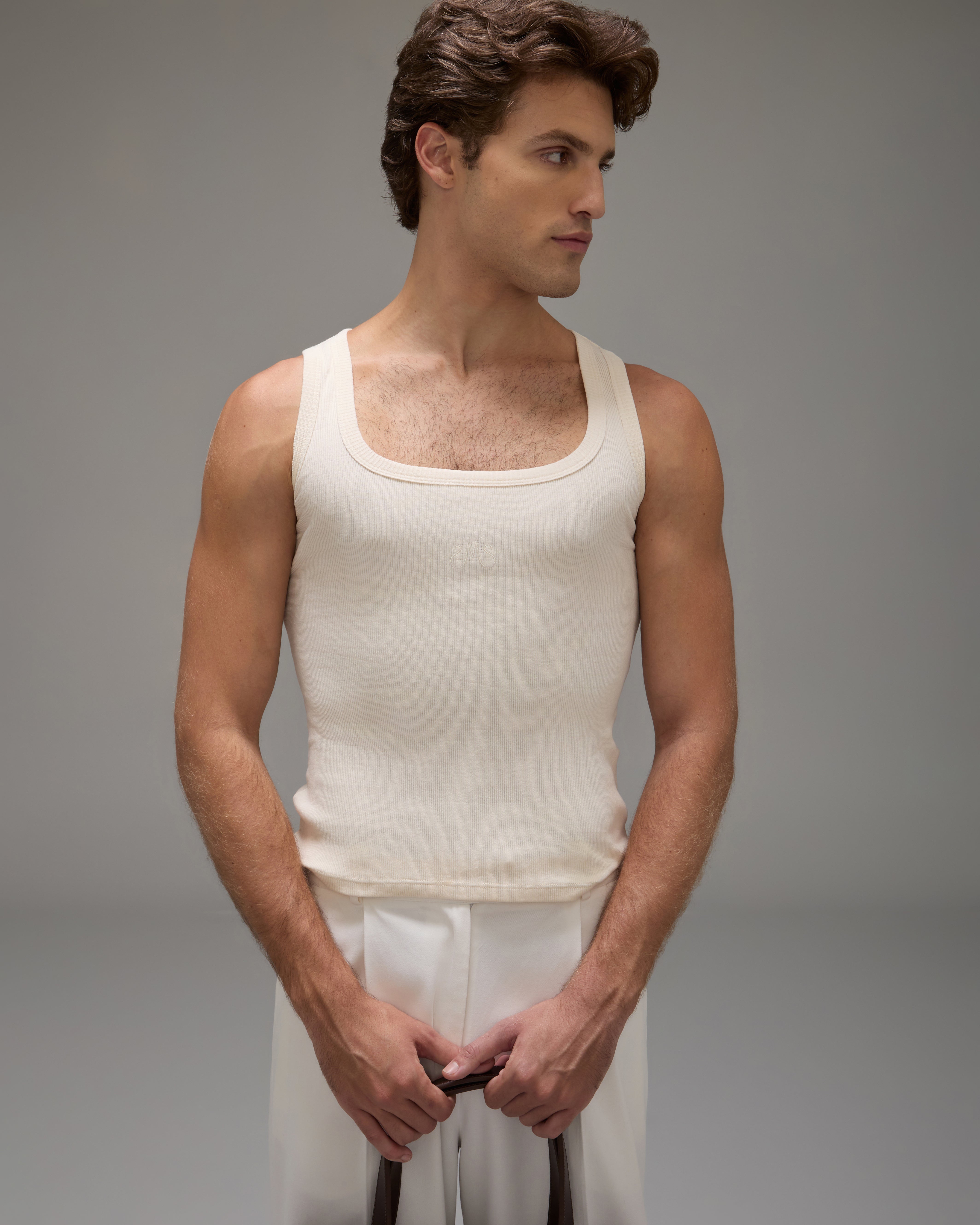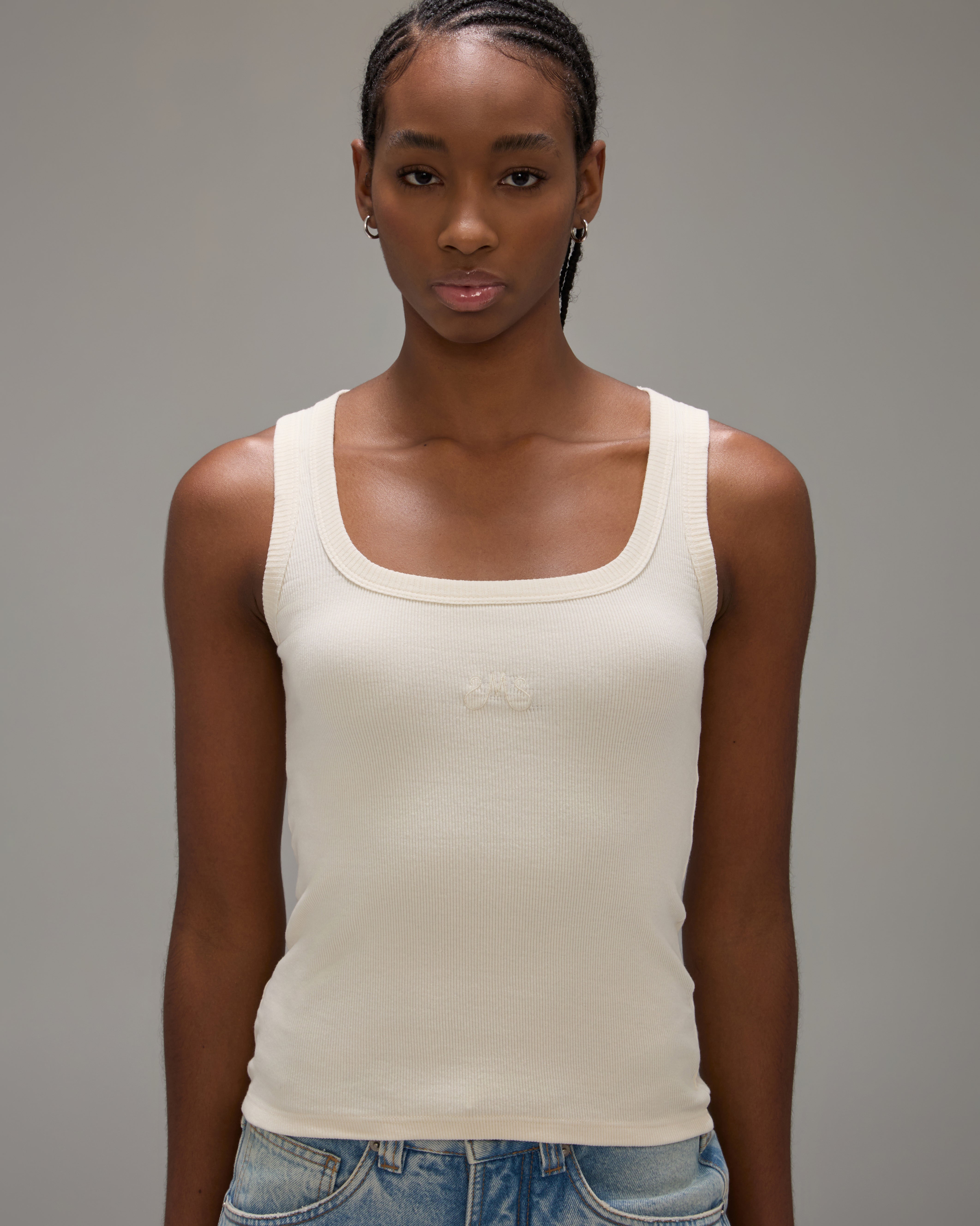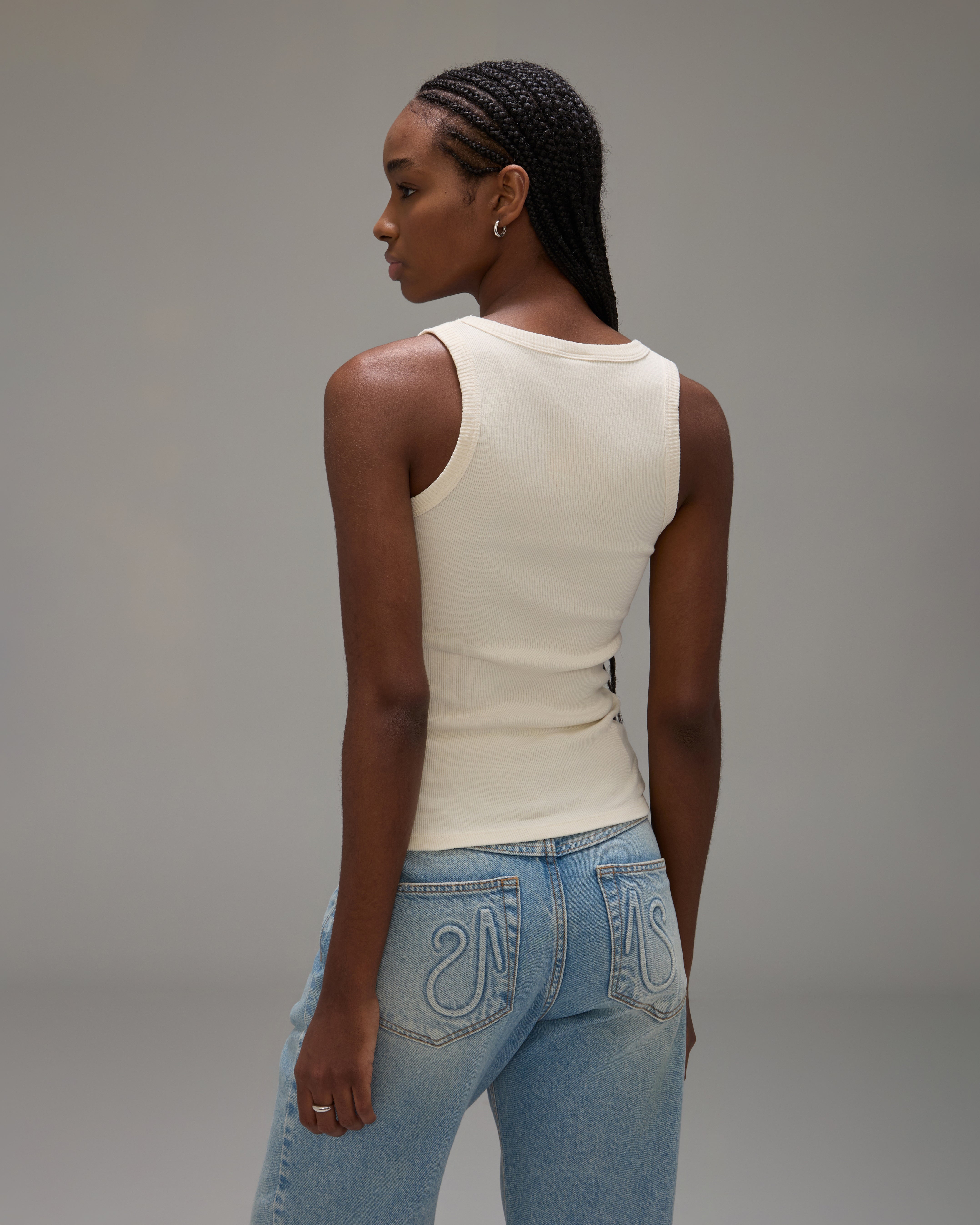 A Regata Arya é confeccionado em malha canelada com lavagem especialmente desenvolvida em lavanderia, possui caimento ajustado, decote quadrado, bordado frontal, alças médias e acabamento pespontado.