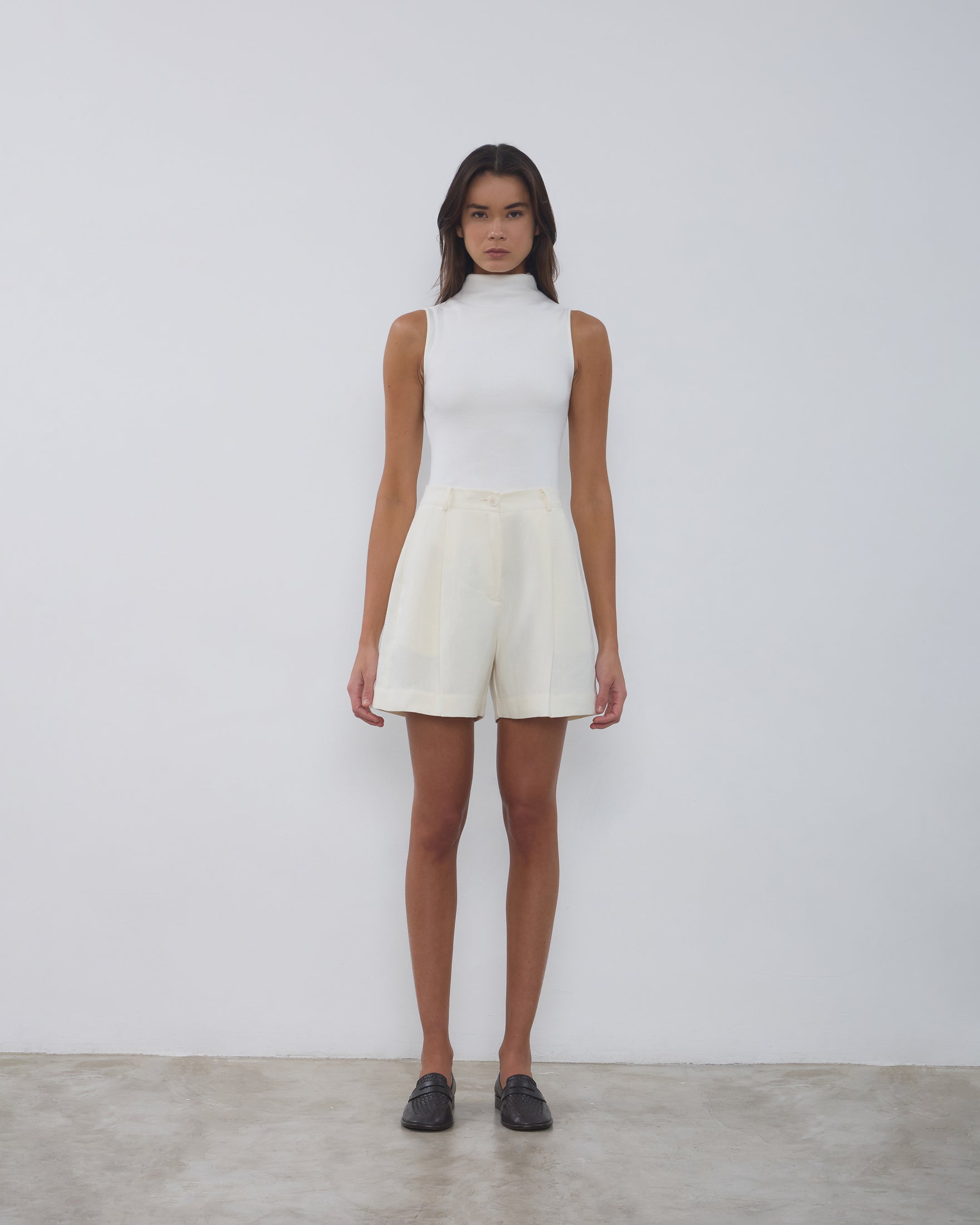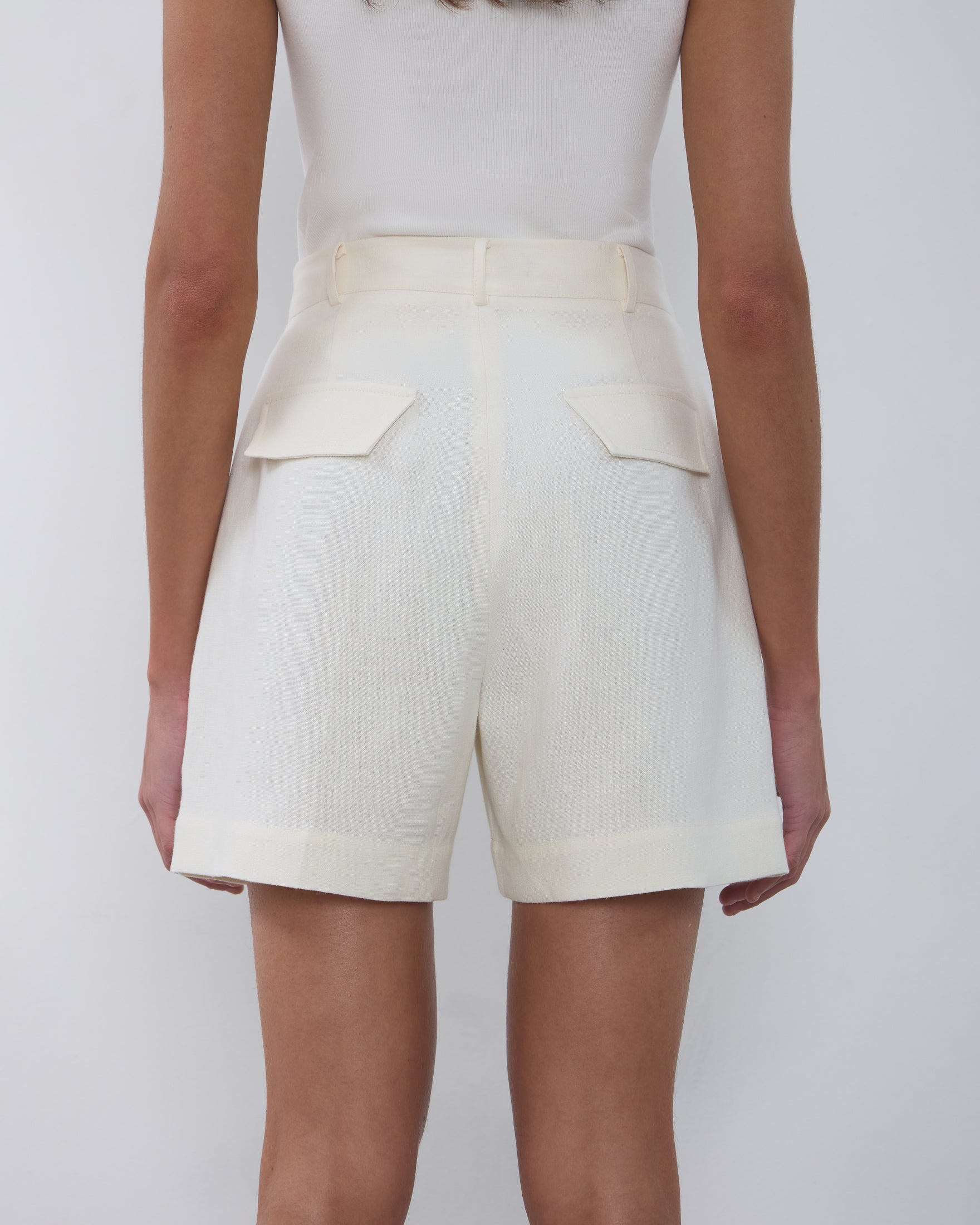 O Shorts Rita é confeccionada em linho, possui modelagem de alfaiataria, caimento acinturado, cós com passantes, fechamento frontal por zíper, gancho e botão, dois bolsos facas frontais, dois bolsos decorativos com lapelas em formato de trapézio nas costas e forro embutido.
