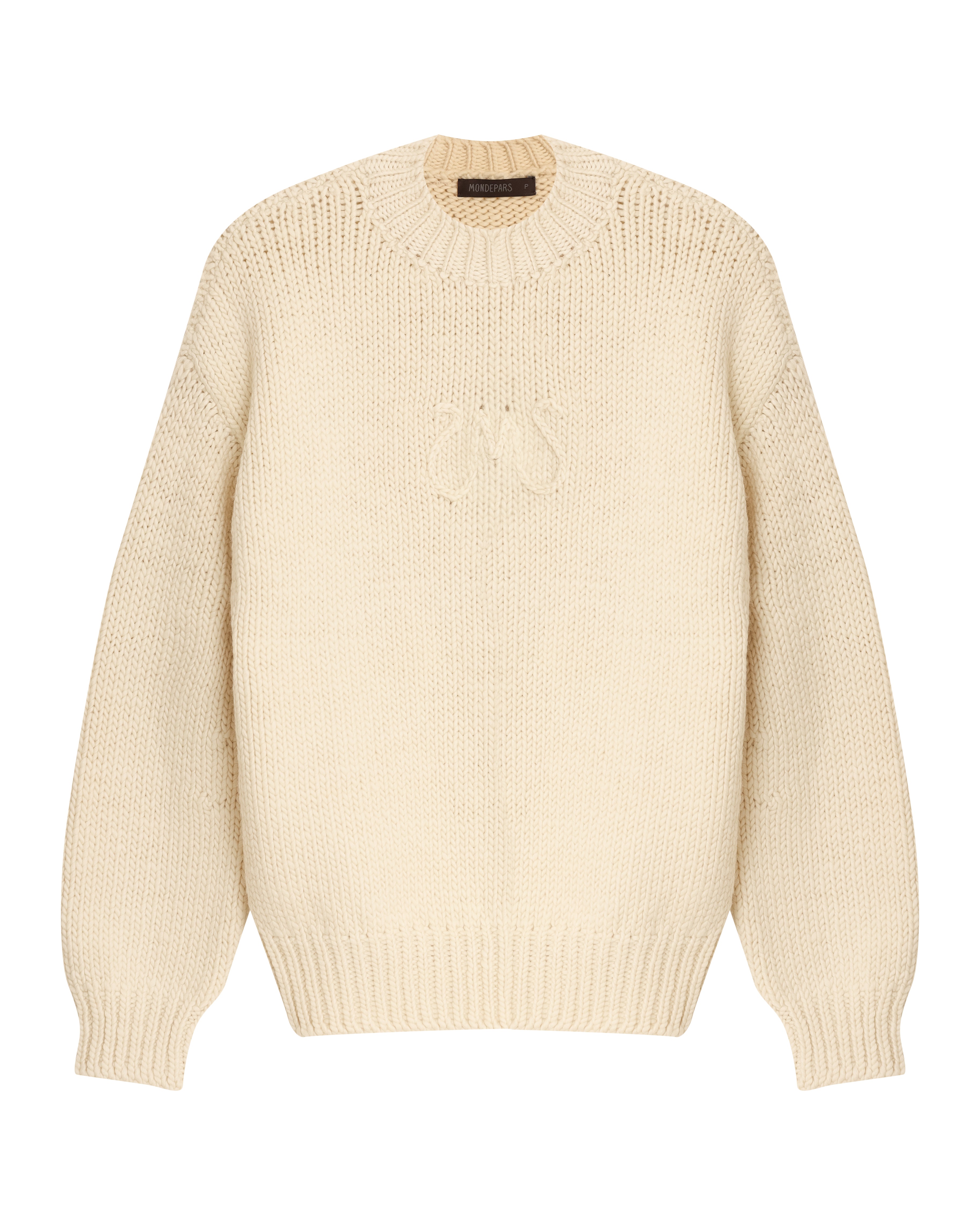 O Sweater Merino é confeccionado manualmente em tricot de lã merino, possui bordado centralizado no peito feito no mesmo fio, gola redonda, mangas longas e acabamento canelado.
