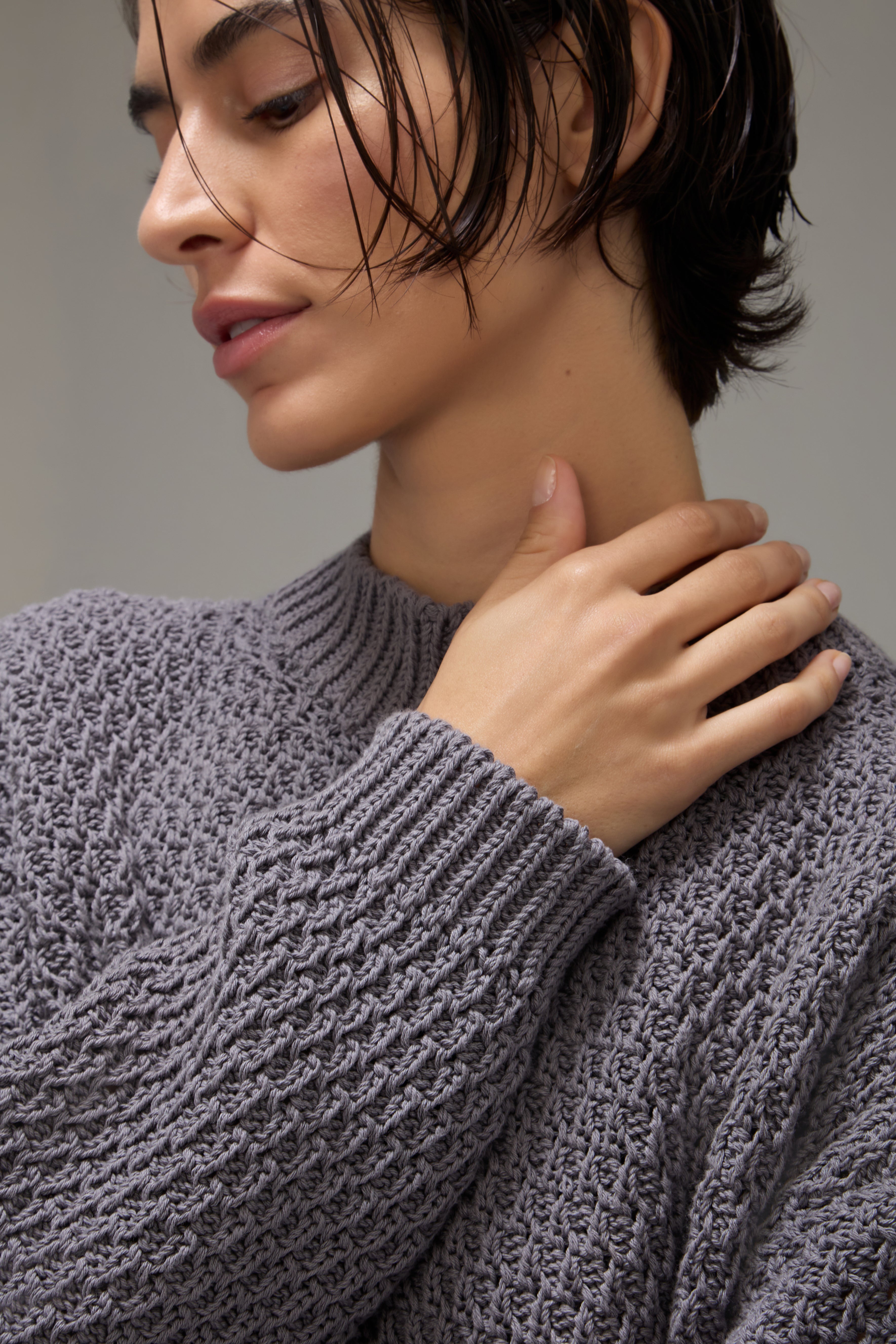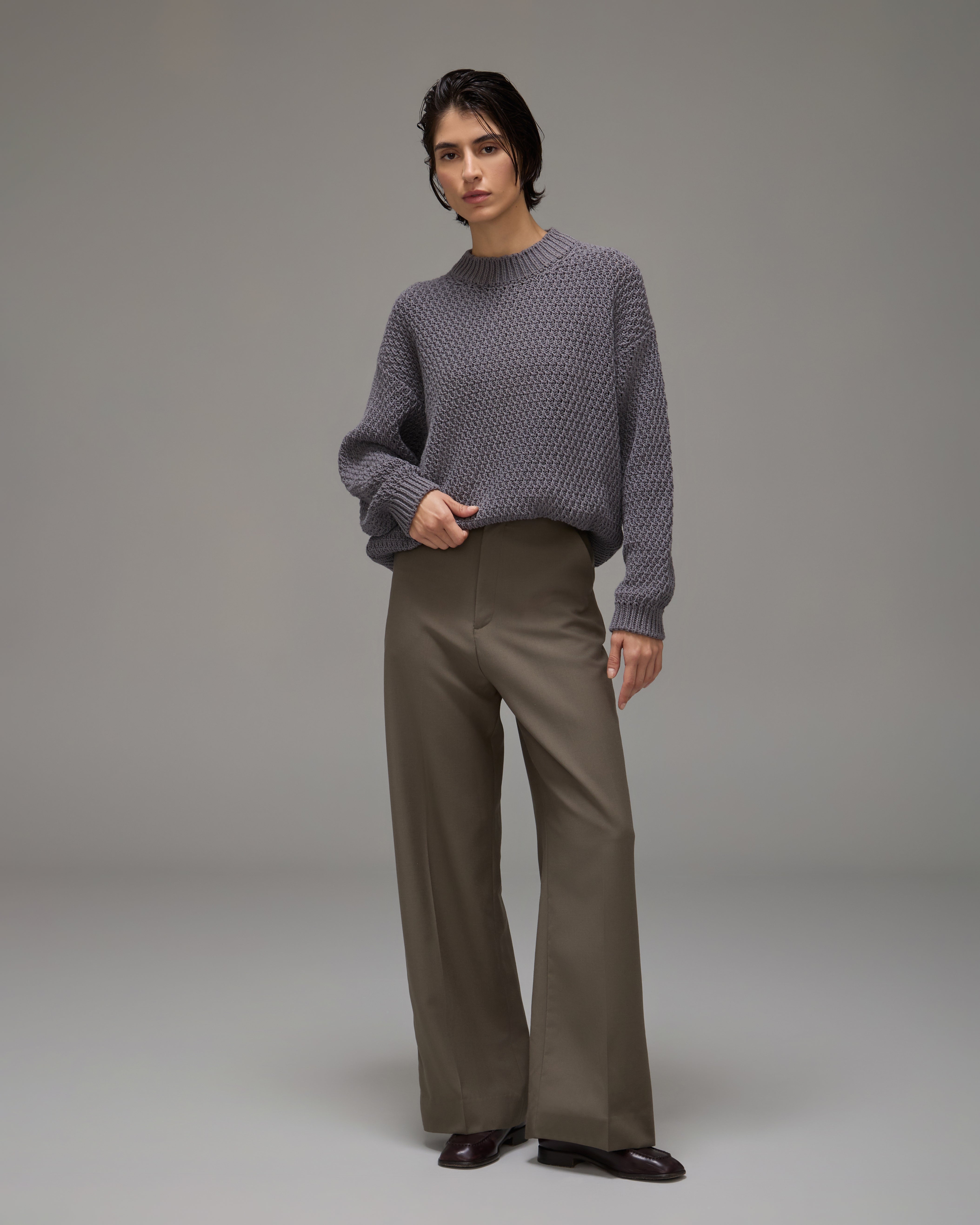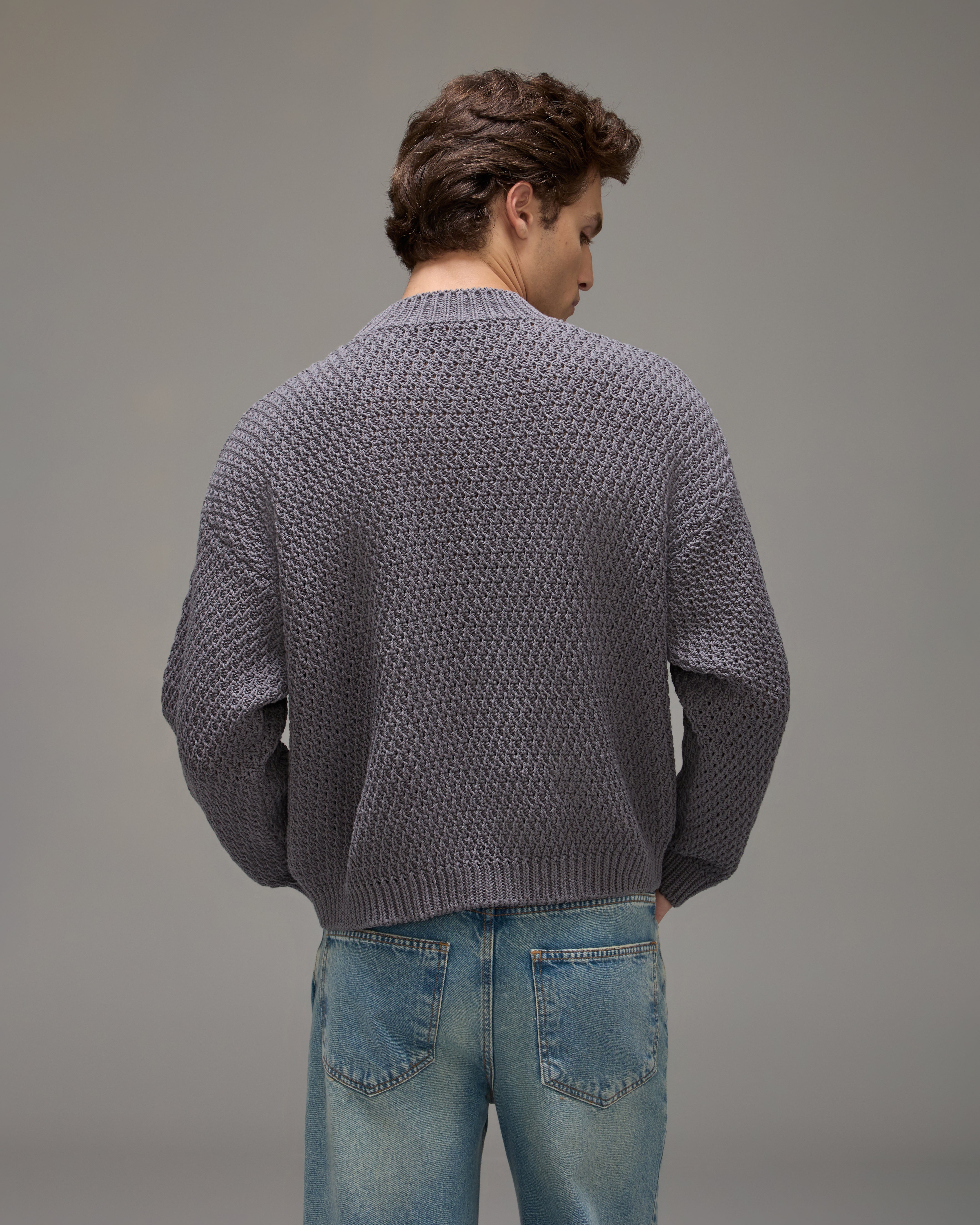 O Sweater Niko confeccionado em tricot com trama especialmente desenvolvida em padronagem encorpada, possui gola, mangas longas, barra reta e acabamento canelado.