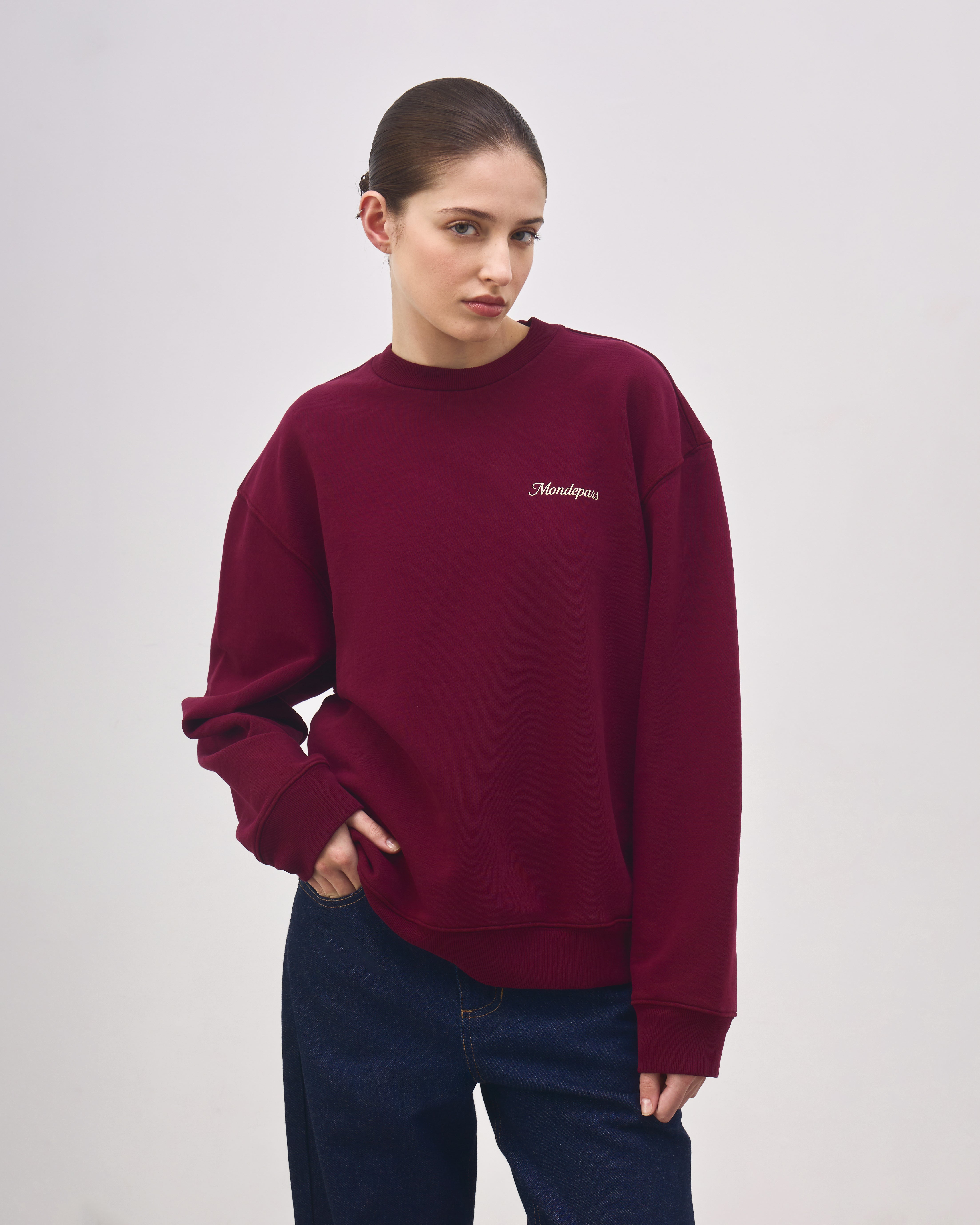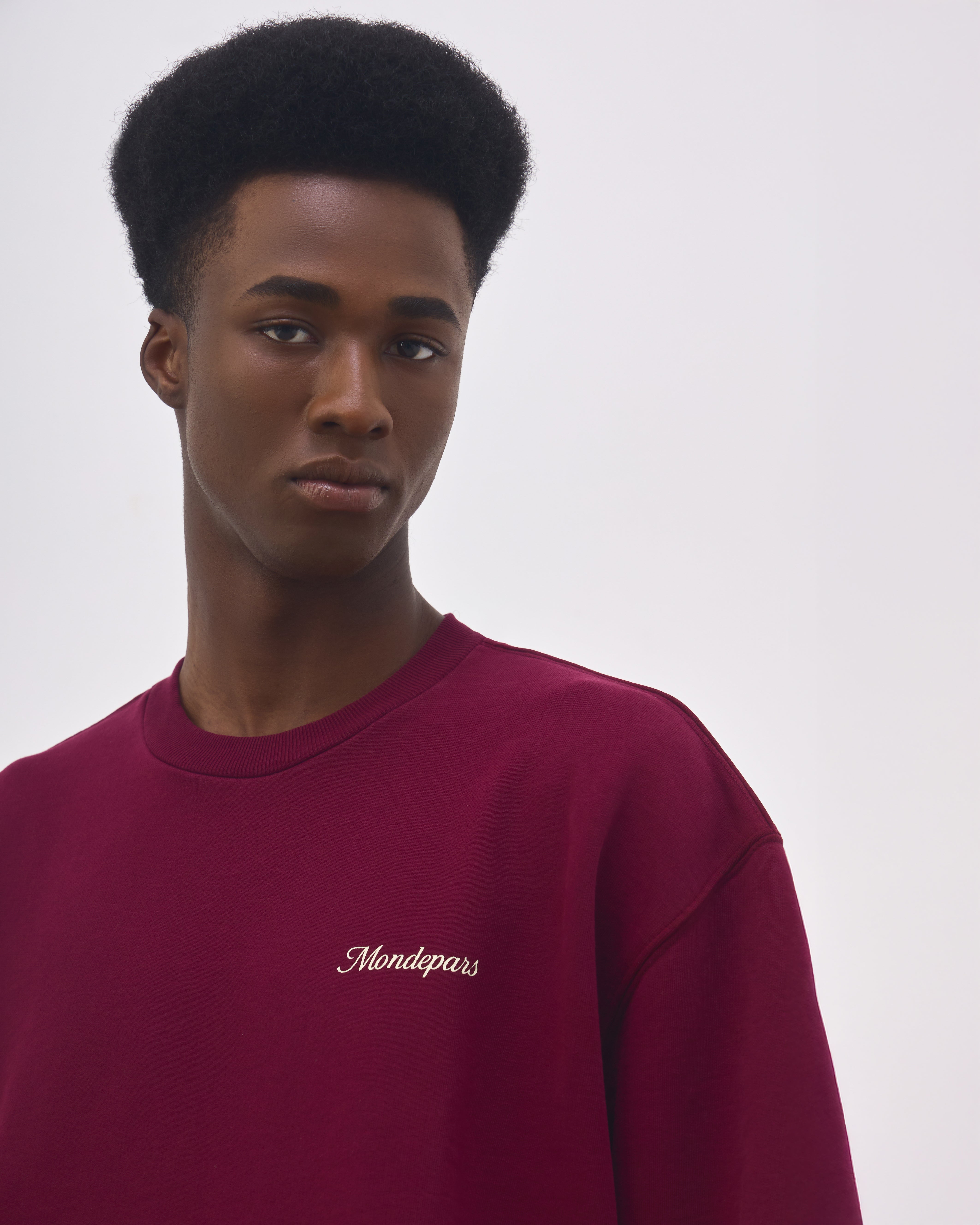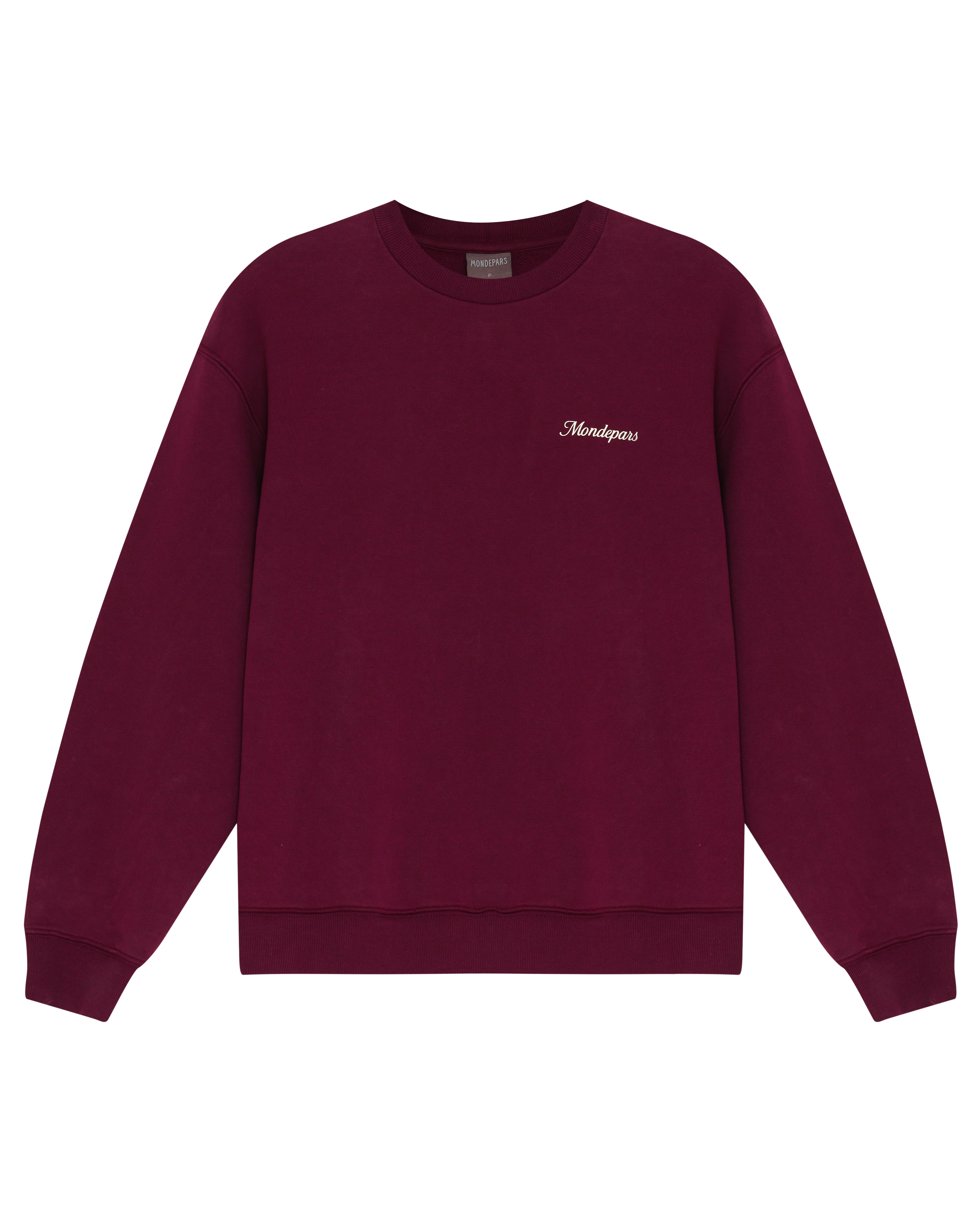 A Sweatshirt Mondepars é confeccionada em algodão com lavanderia vintage, na cor vinho intensa com aspecto levemente desgastado, possui modelo oversize, gola redonda, silk de toque zero com assinatura Mondepars em lettering cursivo na frente e logo aplicado nas costas, mangas longas e acabamento canelado.