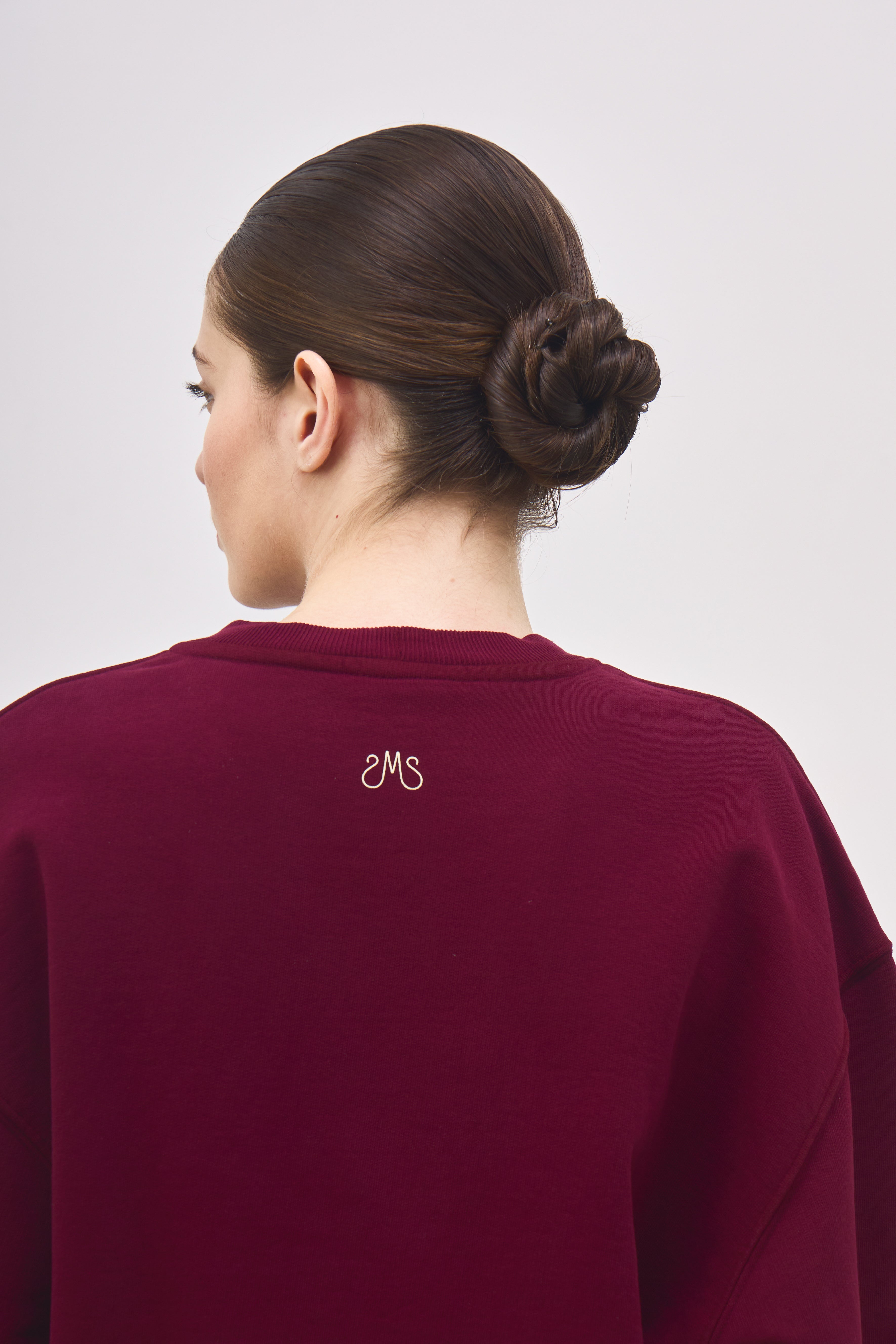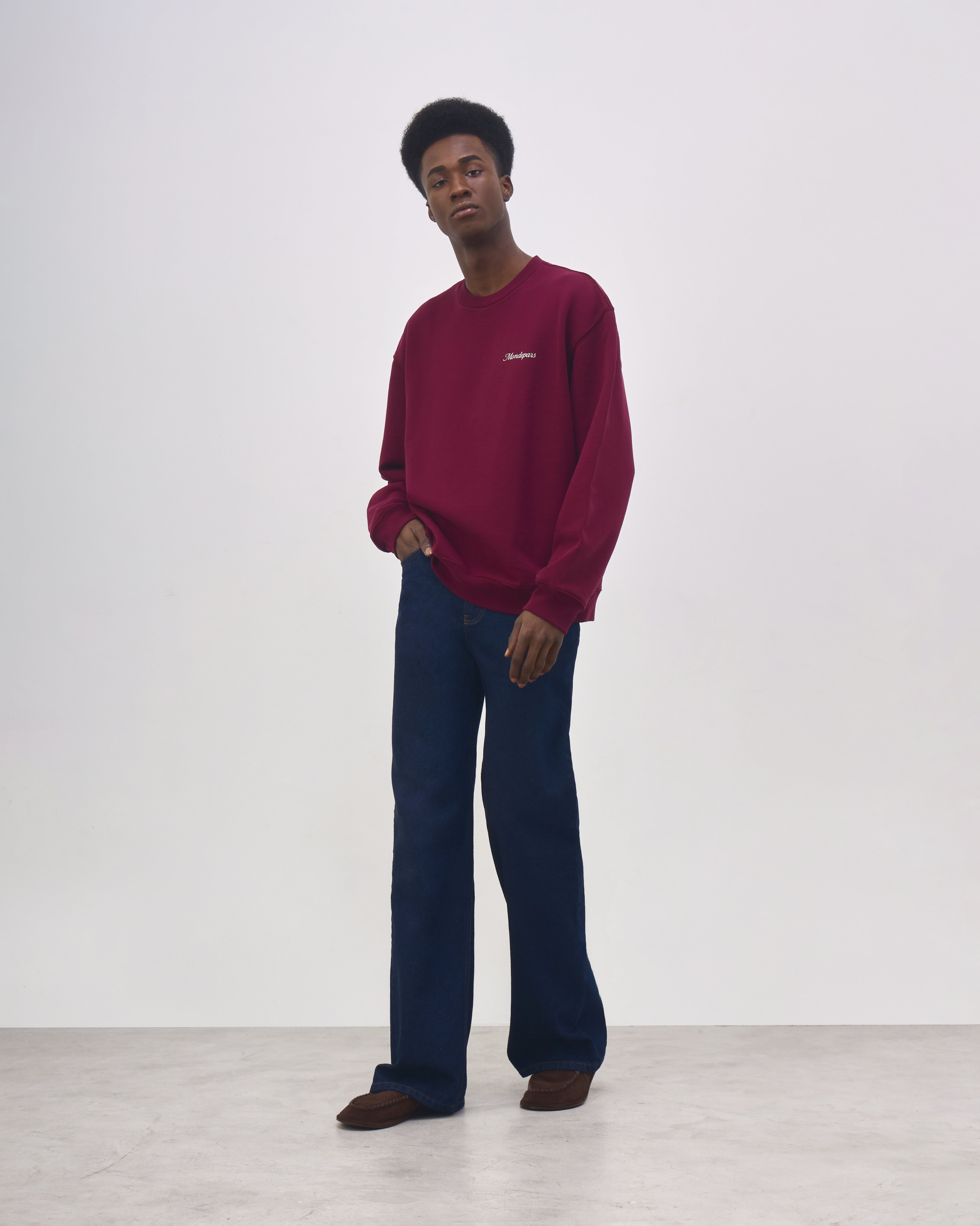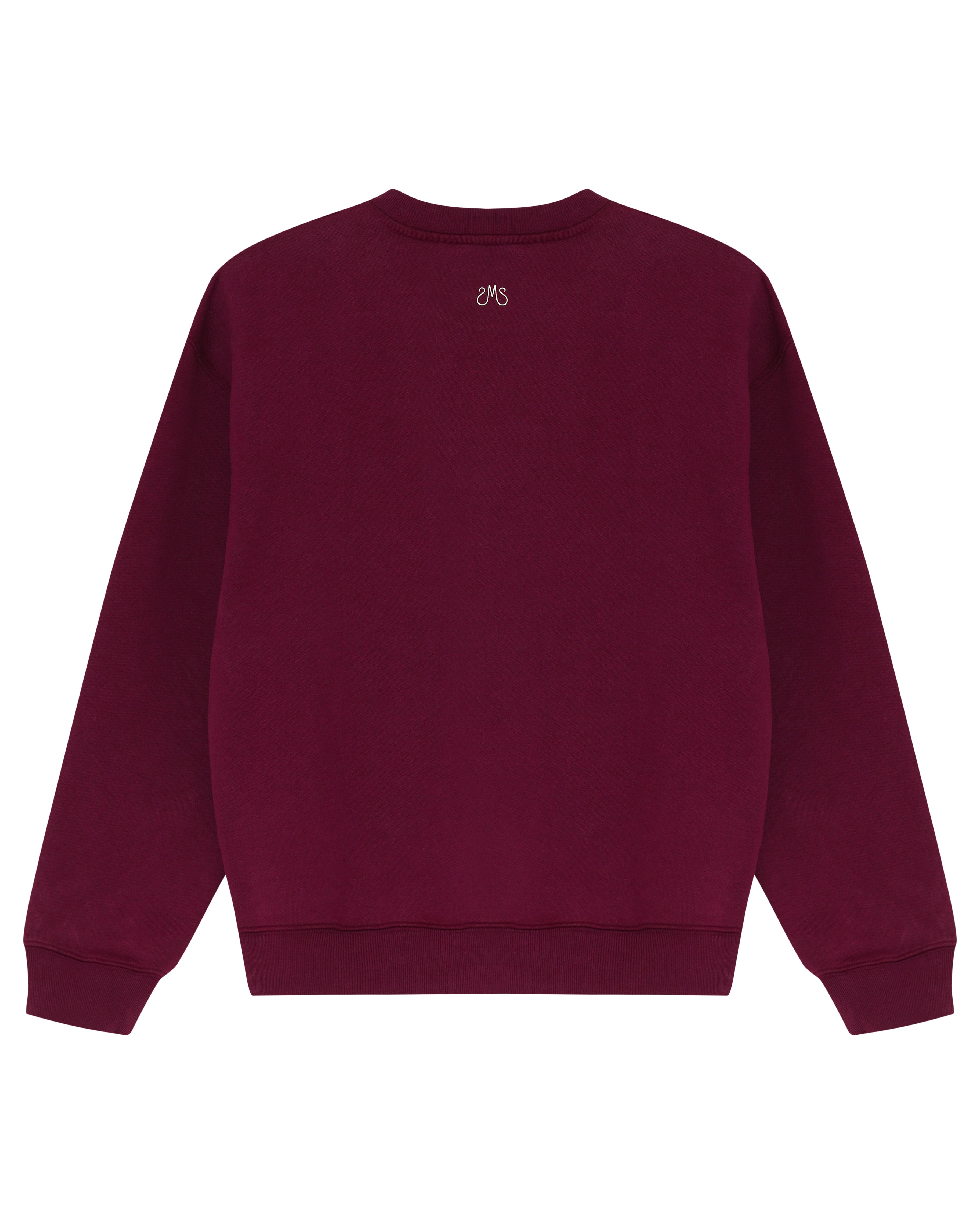 A Sweatshirt Mondepars é confeccionada em algodão com lavanderia vintage, na cor vinho intensa com aspecto levemente desgastado, possui modelo oversize, gola redonda, silk de toque zero com assinatura Mondepars em lettering cursivo na frente e logo aplicado nas costas, mangas longas e acabamento canelado.