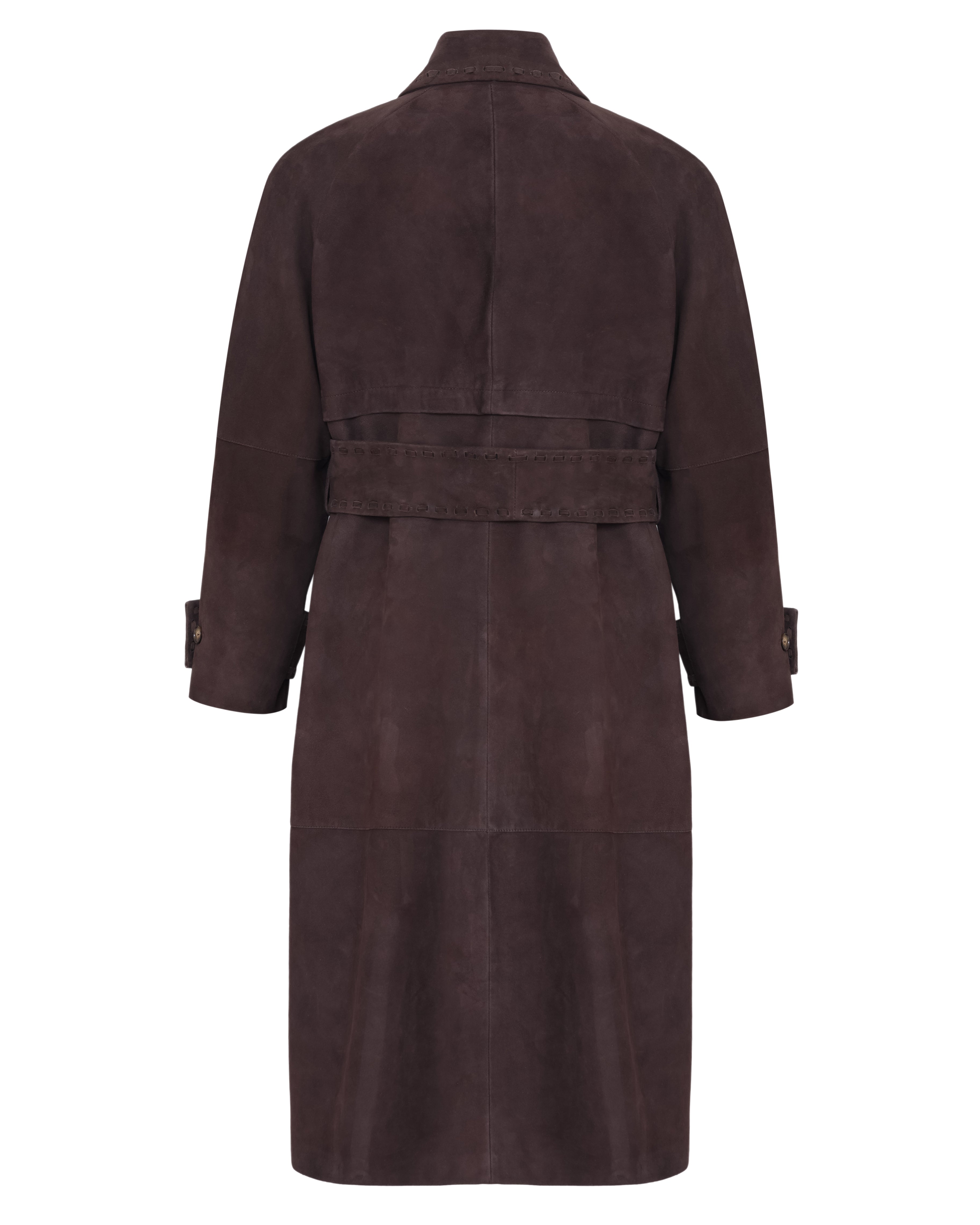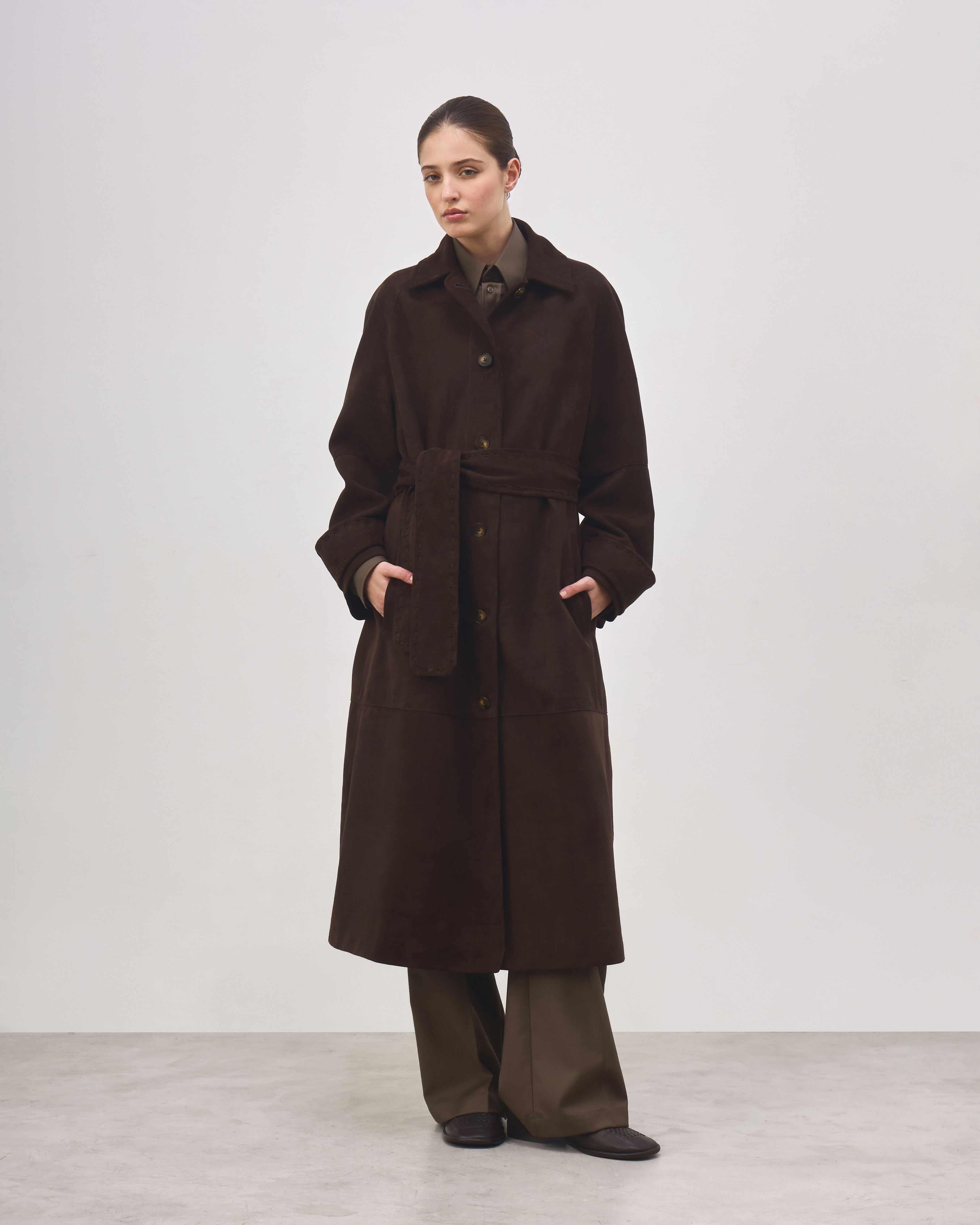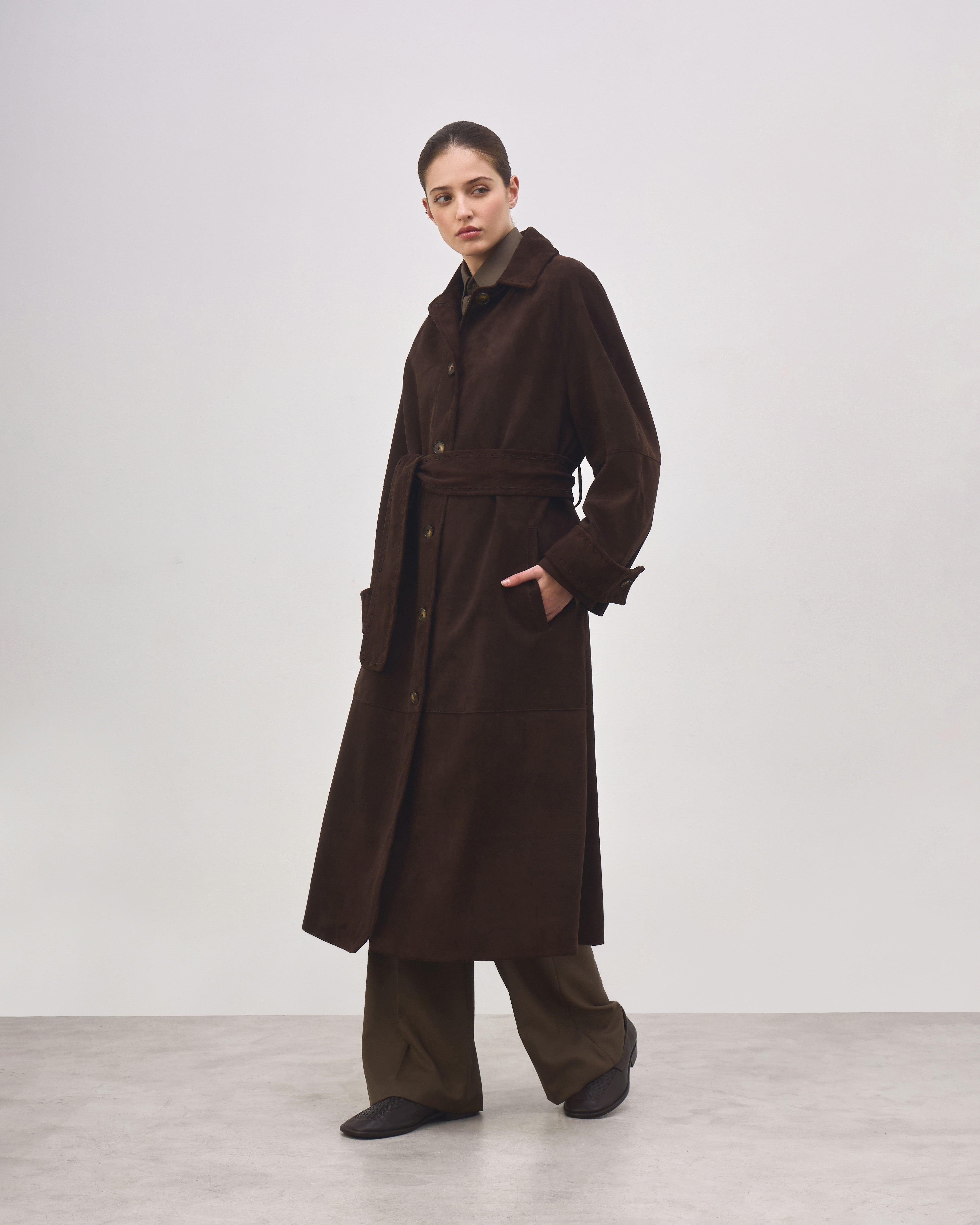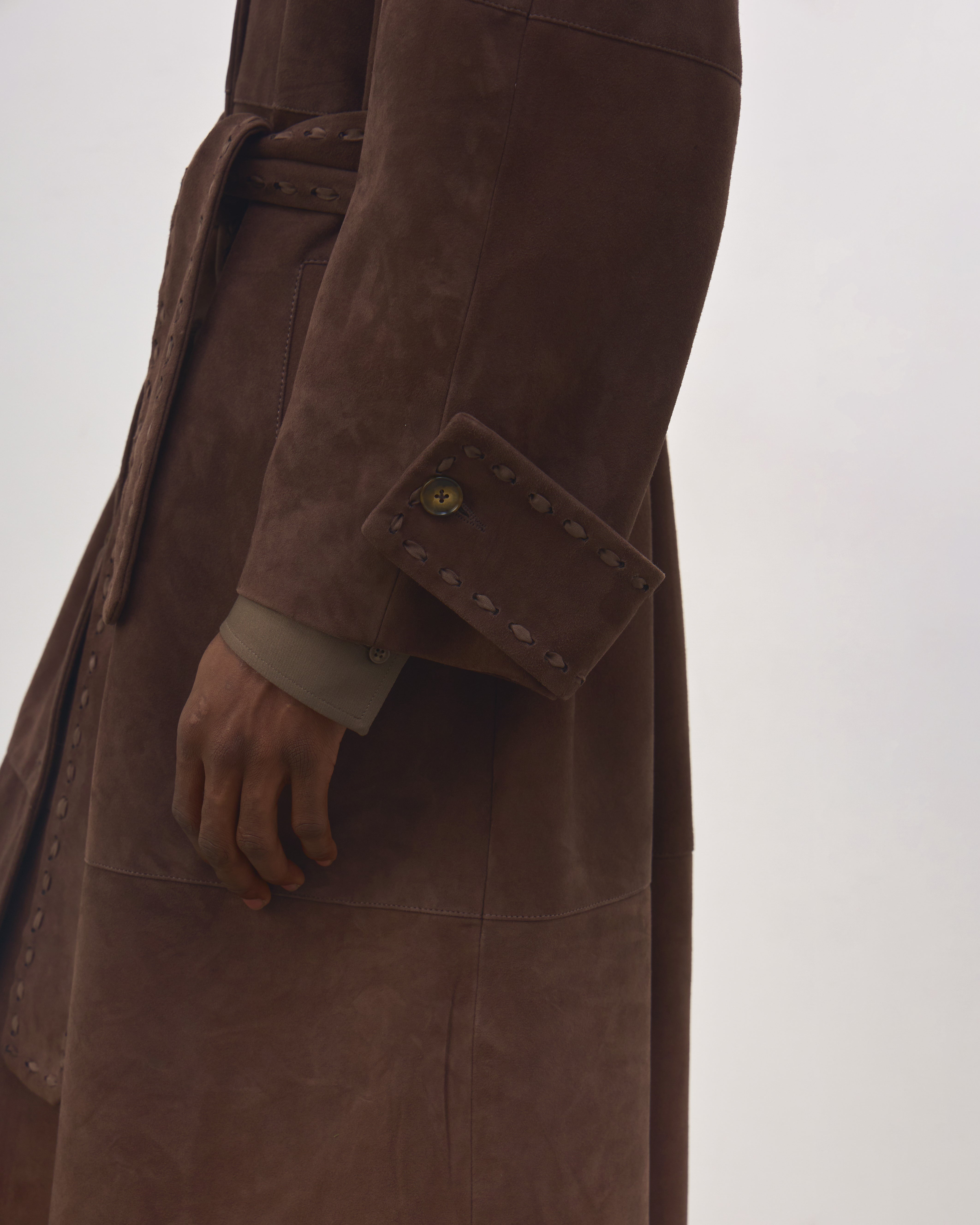 O Trench Cassio é confeccionado em camurça, possui caimento reto, colarinho, fechamento frontal por botões, cintura com passantes nas laterais, cinto do mesmo tecido, mangas longas com martigales nos punhos, dois bolsos frontais embutidos, forro embutido e acabamento pespontado.