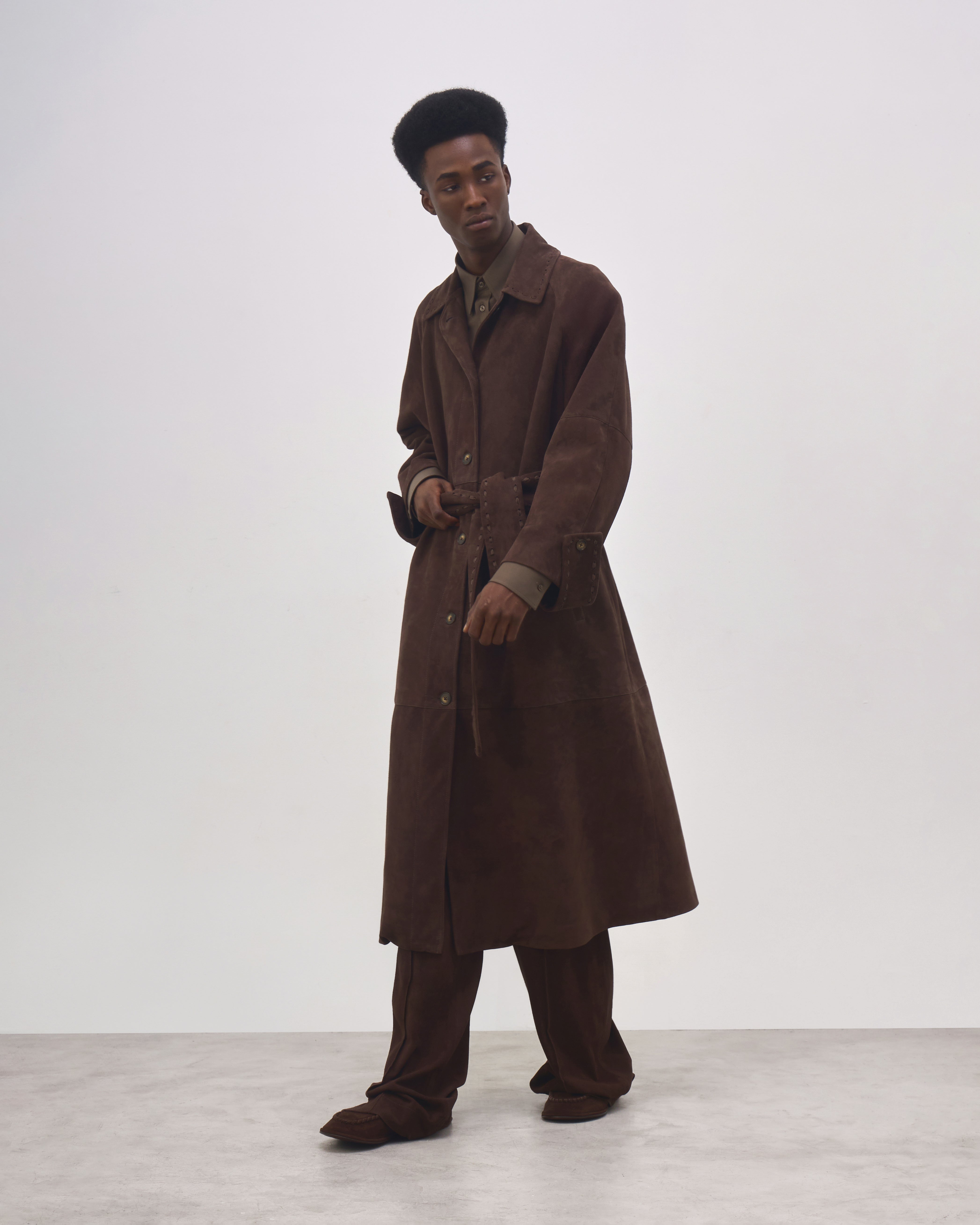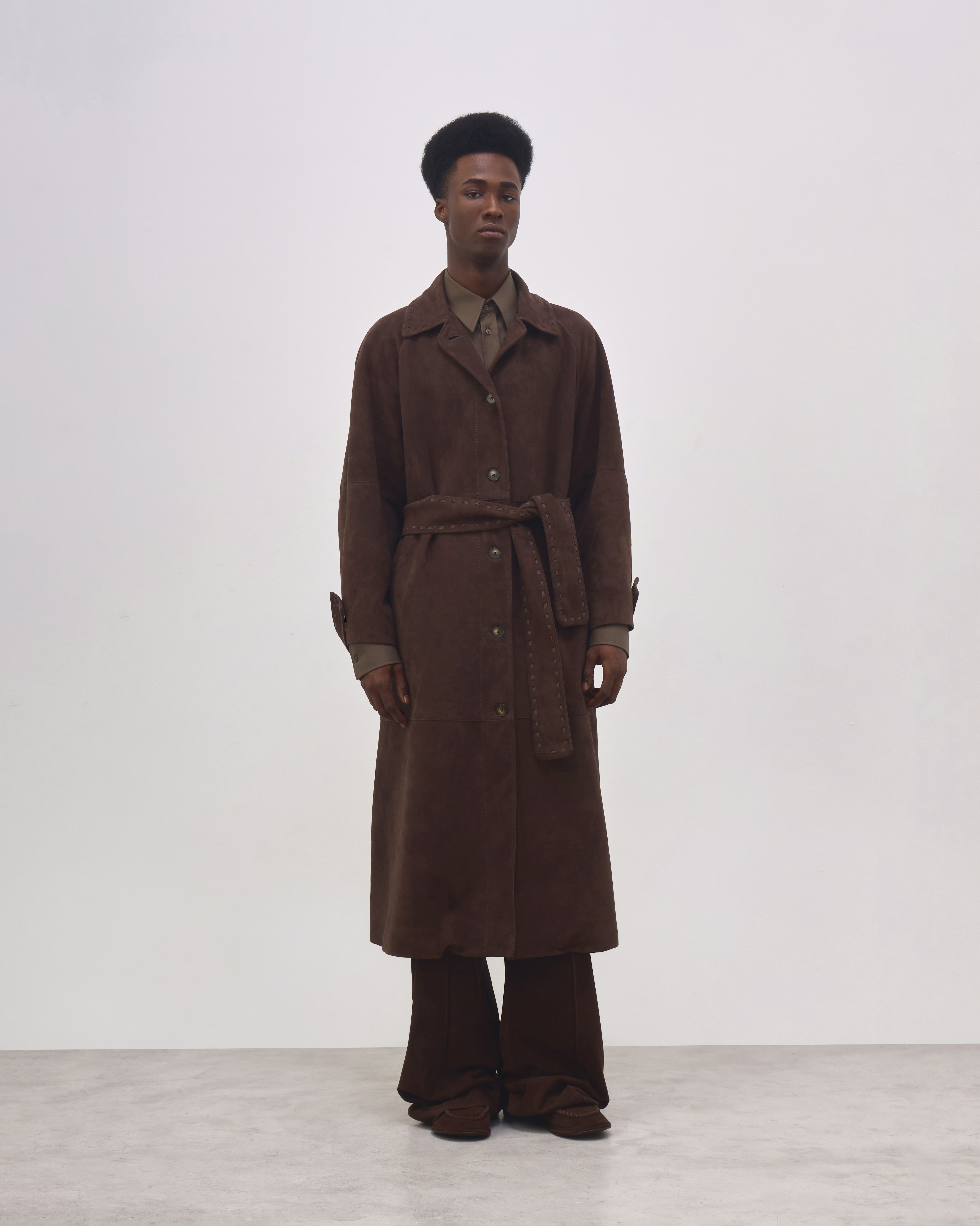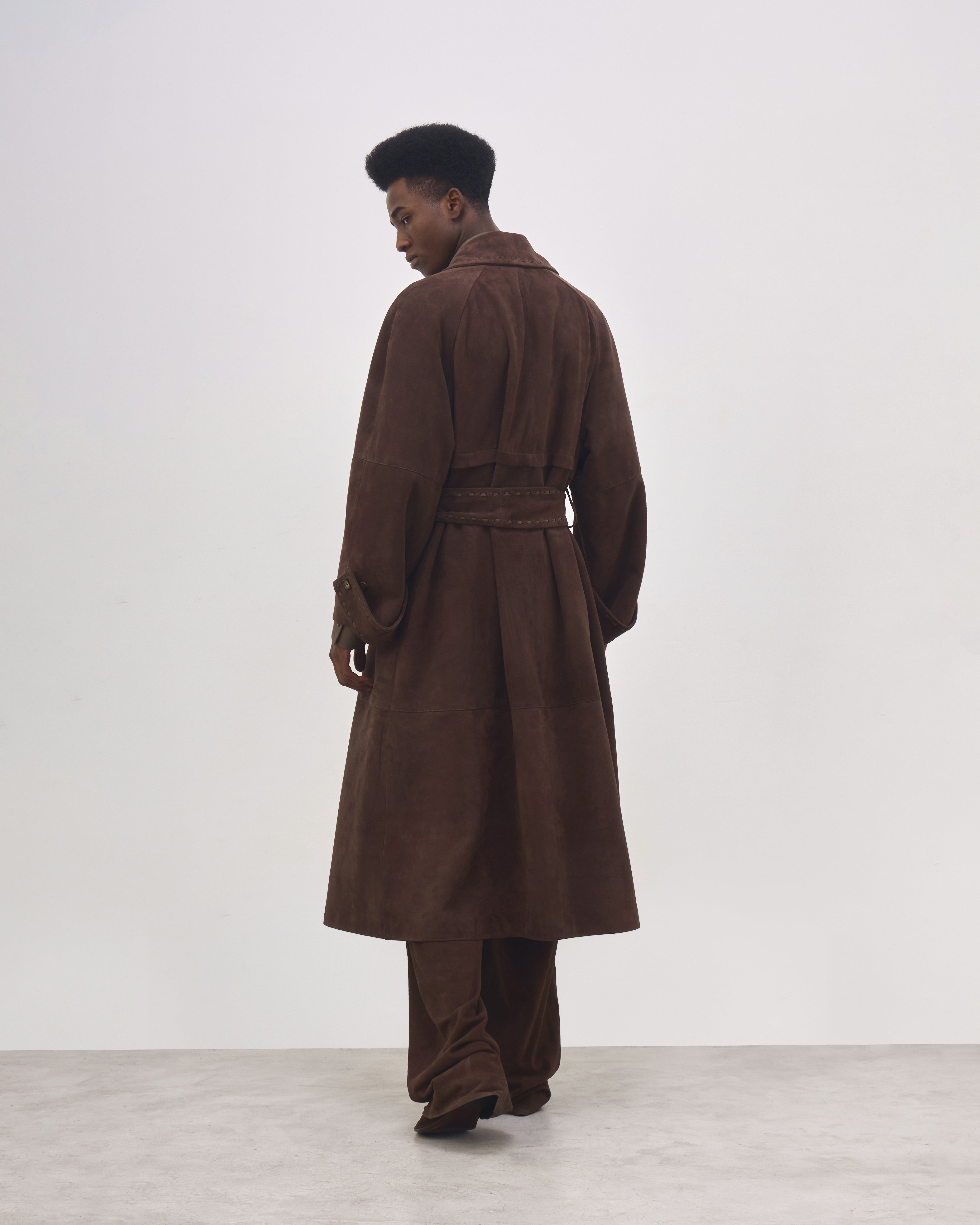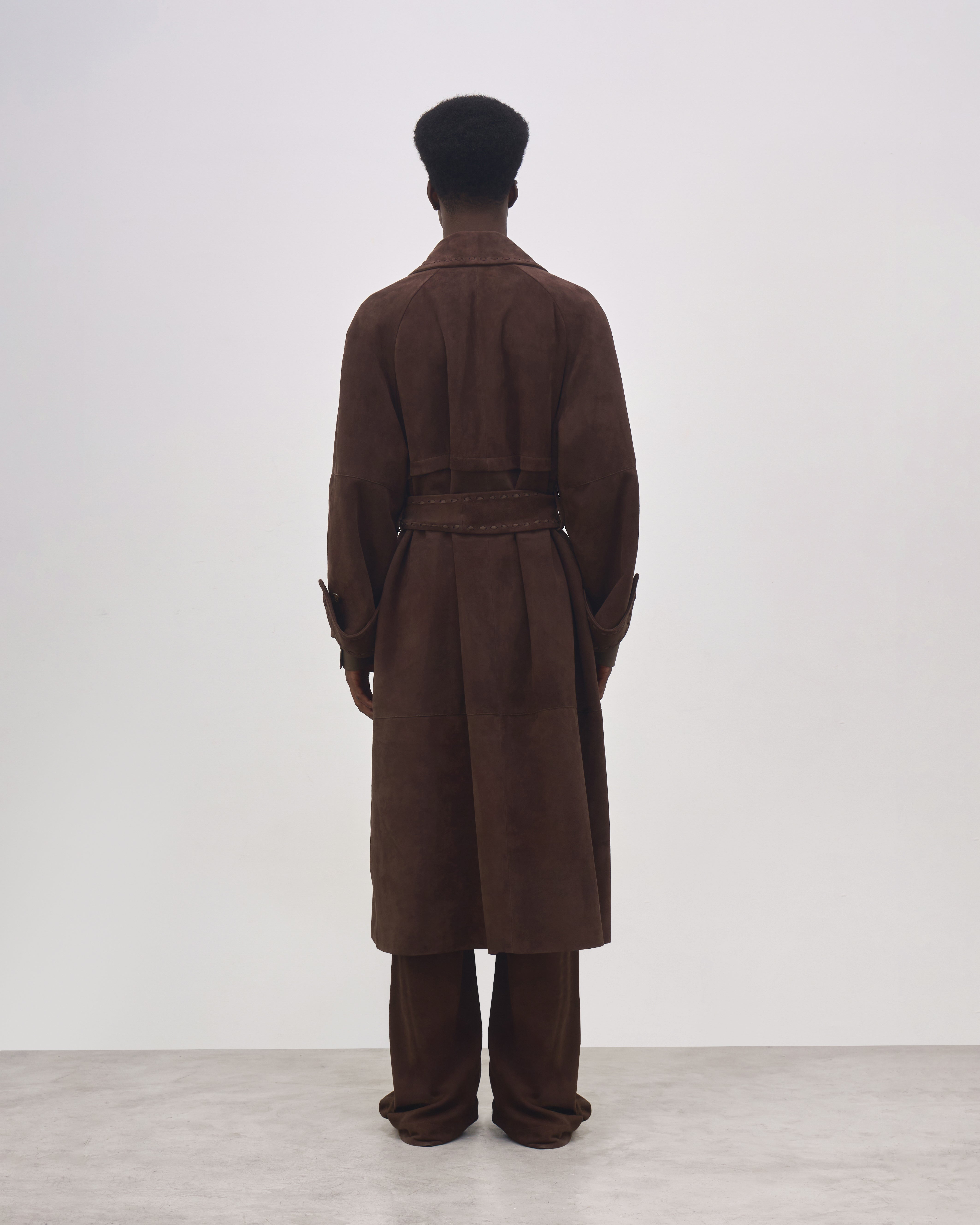 O Trench Cassio é confeccionado em camurça, possui caimento reto, colarinho, fechamento frontal por botões, cintura com passantes nas laterais, cinto do mesmo tecido, mangas longas com martigales nos punhos, dois bolsos frontais embutidos, forro embutido e acabamento pespontado.