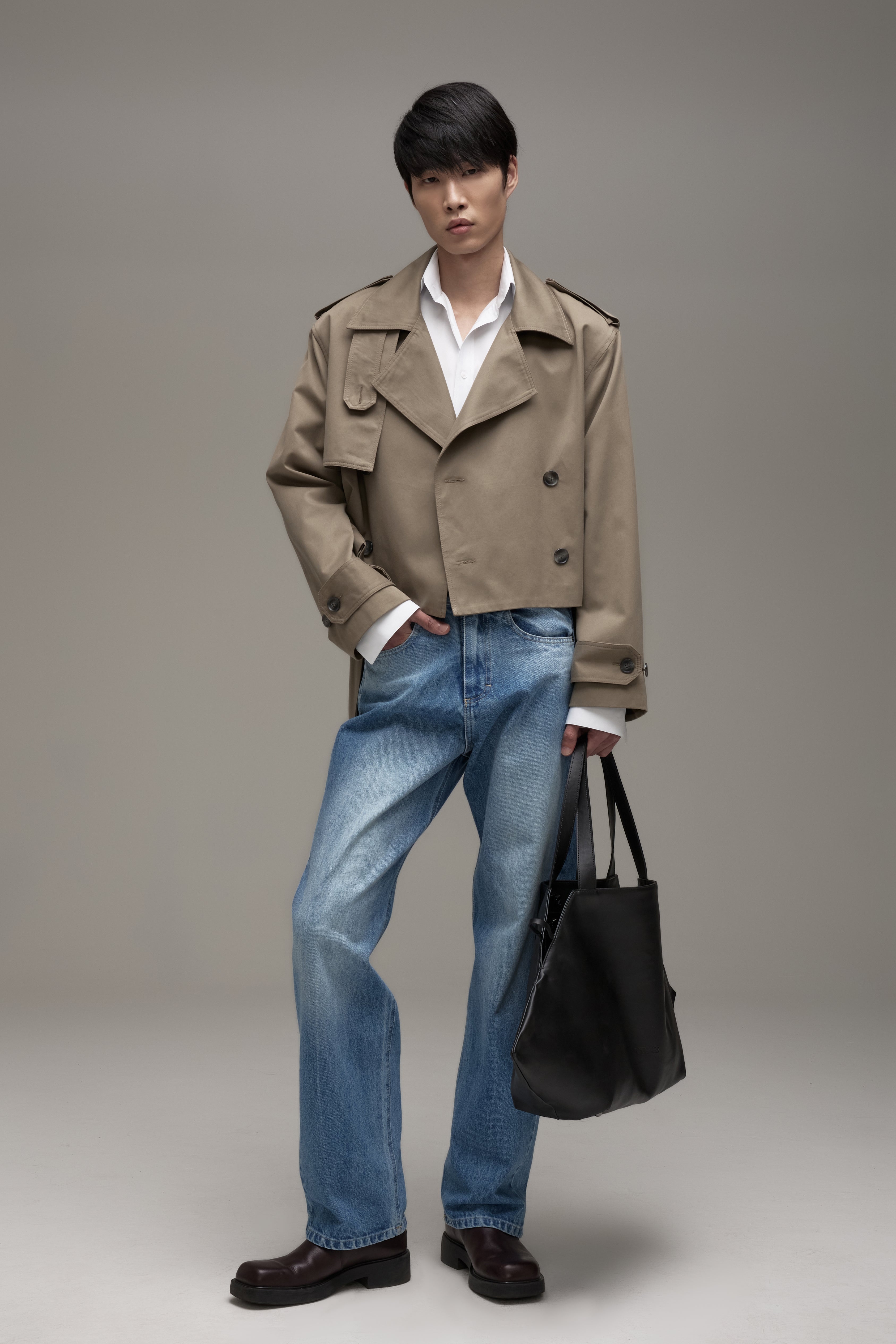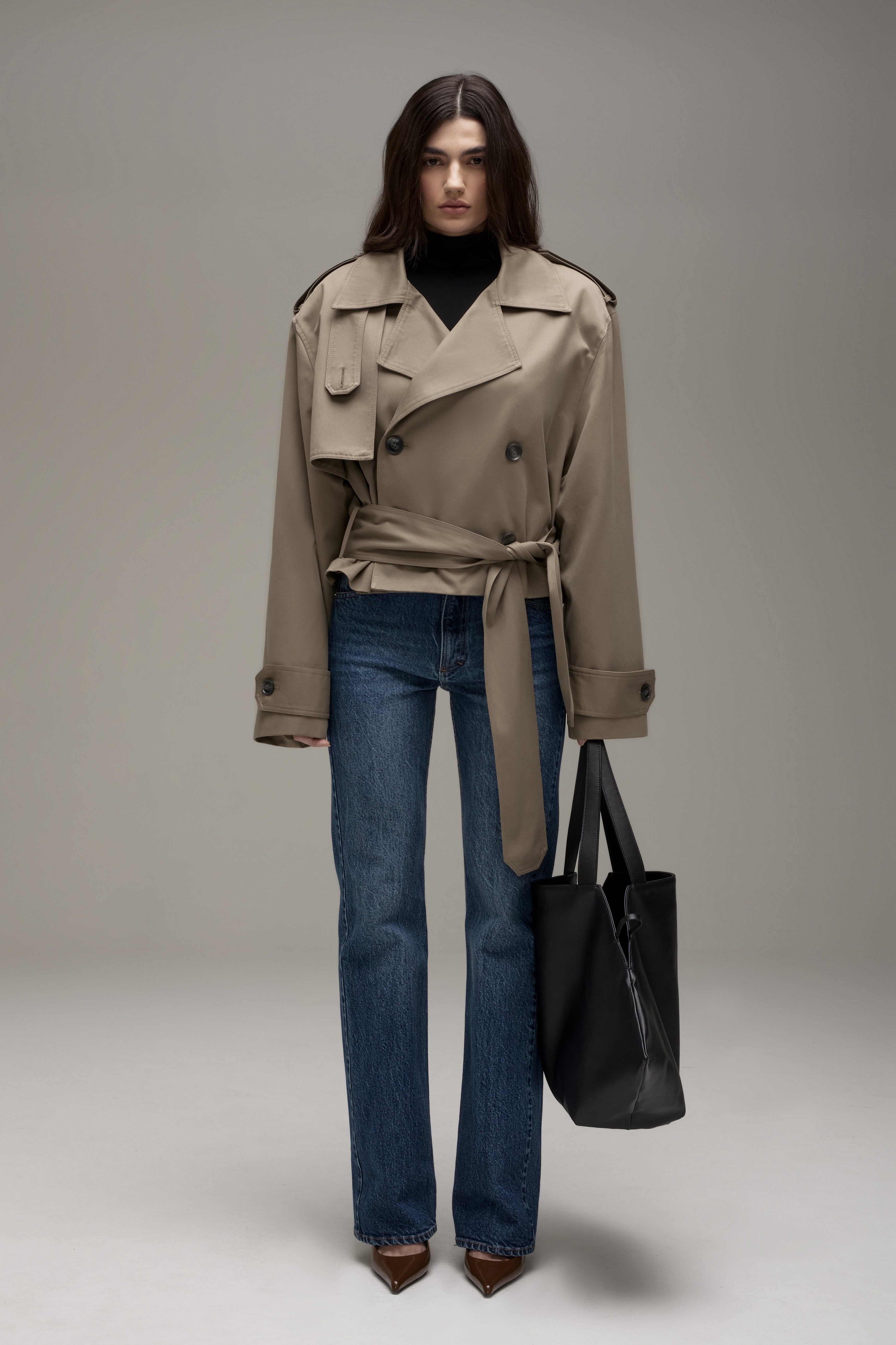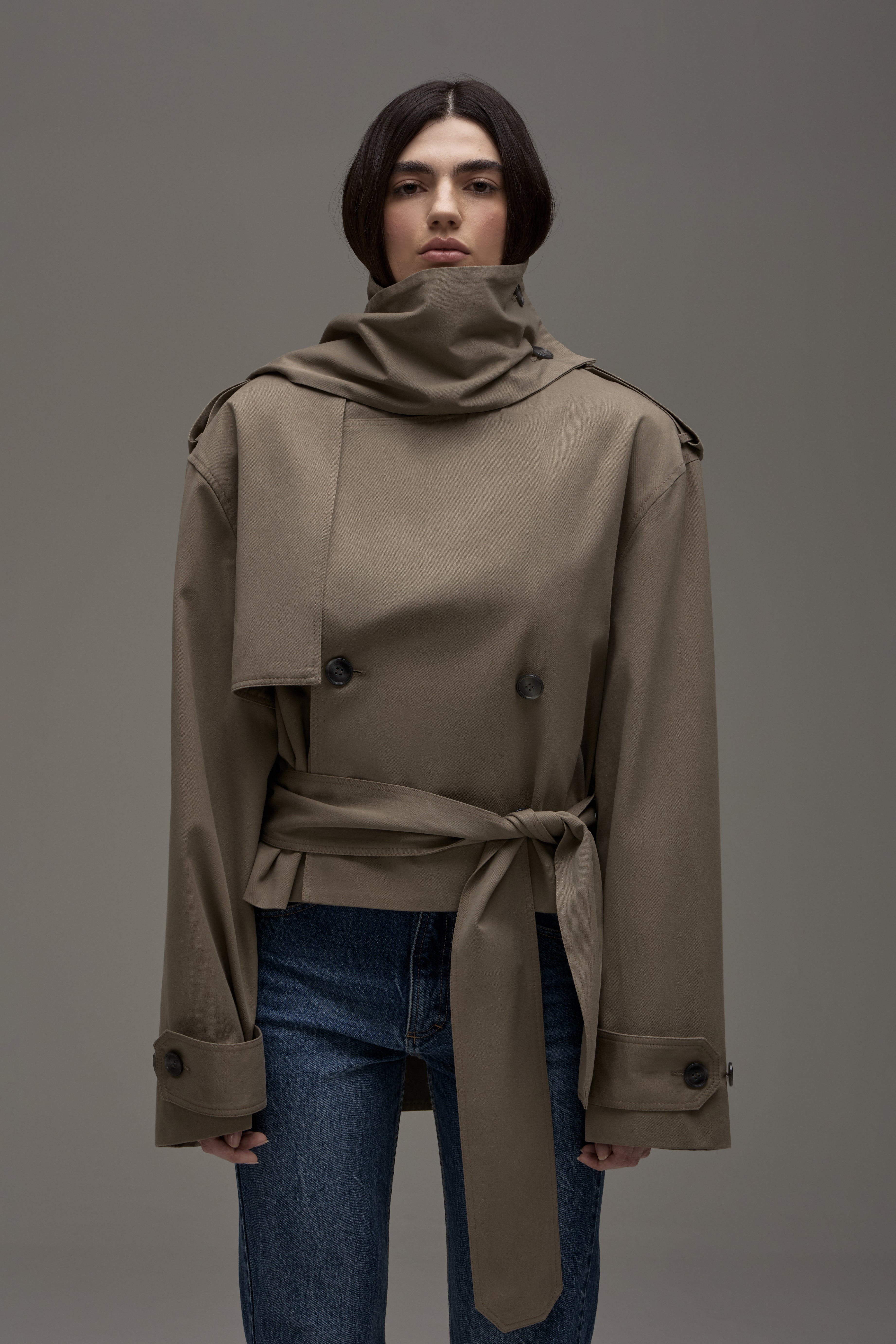 O Trench Coat é confeccionado em tecido plano, possui modelagem boxy, ombros com martingales, fechamento frontal por botões, mangas longas com martingales nos punhos, cintura com cinto para amarração do mesmo tecido, forro embutido e acabamento pespontado.