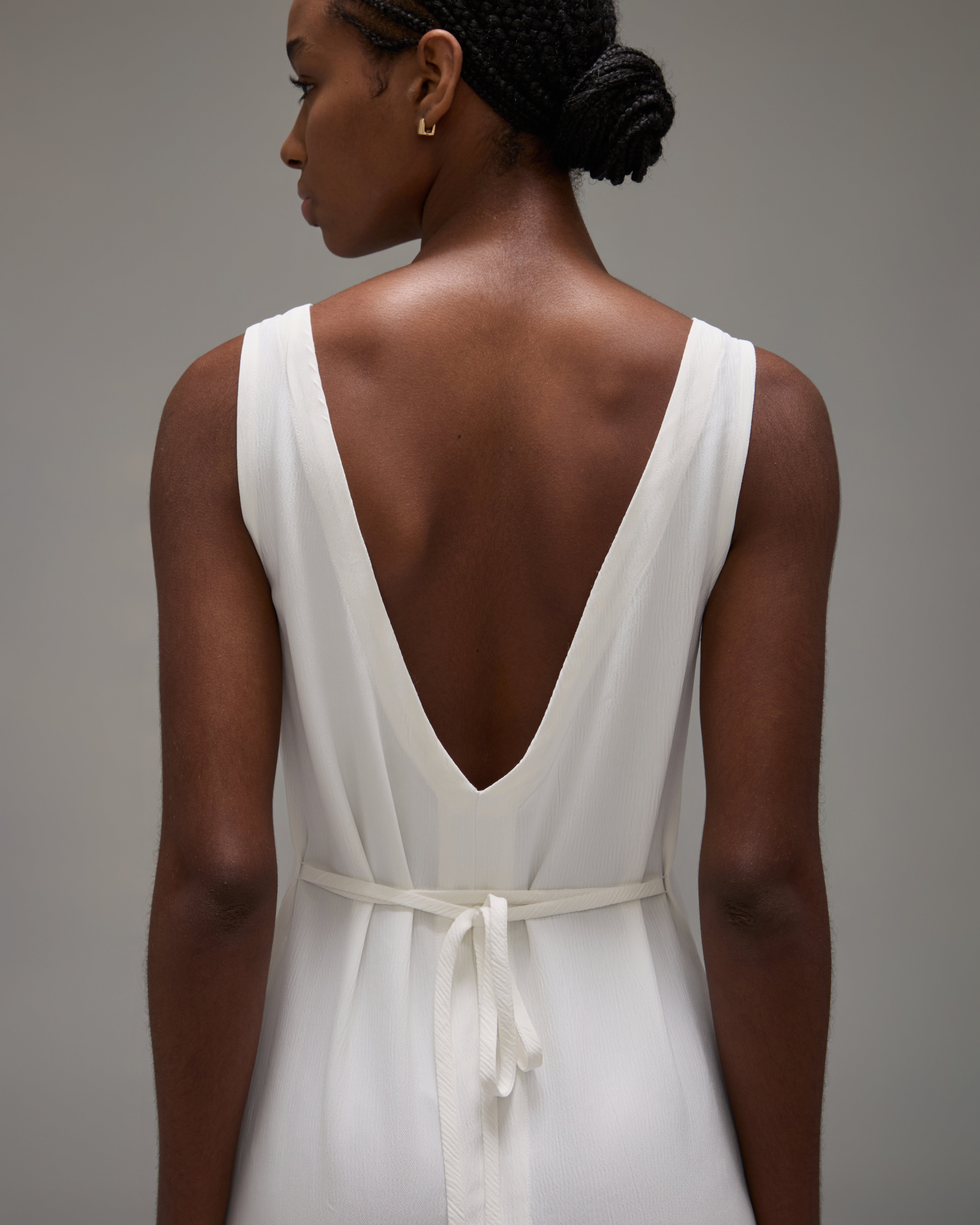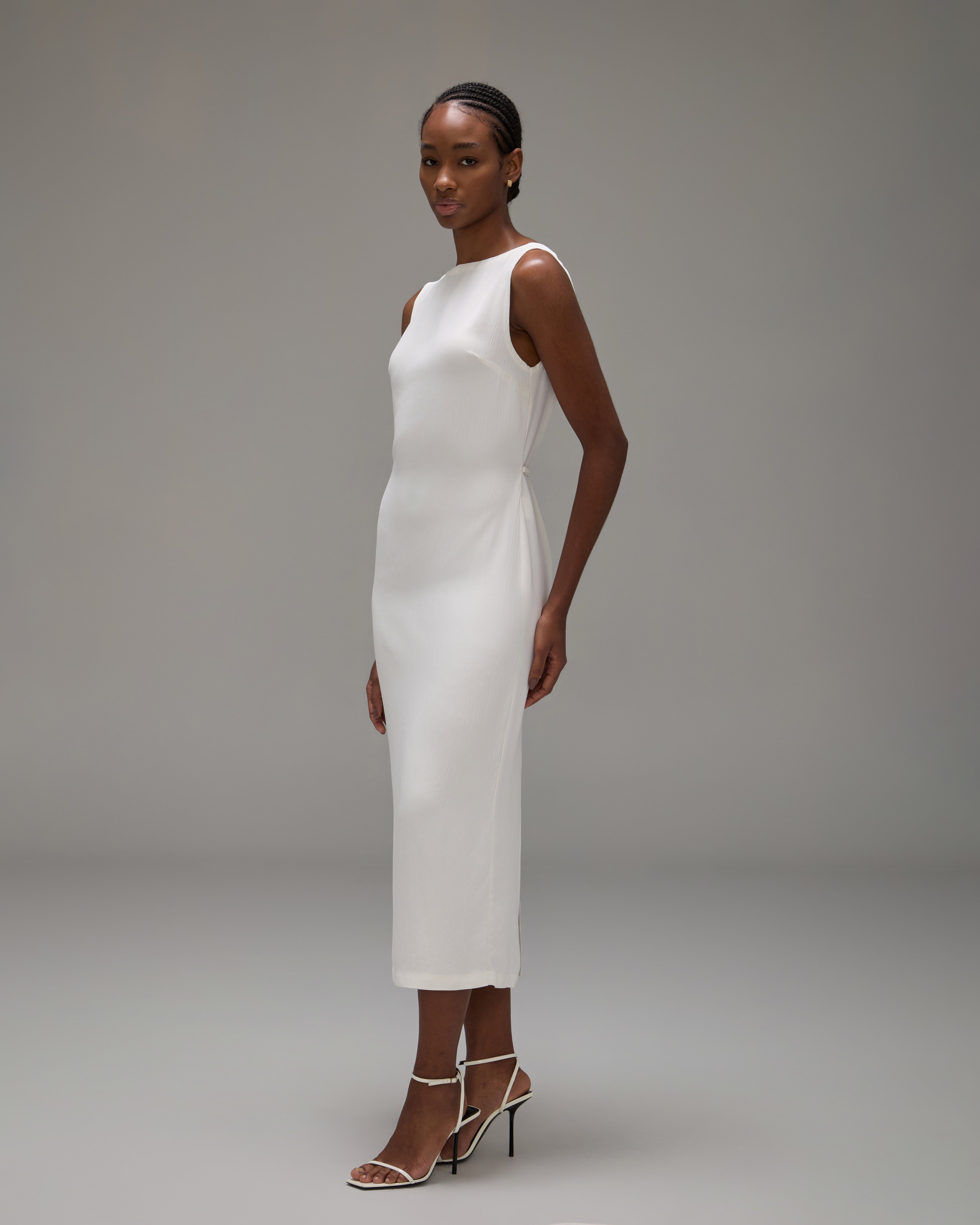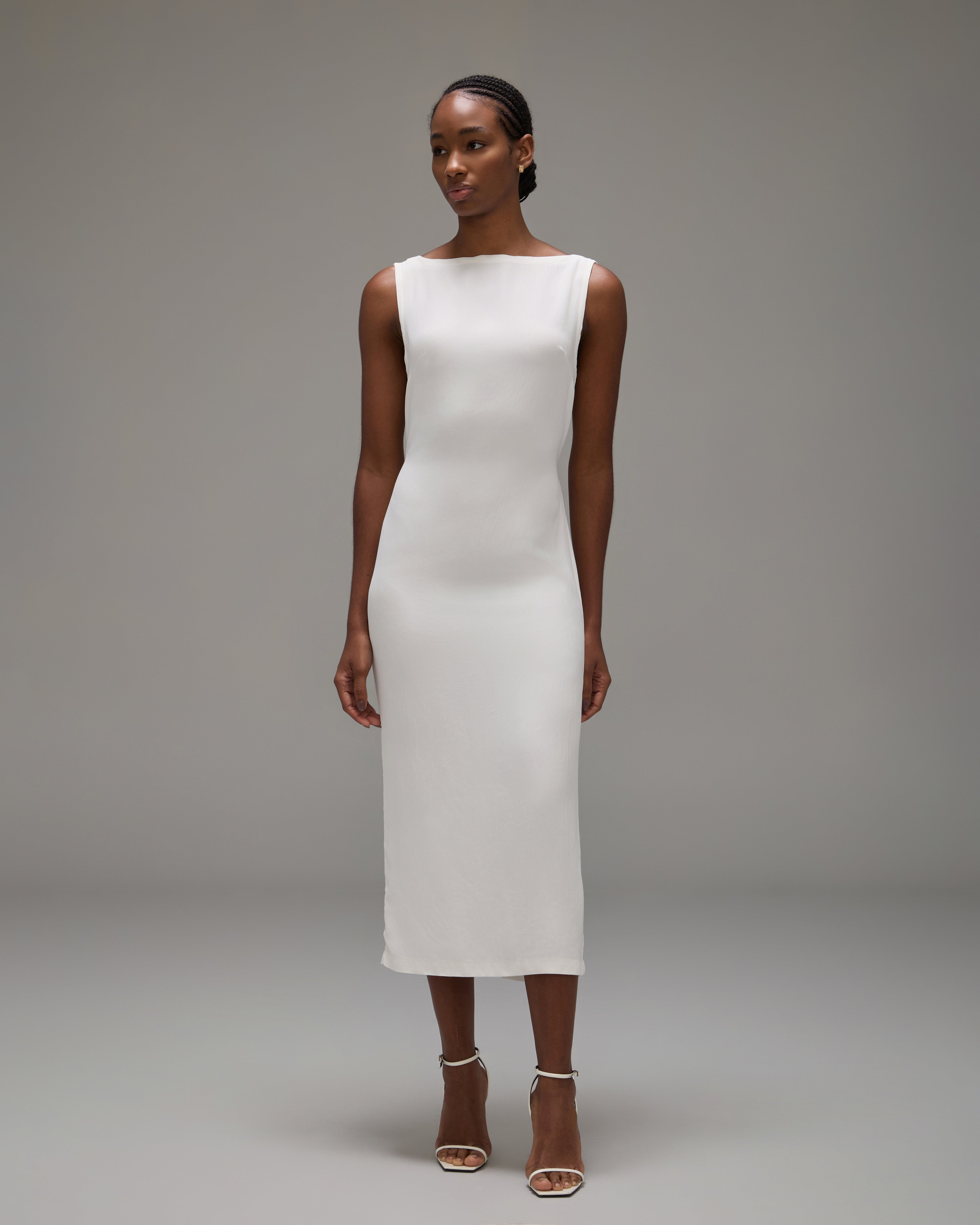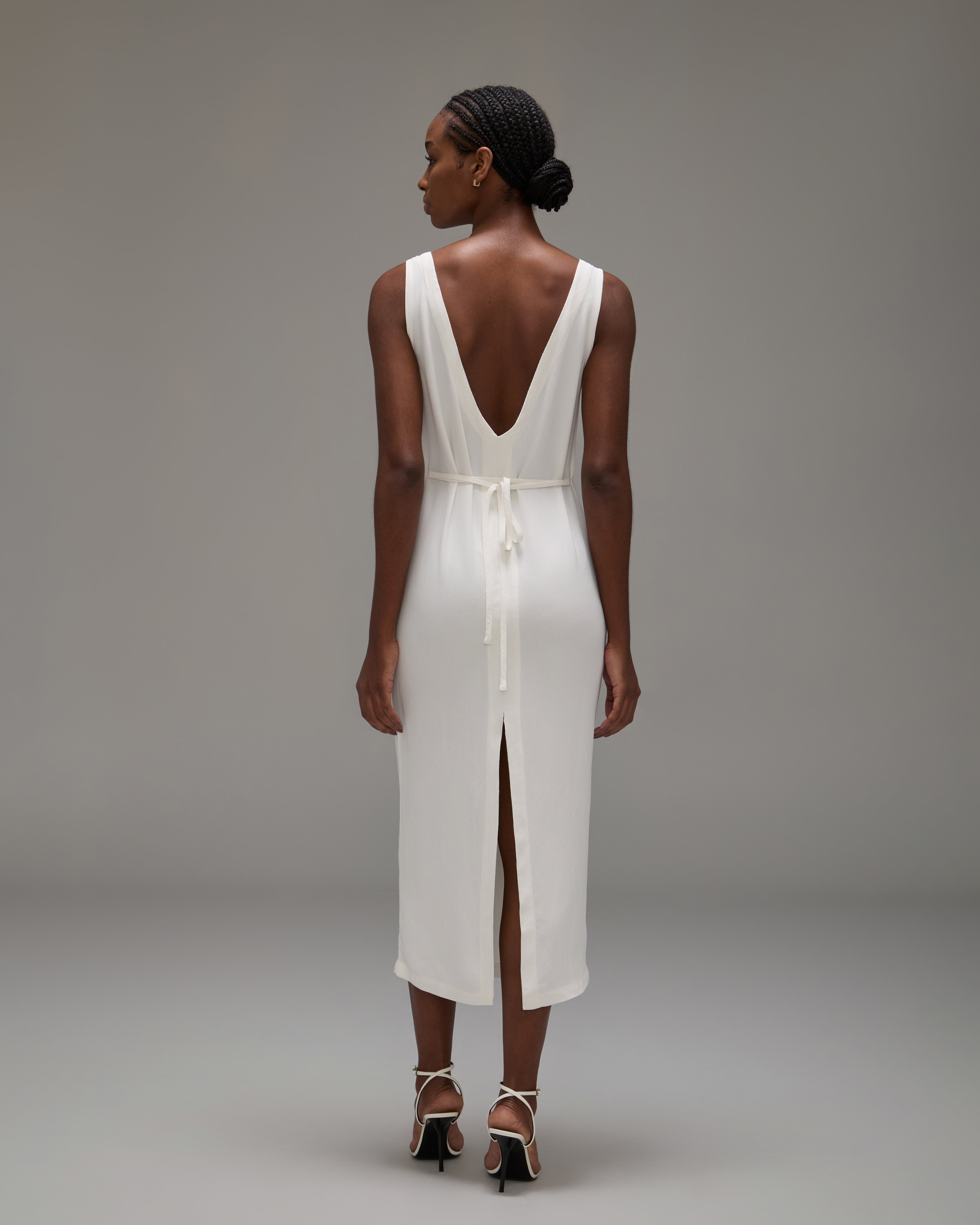 O Vestido Brisa é confeccionado em crepe texturizado, gola canoa, alças médias, recorte vazado posterior em "V", rolotê posterior para acinturar o vestido, revel na fenda posterior e comprimento midi.