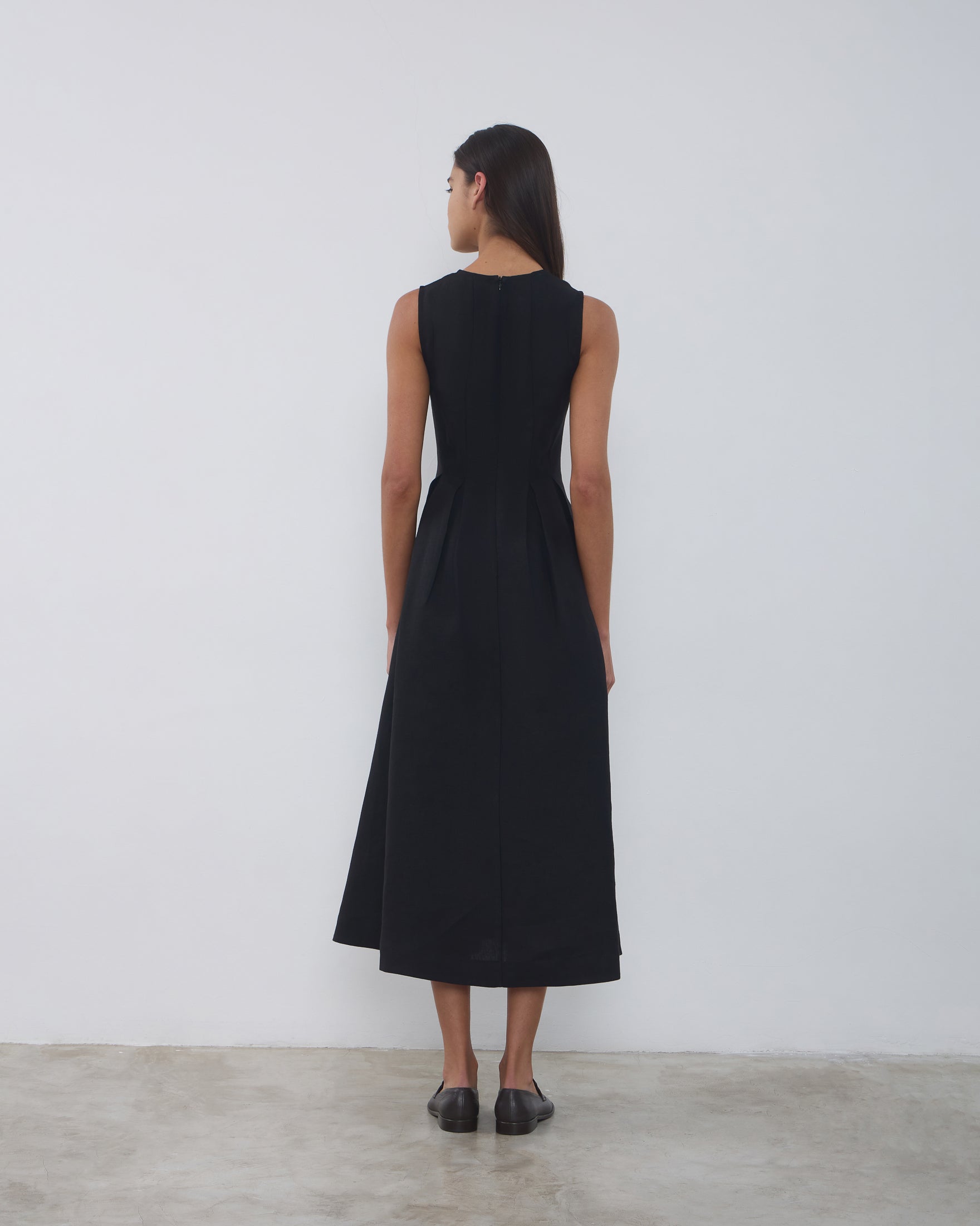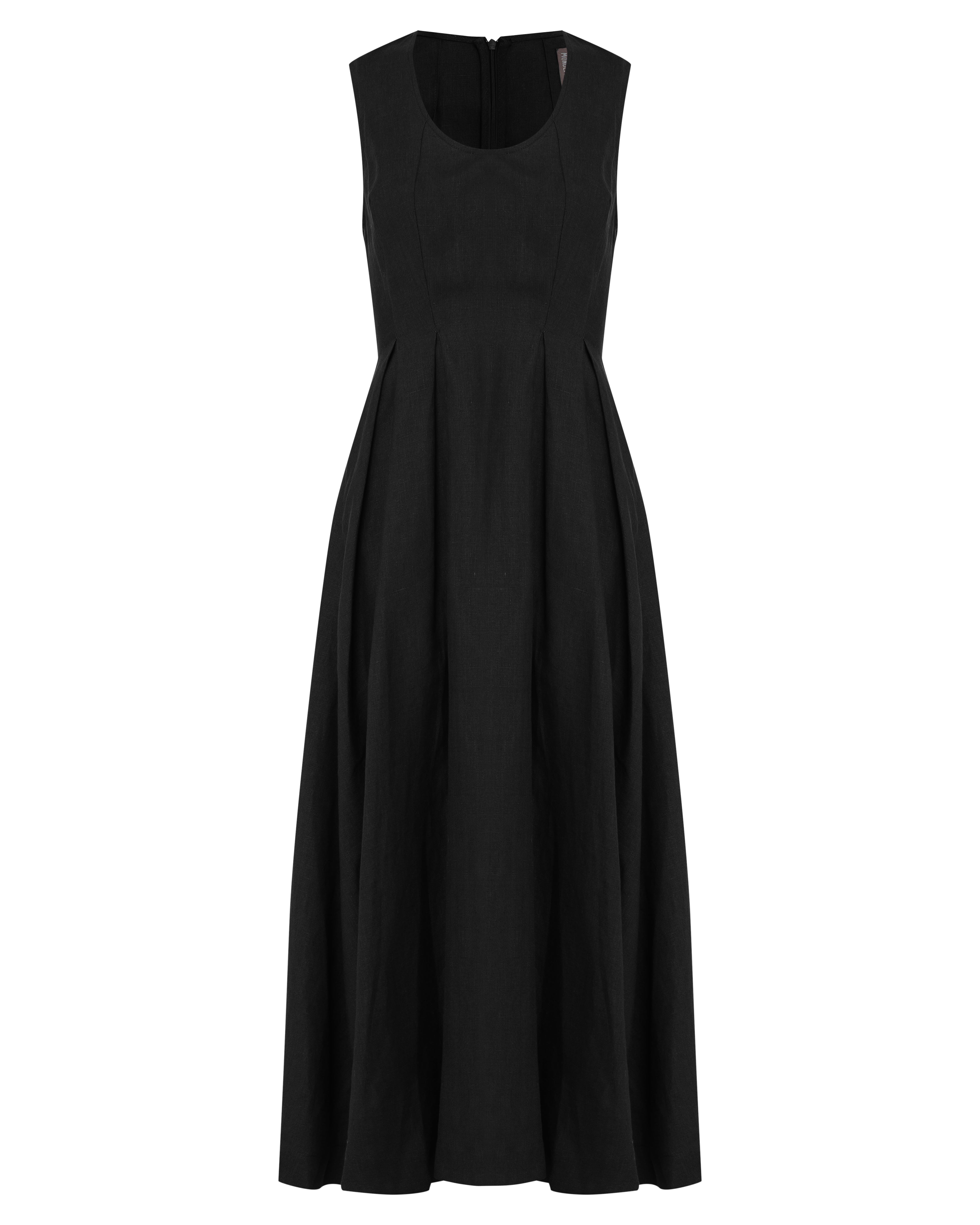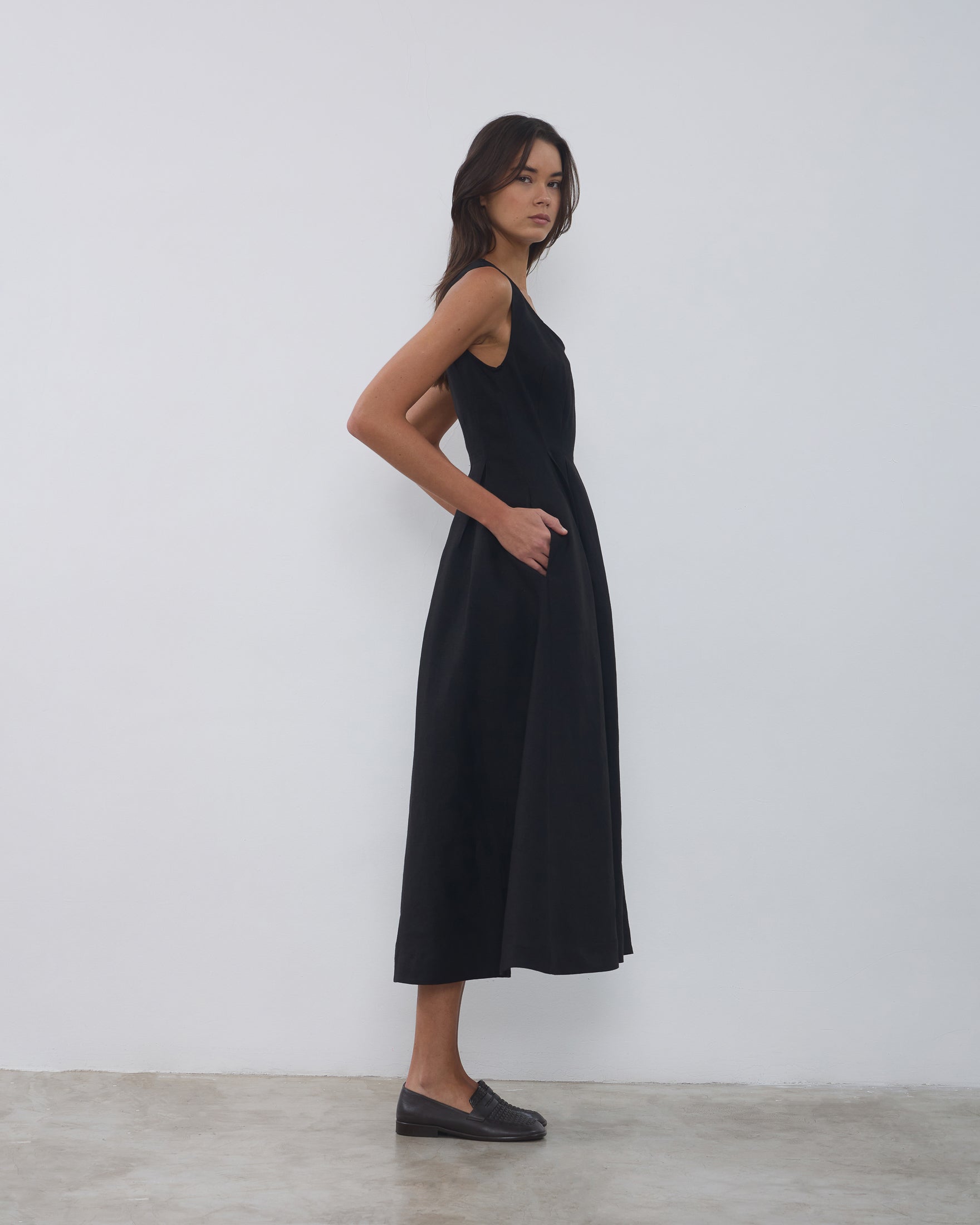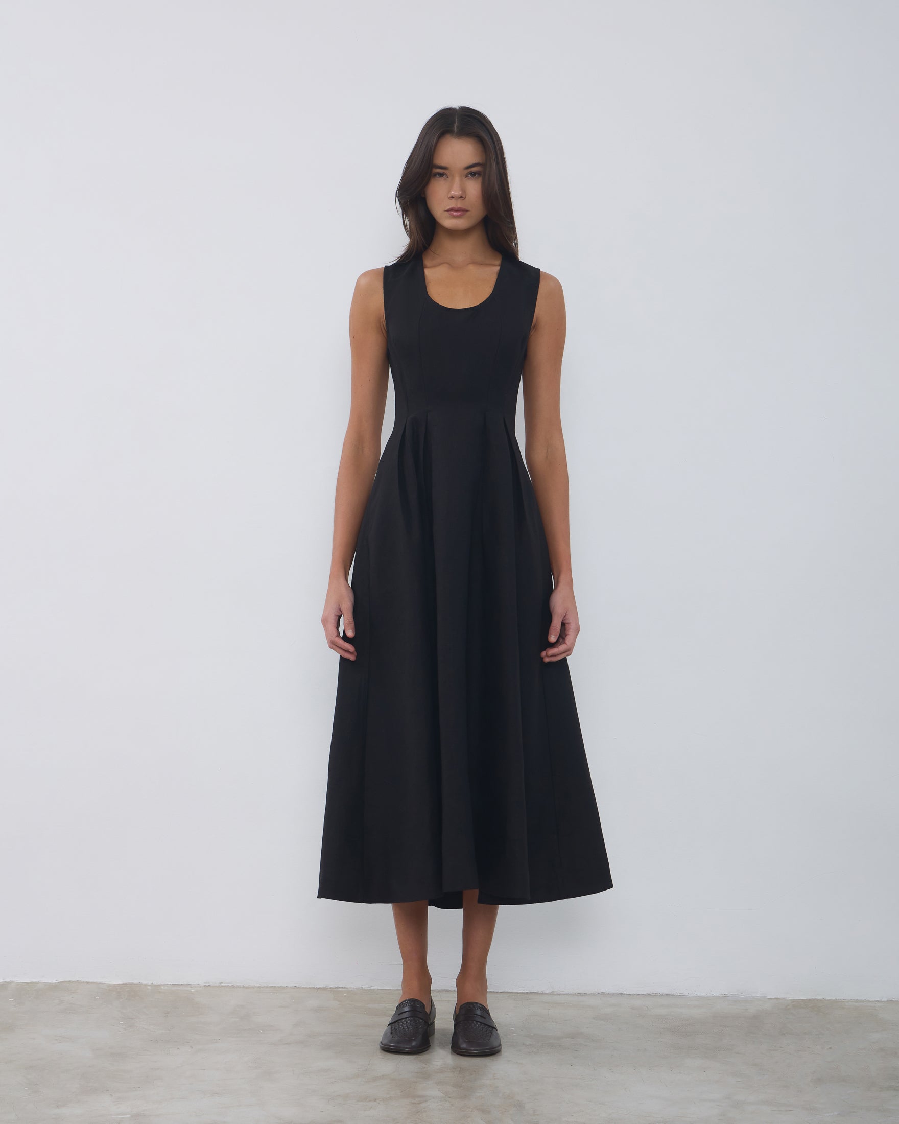O Vestido Luzia é confeccionado em linho estruturado, possui modelagem em evasê, caimento acinturado, decote em "U", alças médias, pregas na saia, bolsos nas laterais, fechamento posterior por zíper e comprimento midi.
