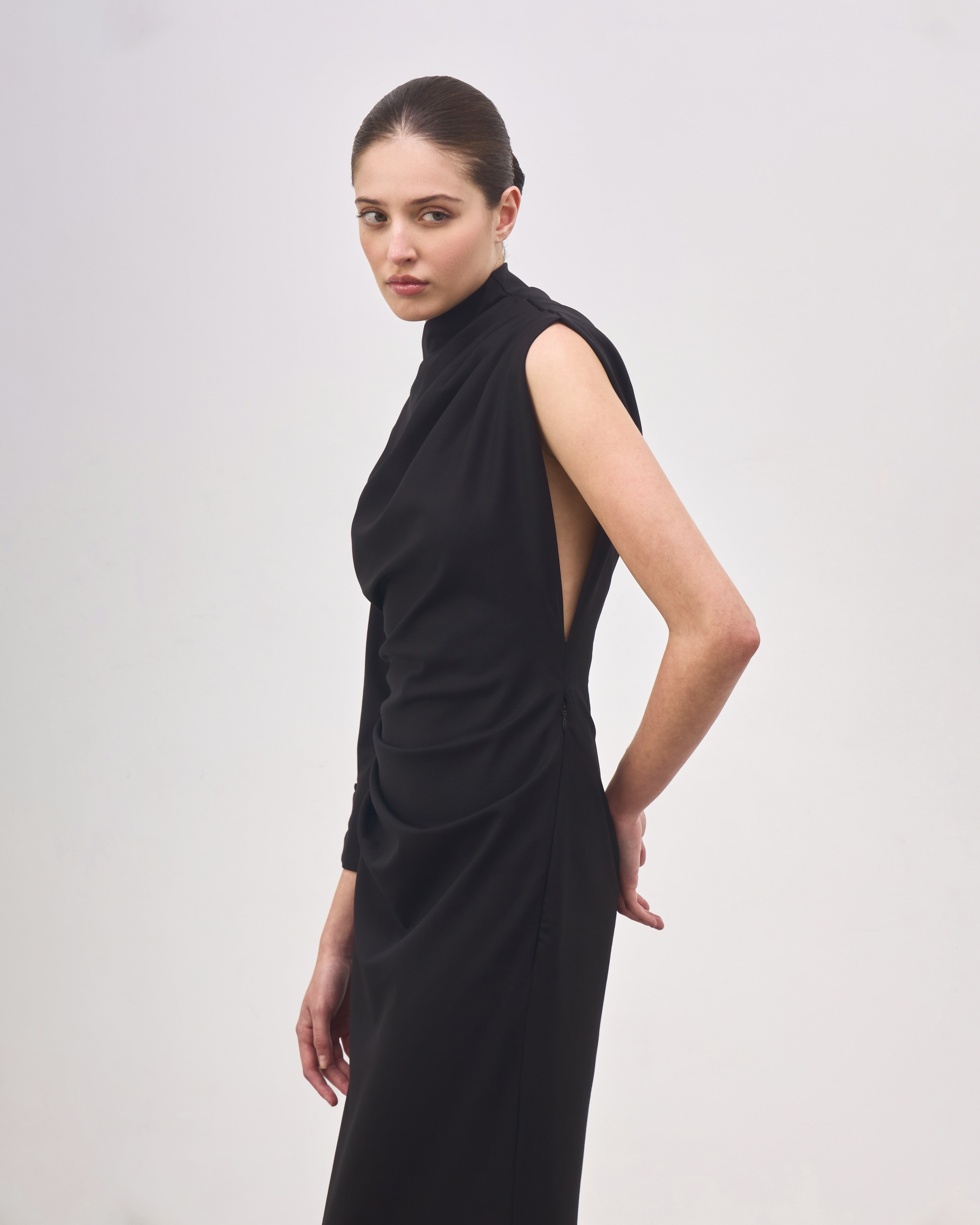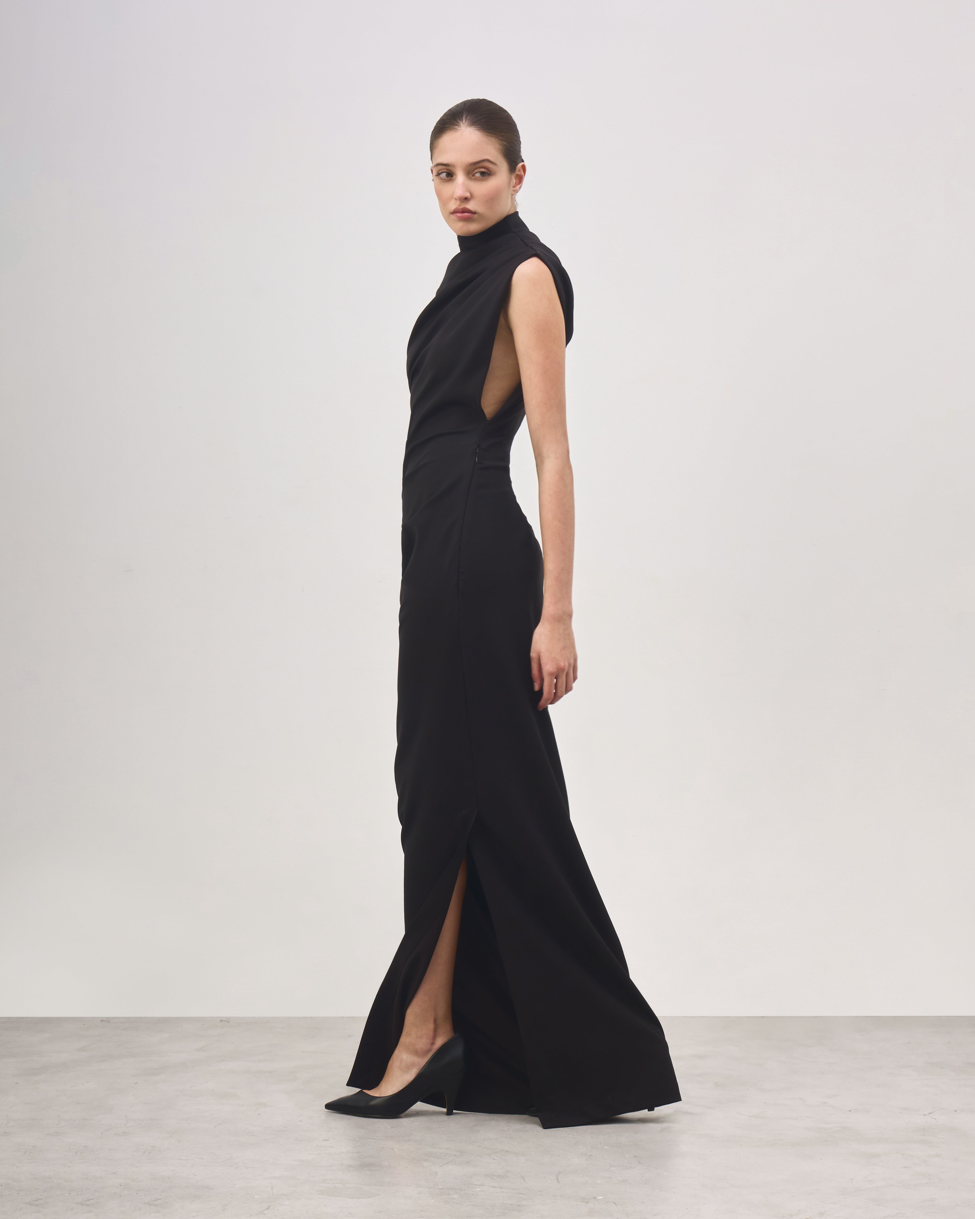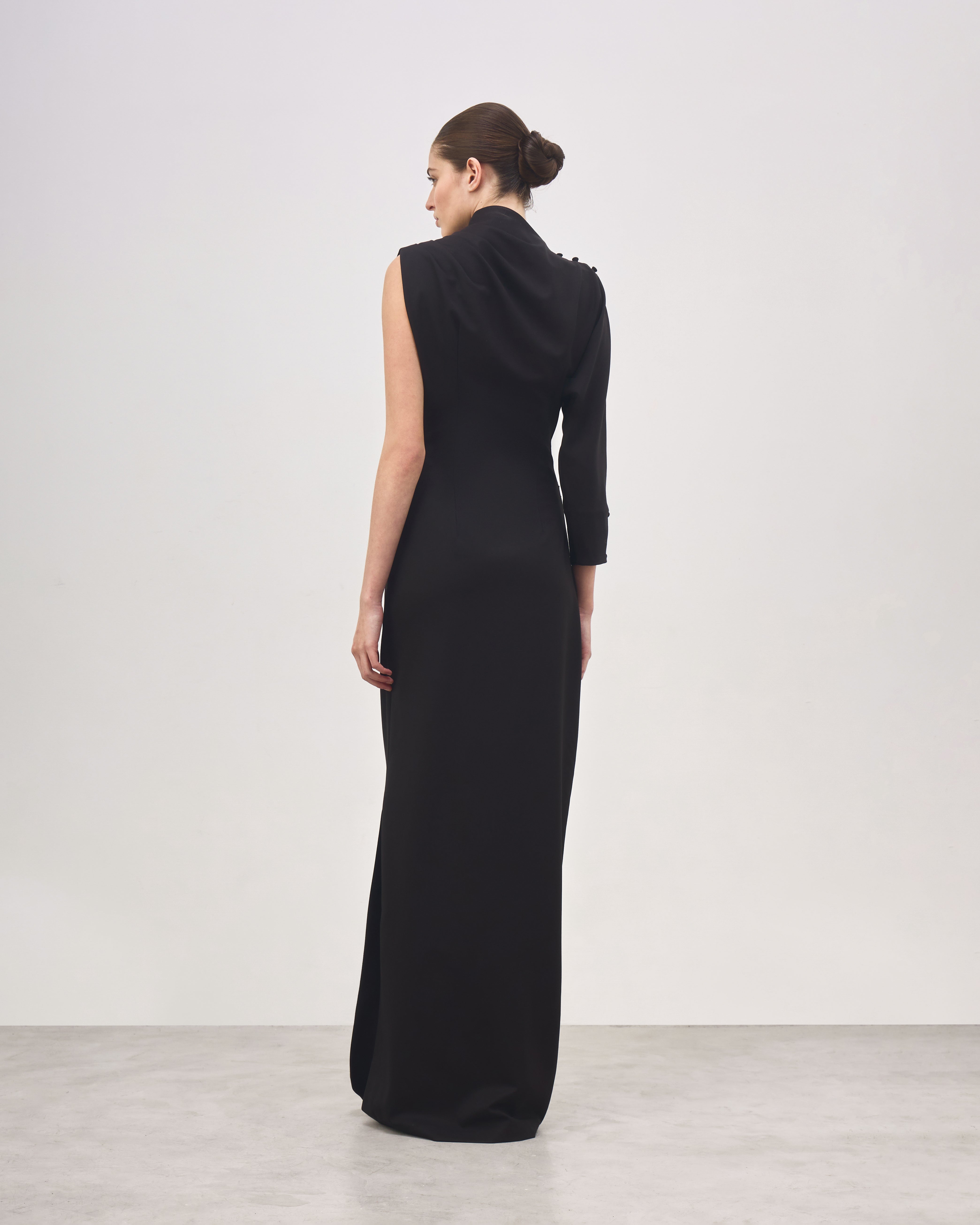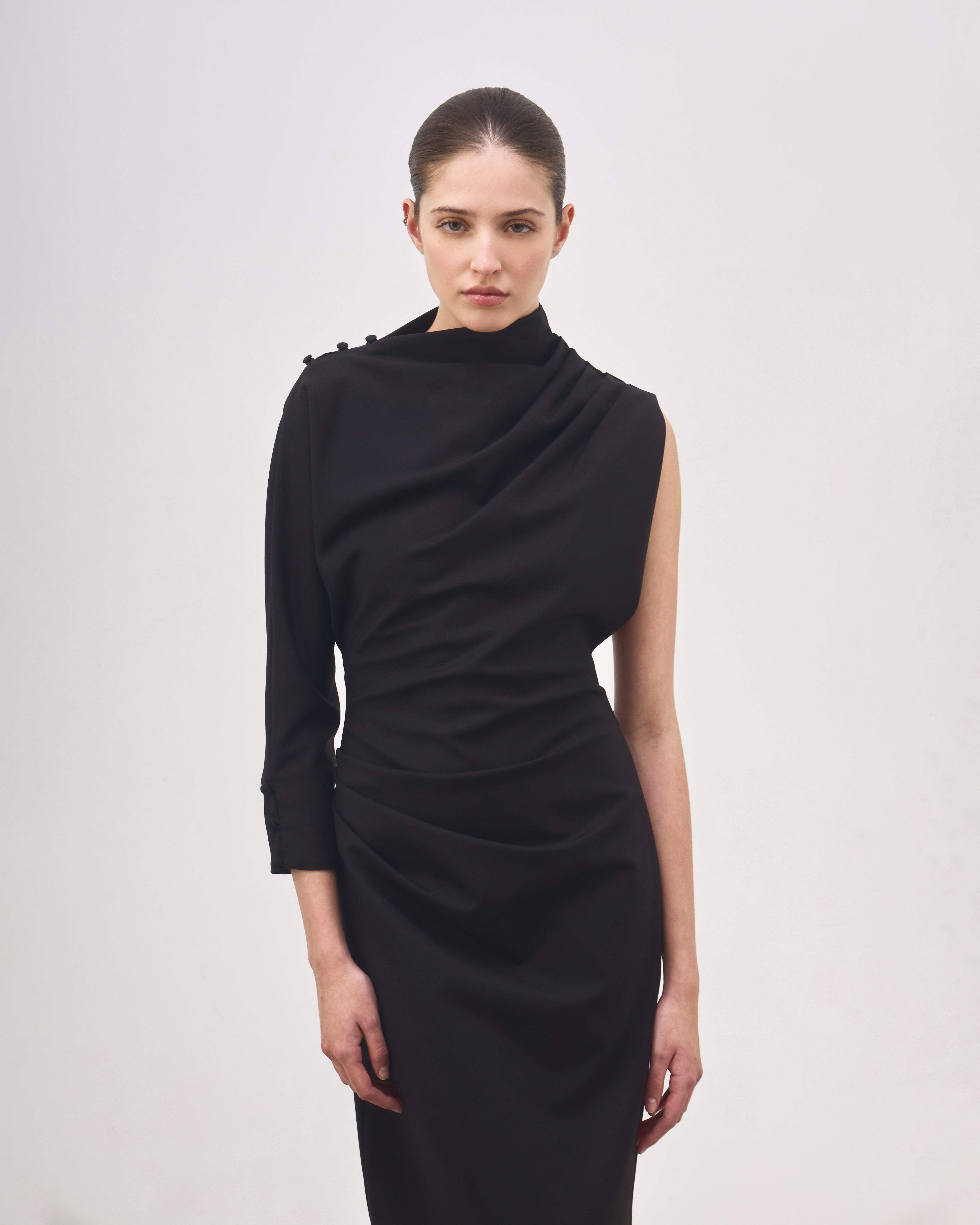 O Vestido Odette é confeccionado em tecido de alfaiataria, possui caimento acinturado, gola drapeada, busto blusado, fechamento por botões revestidos nos ombros, manga 3/4 assimétrica com fechamento por botões revestidos, fenda na lateral e comprimento longo.