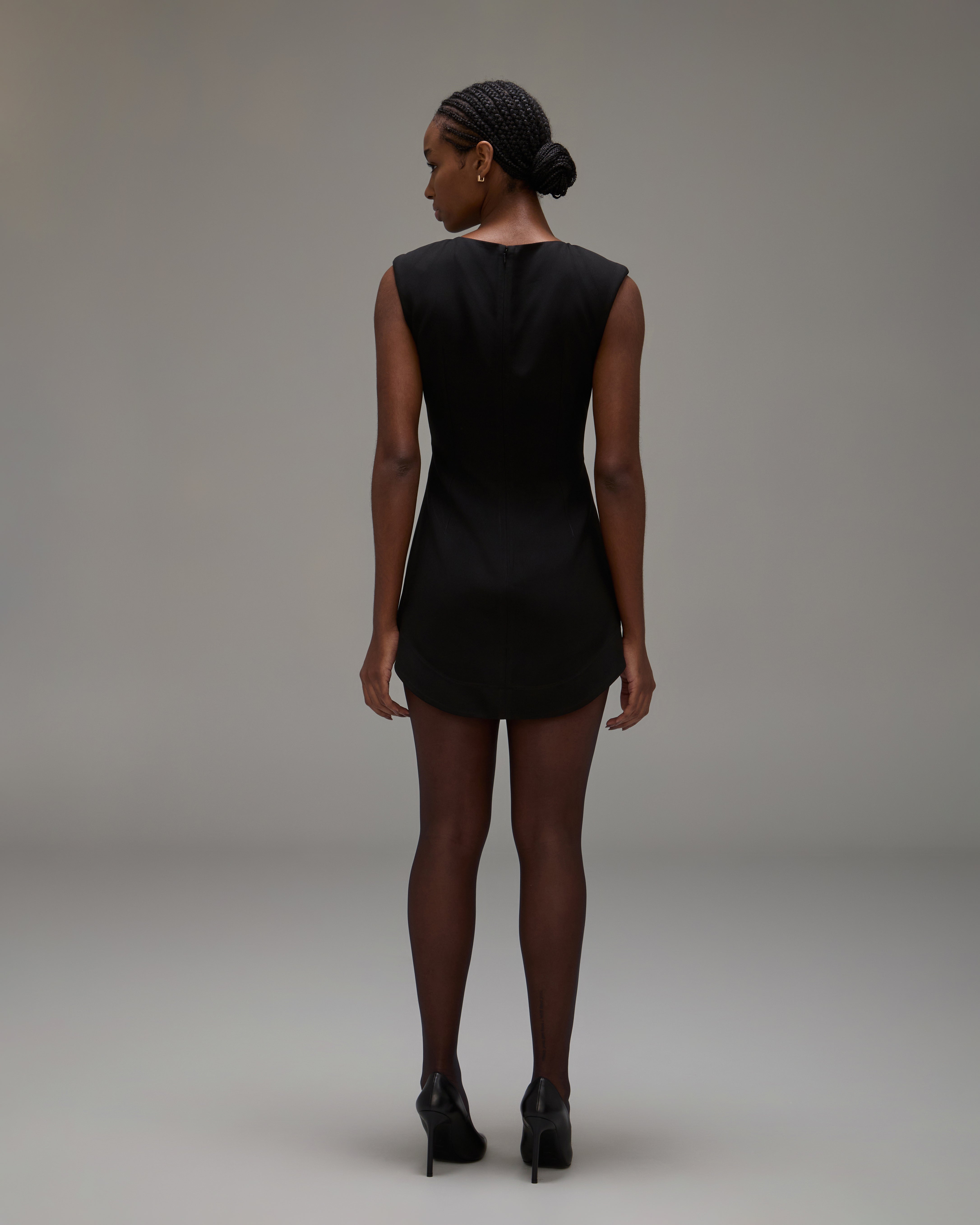 O Vestido Sienna é confeccionado em crepe estruturado, possui caimento acinturado, gola canoa, mangas largas, leves ombreiras, fechamento posterior por zíper, barra curva, comprimento curto e acabamento interno com forro de alfaiataria.