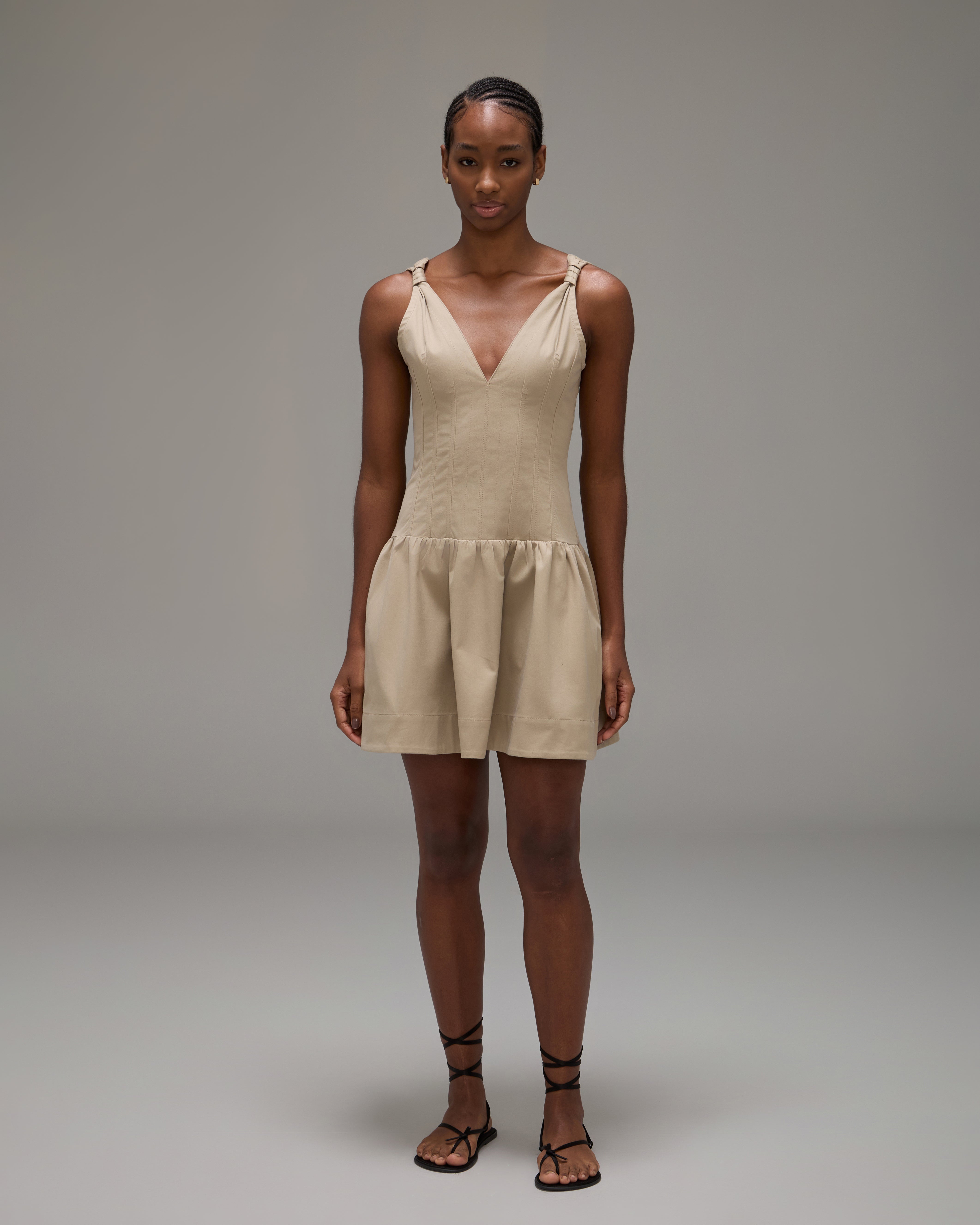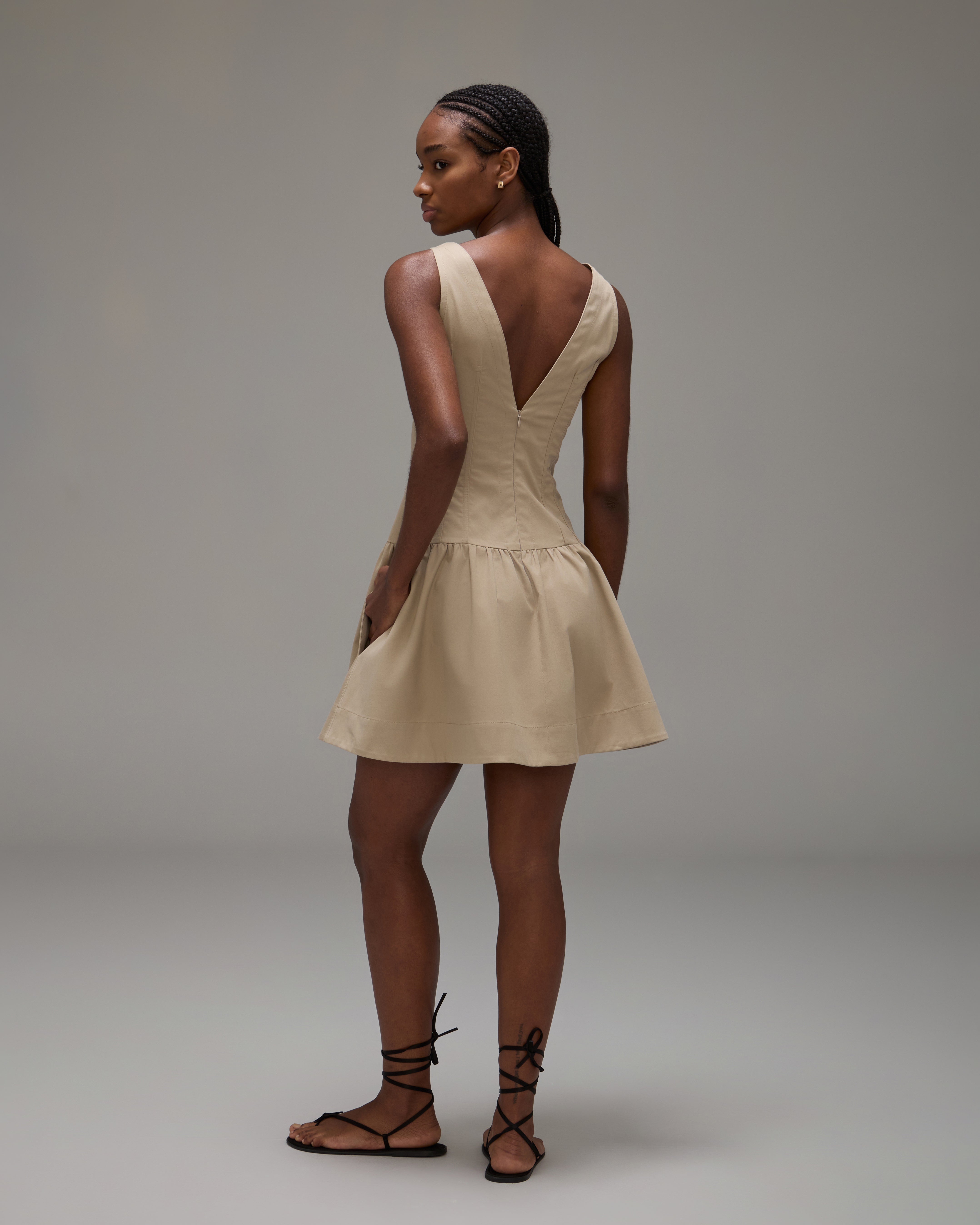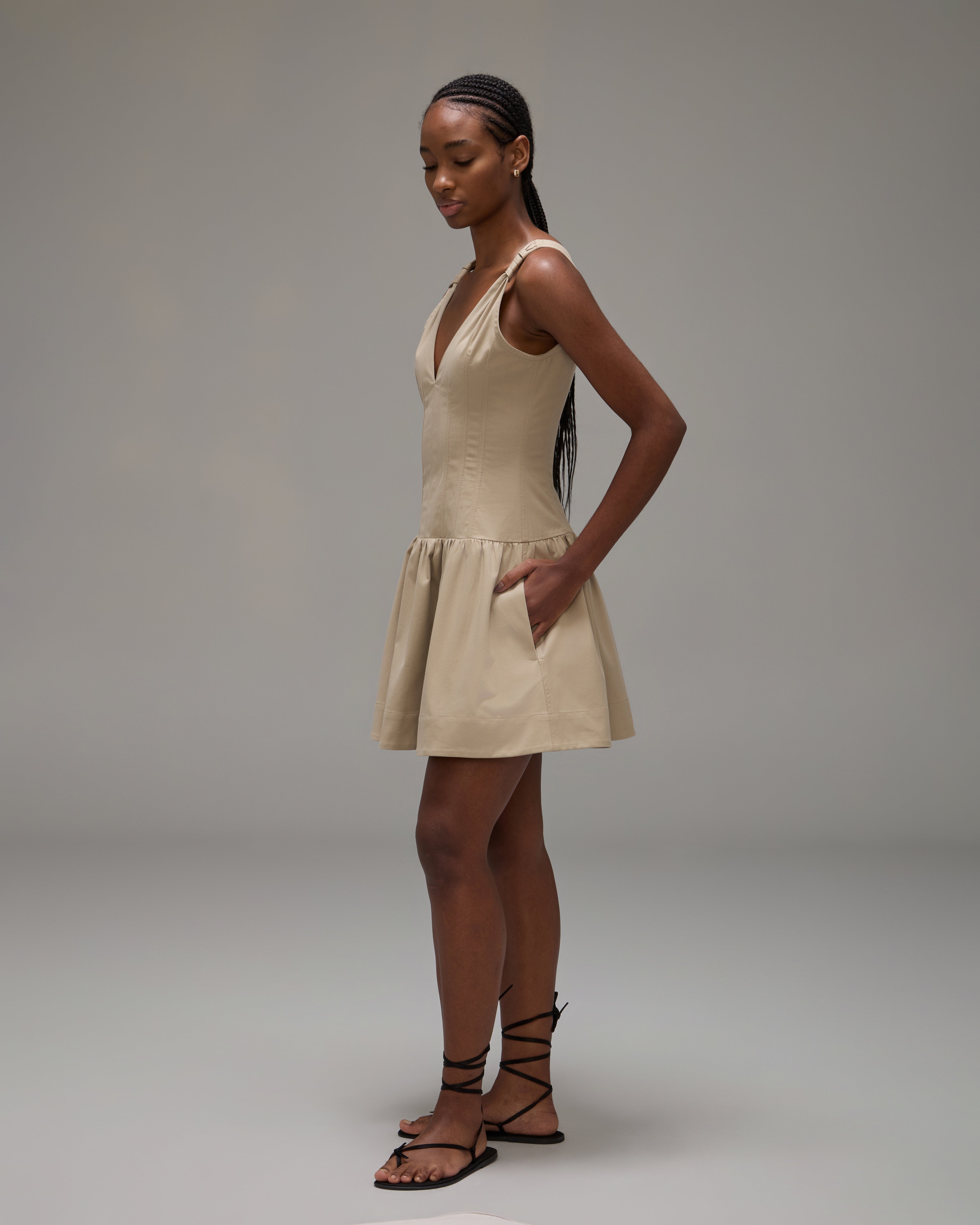 O Vestido Sofi é confeccionado em algodão de peso médio, possui modelagem evasê, decote em "V", alças médias, detalhes de corset, bolsos laterais, fechamento por zíper posterior, saia com babados e comprimento curto.