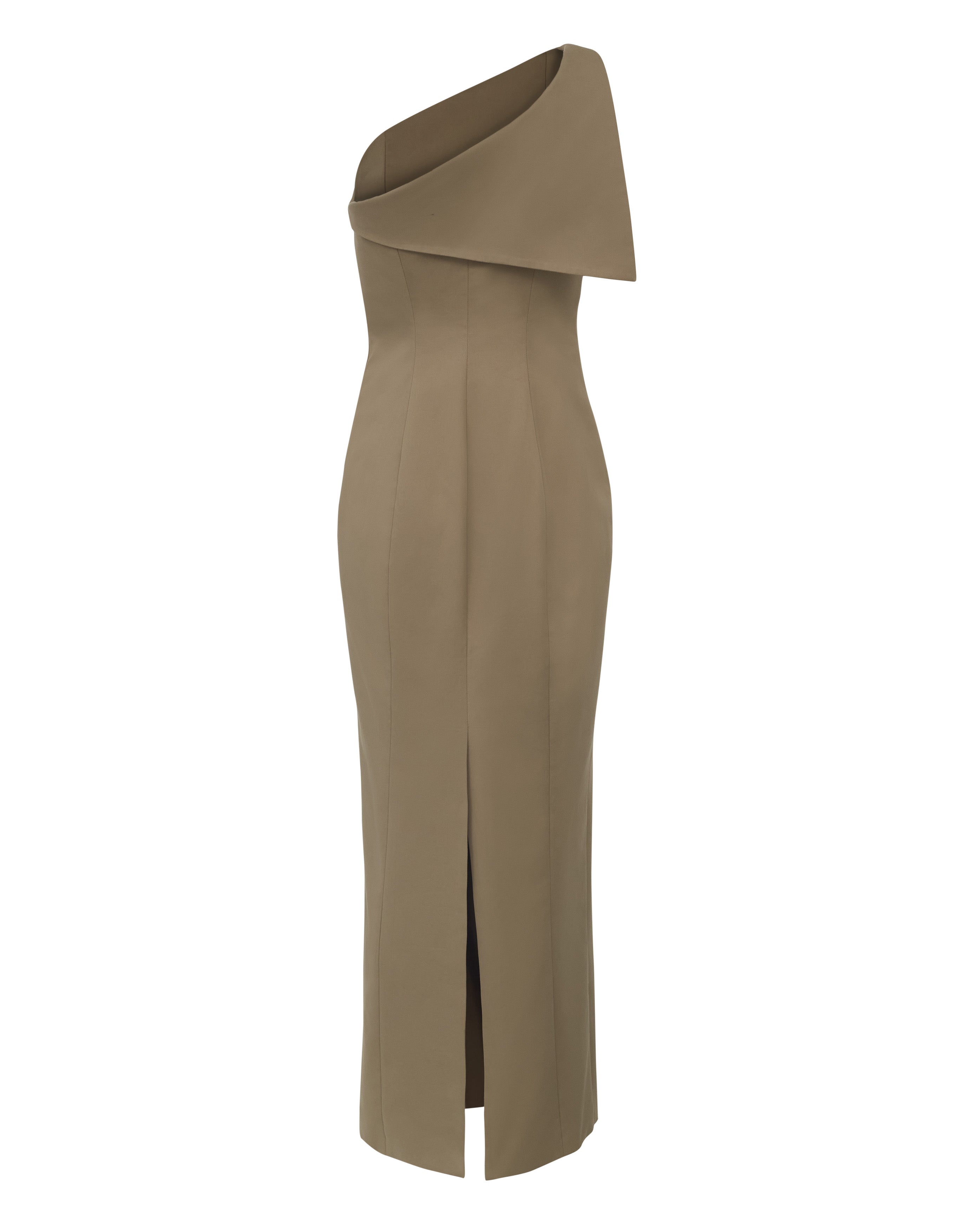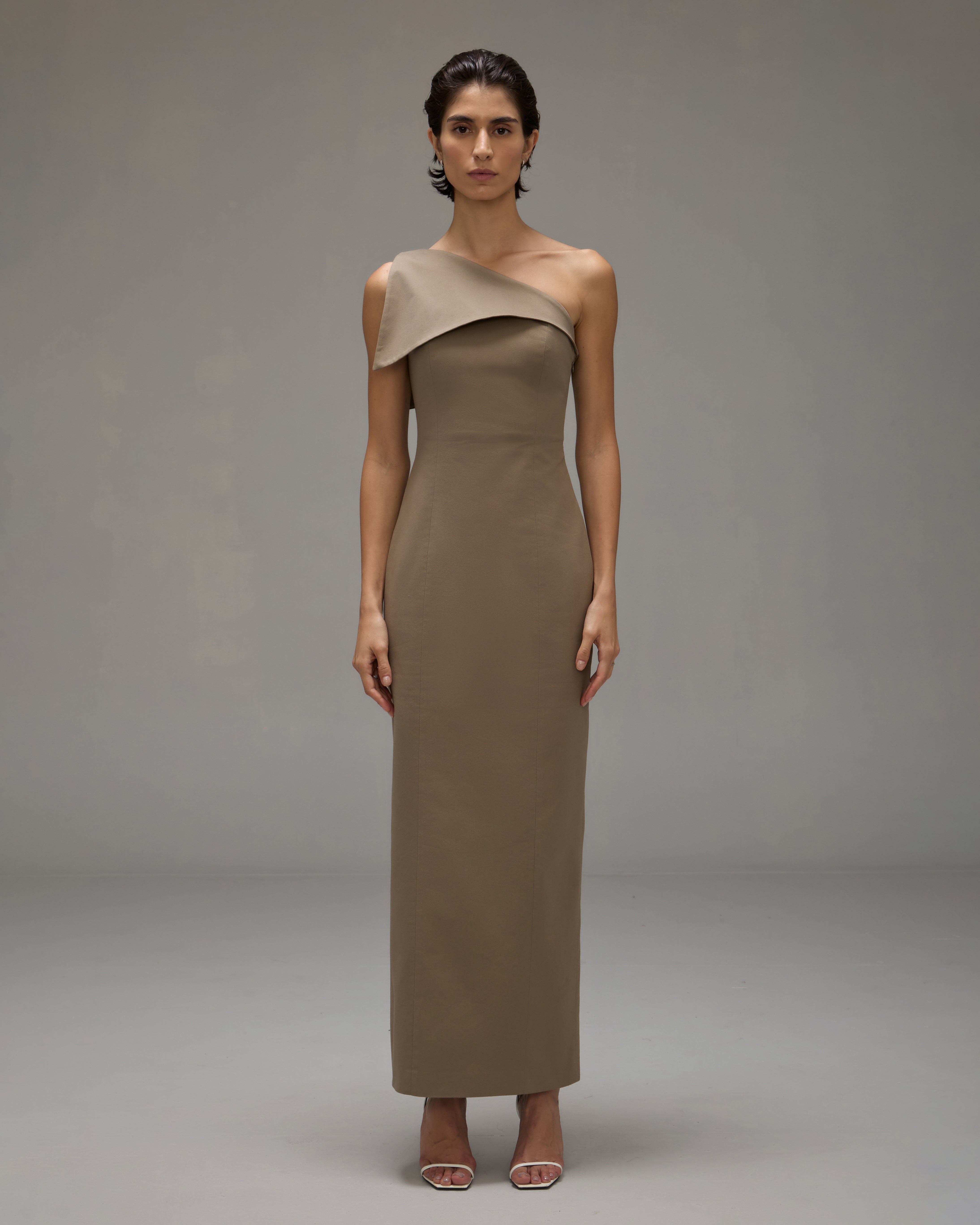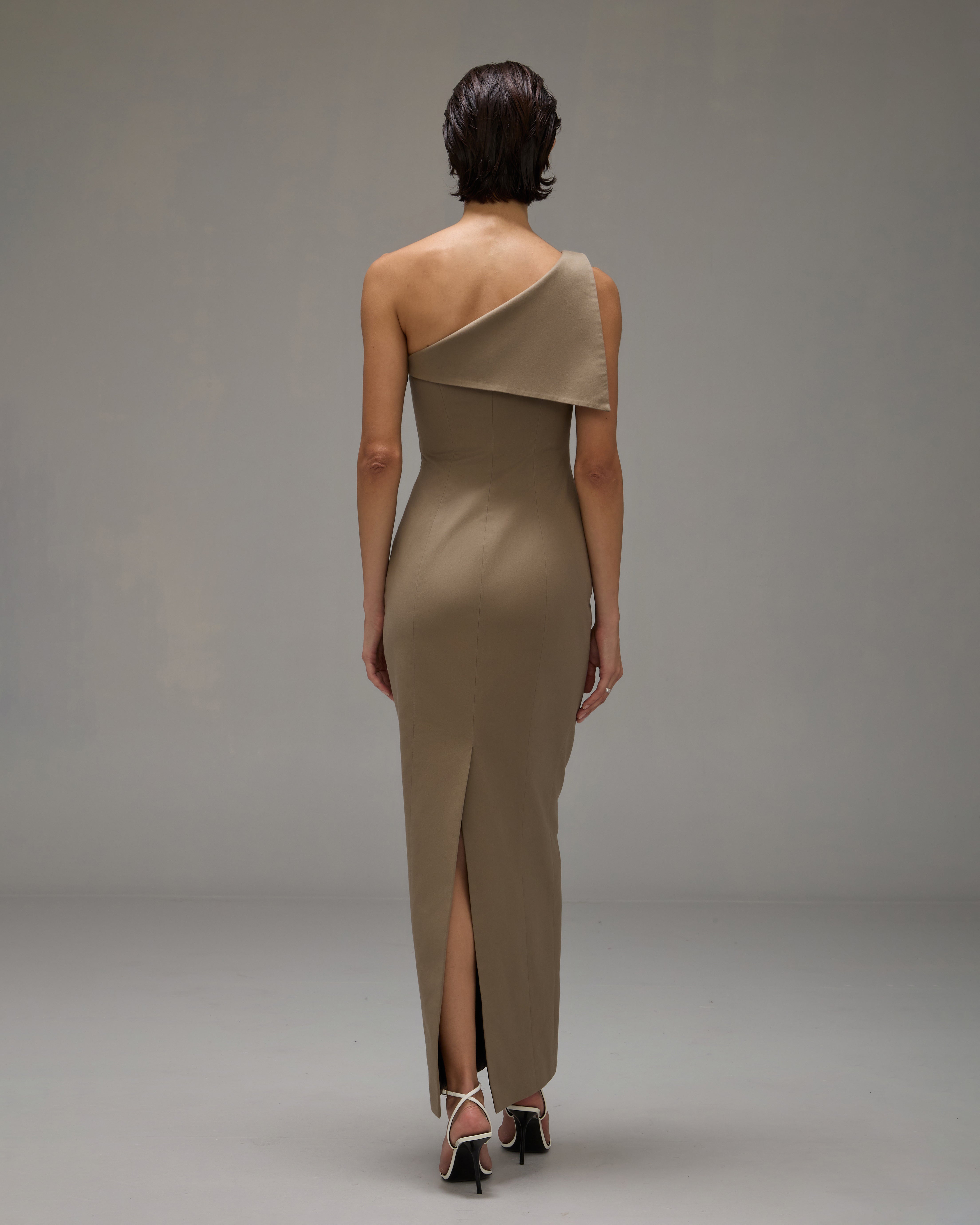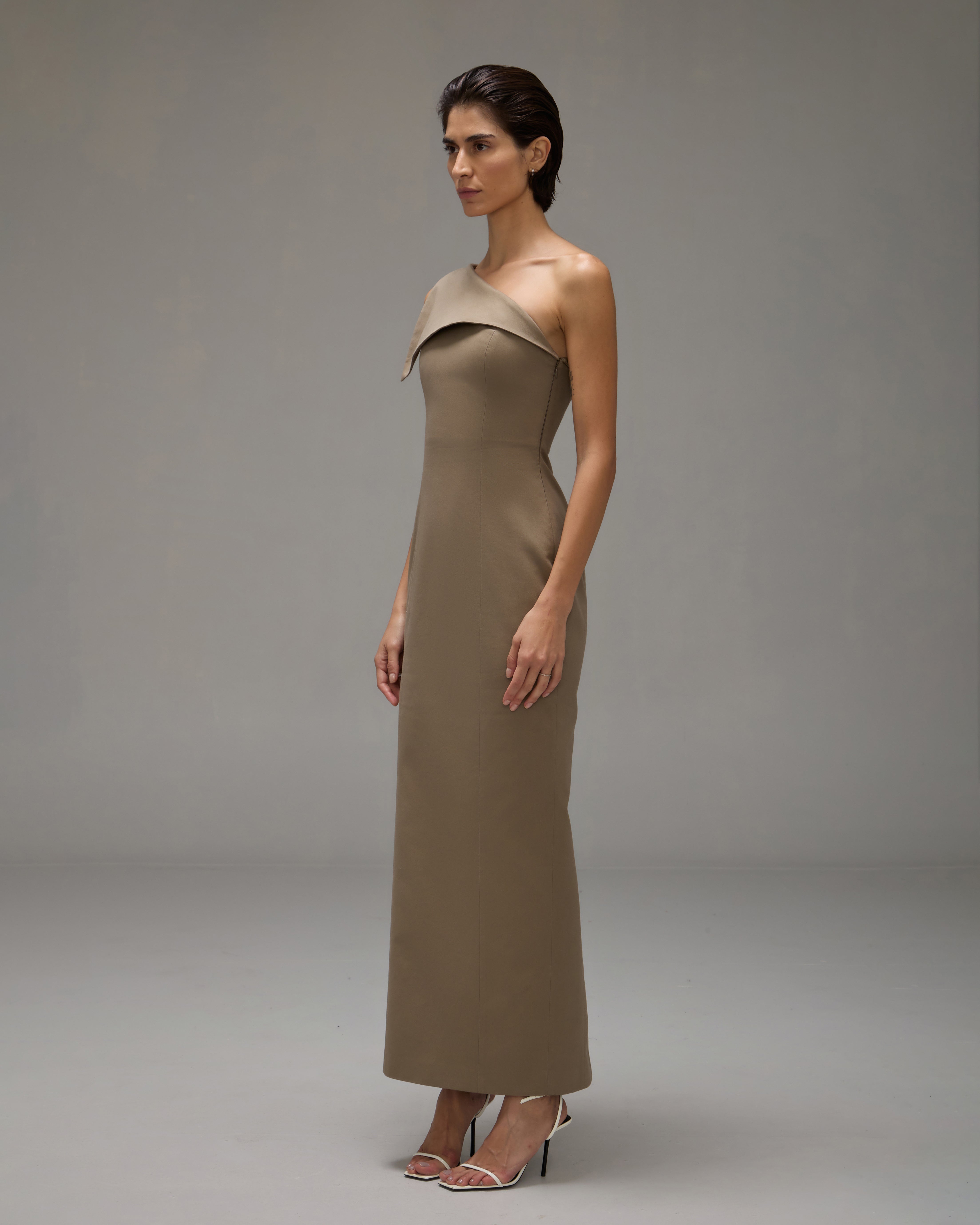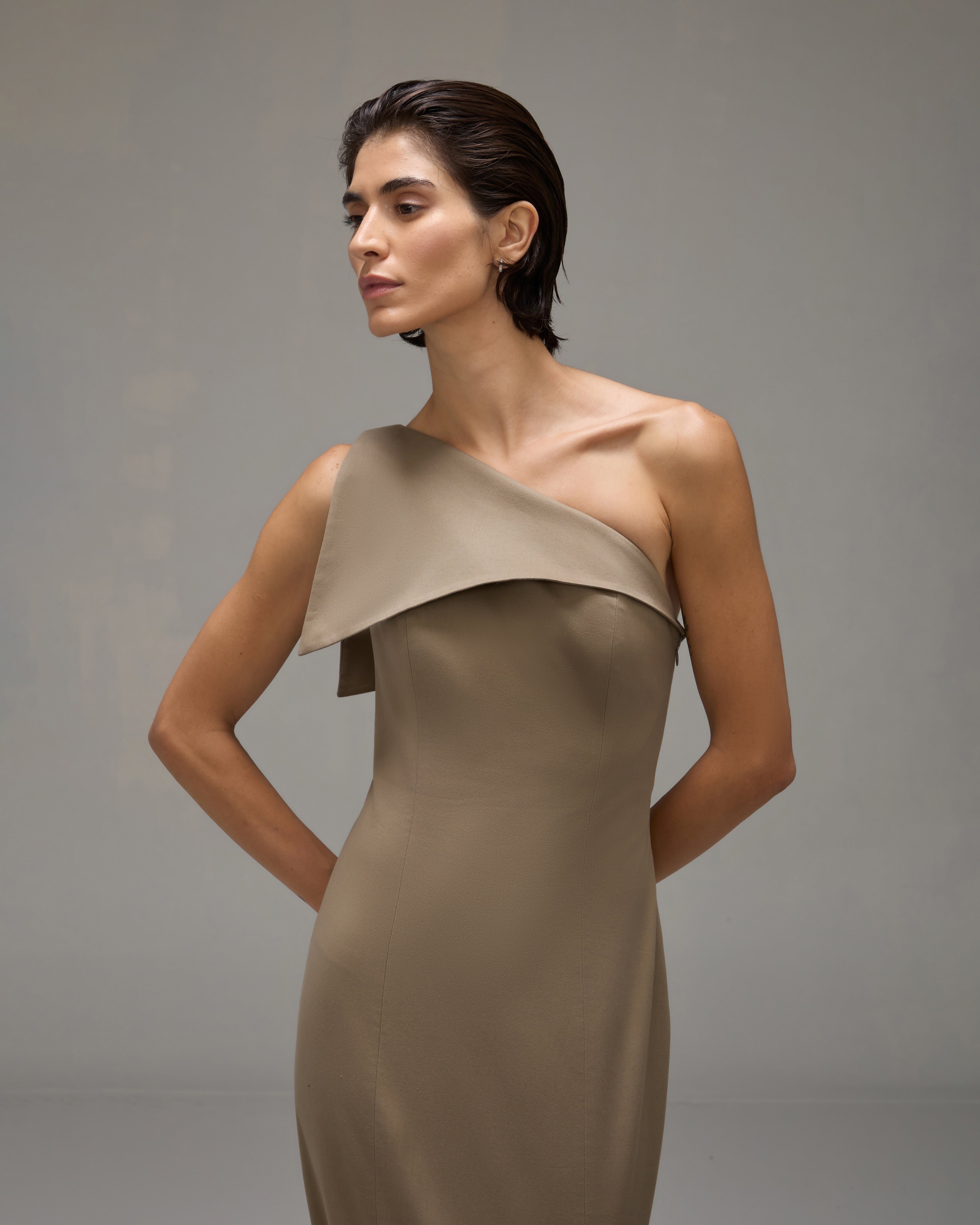 O Vestido Teresa é confeccionado em tecido plano, possui caimento acinturado, decote assimétrico, detalhe frontal de lapela sobreposta, corselete interno de apoio, fechamento lateral por zíper, fenda posterior e comprimento longo.