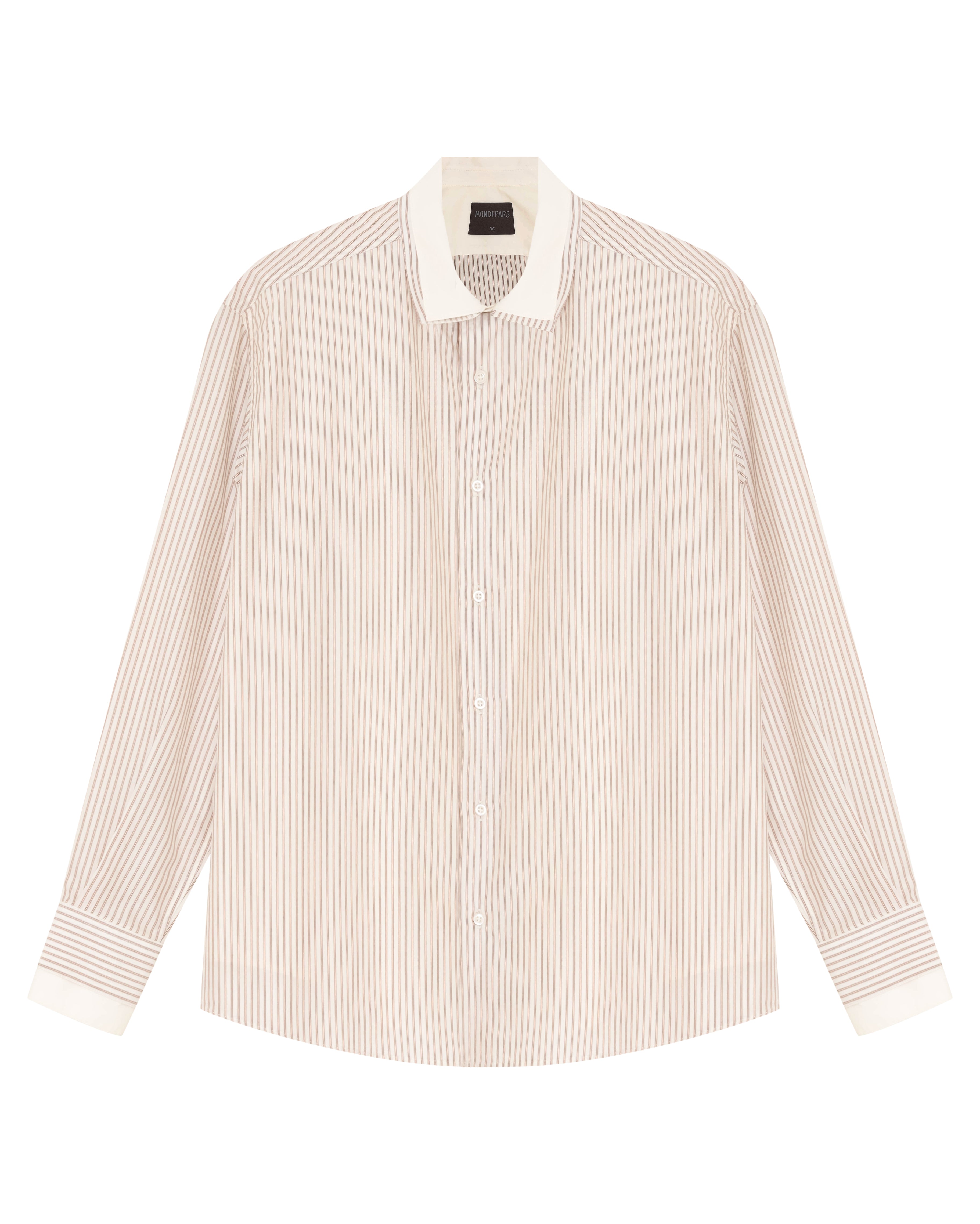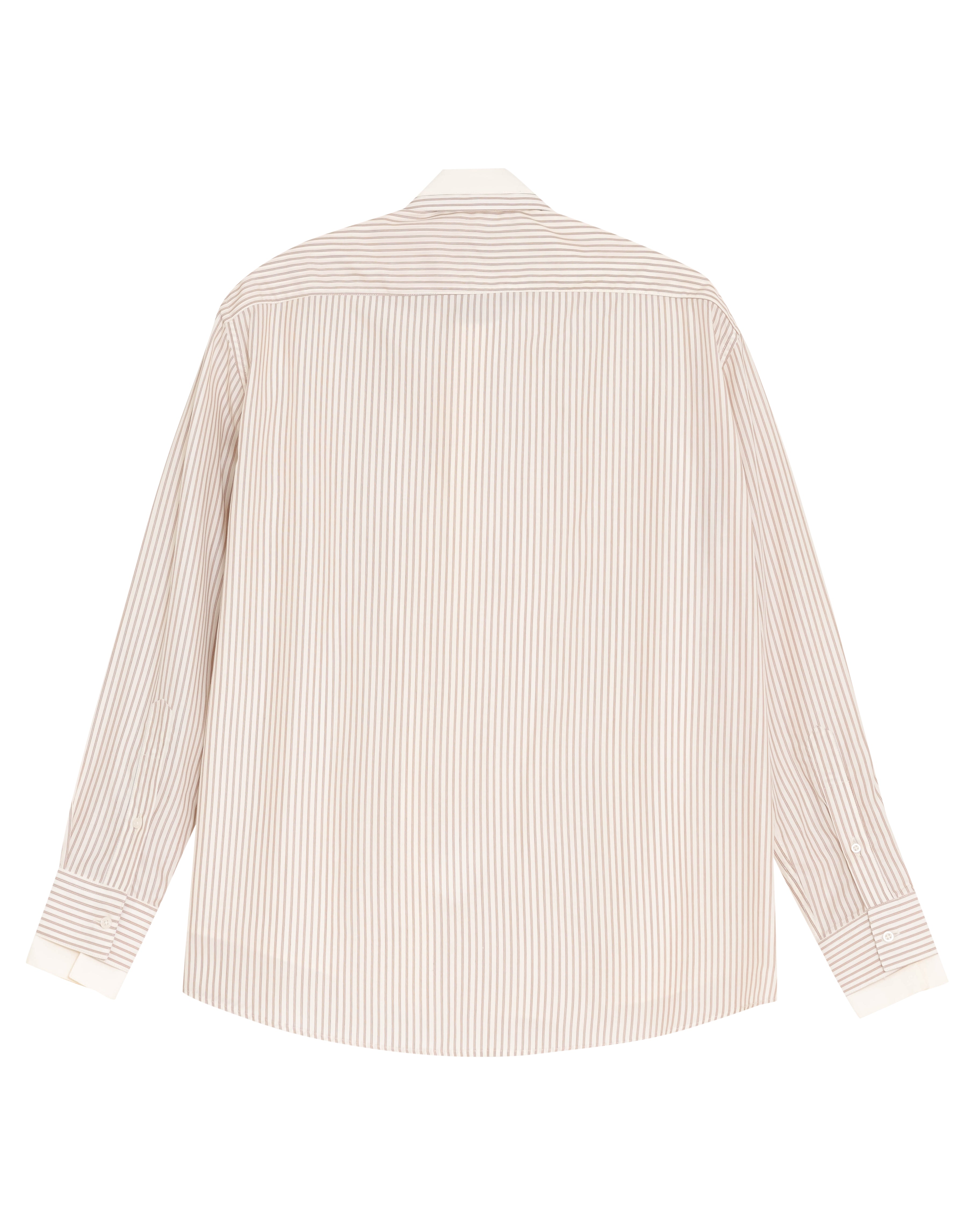 A Camisa Dua é confeccionada em tricoline importado de Portugal, possui padronagem listrada externa, caimento true to size, colarinho duplo, fechamento frontal por botões personalizados, mangas longas, punho duplo com abotoamento, costuras francesas e acabamento tradicional.