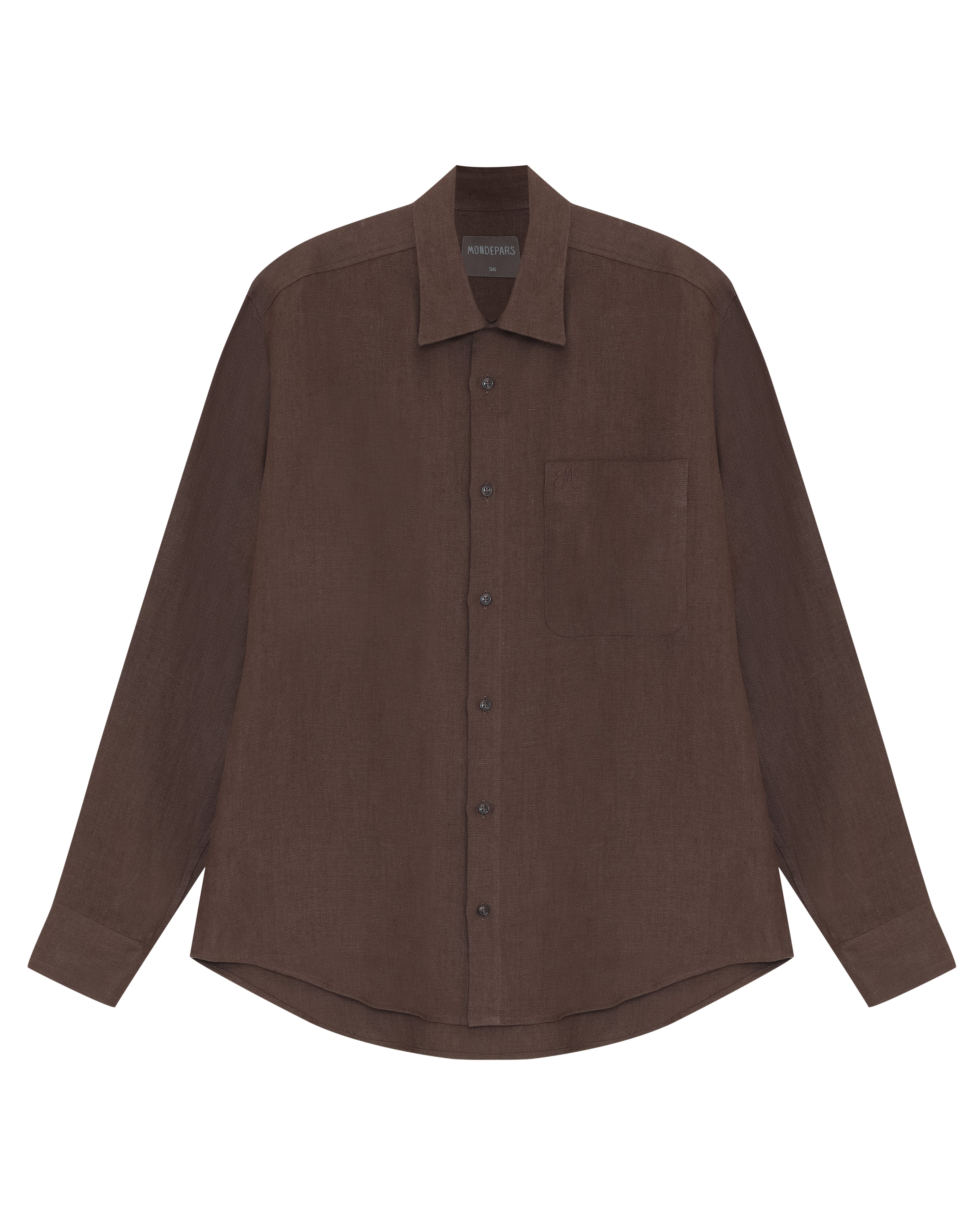 A Camisa Sal é confeccionada em linho, possui caimento true to size, colarinho, fechamento frontal por botões personalizados, bolso frontal com logo bordado, mangas longas, punho com abotoamento duplo, costuras francesas e acabamento tradicional.