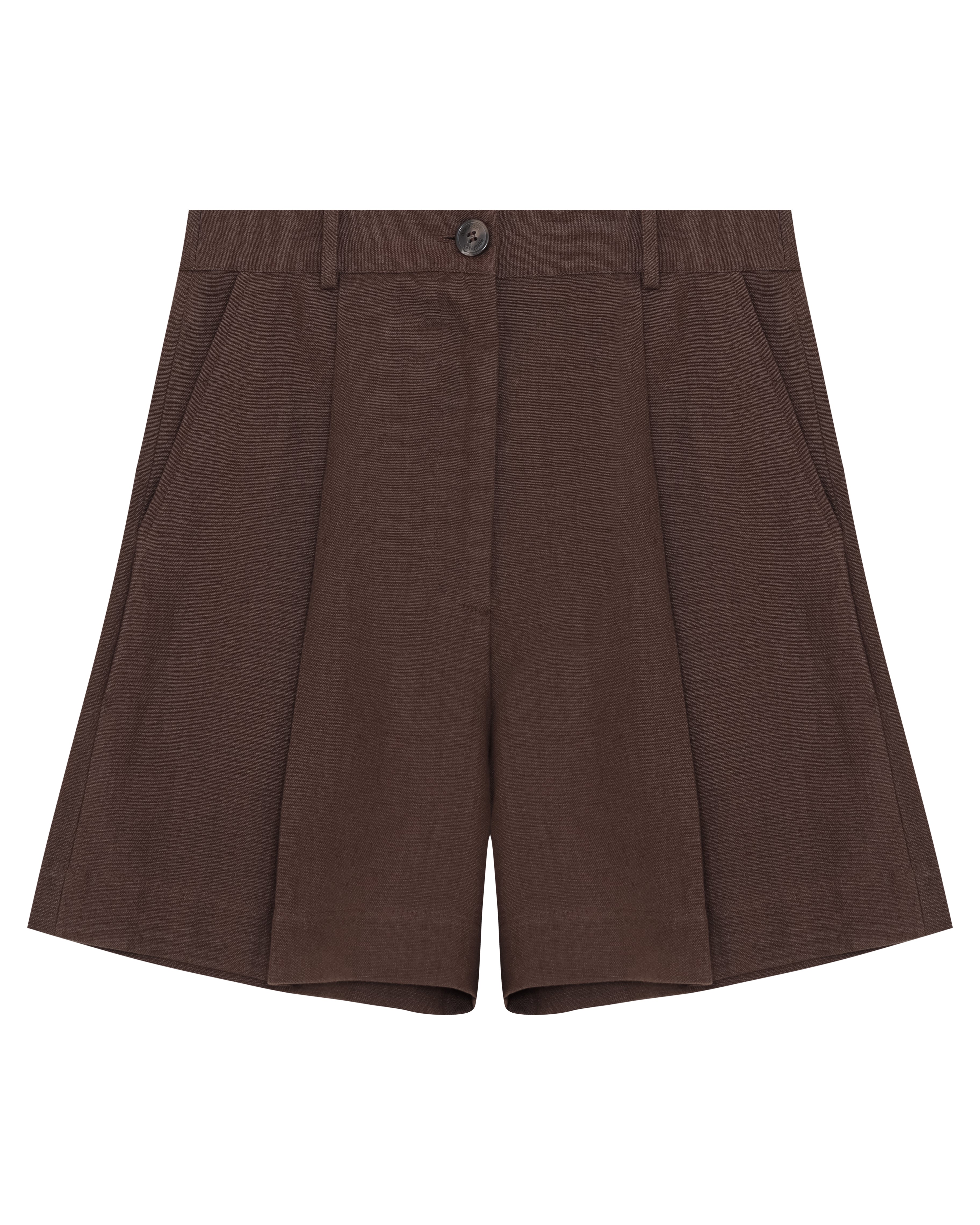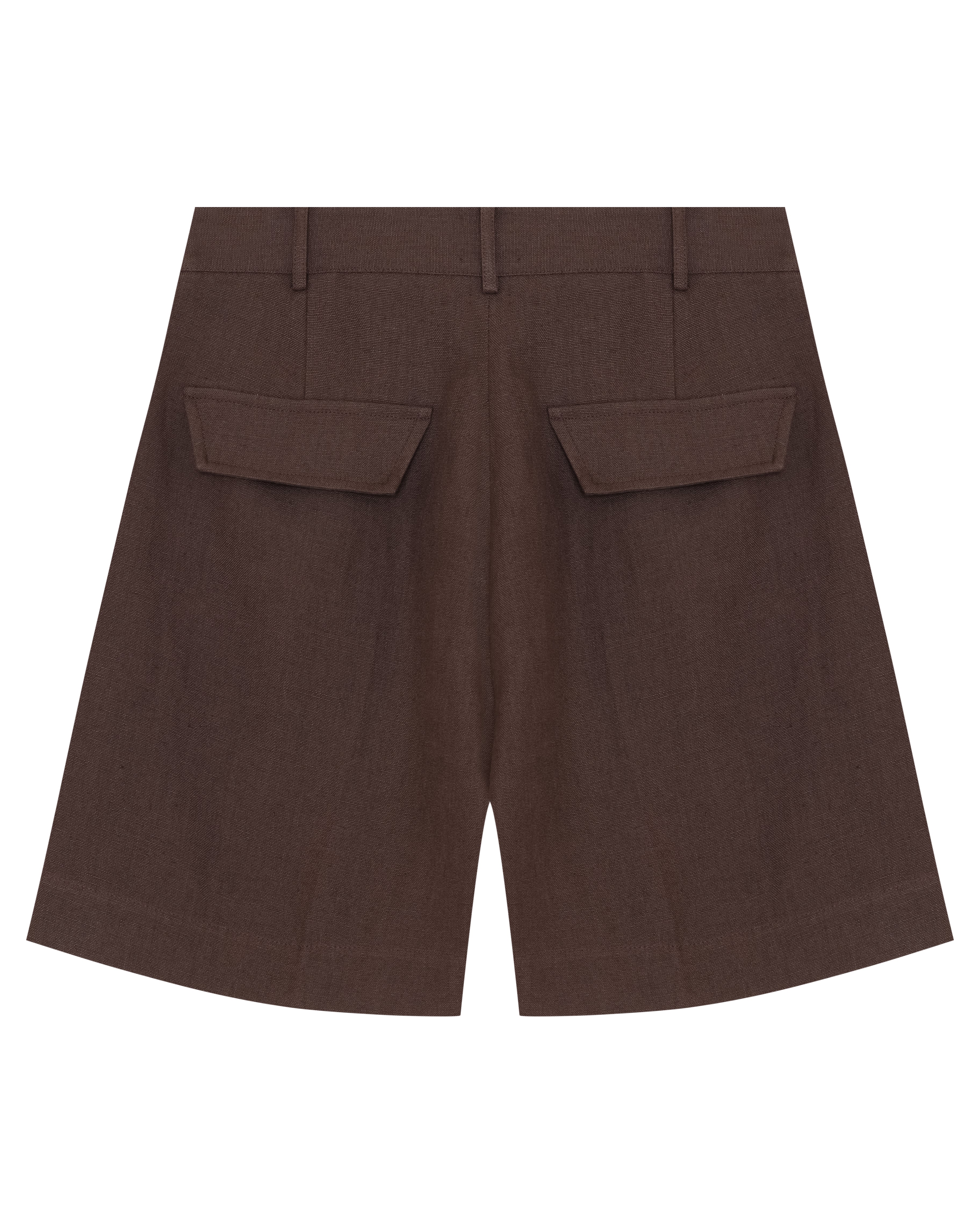 O Shorts Rita é confeccionada em linho, possui modelagem de alfaiataria, caimento acinturado, cós com passantes, fechamento frontal por zíper, gancho e botão, dois bolsos facas frontais, dois bolsos decorativos com lapelas em formato de trapézio nas costas e forro embutido.