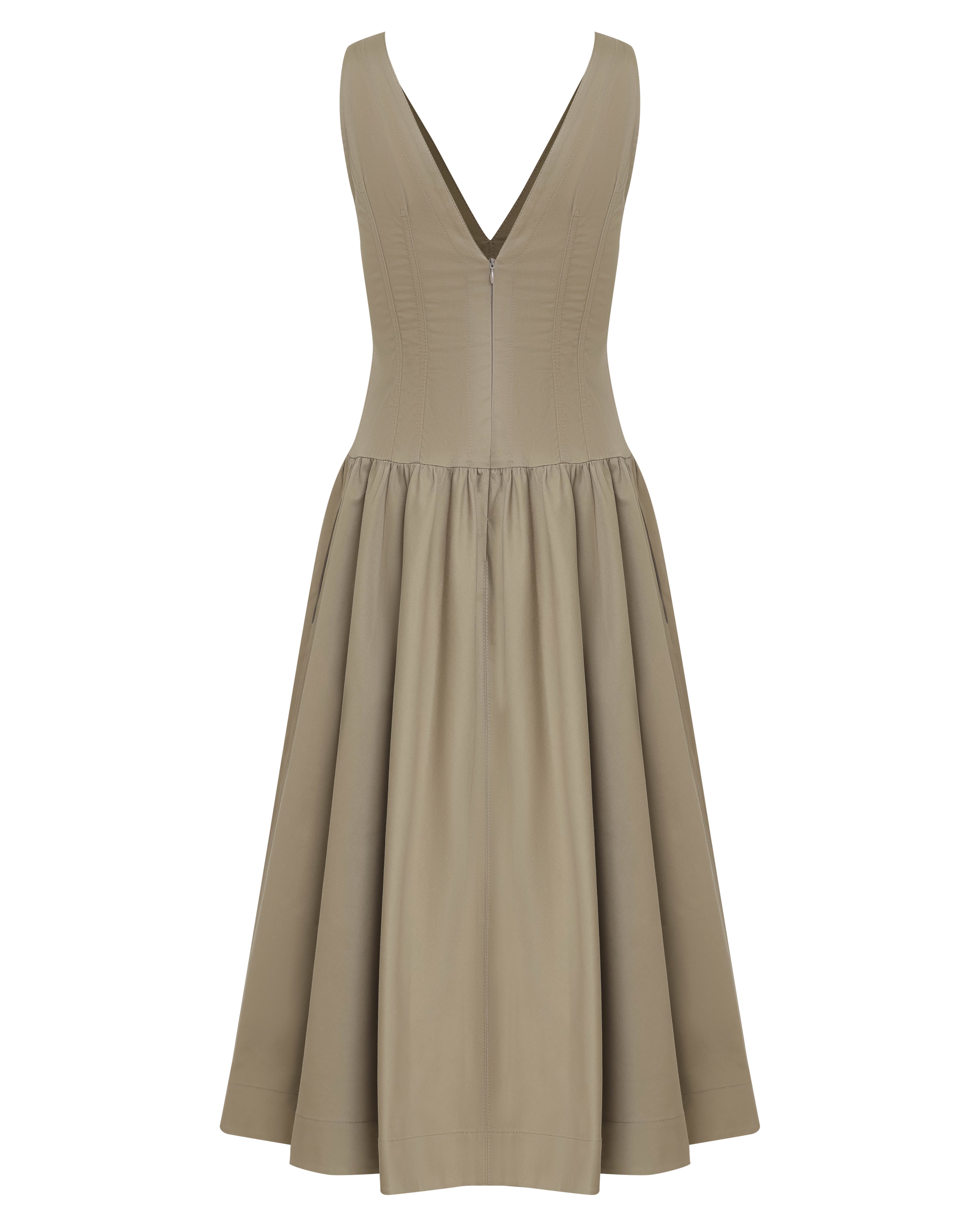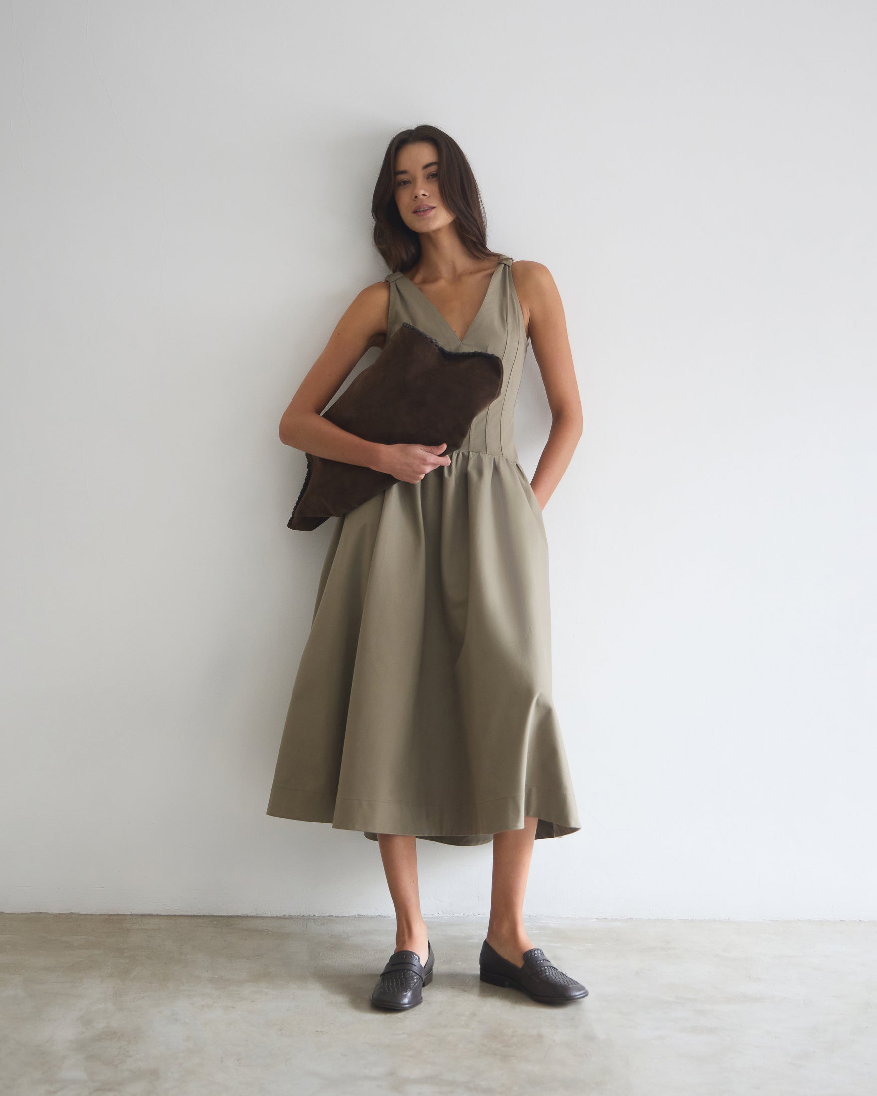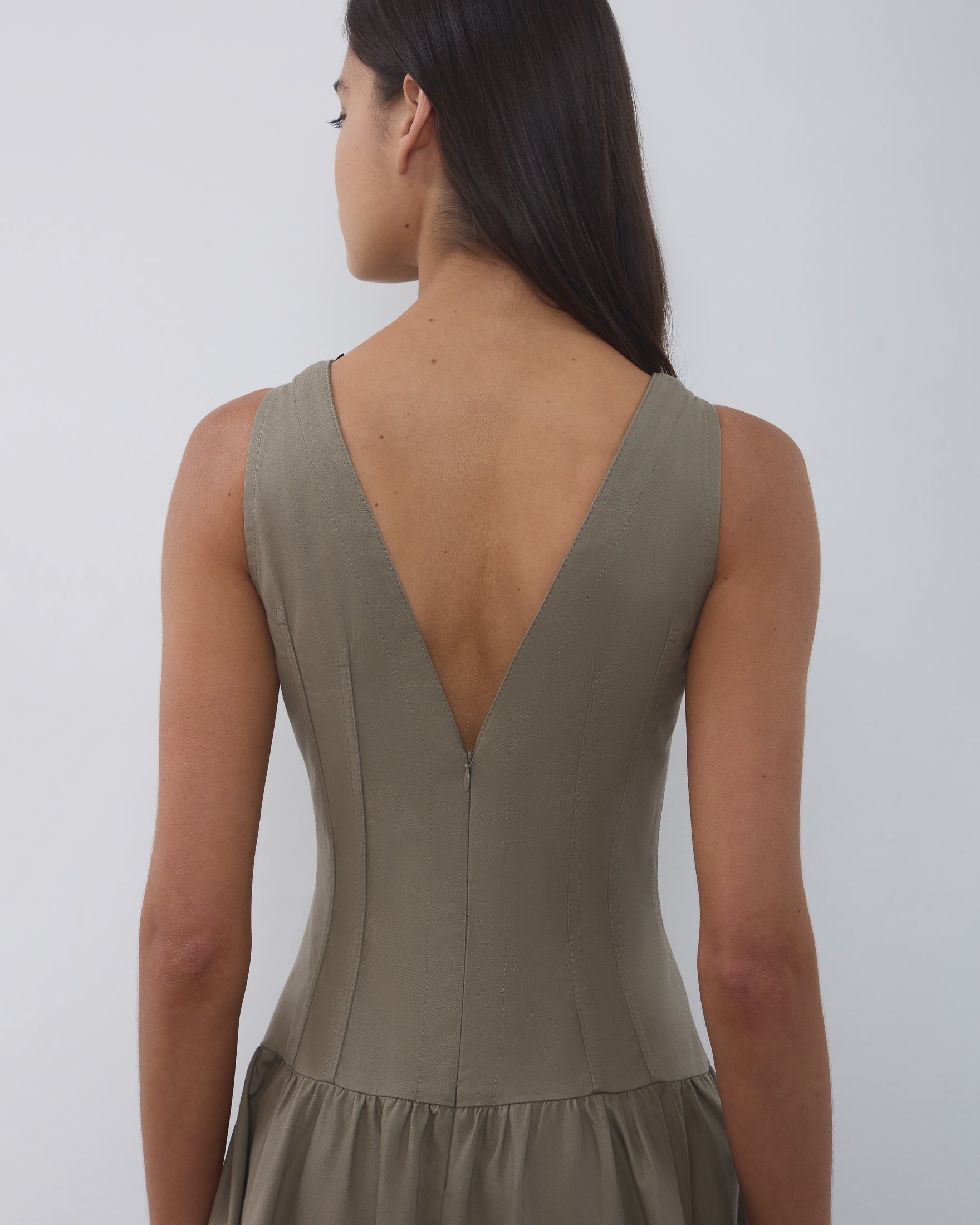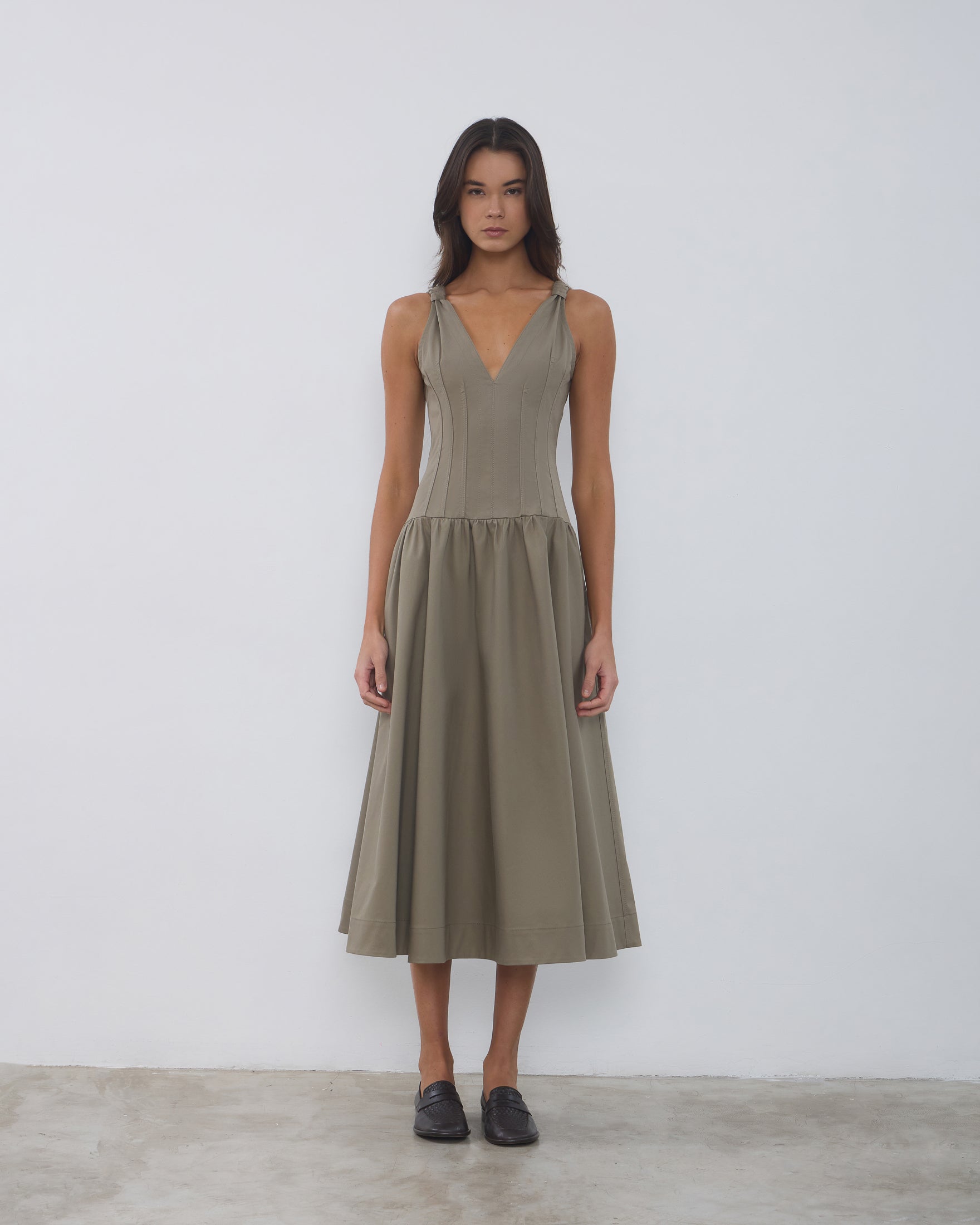 O Vestido Sofi é confeccionado em algodão de peso médio, possui modelagem evasê, decote em "V", alças médias, detalhes de corset, bolsos laterais, fechamento por zíper posterior, saia com babados e comprimento midi.